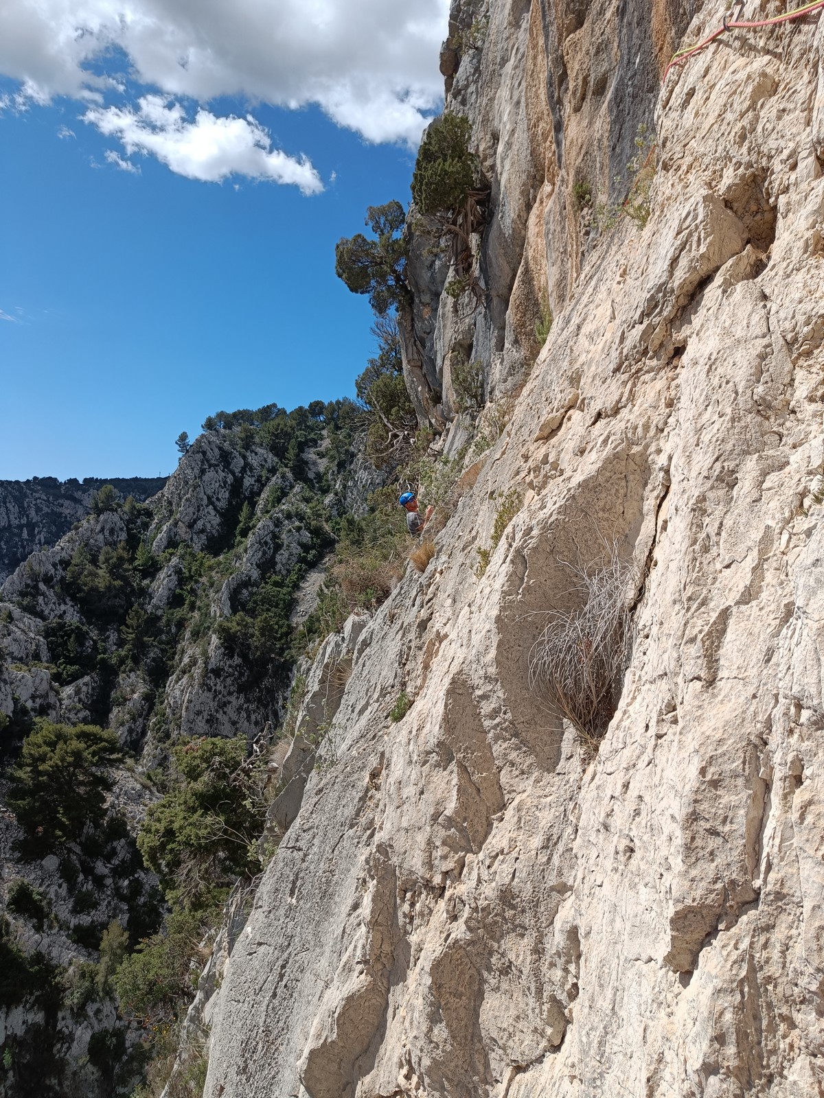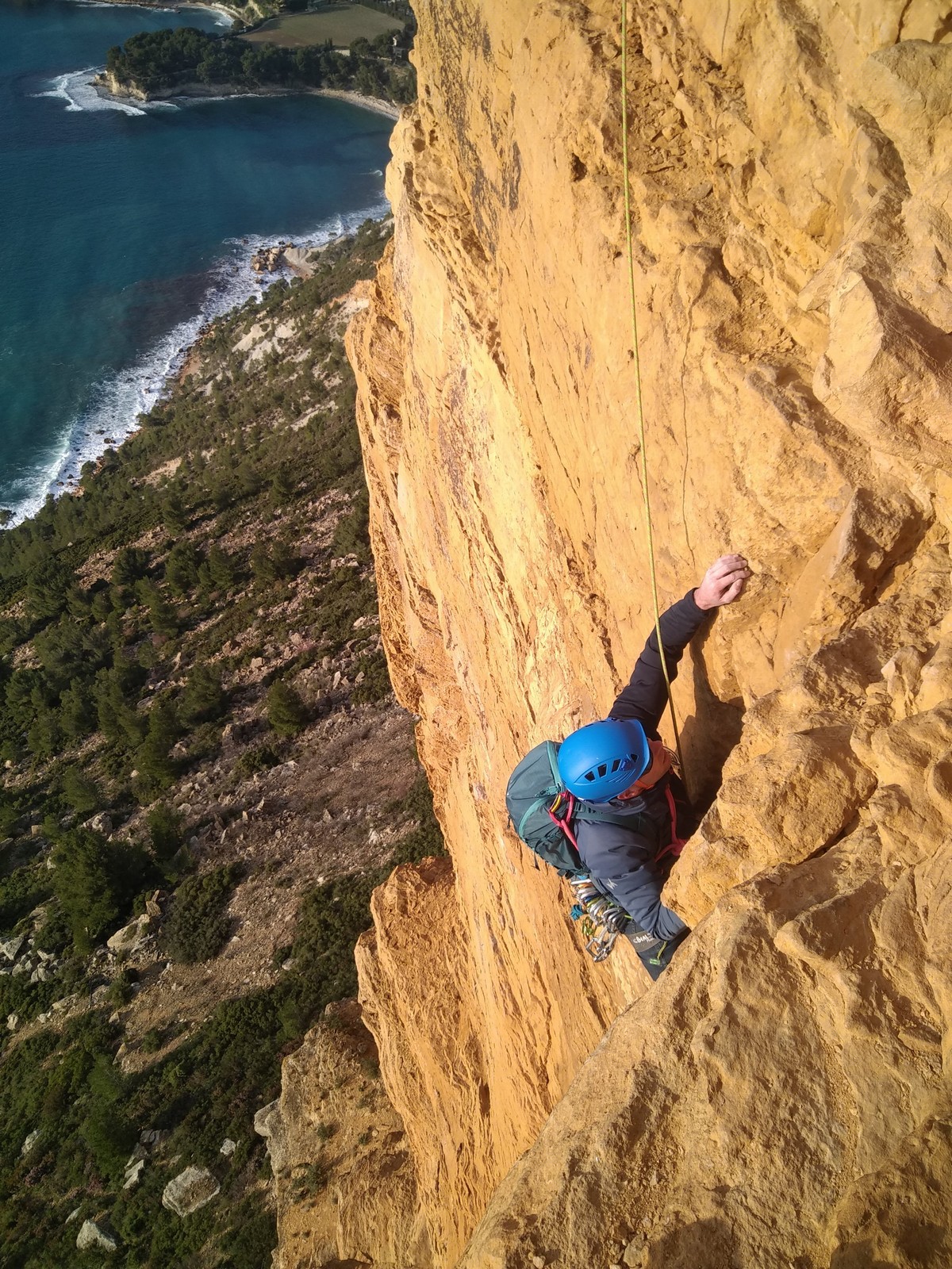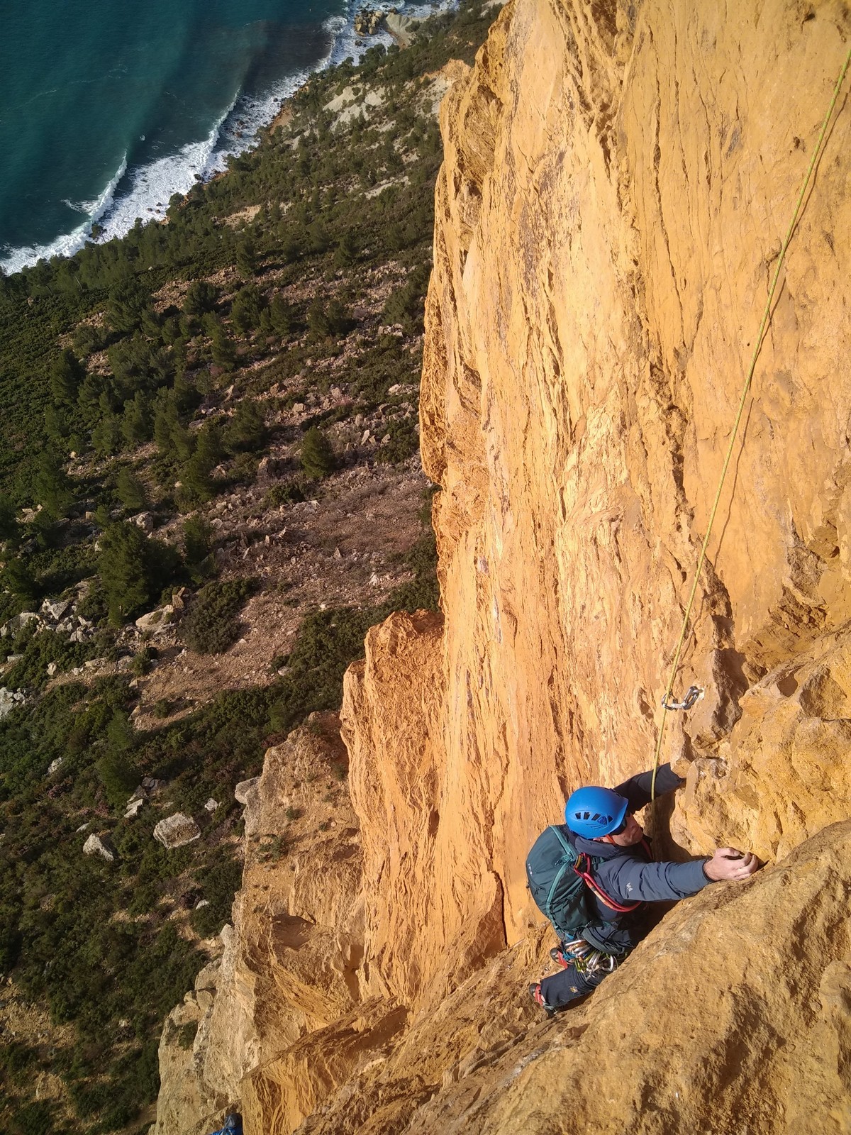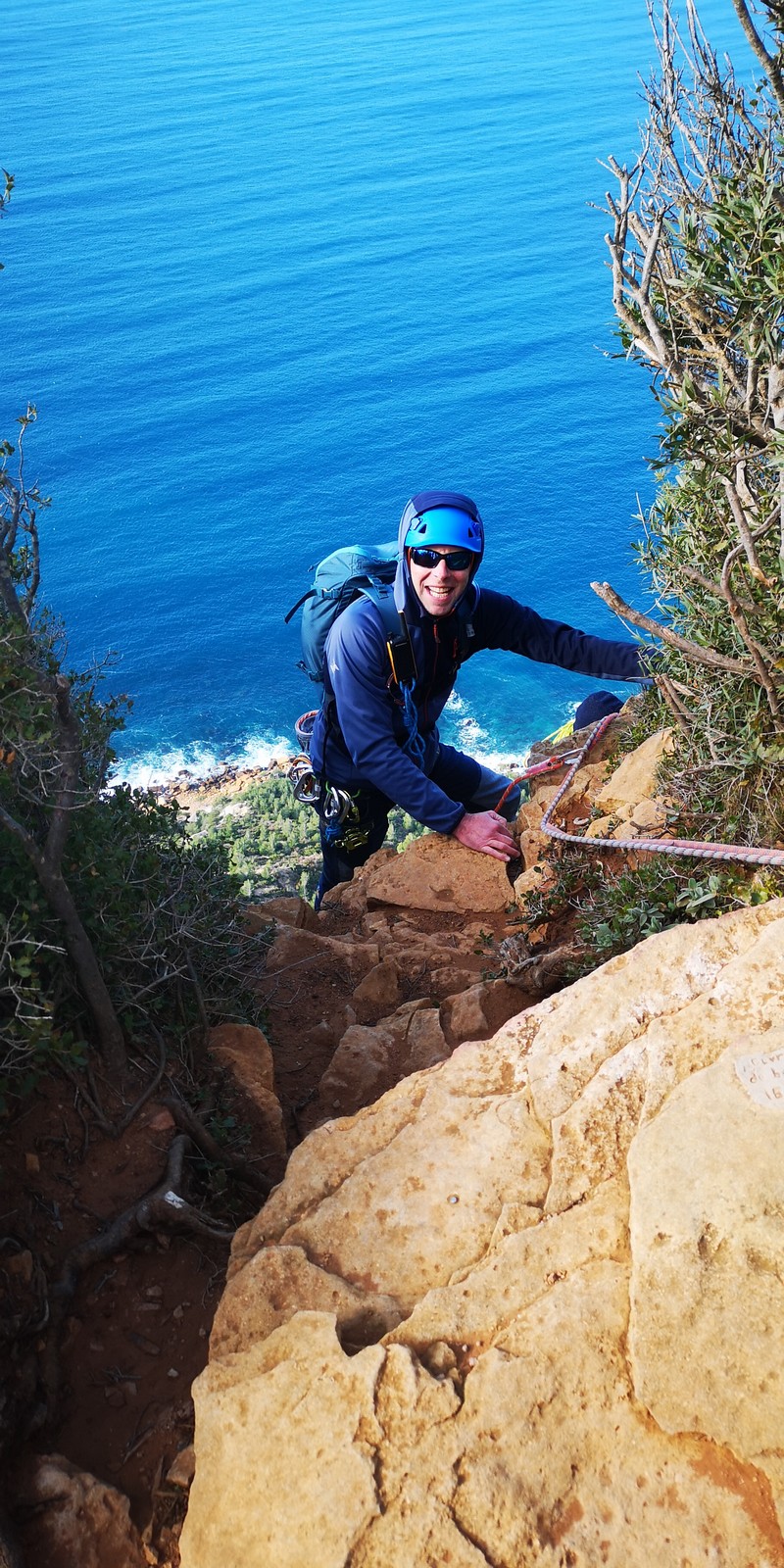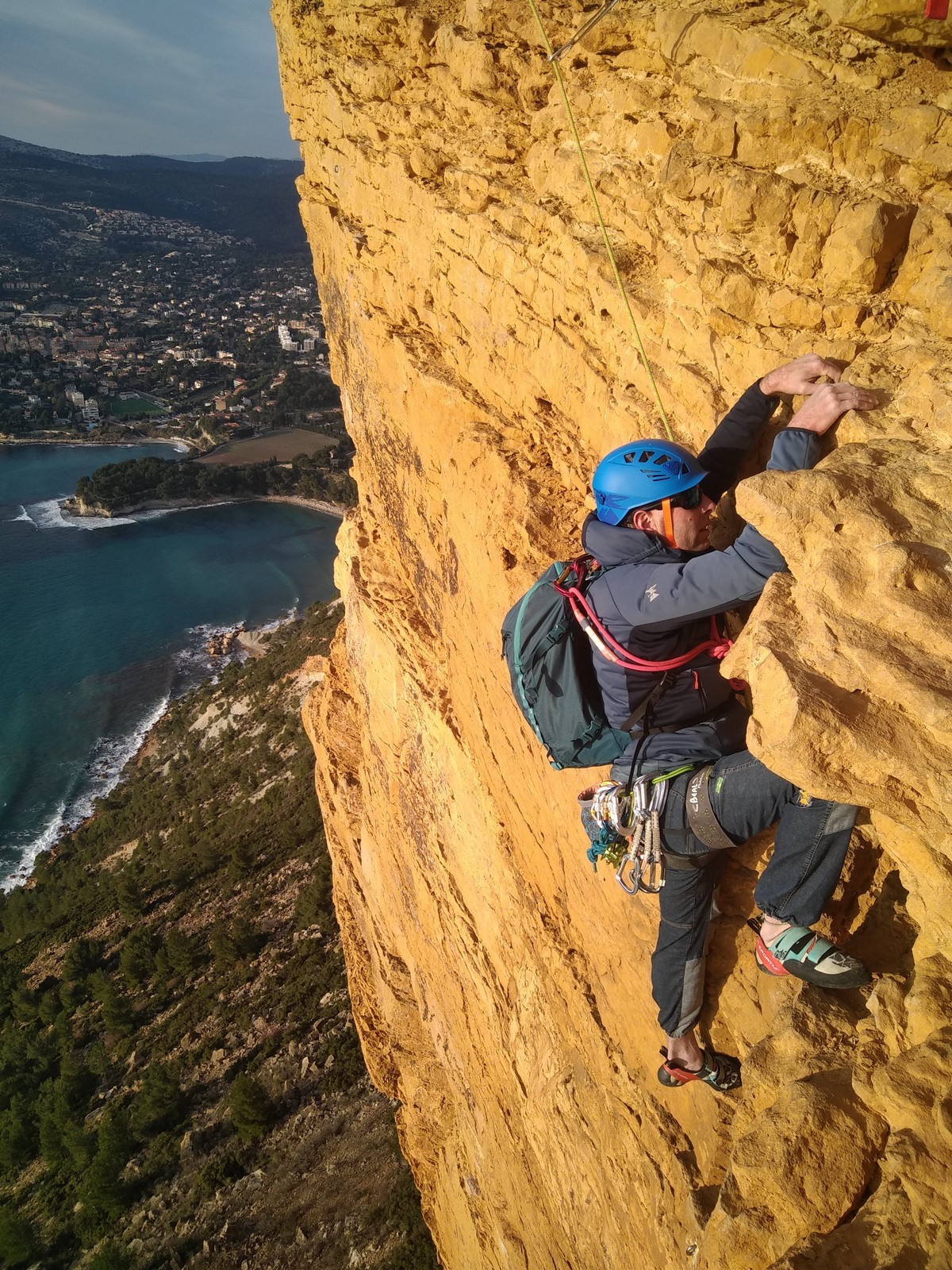 A la base, nous voulions retourner au Cap Canaille pour nous frotter à quelques voies d’ampleur au secteur du sémaphore, mais le mistral a eu raison de notre motivation. C’est donc au secteur Capri, bien abrité, que nous avons décidé d’aller user notre gomme. C’est un secteur d’une dizaine de voies abordables, sur une falaise d’environ 90m, mais avec des lignes qui traversent pas mal pour des voies faisant jusqu’à 8 longueurs.