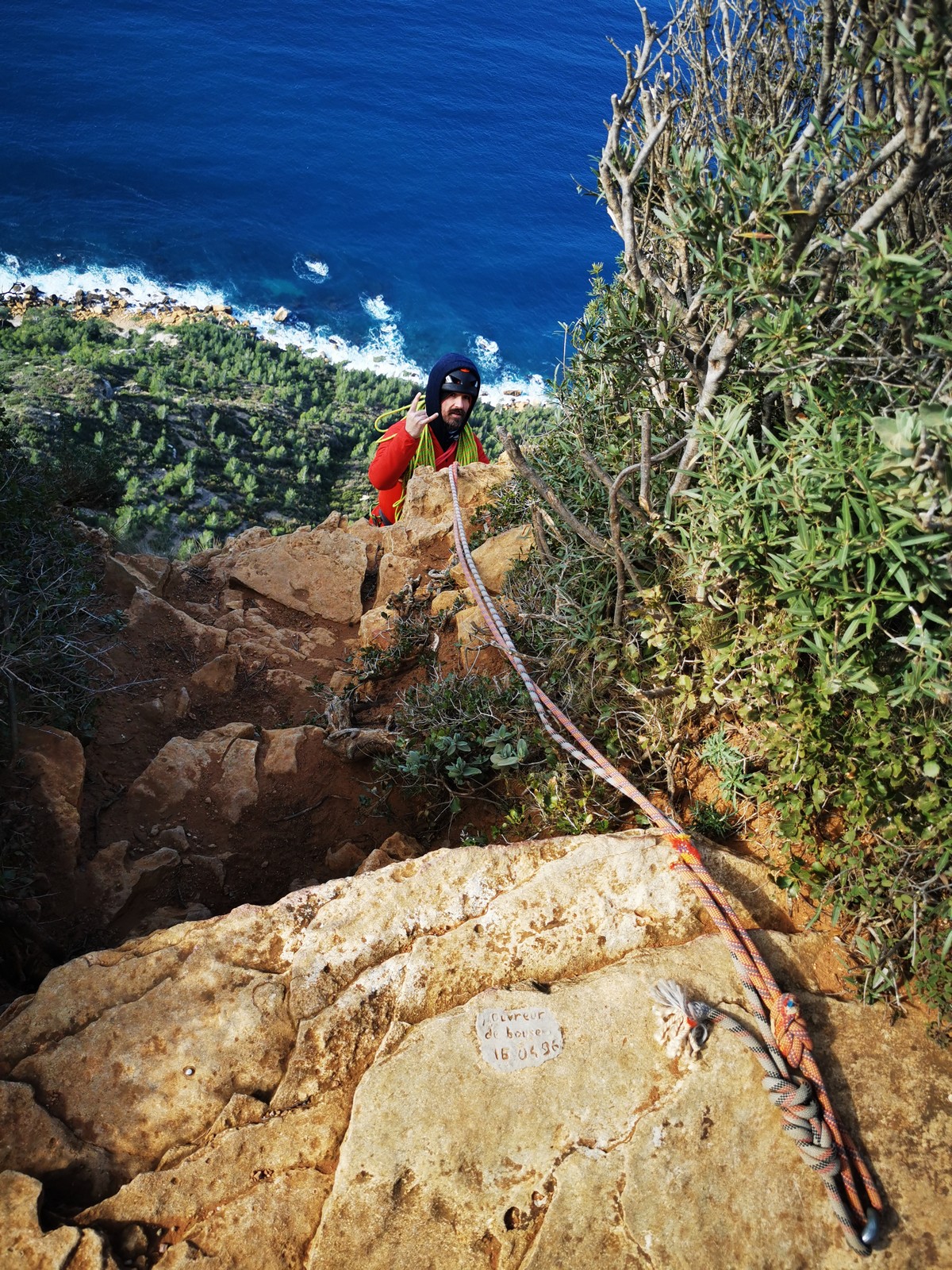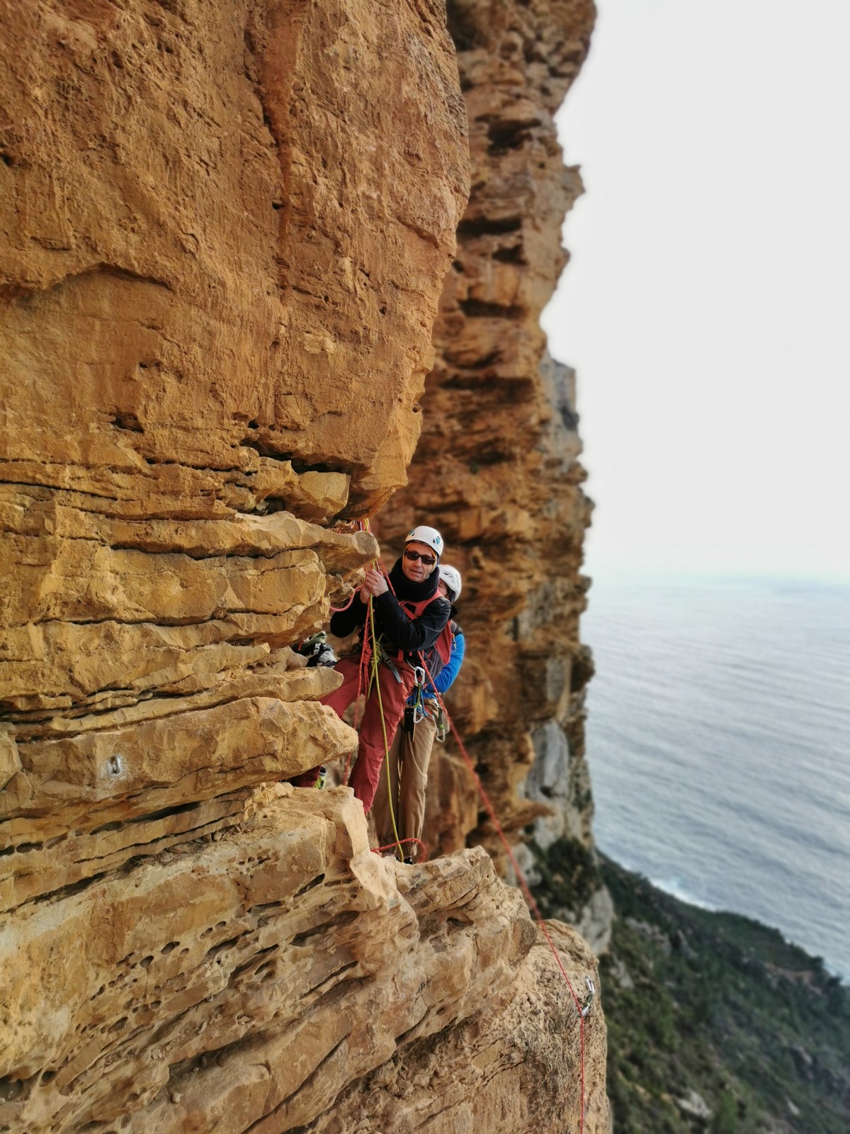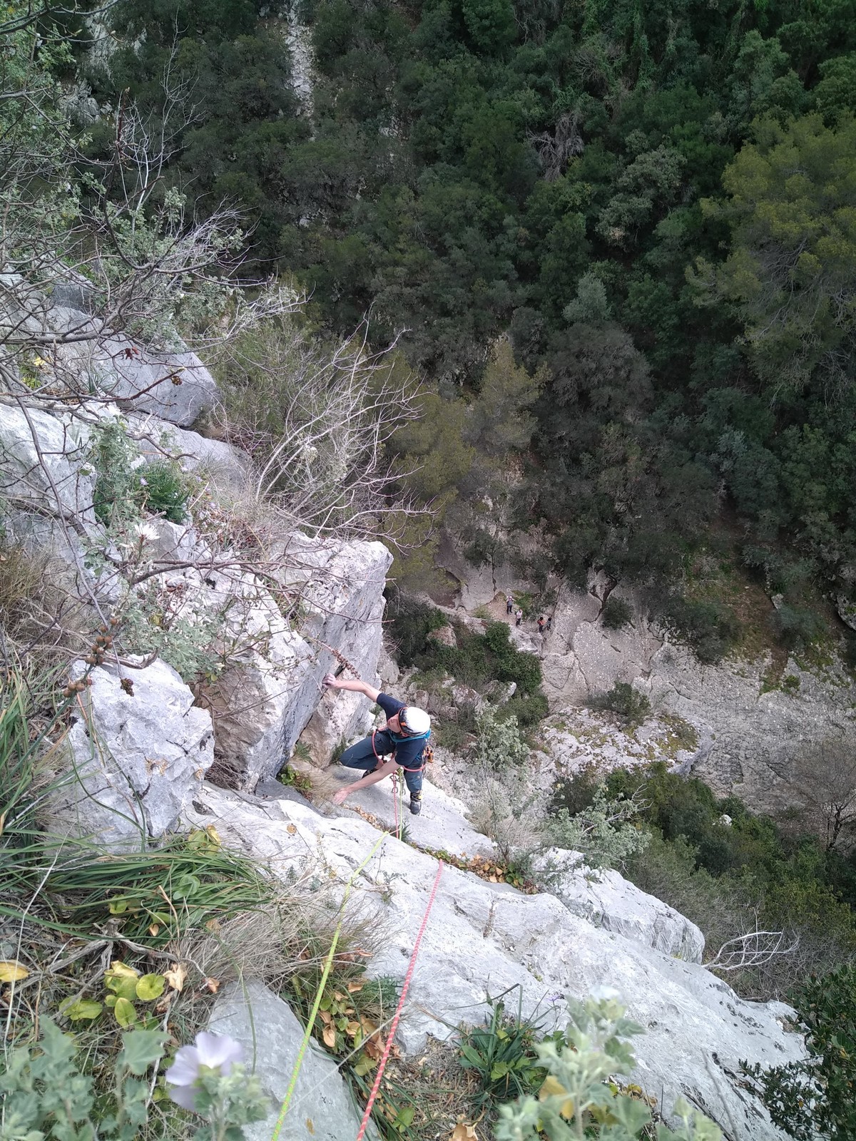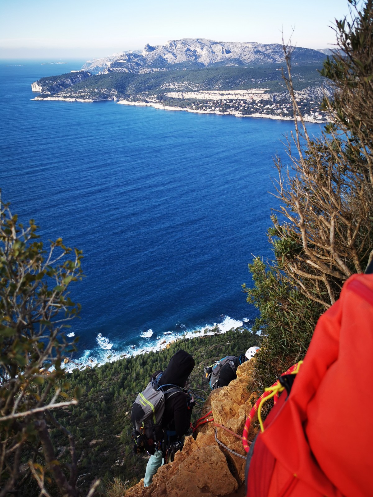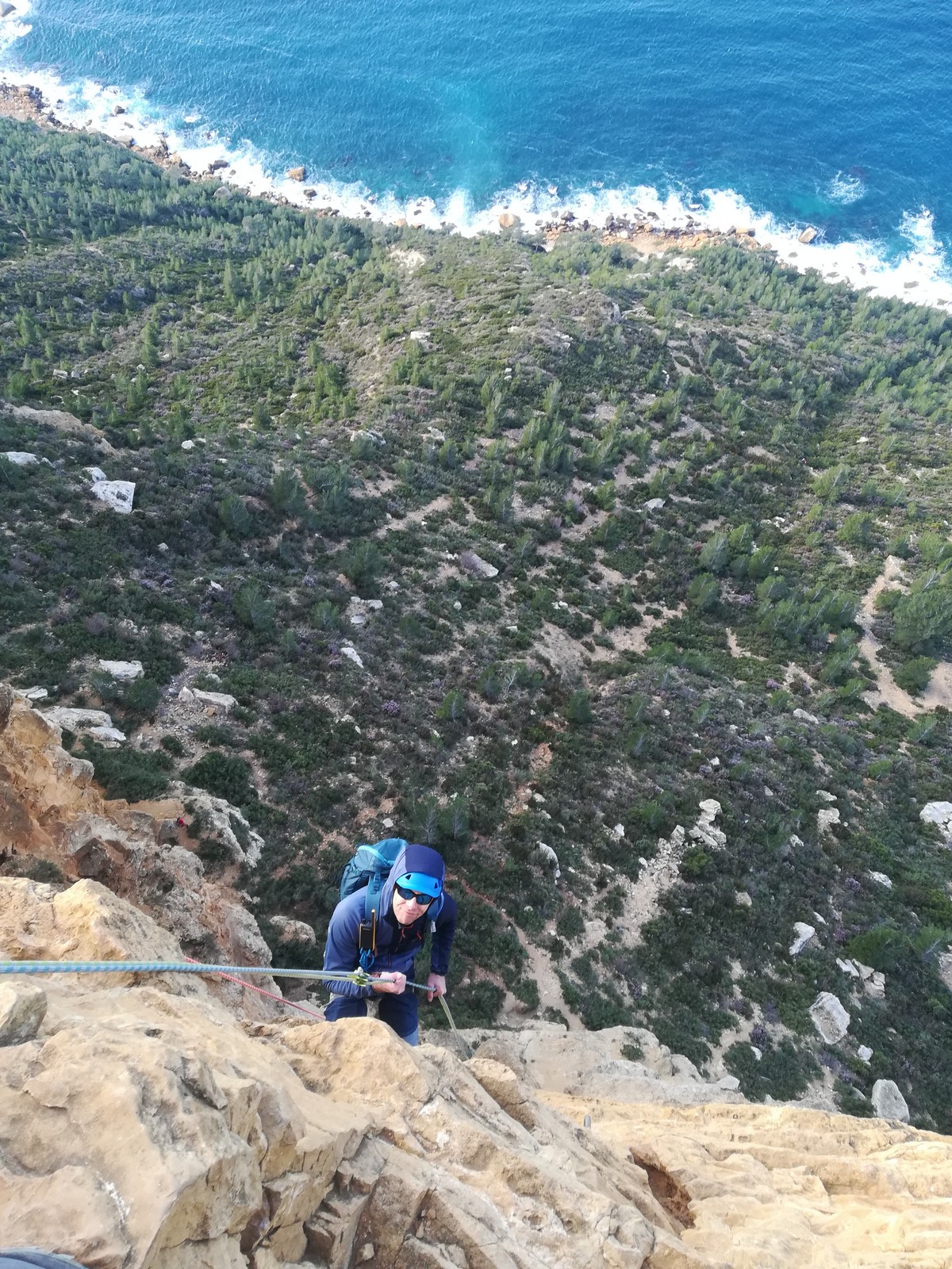 A la base, nous voulions retourner au Cap Canaille pour nous frotter à quelques voies d’ampleur au secteur du sémaphore, mais le mistral a eu raison de notre motivation. C’est donc au secteur Capri, bien abrité, que nous avons décidé d’aller user notre gomme. C’est un secteur d’une dizaine de voies abordables, sur une falaise d’environ 90m, mais avec des lignes qui traversent pas mal pour des voies faisant jusqu’à 8 longueurs.