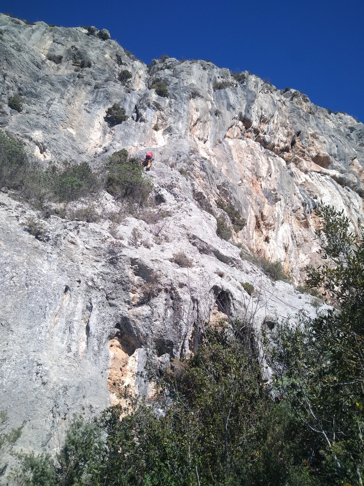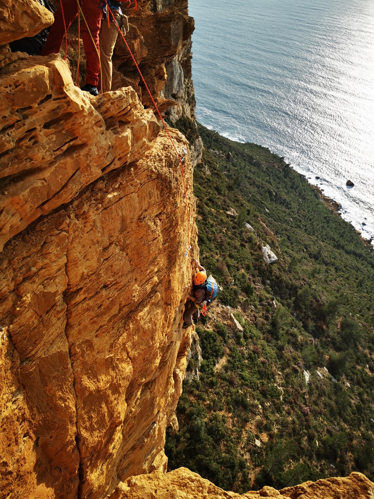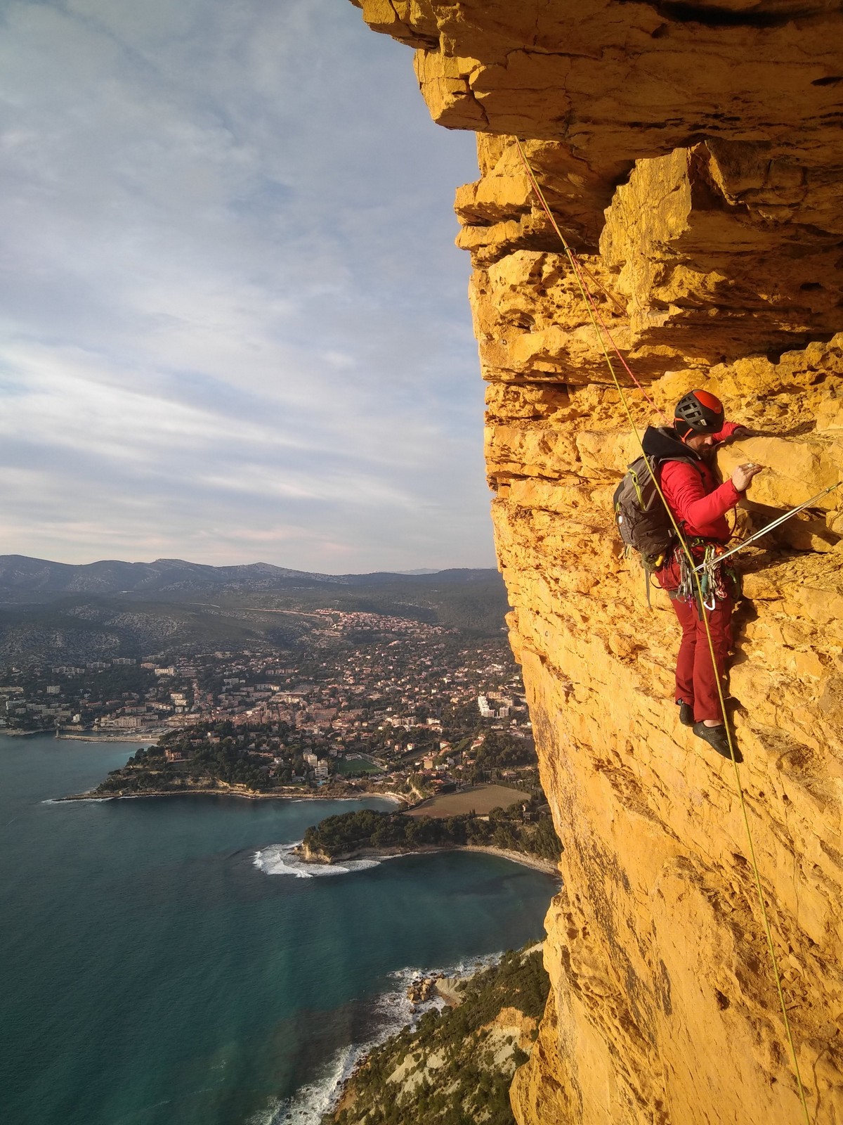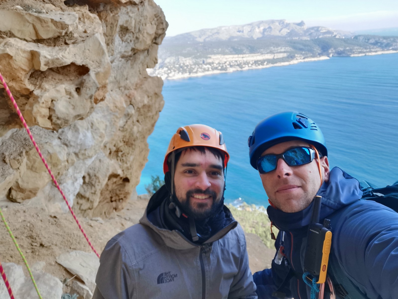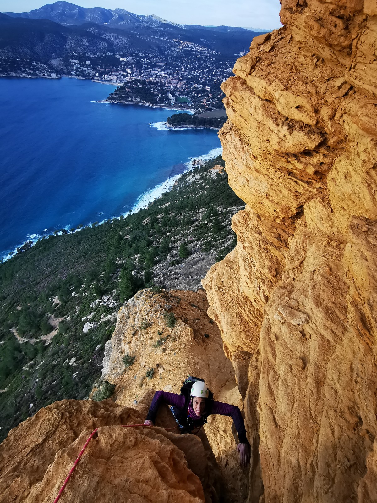 A la base, nous voulions retourner au Cap Canaille pour nous frotter à quelques voies d’ampleur au secteur du sémaphore, mais le mistral a eu raison de notre motivation. C’est donc au secteur Capri, bien abrité, que nous avons décidé d’aller user notre gomme. C’est un secteur d’une dizaine de voies abordables, sur une falaise d’environ 90m, mais avec des lignes qui traversent pas mal pour des voies faisant jusqu’à 8 longueurs.