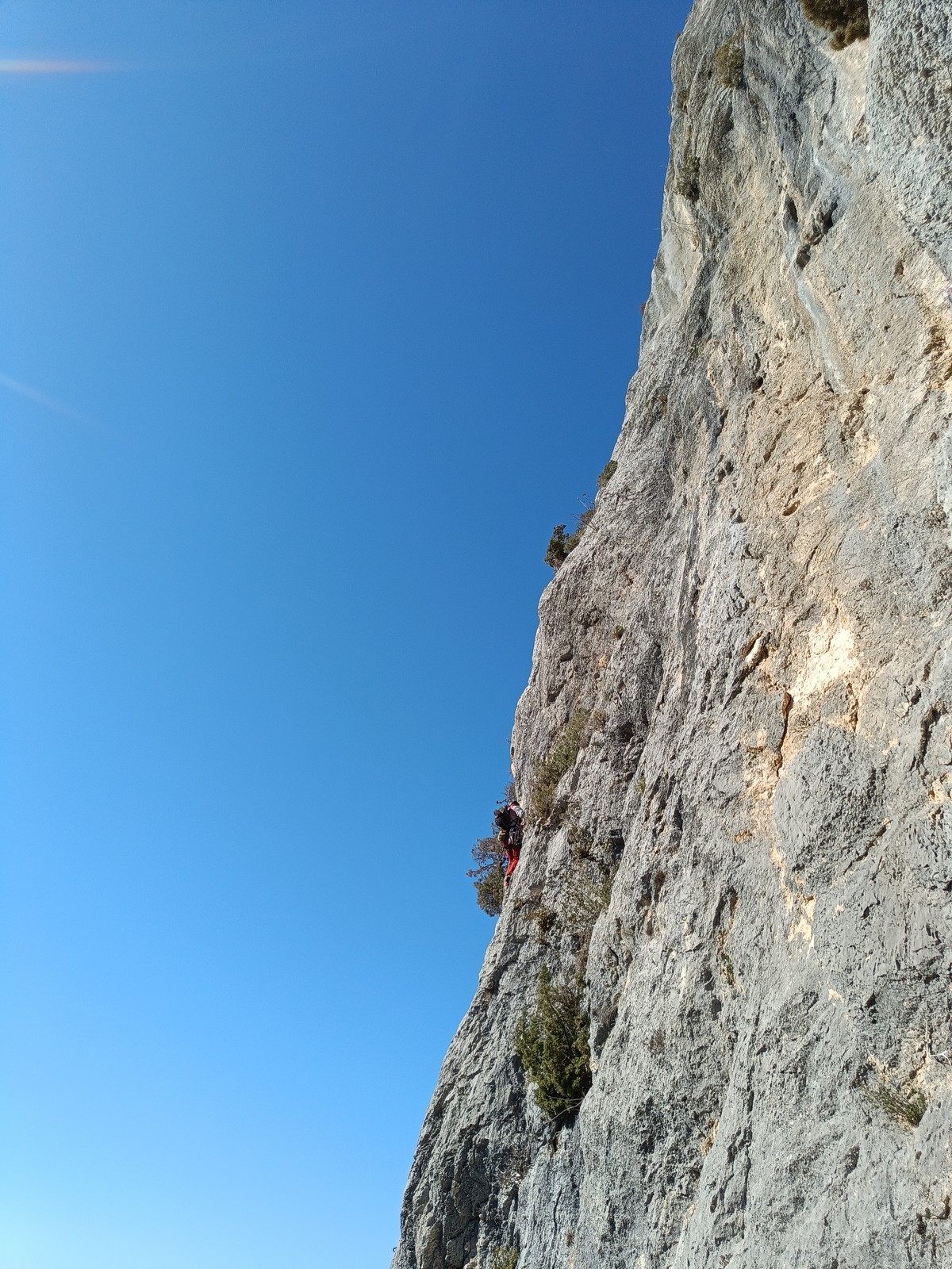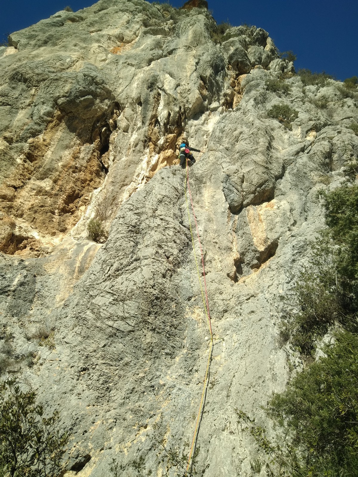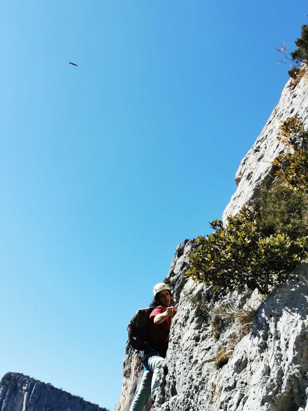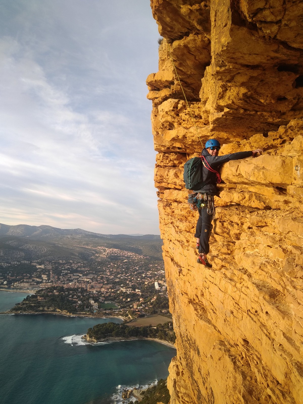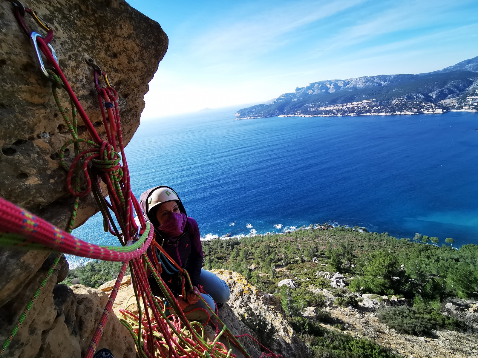 A la base, nous voulions retourner au Cap Canaille pour nous frotter à quelques voies d’ampleur au secteur du sémaphore, mais le mistral a eu raison de notre motivation. C’est donc au secteur Capri, bien abrité, que nous avons décidé d’aller user notre gomme. C’est un secteur d’une dizaine de voies abordables, sur une falaise d’environ 90m, mais avec des lignes qui traversent pas mal pour des voies faisant jusqu’à 8 longueurs.