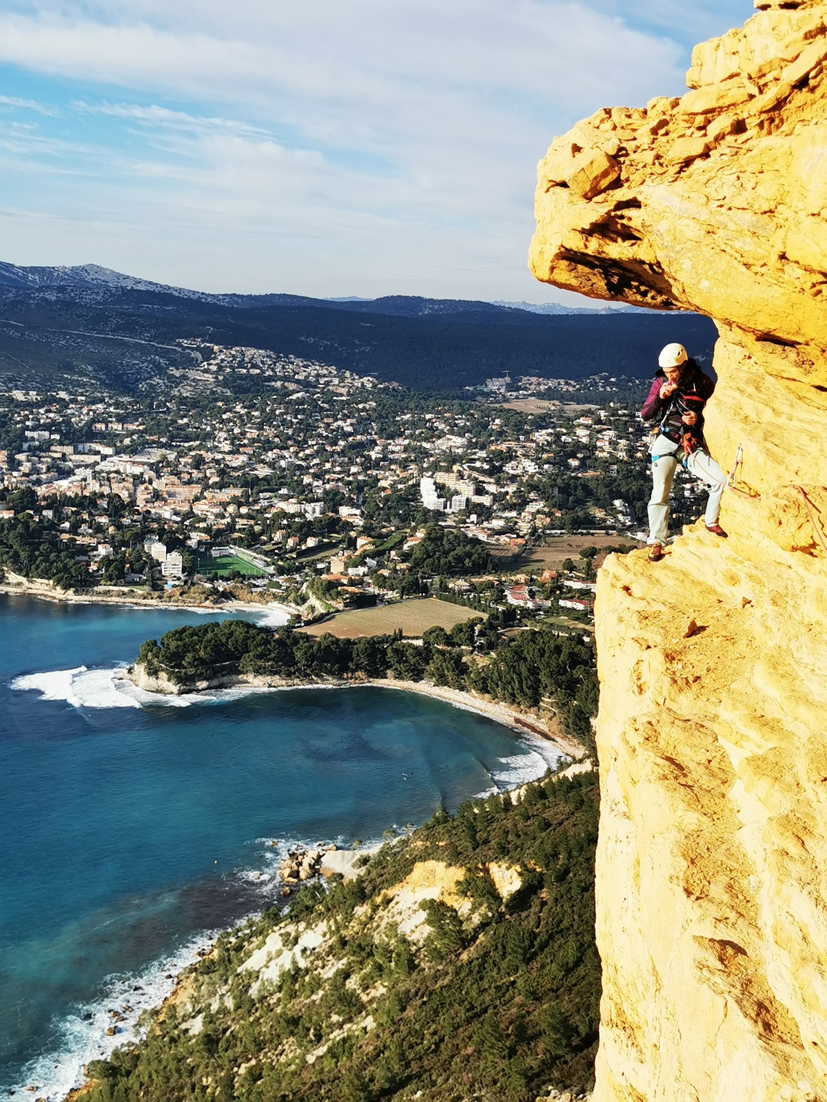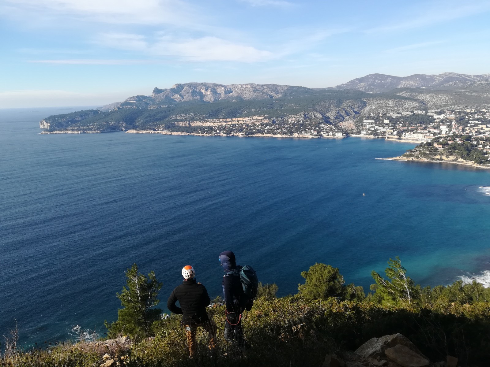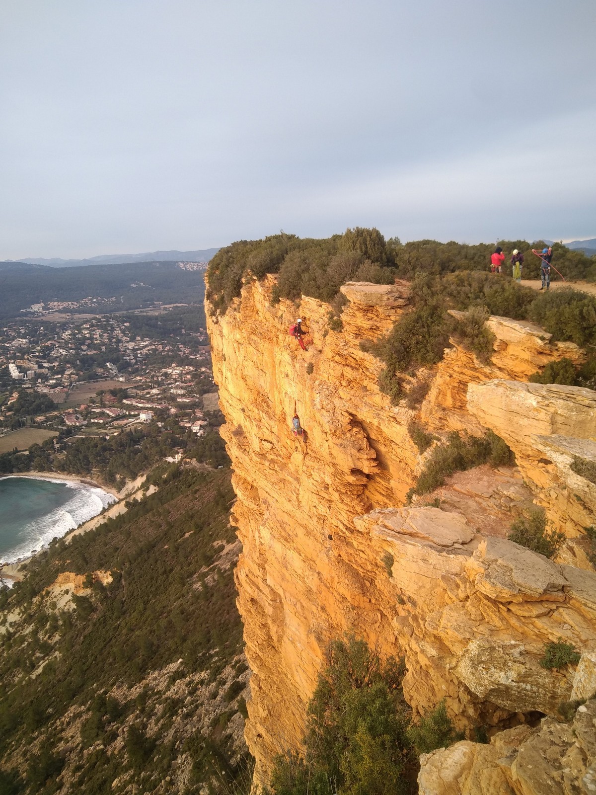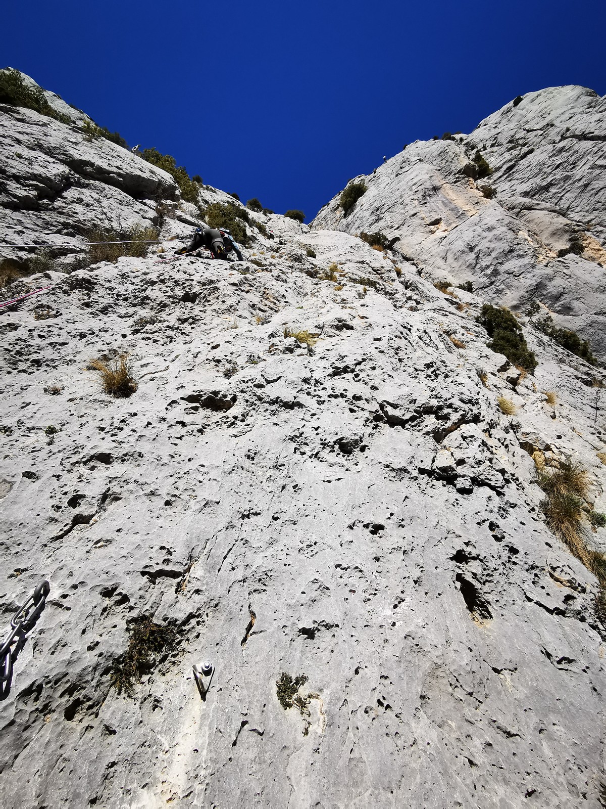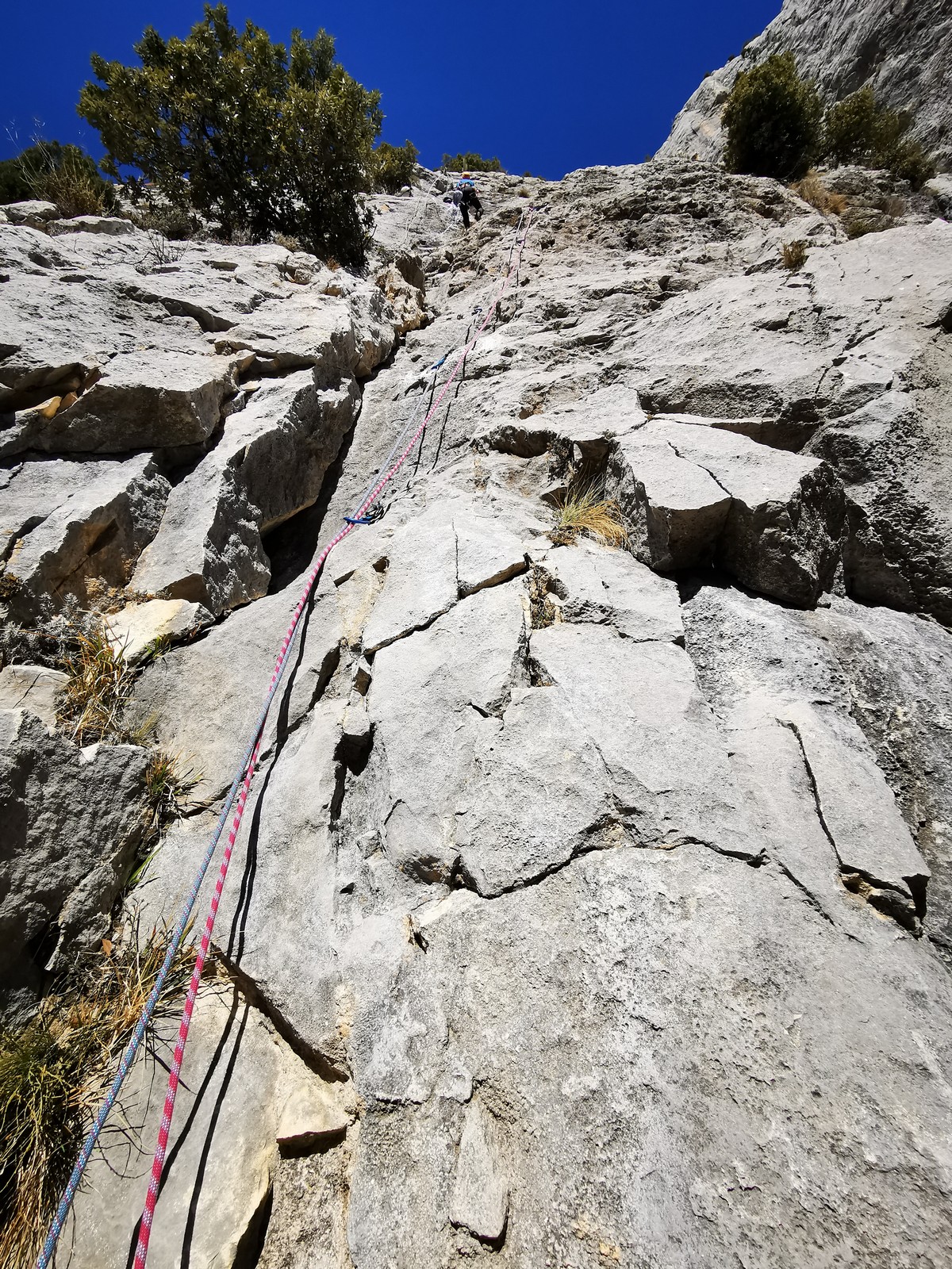 A la base, nous voulions retourner au Cap Canaille pour nous frotter à quelques voies d’ampleur au secteur du sémaphore, mais le mistral a eu raison de notre motivation. C’est donc au secteur Capri, bien abrité, que nous avons décidé d’aller user notre gomme. C’est un secteur d’une dizaine de voies abordables, sur une falaise d’environ 90m, mais avec des lignes qui traversent pas mal pour des voies faisant jusqu’à 8 longueurs.