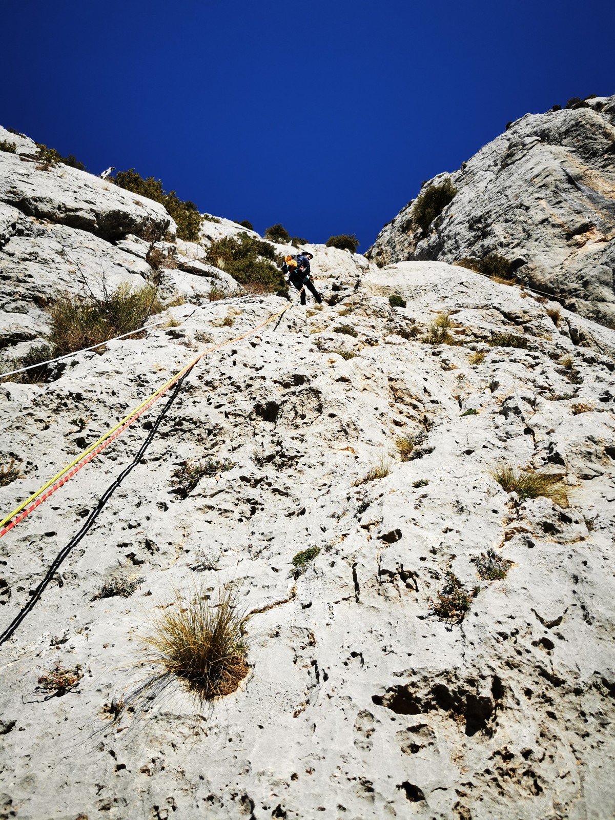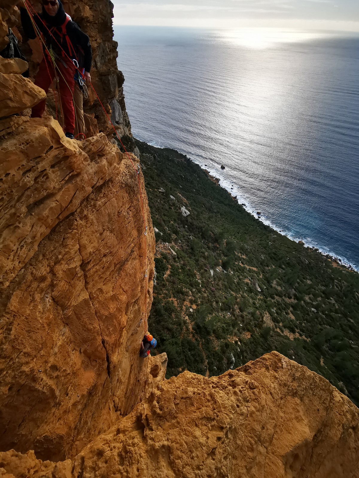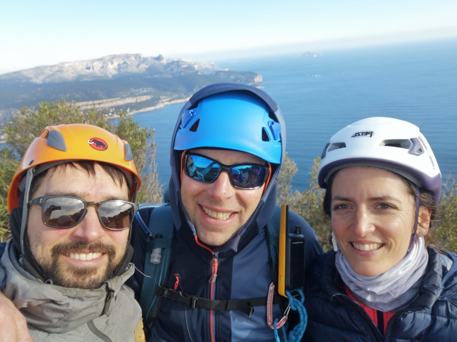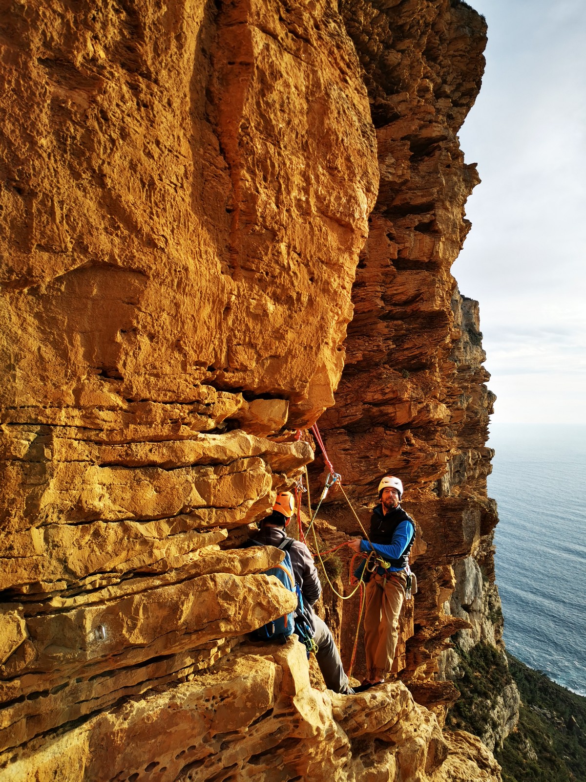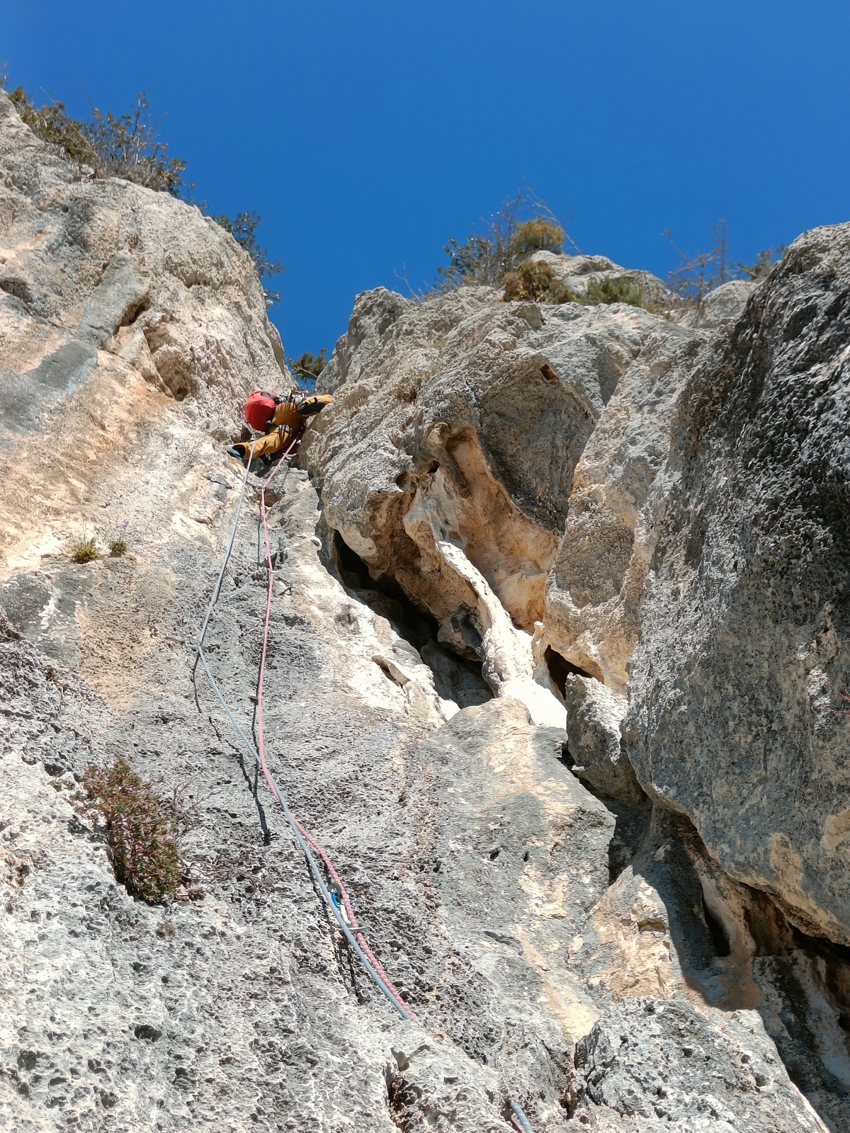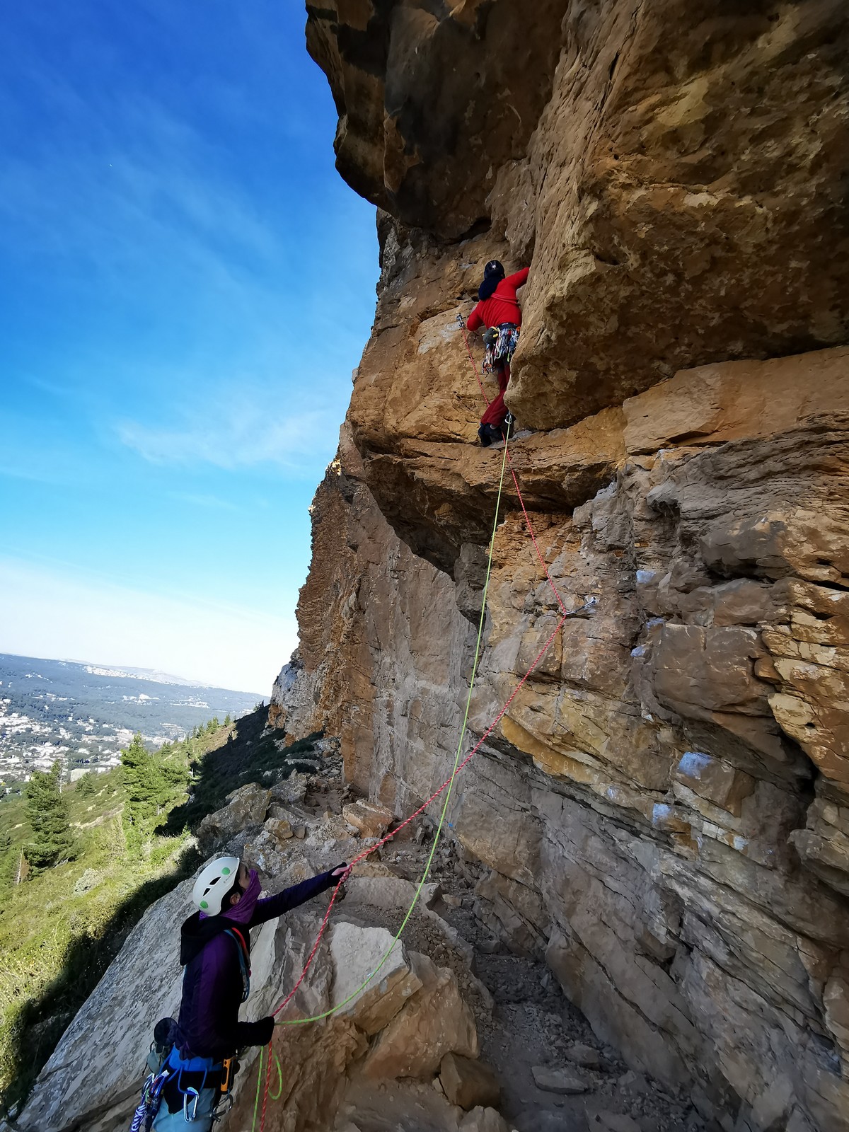 A la base, nous voulions retourner au Cap Canaille pour nous frotter à quelques voies d’ampleur au secteur du sémaphore, mais le mistral a eu raison de notre motivation. C’est donc au secteur Capri, bien abrité, que nous avons décidé d’aller user notre gomme. C’est un secteur d’une dizaine de voies abordables, sur une falaise d’environ 90m, mais avec des lignes qui traversent pas mal pour des voies faisant jusqu’à 8 longueurs.