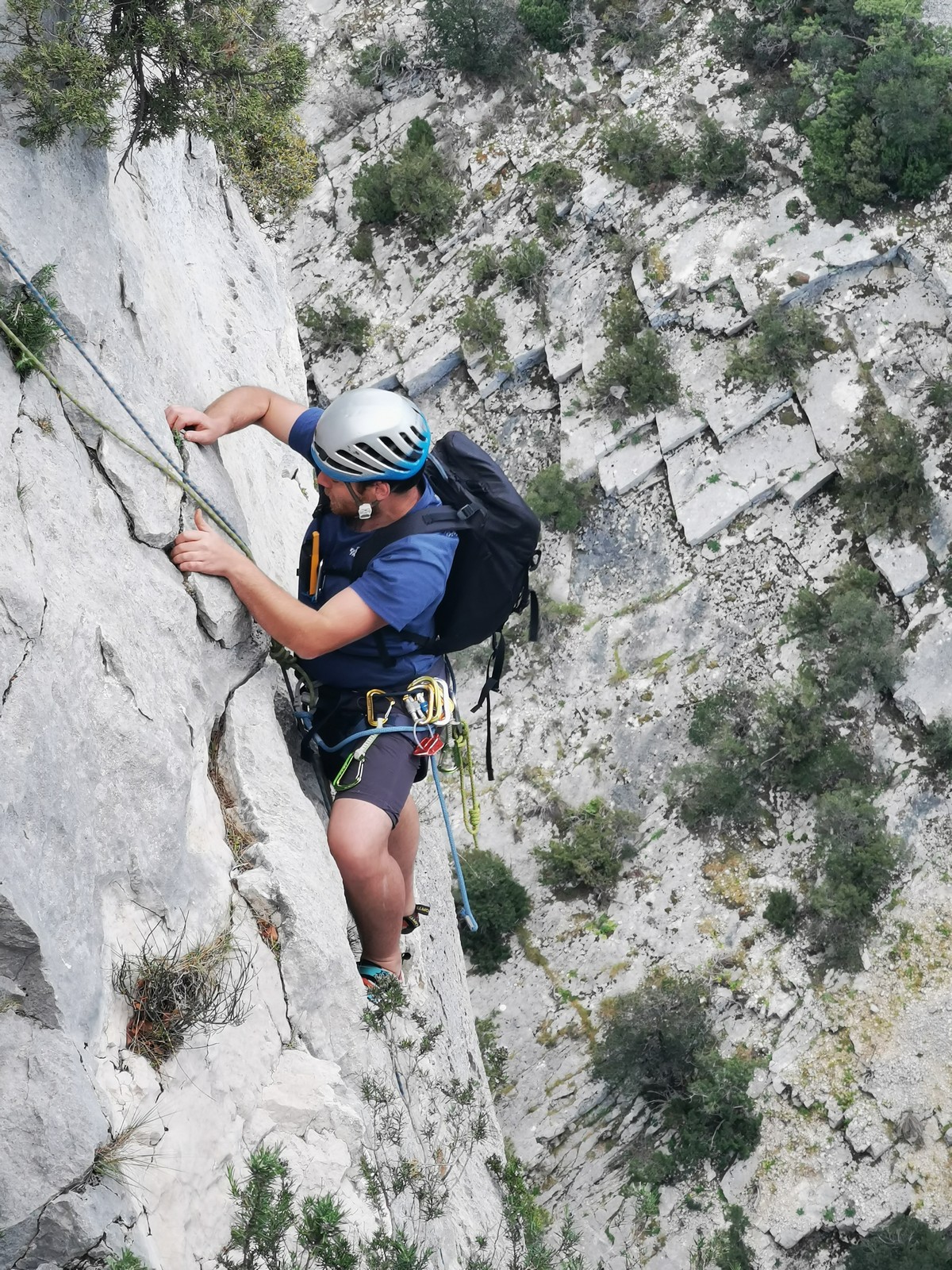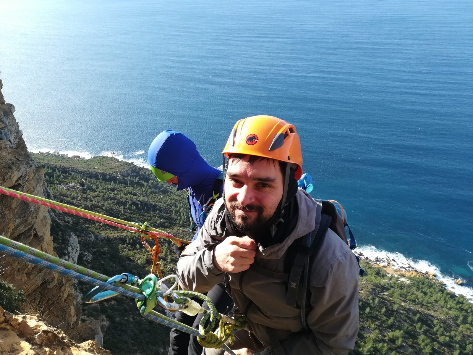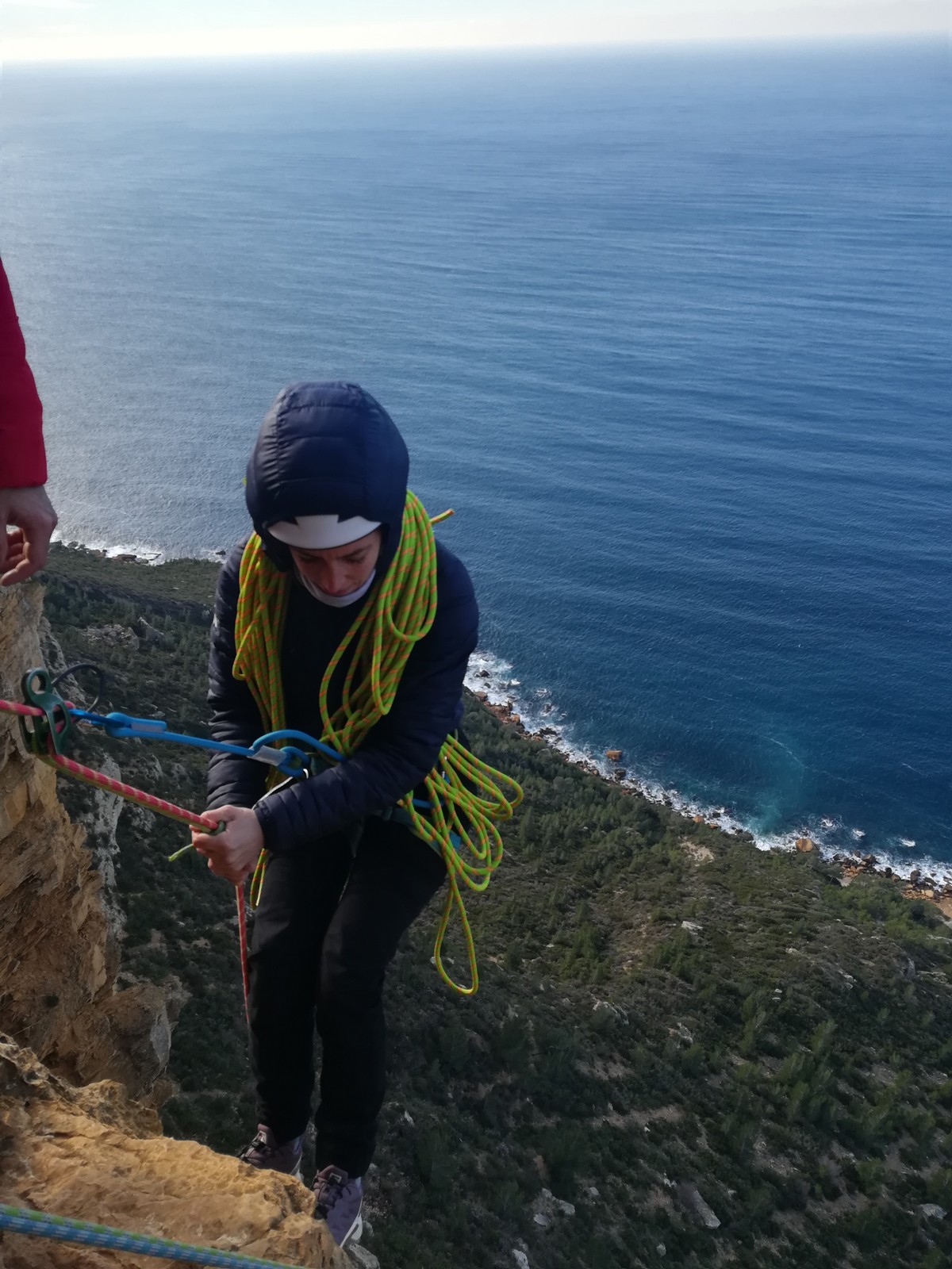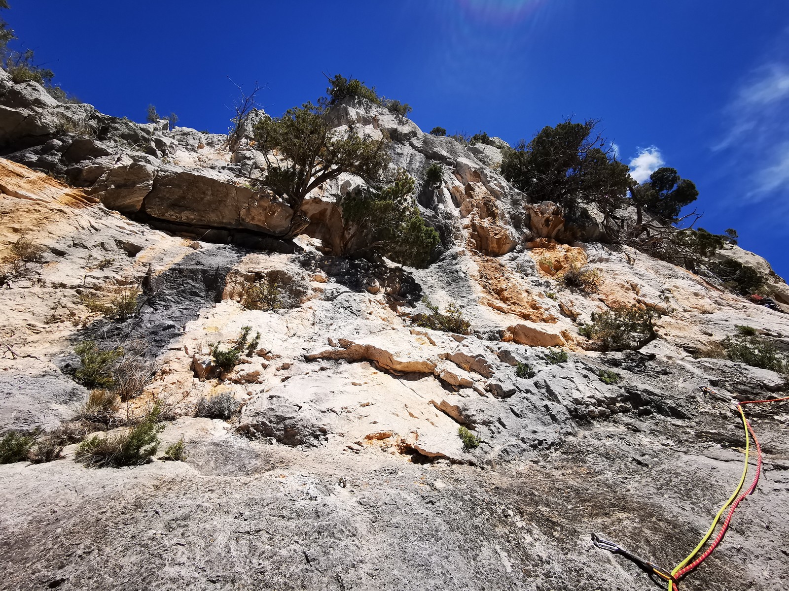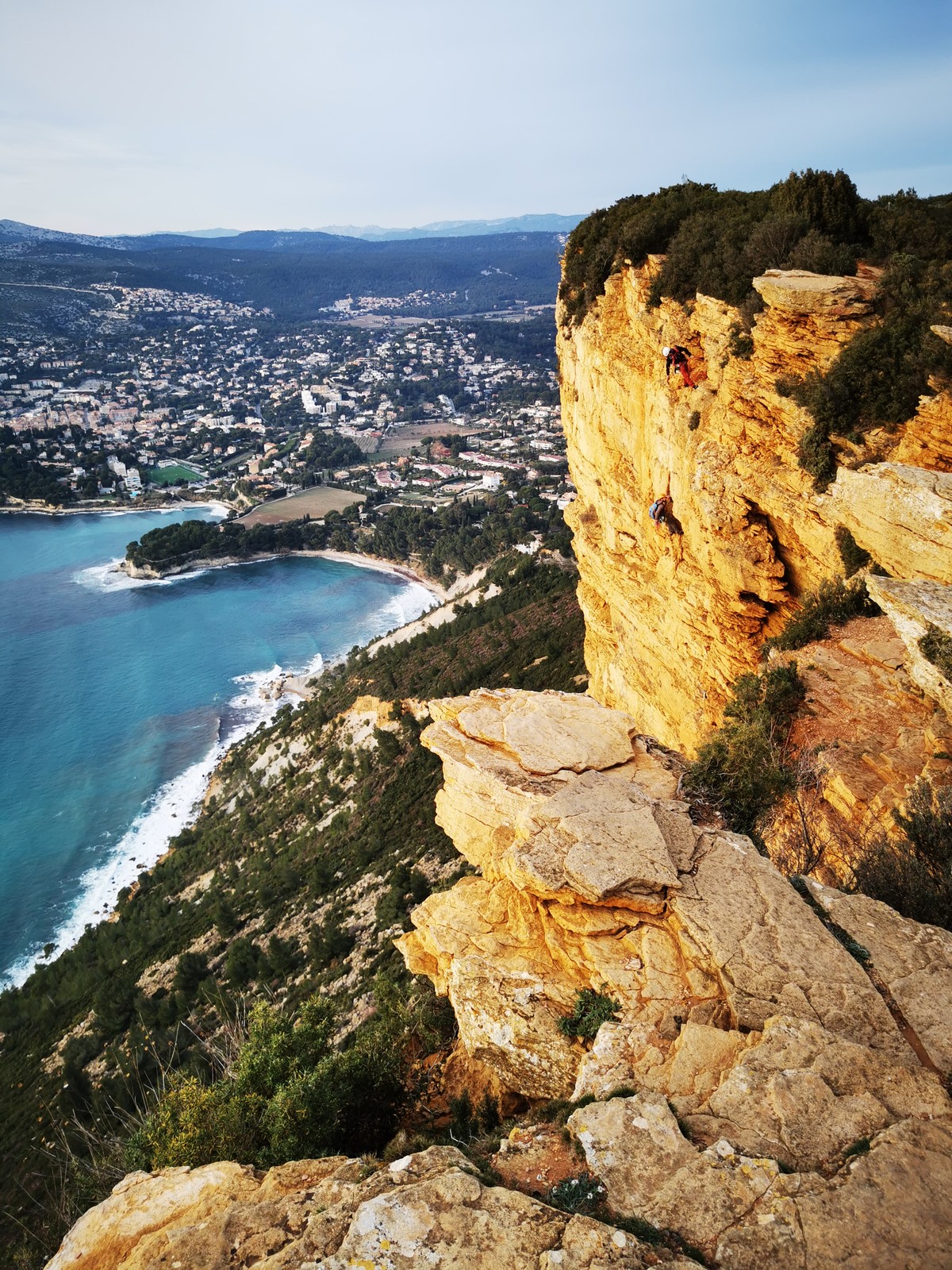 A la base, nous voulions retourner au Cap Canaille pour nous frotter à quelques voies d’ampleur au secteur du sémaphore, mais le mistral a eu raison de notre motivation. C’est donc au secteur Capri, bien abrité, que nous avons décidé d’aller user notre gomme. C’est un secteur d’une dizaine de voies abordables, sur une falaise d’environ 90m, mais avec des lignes qui traversent pas mal pour des voies faisant jusqu’à 8 longueurs.