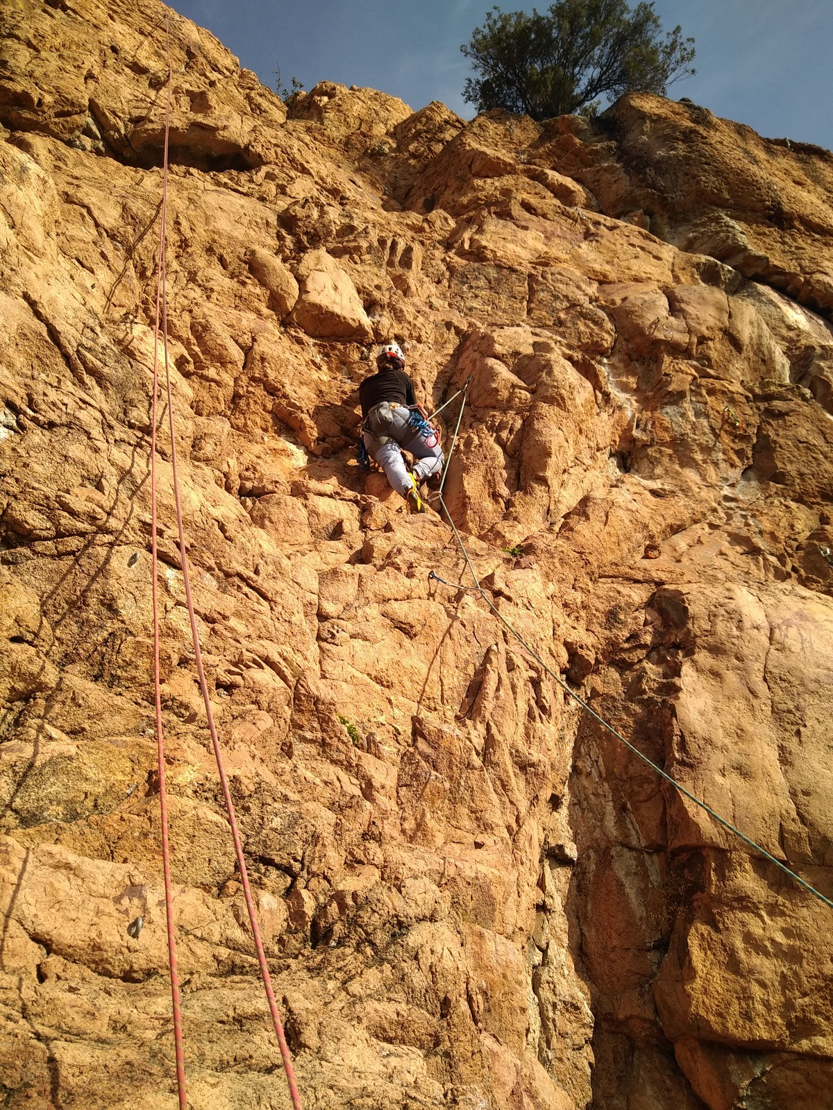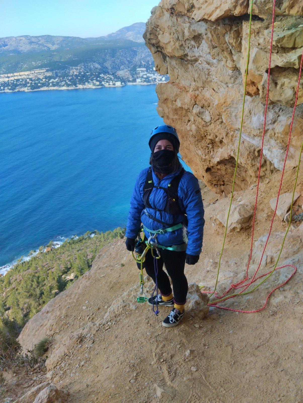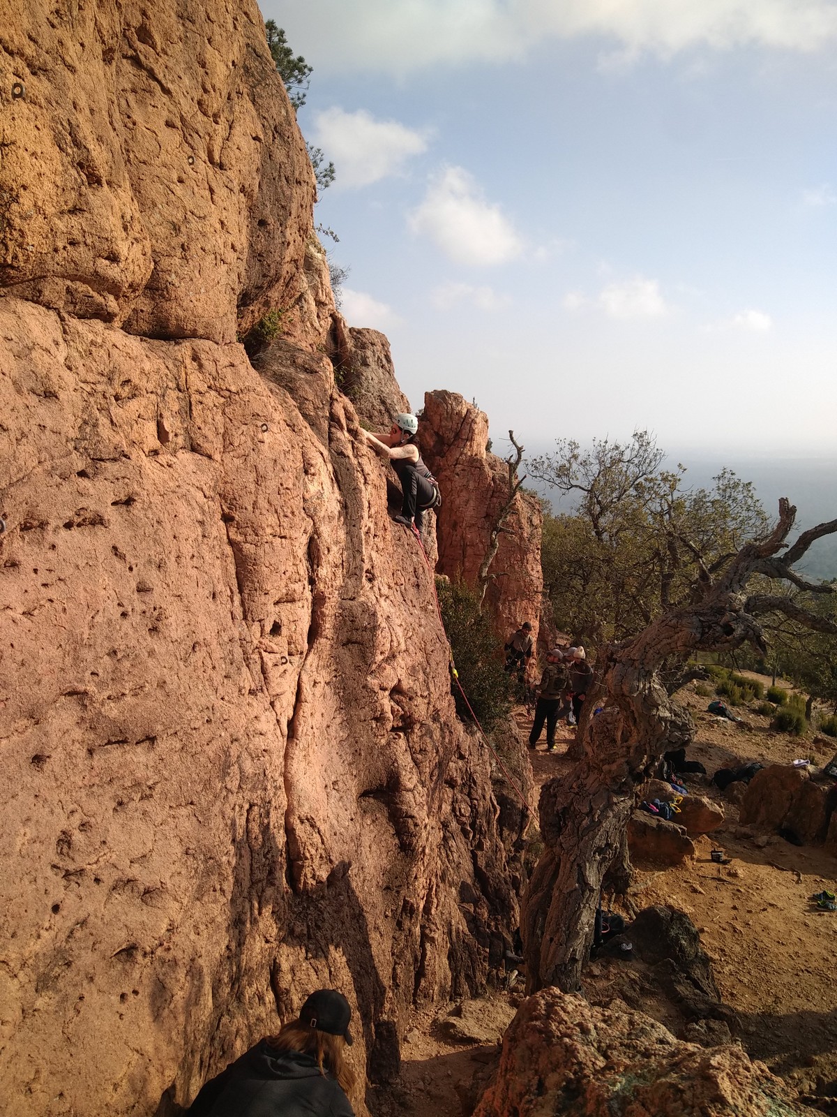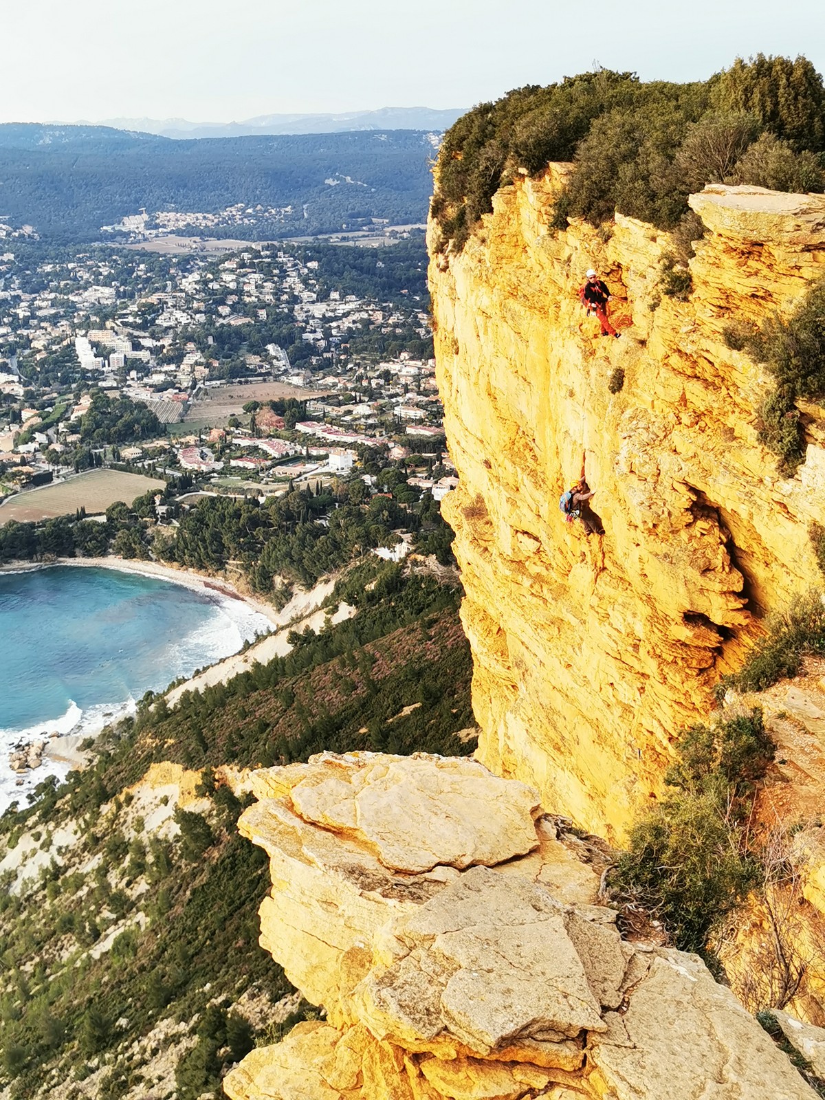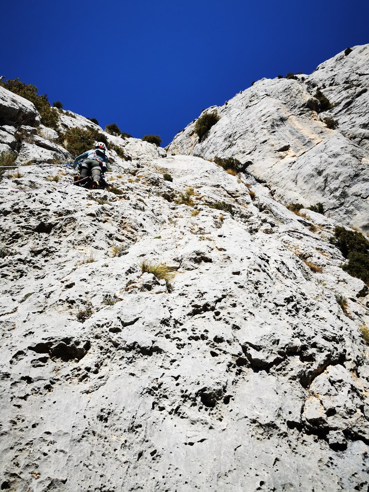 A la base, nous voulions retourner au Cap Canaille pour nous frotter à quelques voies d’ampleur au secteur du sémaphore, mais le mistral a eu raison de notre motivation. C’est donc au secteur Capri, bien abrité, que nous avons décidé d’aller user notre gomme. C’est un secteur d’une dizaine de voies abordables, sur une falaise d’environ 90m, mais avec des lignes qui traversent pas mal pour des voies faisant jusqu’à 8 longueurs.