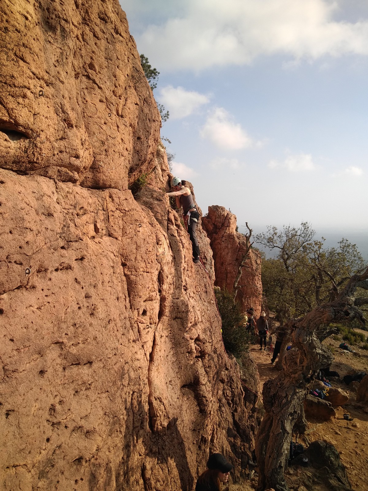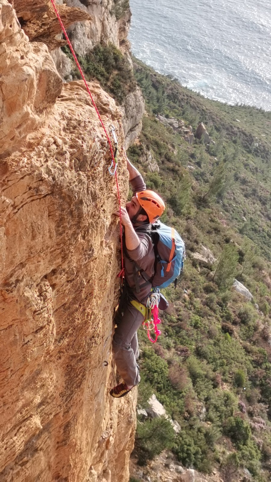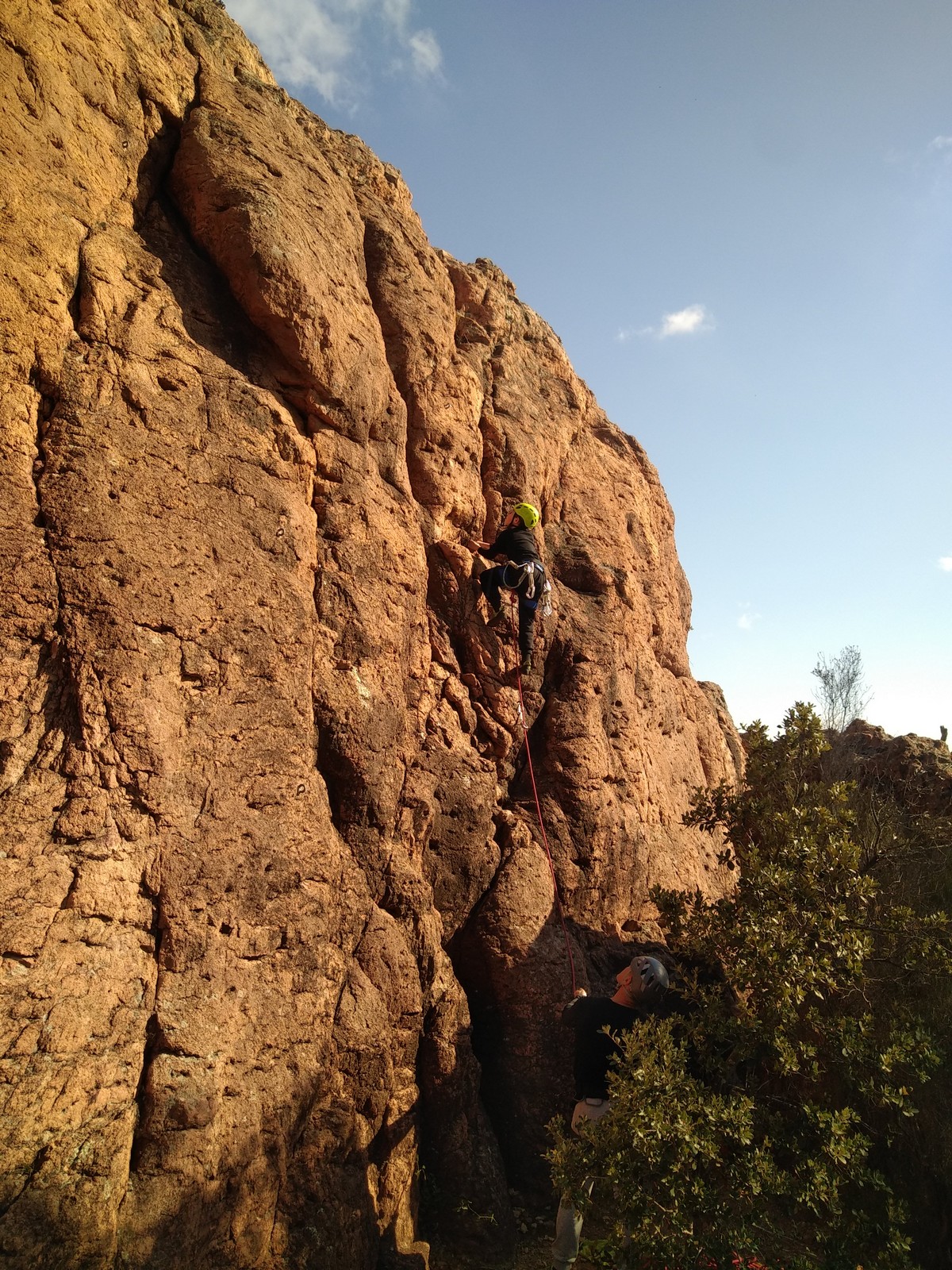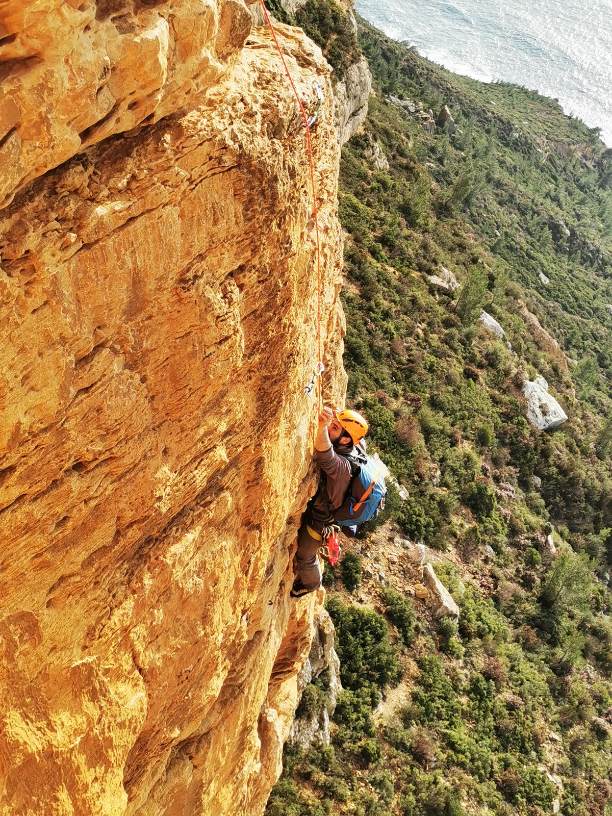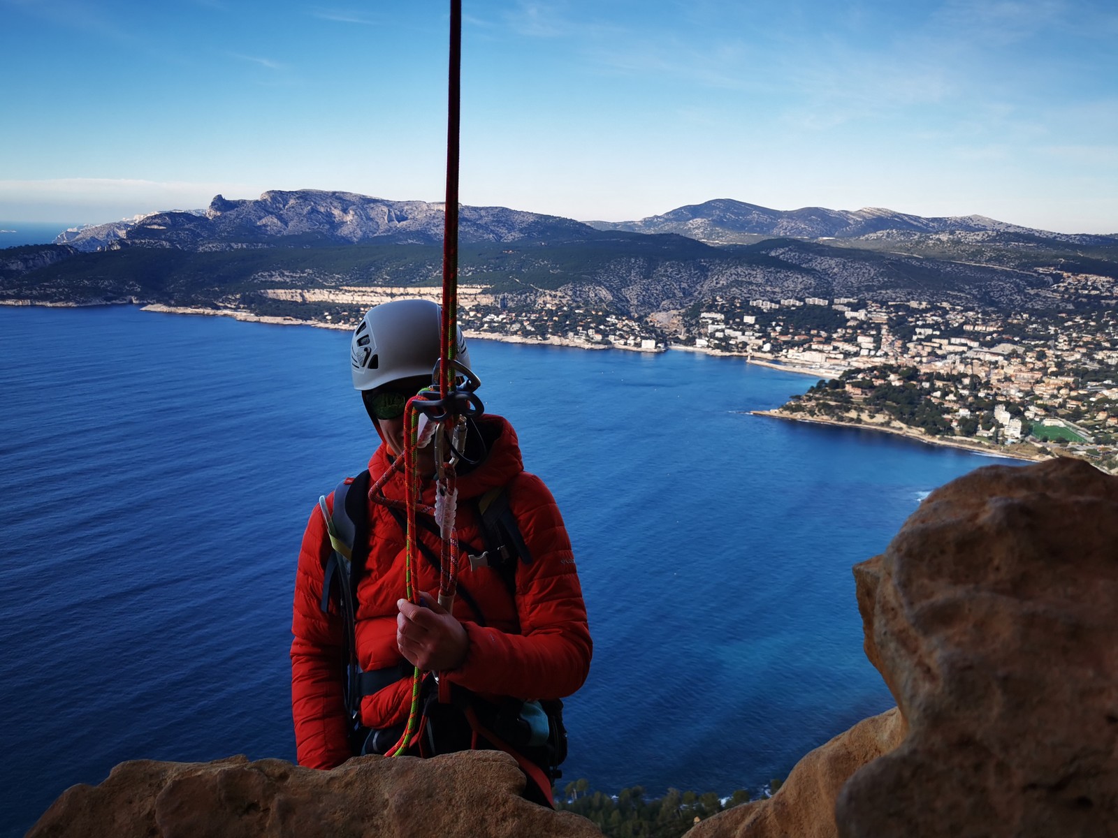 A la base, nous voulions retourner au Cap Canaille pour nous frotter à quelques voies d’ampleur au secteur du sémaphore, mais le mistral a eu raison de notre motivation. C’est donc au secteur Capri, bien abrité, que nous avons décidé d’aller user notre gomme. C’est un secteur d’une dizaine de voies abordables, sur une falaise d’environ 90m, mais avec des lignes qui traversent pas mal pour des voies faisant jusqu’à 8 longueurs.