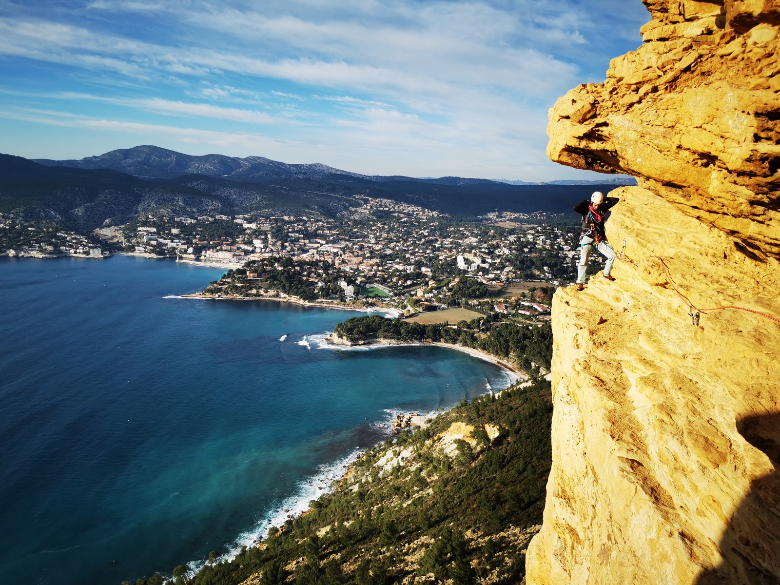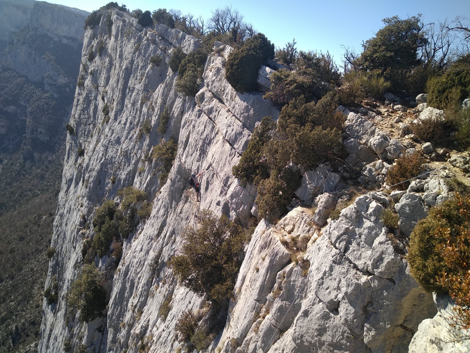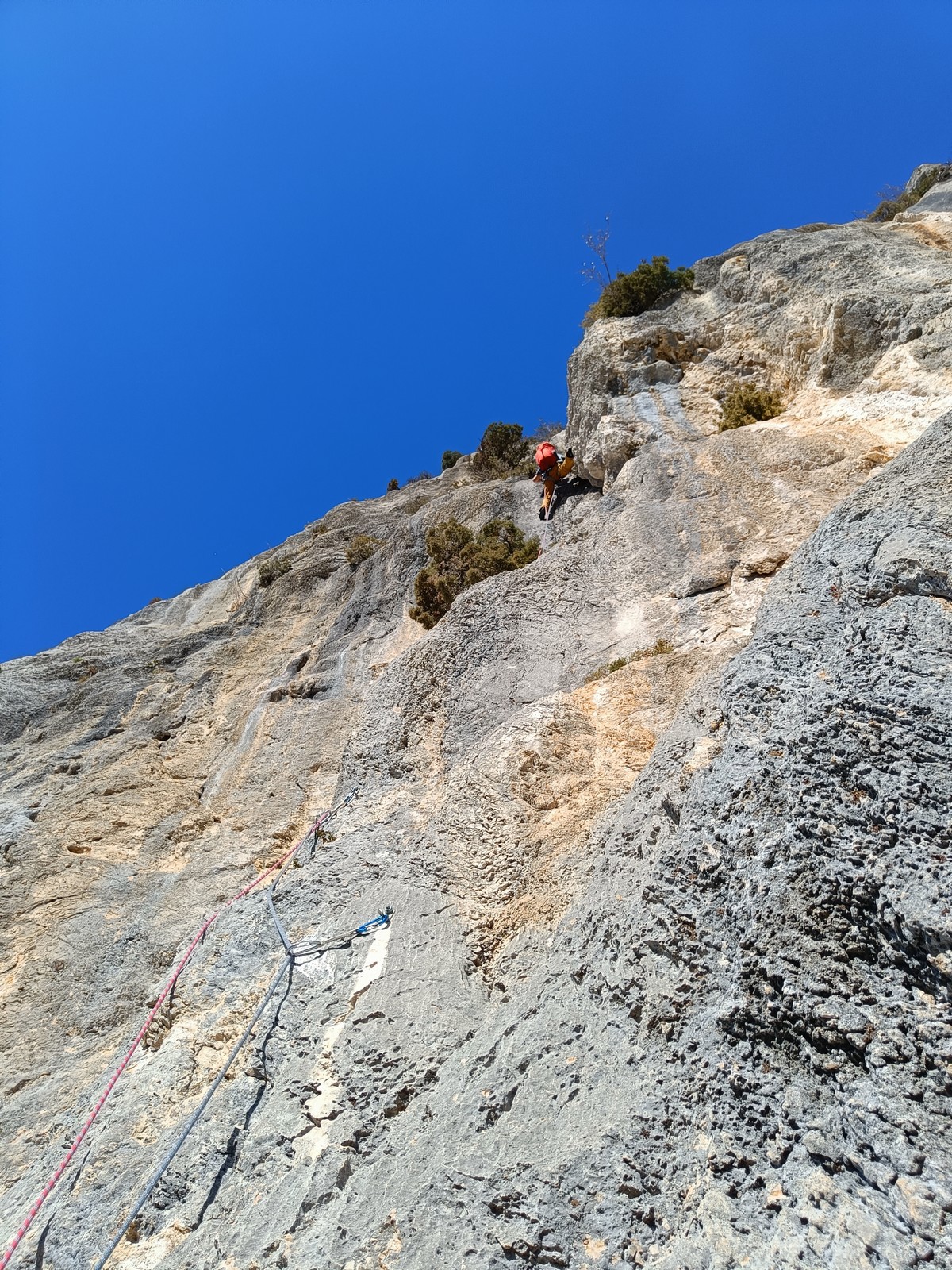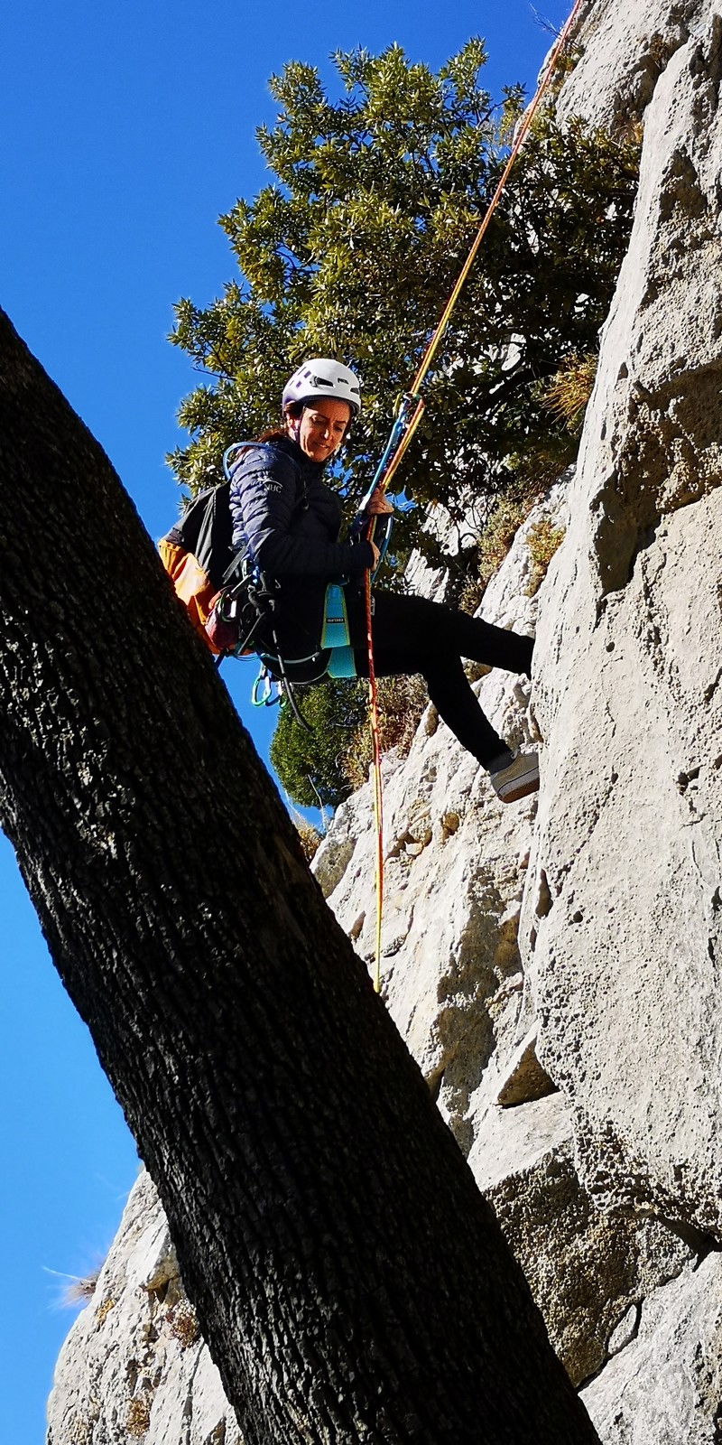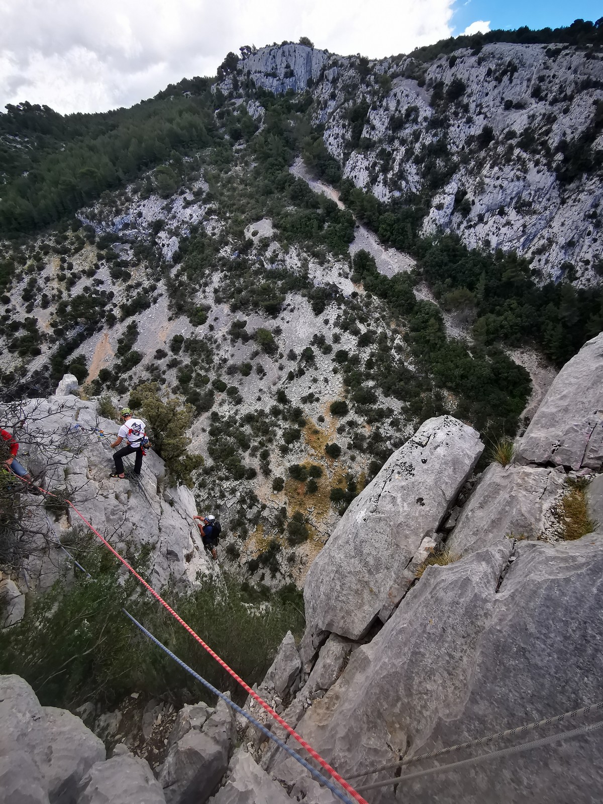 A la base, nous voulions retourner au Cap Canaille pour nous frotter à quelques voies d’ampleur au secteur du sémaphore, mais le mistral a eu raison de notre motivation. C’est donc au secteur Capri, bien abrité, que nous avons décidé d’aller user notre gomme. C’est un secteur d’une dizaine de voies abordables, sur une falaise d’environ 90m, mais avec des lignes qui traversent pas mal pour des voies faisant jusqu’à 8 longueurs.