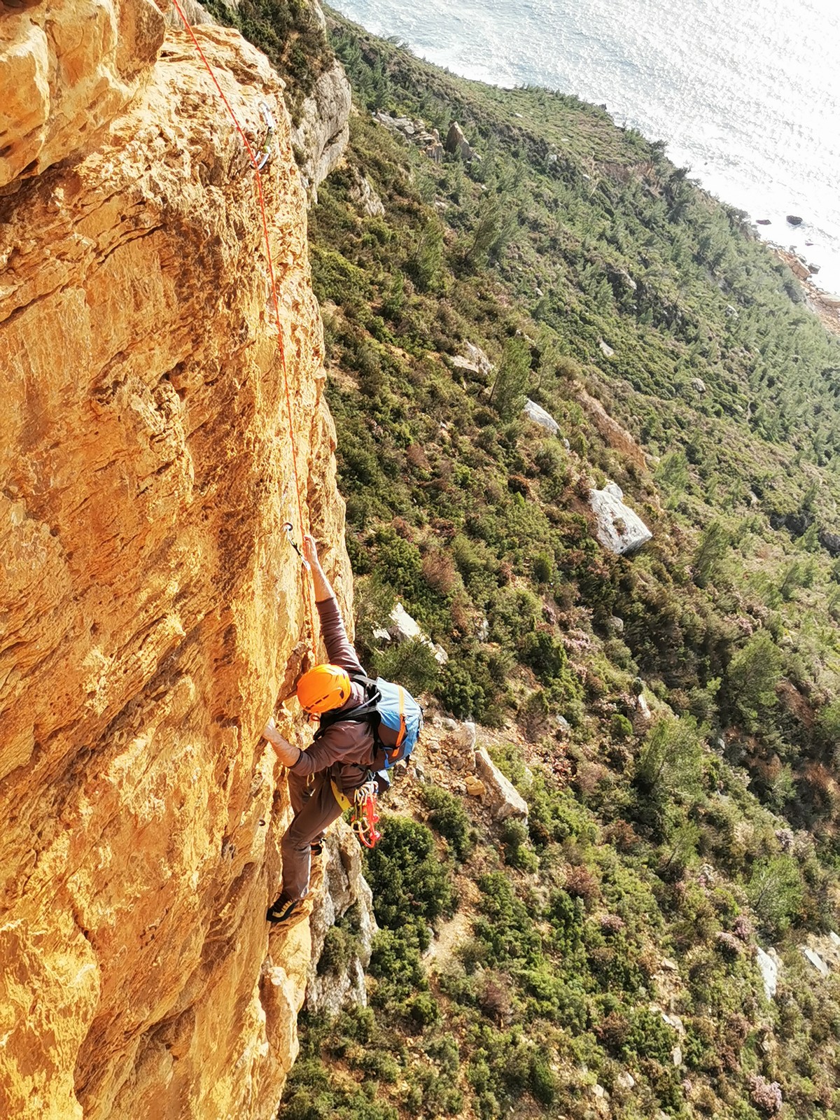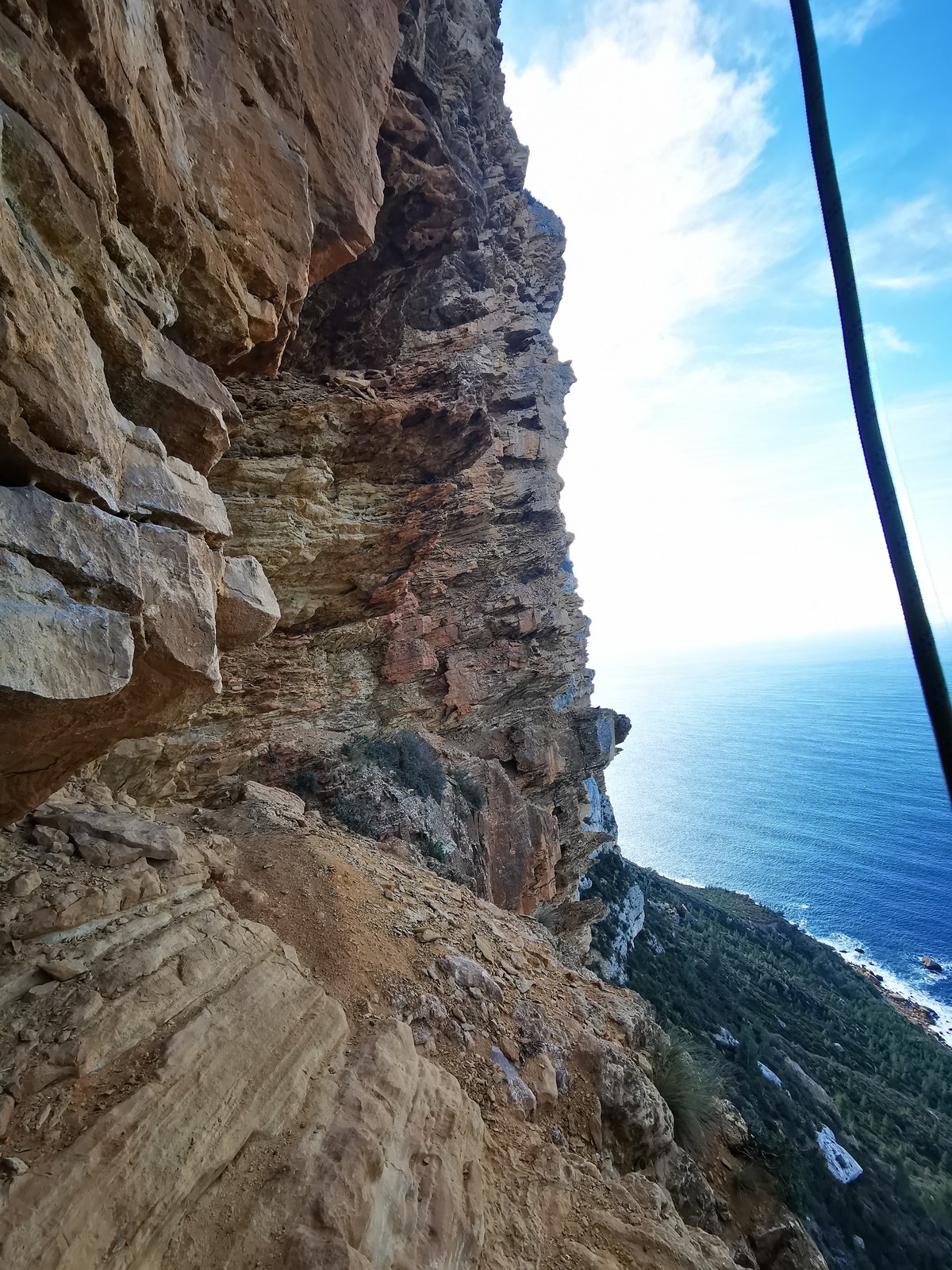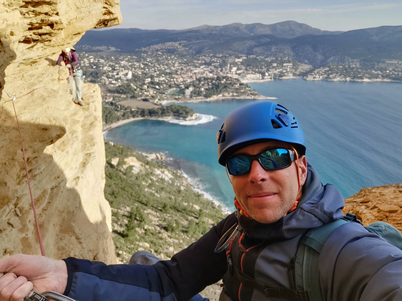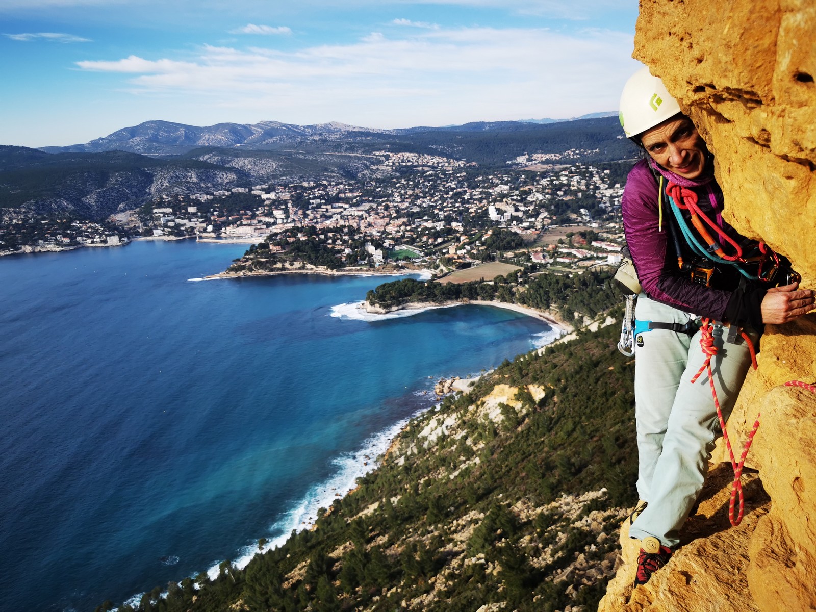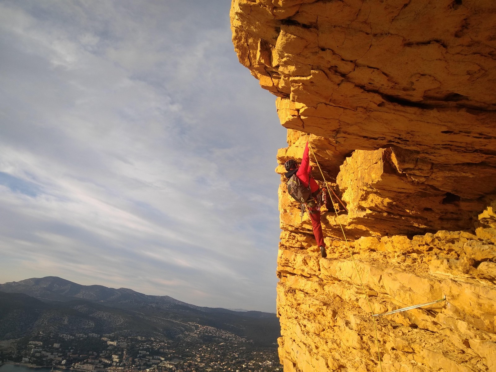 A la base, nous voulions retourner au Cap Canaille pour nous frotter à quelques voies d’ampleur au secteur du sémaphore, mais le mistral a eu raison de notre motivation. C’est donc au secteur Capri, bien abrité, que nous avons décidé d’aller user notre gomme. C’est un secteur d’une dizaine de voies abordables, sur une falaise d’environ 90m, mais avec des lignes qui traversent pas mal pour des voies faisant jusqu’à 8 longueurs.