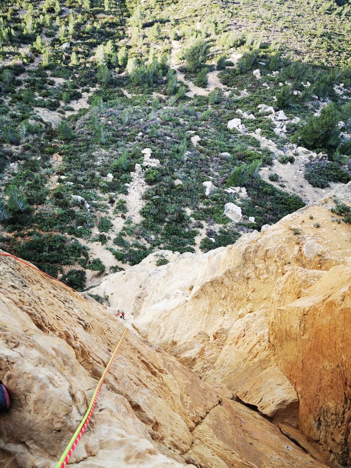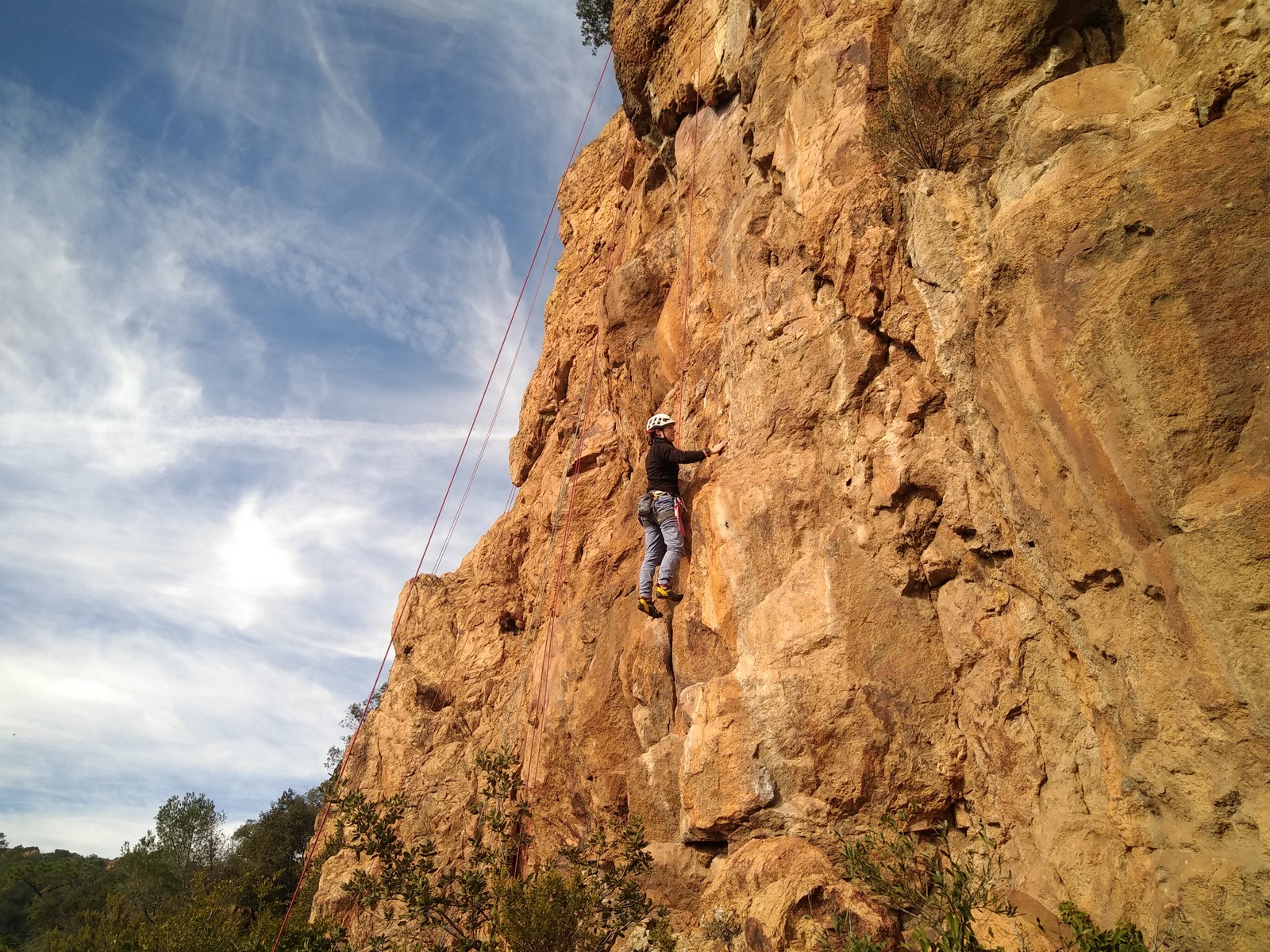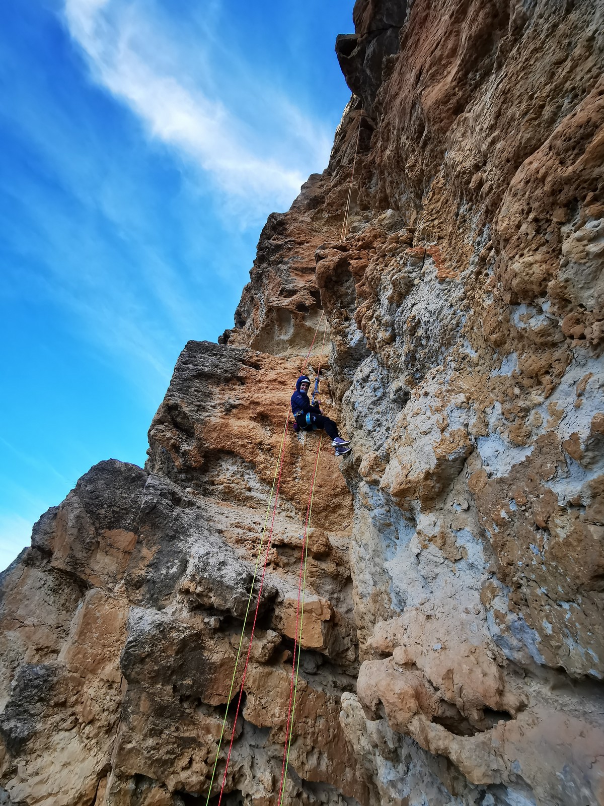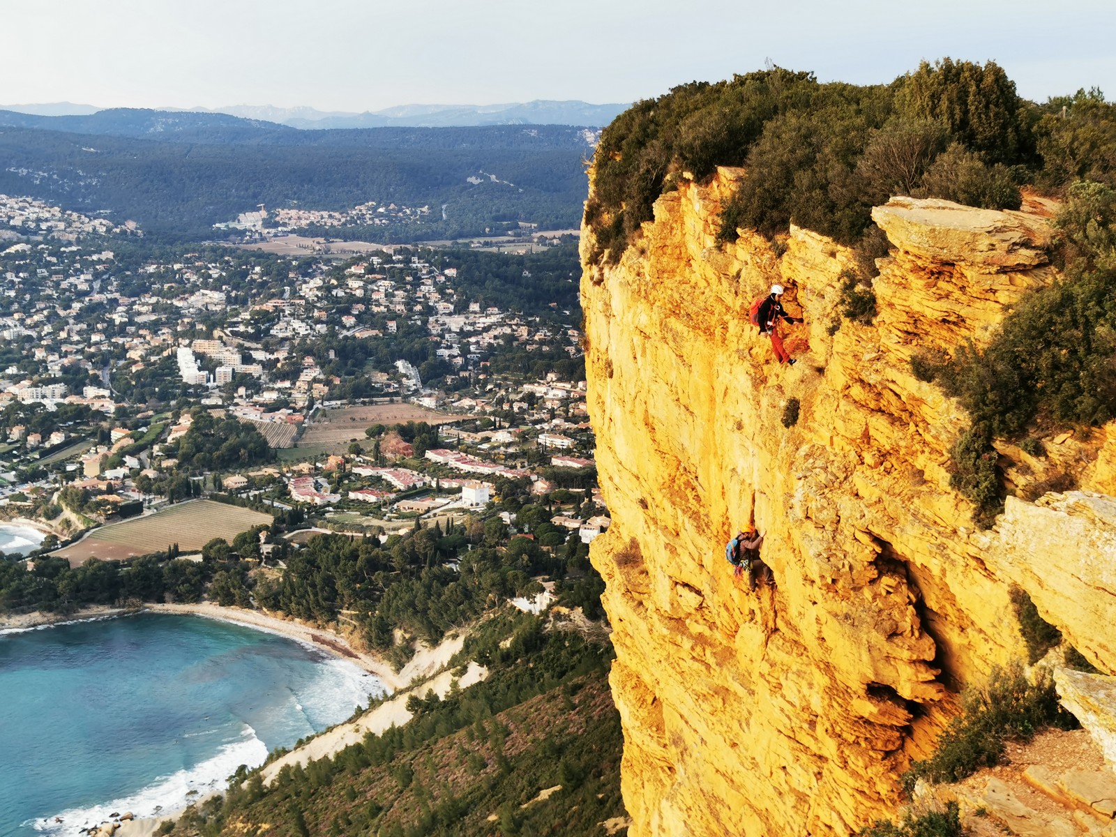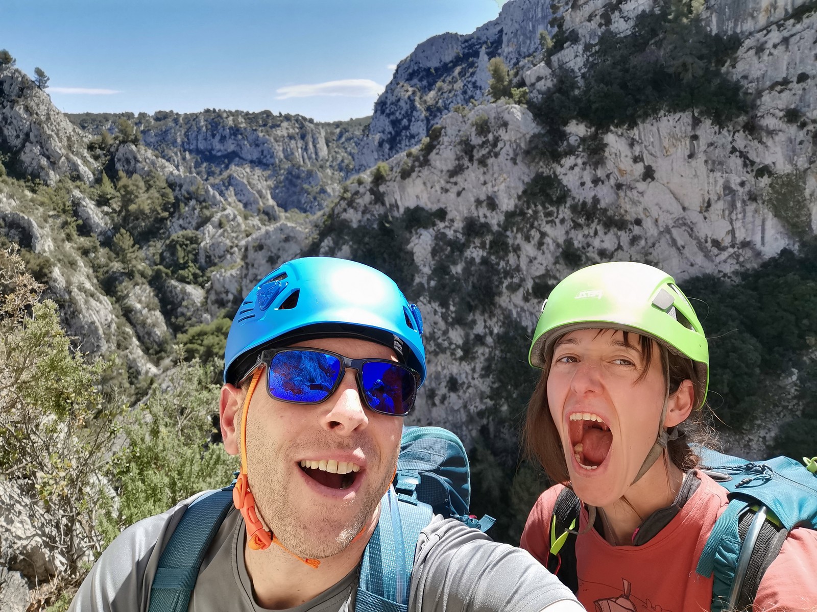 A la base, nous voulions retourner au Cap Canaille pour nous frotter à quelques voies d’ampleur au secteur du sémaphore, mais le mistral a eu raison de notre motivation. C’est donc au secteur Capri, bien abrité, que nous avons décidé d’aller user notre gomme. C’est un secteur d’une dizaine de voies abordables, sur une falaise d’environ 90m, mais avec des lignes qui traversent pas mal pour des voies faisant jusqu’à 8 longueurs.