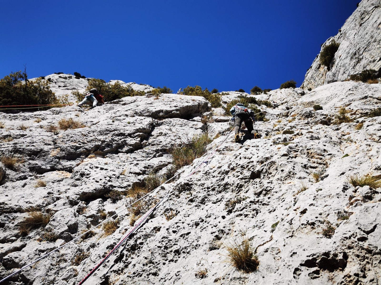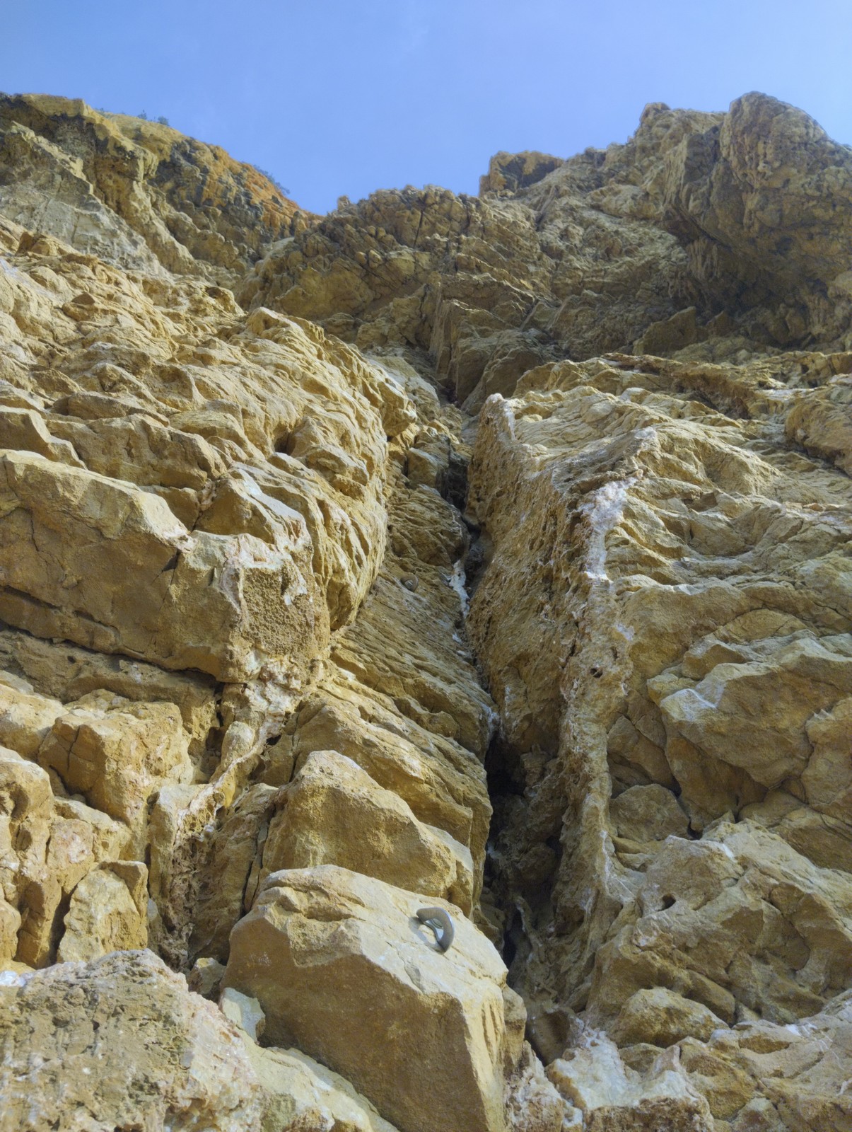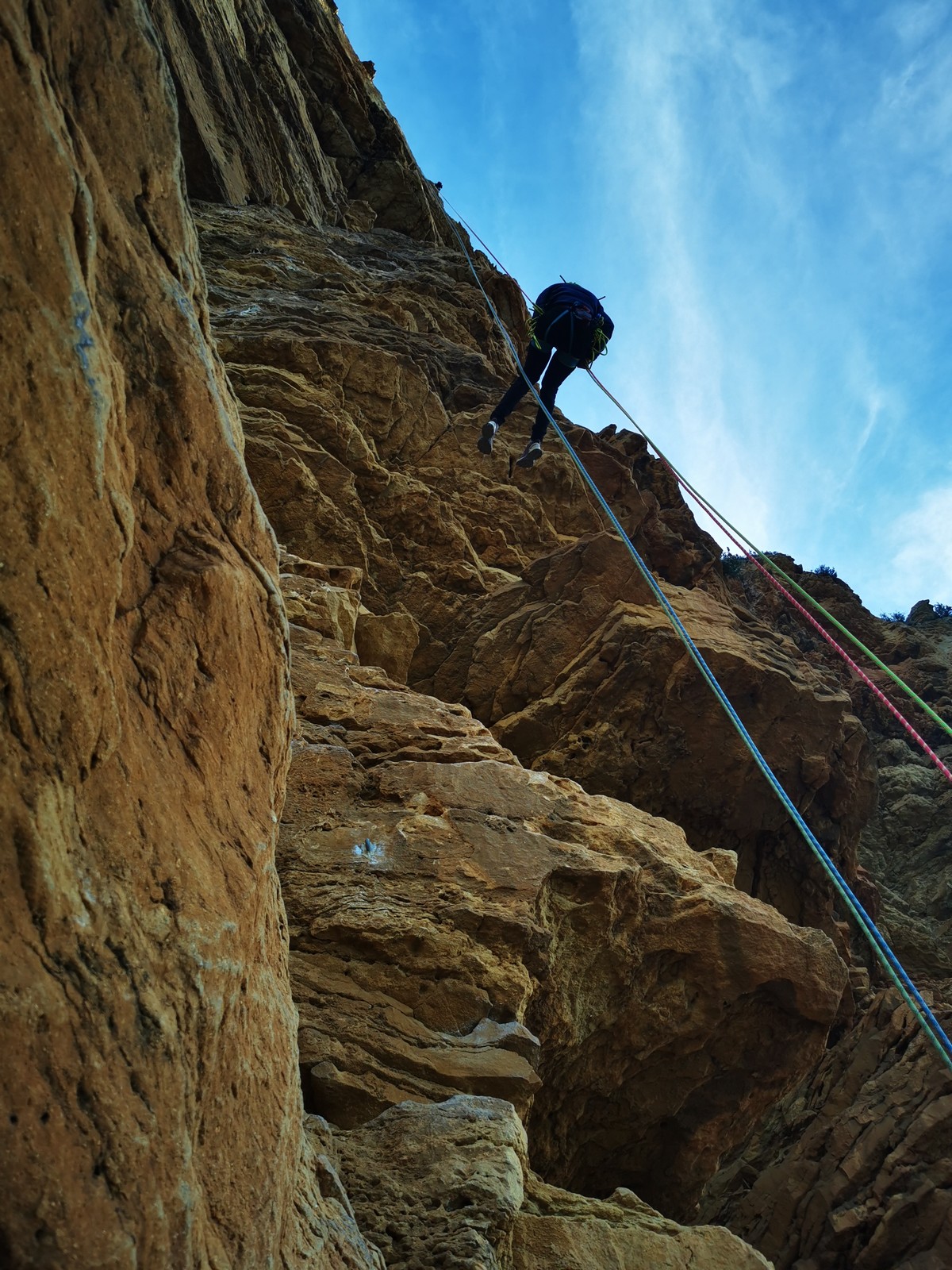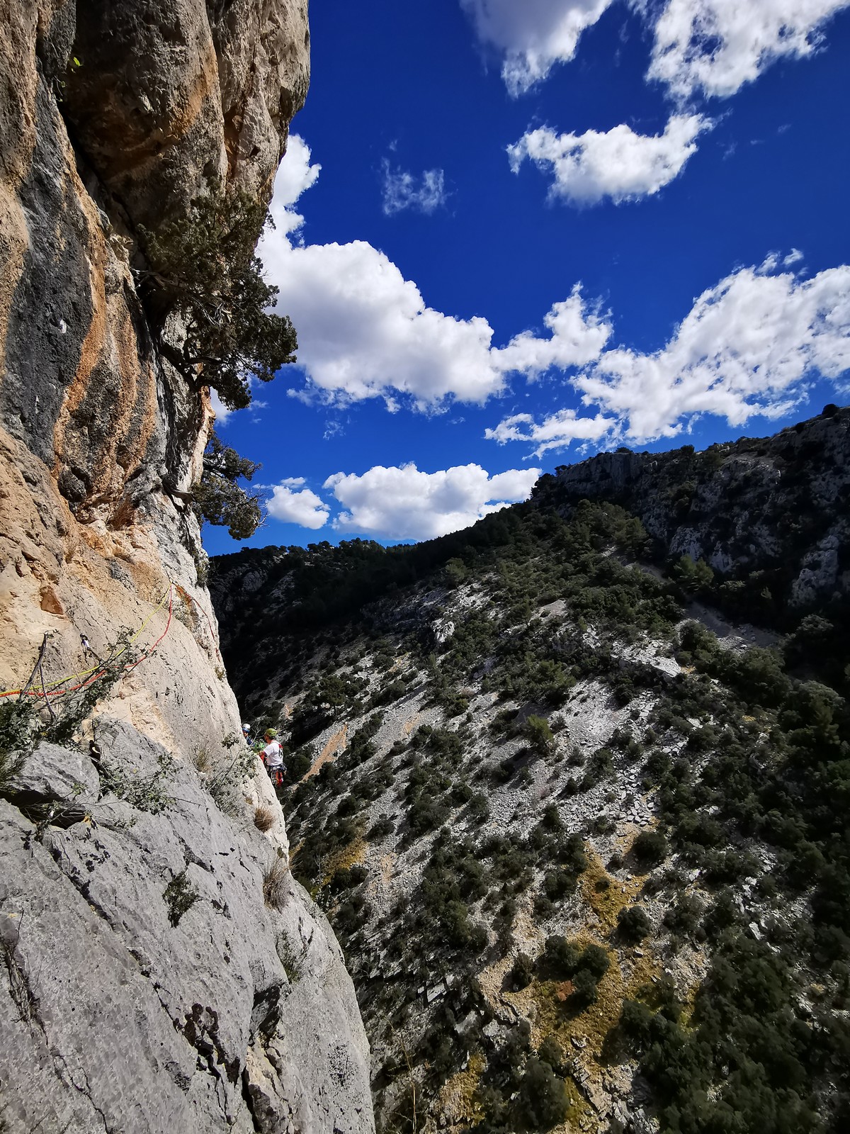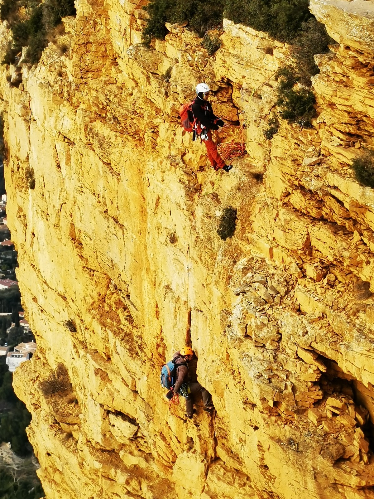 A la base, nous voulions retourner au Cap Canaille pour nous frotter à quelques voies d’ampleur au secteur du sémaphore, mais le mistral a eu raison de notre motivation. C’est donc au secteur Capri, bien abrité, que nous avons décidé d’aller user notre gomme. C’est un secteur d’une dizaine de voies abordables, sur une falaise d’environ 90m, mais avec des lignes qui traversent pas mal pour des voies faisant jusqu’à 8 longueurs.