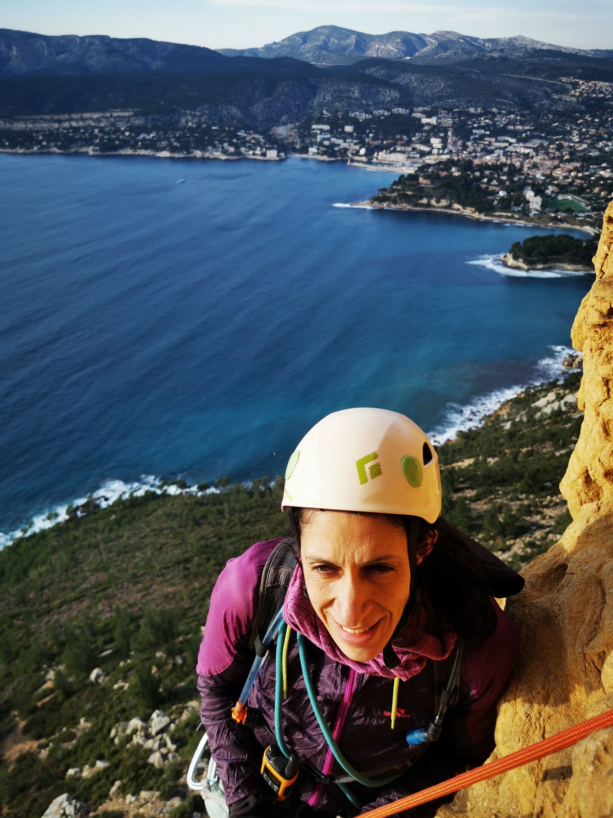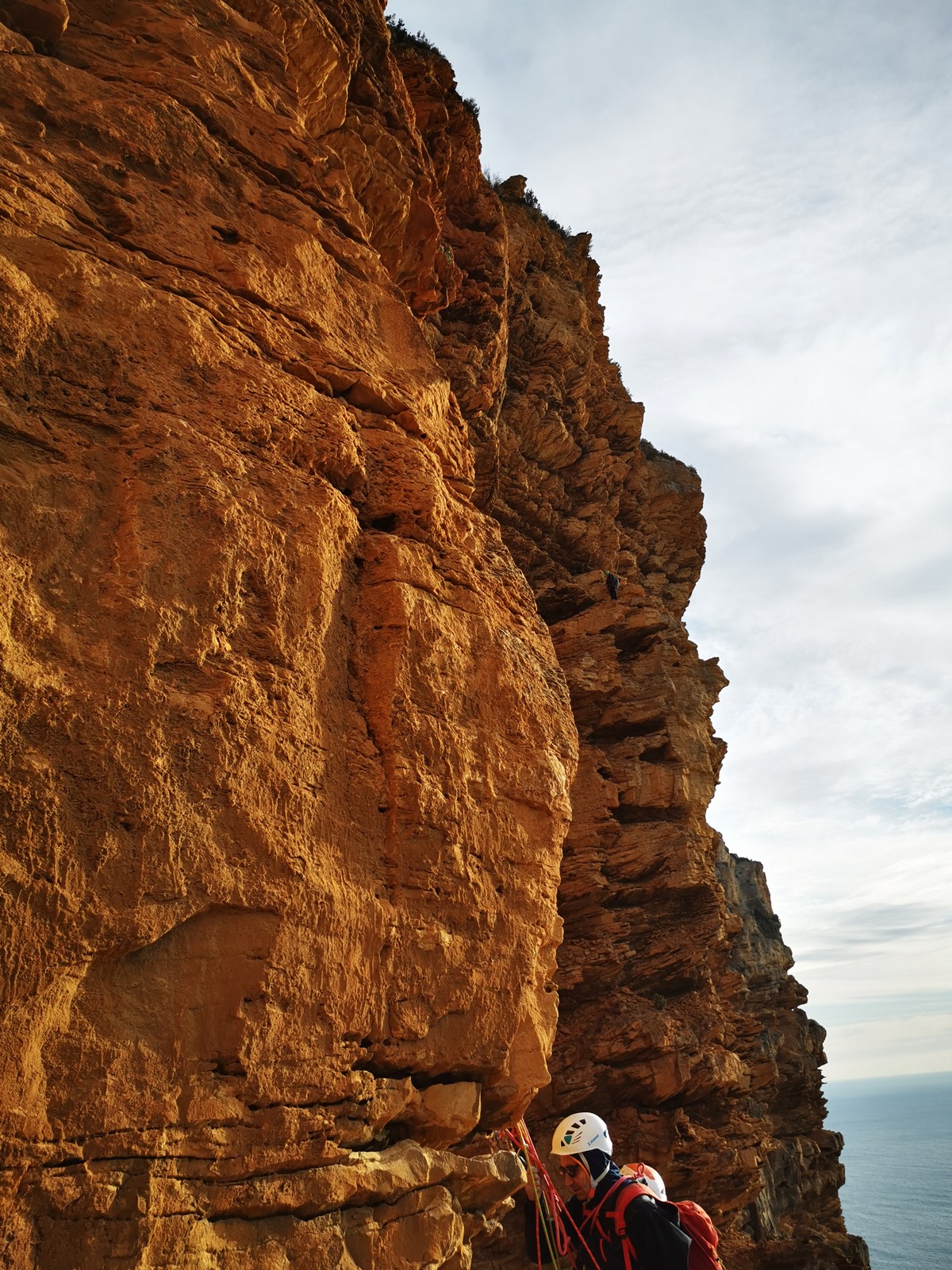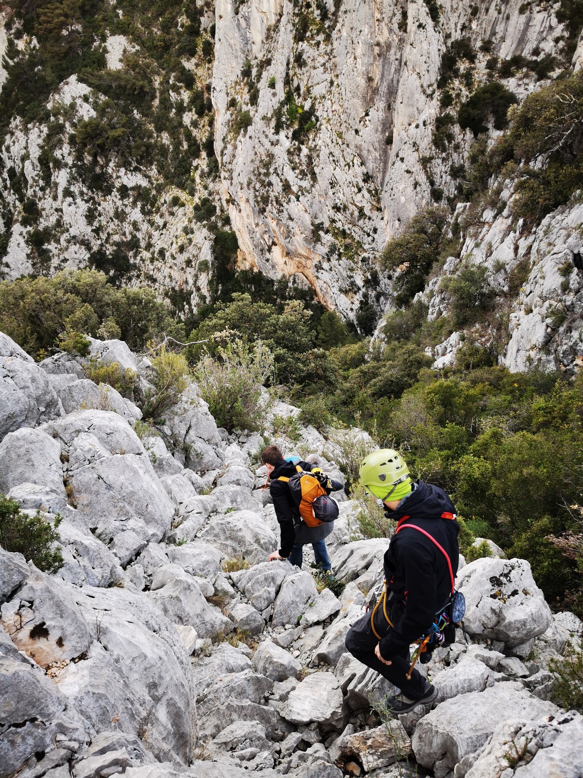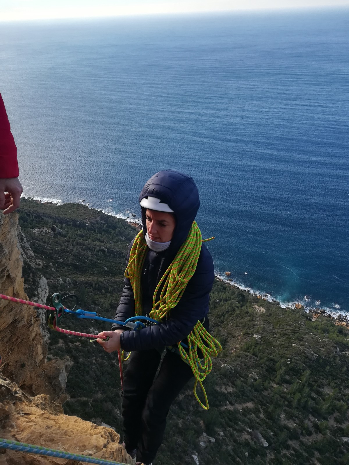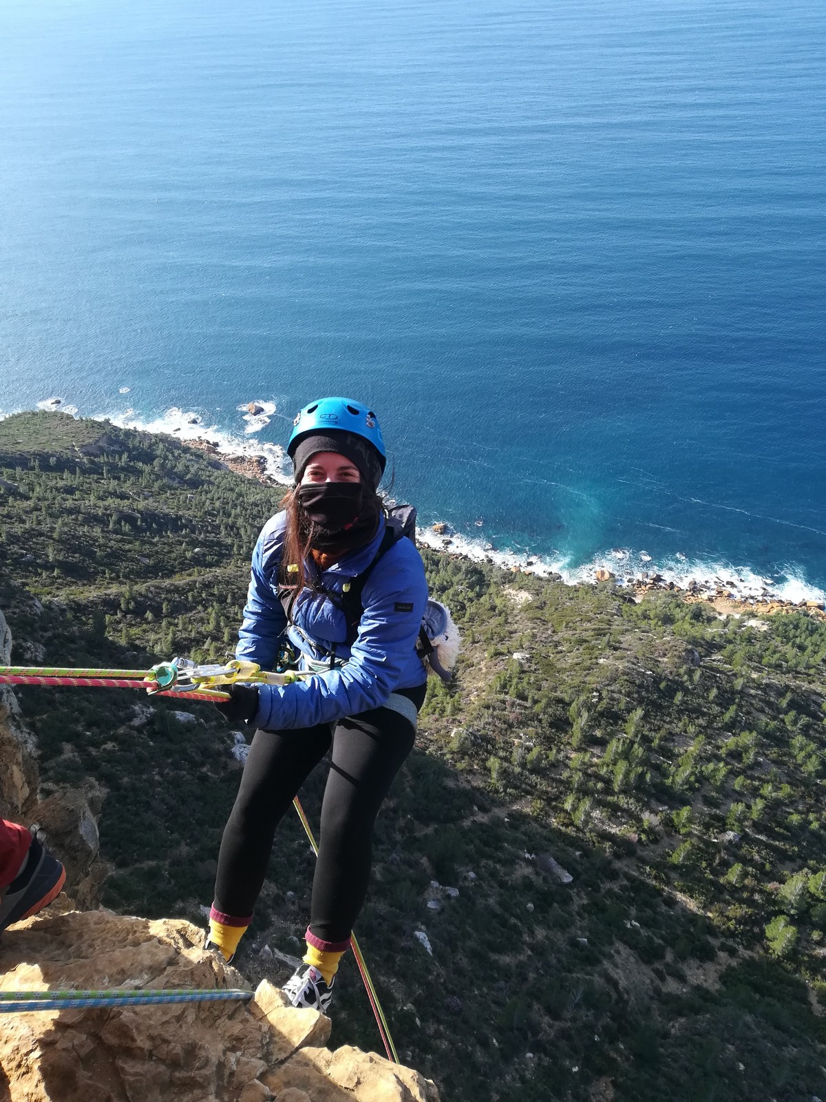 A la base, nous voulions retourner au Cap Canaille pour nous frotter à quelques voies d’ampleur au secteur du sémaphore, mais le mistral a eu raison de notre motivation. C’est donc au secteur Capri, bien abrité, que nous avons décidé d’aller user notre gomme. C’est un secteur d’une dizaine de voies abordables, sur une falaise d’environ 90m, mais avec des lignes qui traversent pas mal pour des voies faisant jusqu’à 8 longueurs.