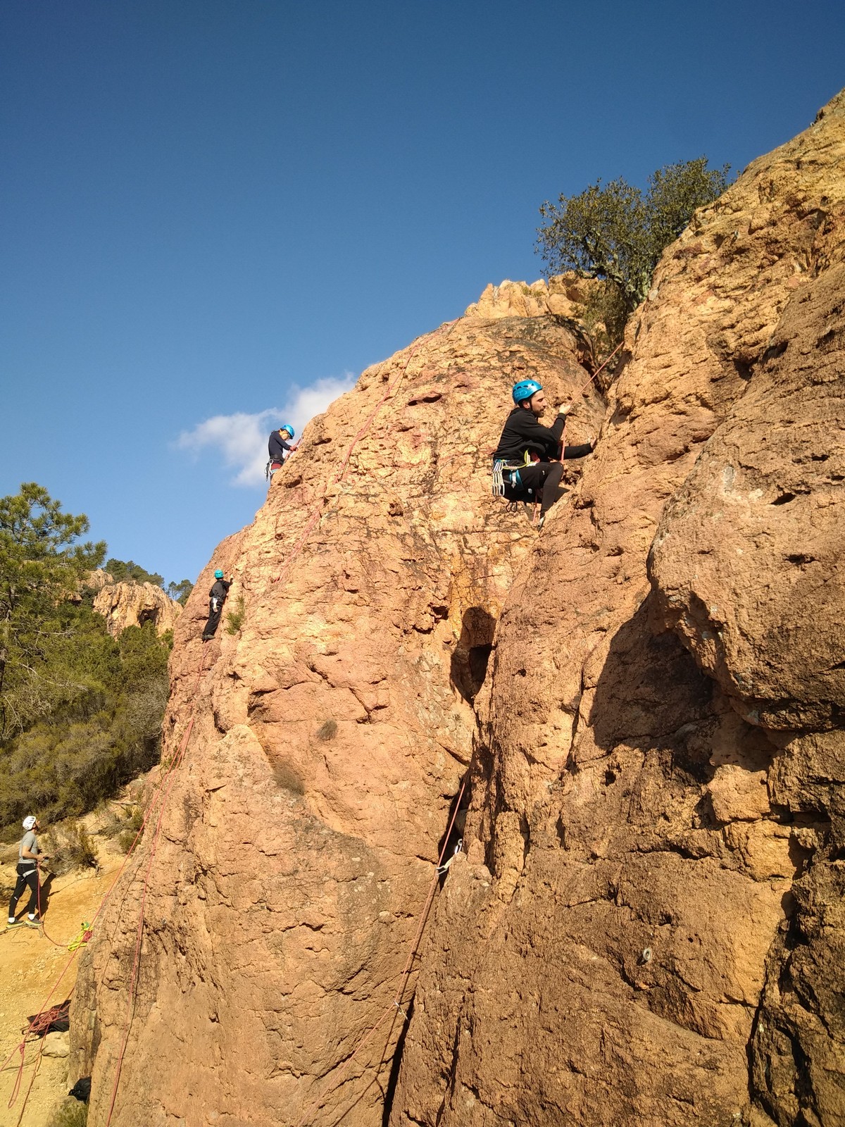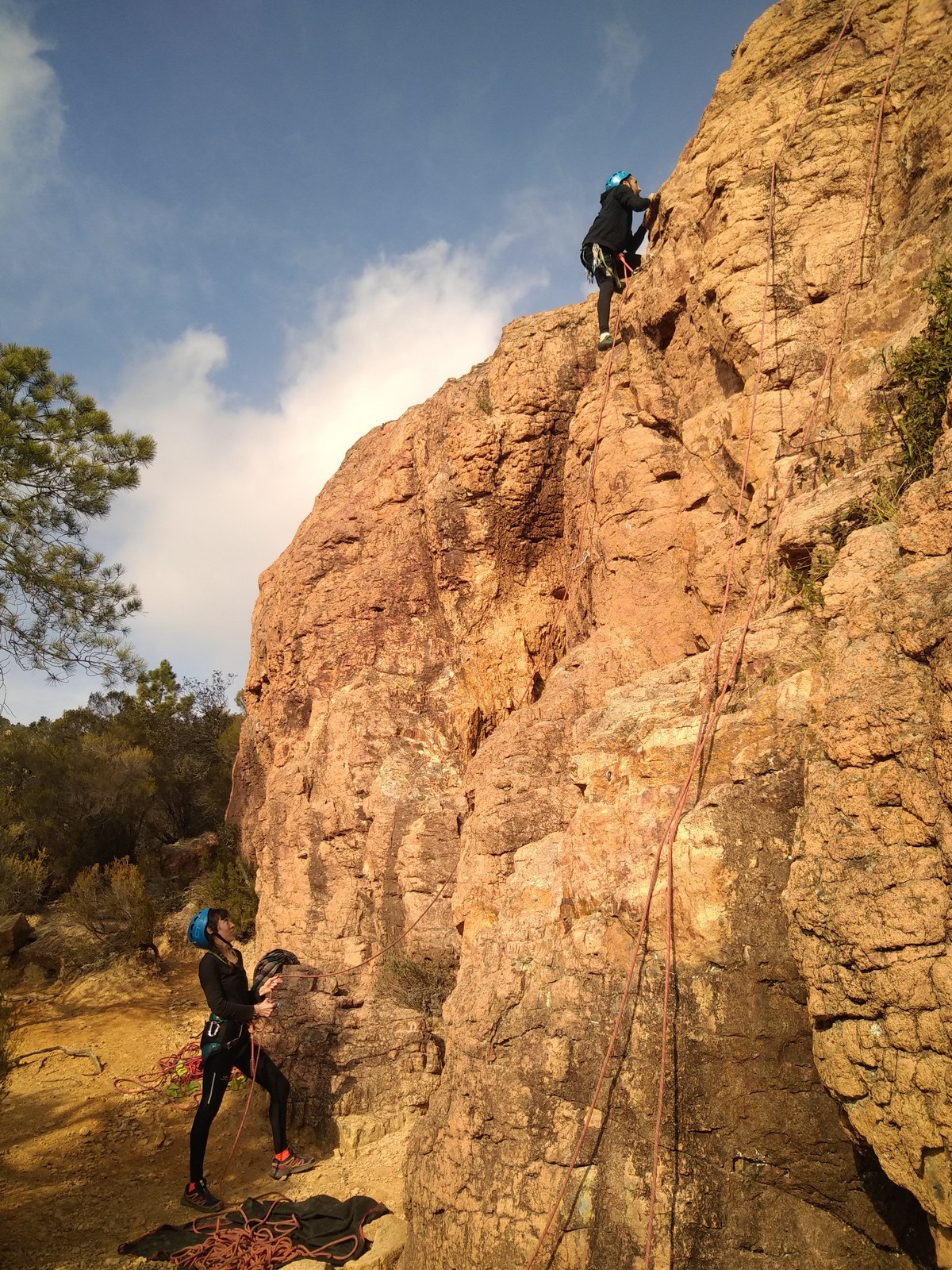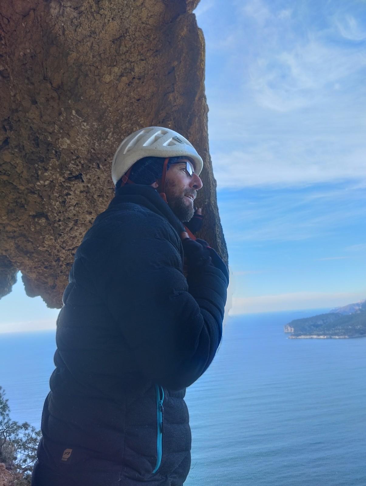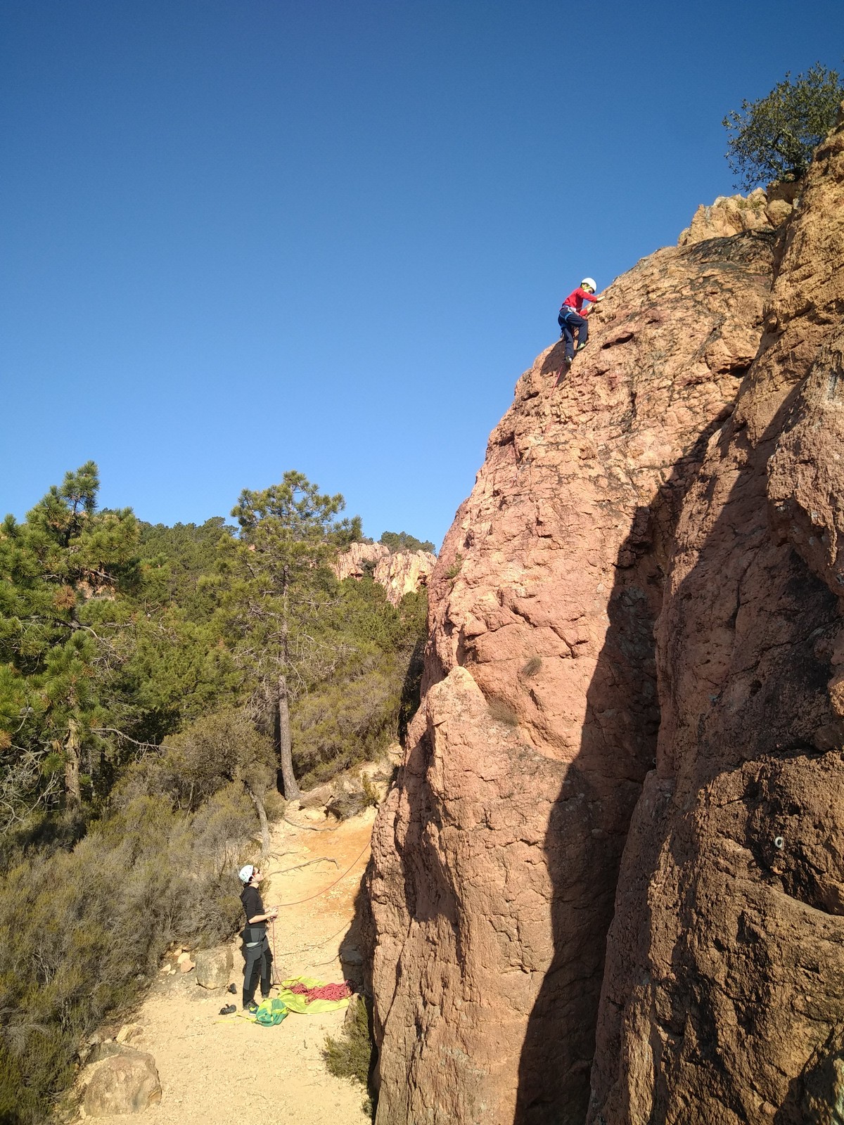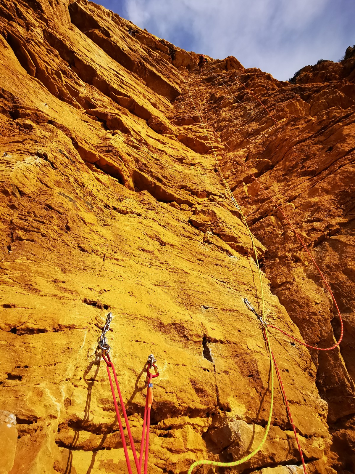 A la base, nous voulions retourner au Cap Canaille pour nous frotter à quelques voies d’ampleur au secteur du sémaphore, mais le mistral a eu raison de notre motivation. C’est donc au secteur Capri, bien abrité, que nous avons décidé d’aller user notre gomme. C’est un secteur d’une dizaine de voies abordables, sur une falaise d’environ 90m, mais avec des lignes qui traversent pas mal pour des voies faisant jusqu’à 8 longueurs.