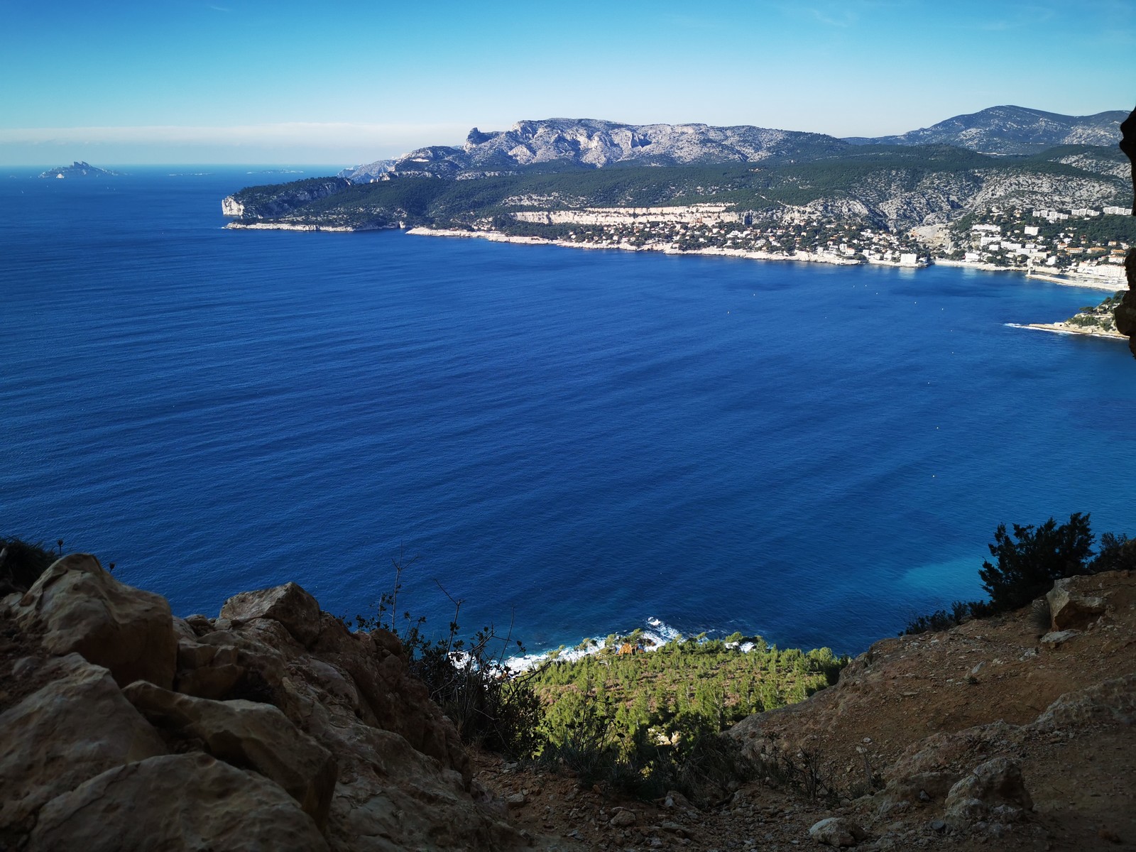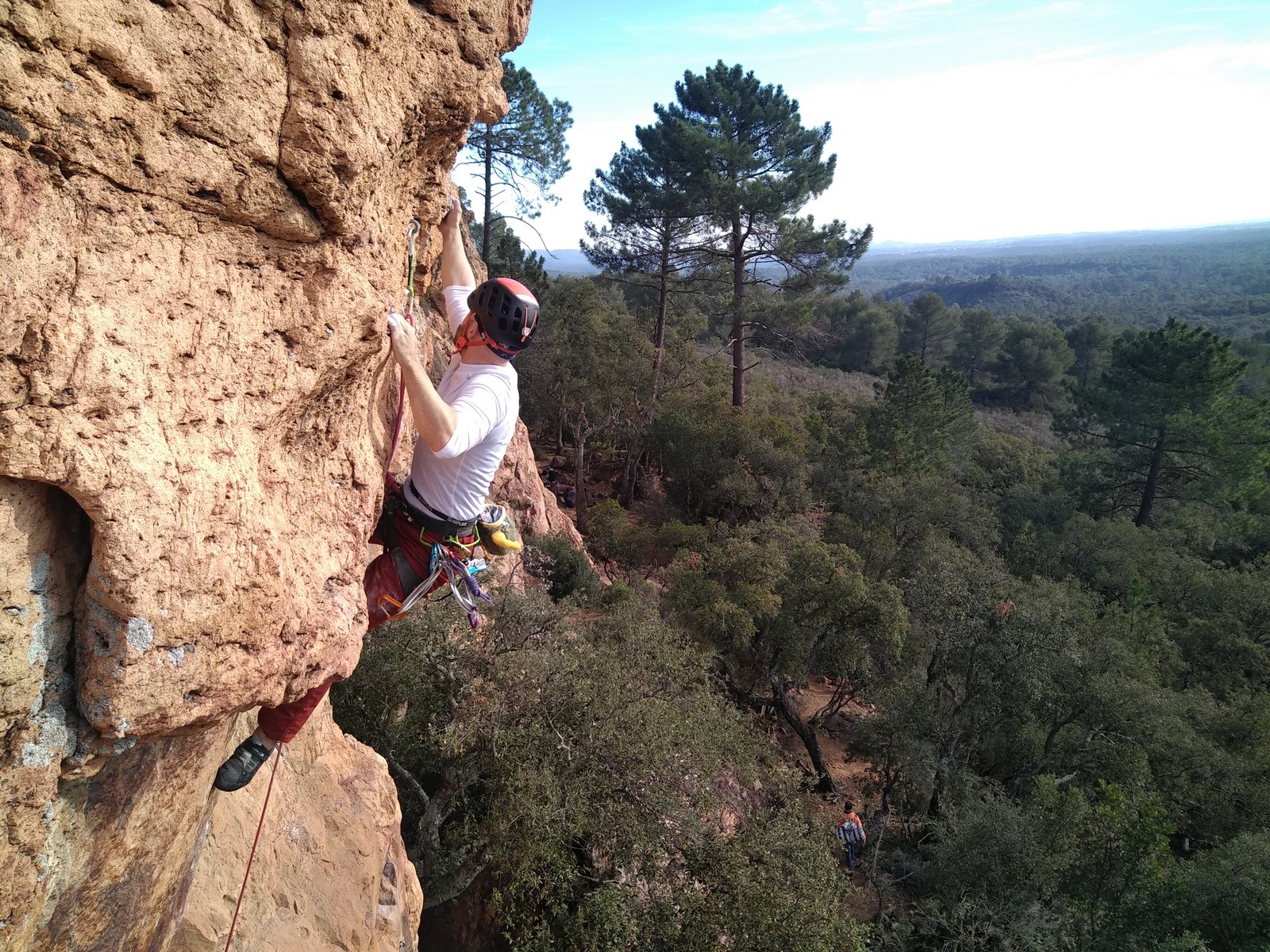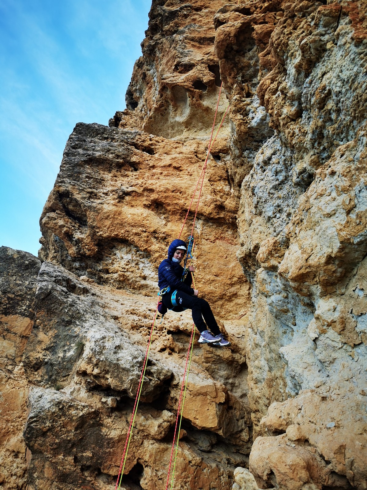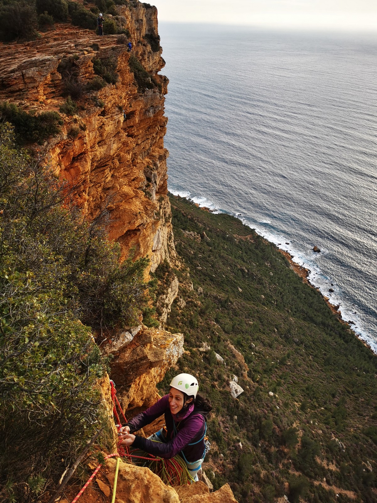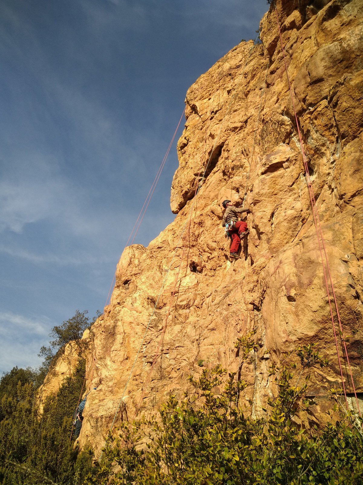 A la base, nous voulions retourner au Cap Canaille pour nous frotter à quelques voies d’ampleur au secteur du sémaphore, mais le mistral a eu raison de notre motivation. C’est donc au secteur Capri, bien abrité, que nous avons décidé d’aller user notre gomme. C’est un secteur d’une dizaine de voies abordables, sur une falaise d’environ 90m, mais avec des lignes qui traversent pas mal pour des voies faisant jusqu’à 8 longueurs.