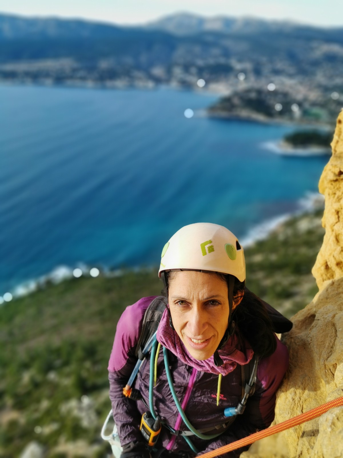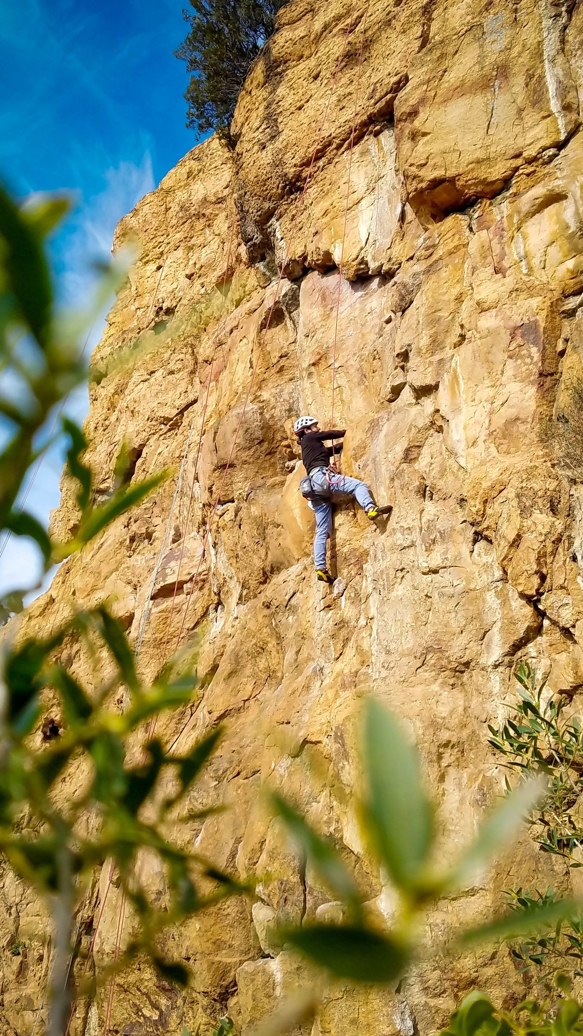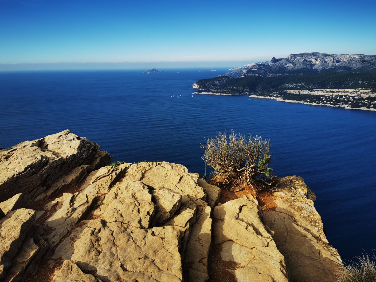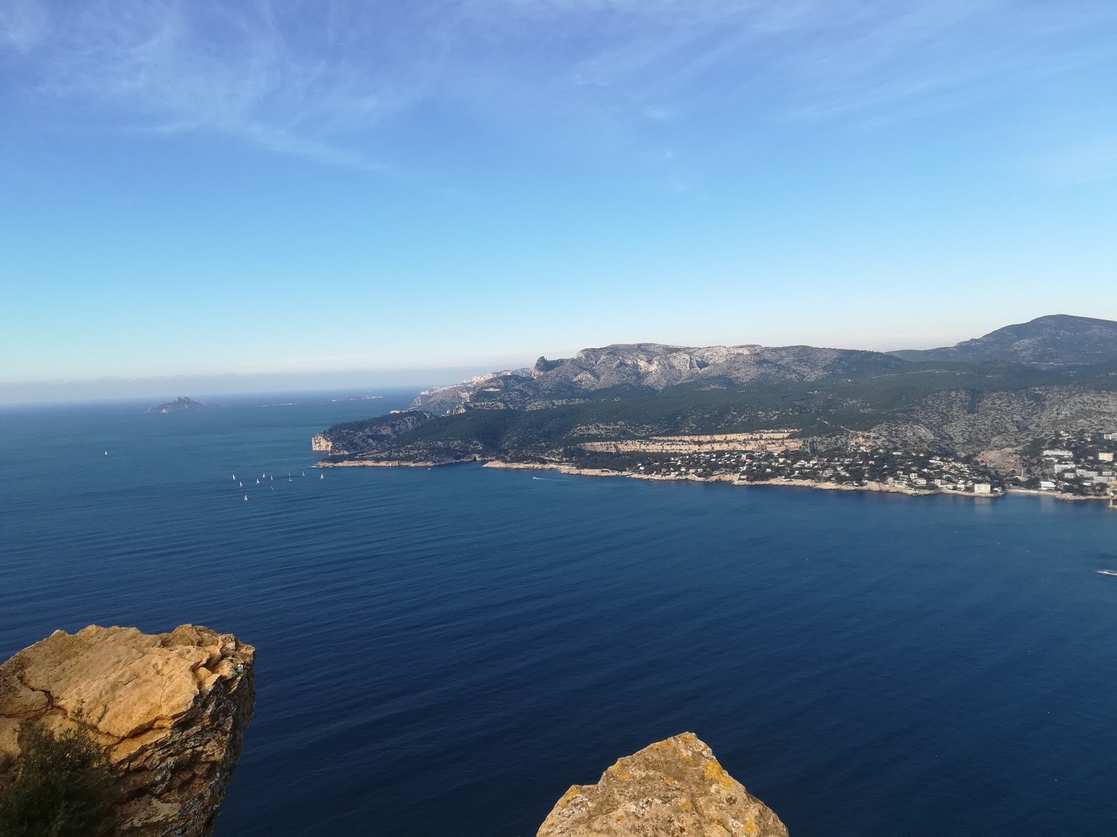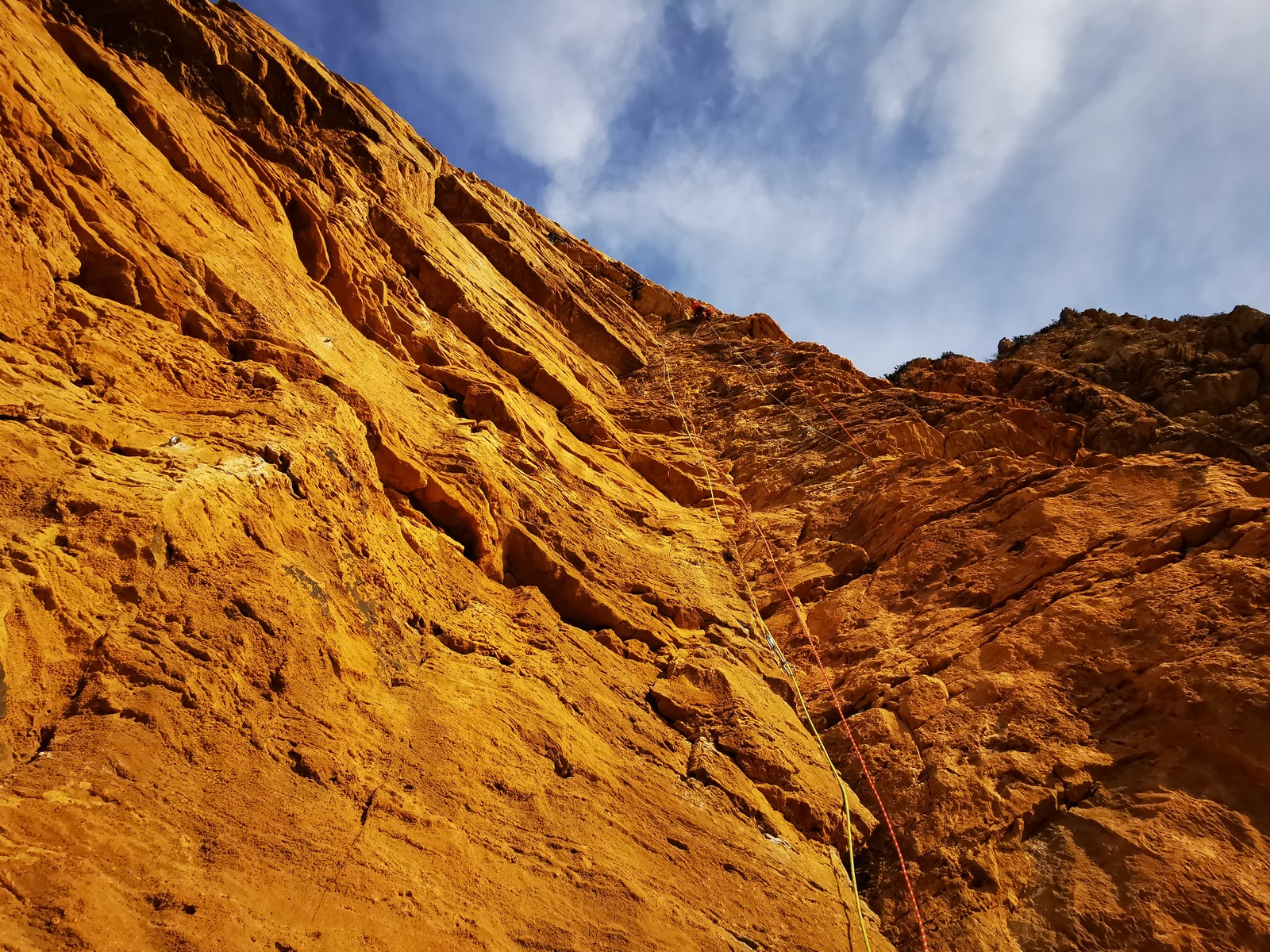 A la base, nous voulions retourner au Cap Canaille pour nous frotter à quelques voies d’ampleur au secteur du sémaphore, mais le mistral a eu raison de notre motivation. C’est donc au secteur Capri, bien abrité, que nous avons décidé d’aller user notre gomme. C’est un secteur d’une dizaine de voies abordables, sur une falaise d’environ 90m, mais avec des lignes qui traversent pas mal pour des voies faisant jusqu’à 8 longueurs.