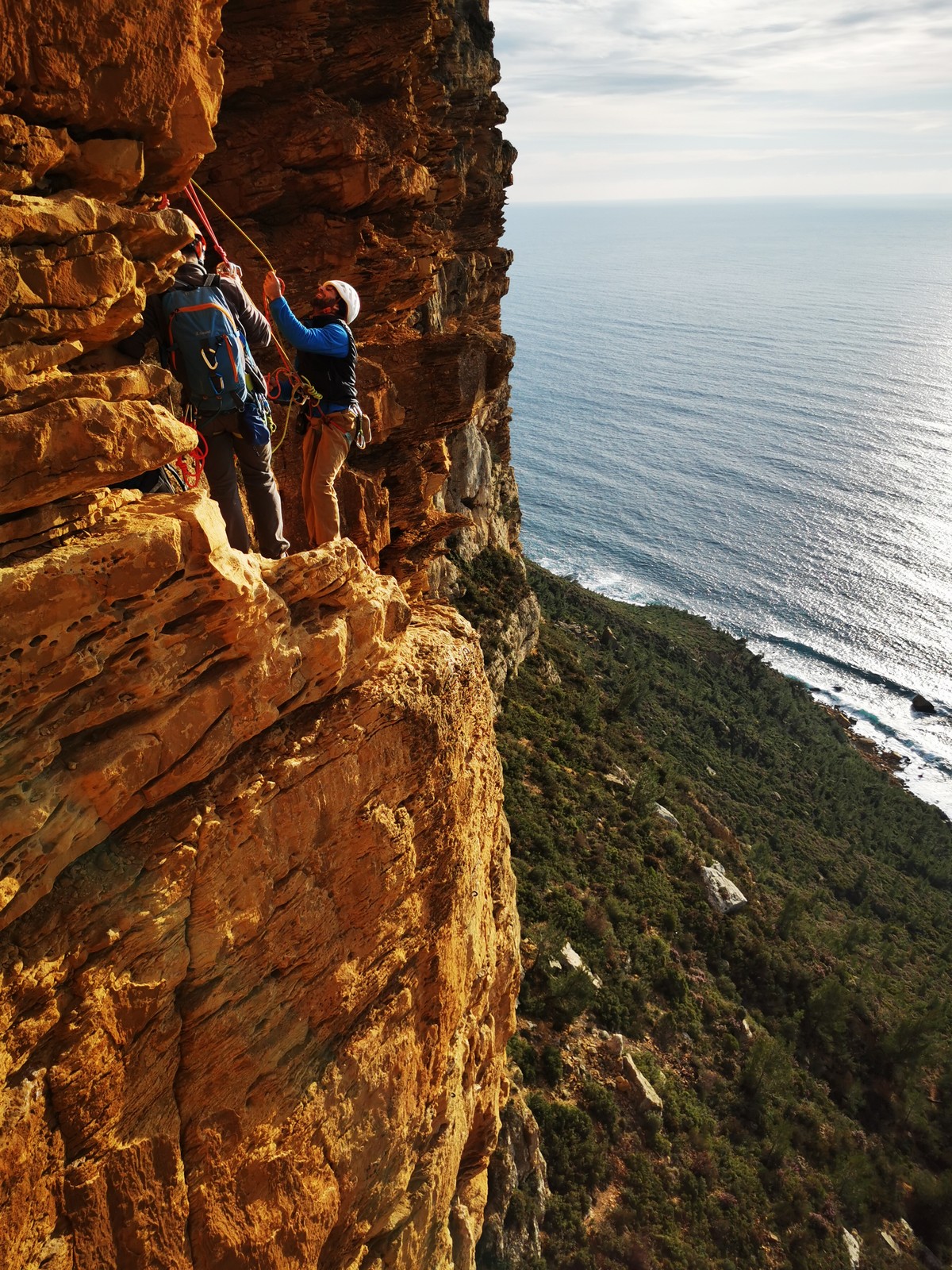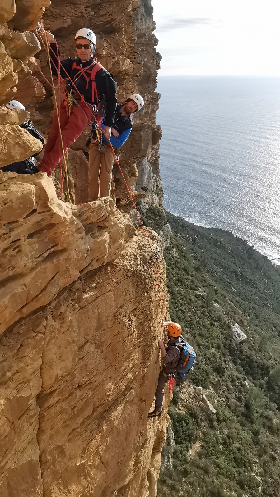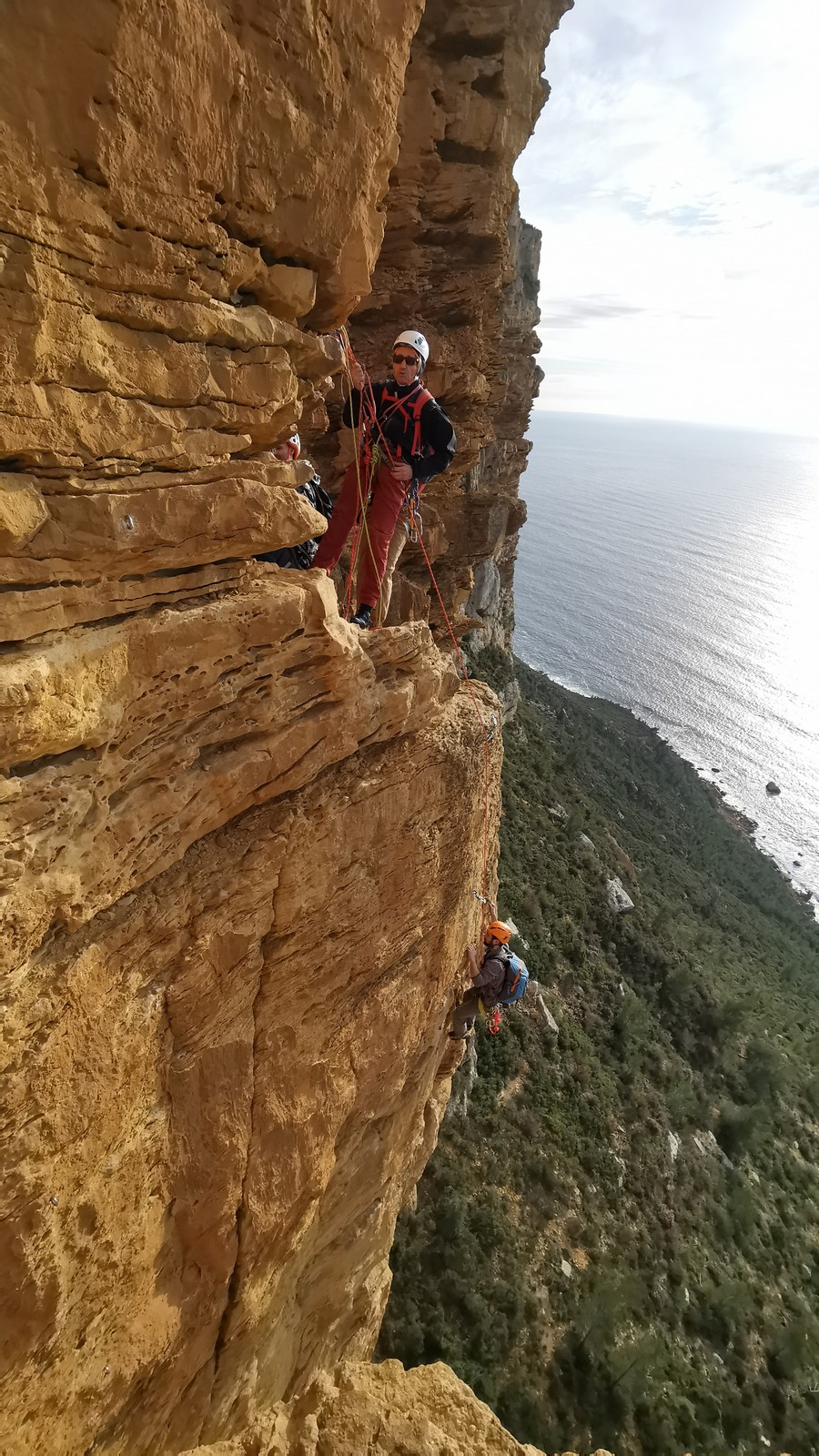 Xavier, Alexis et Jean-Luc qui a récupéré suffisamment de confiance dans son genou pour revenir en grandes voies, partent dans Turkish delight et imaginent finir dans la traversée également : 5c, 5b, 5b, 4c, 4c, 5b, 5c.