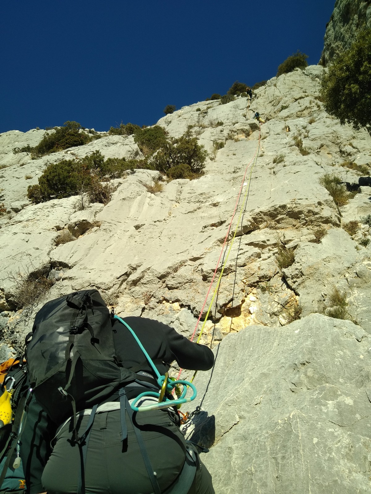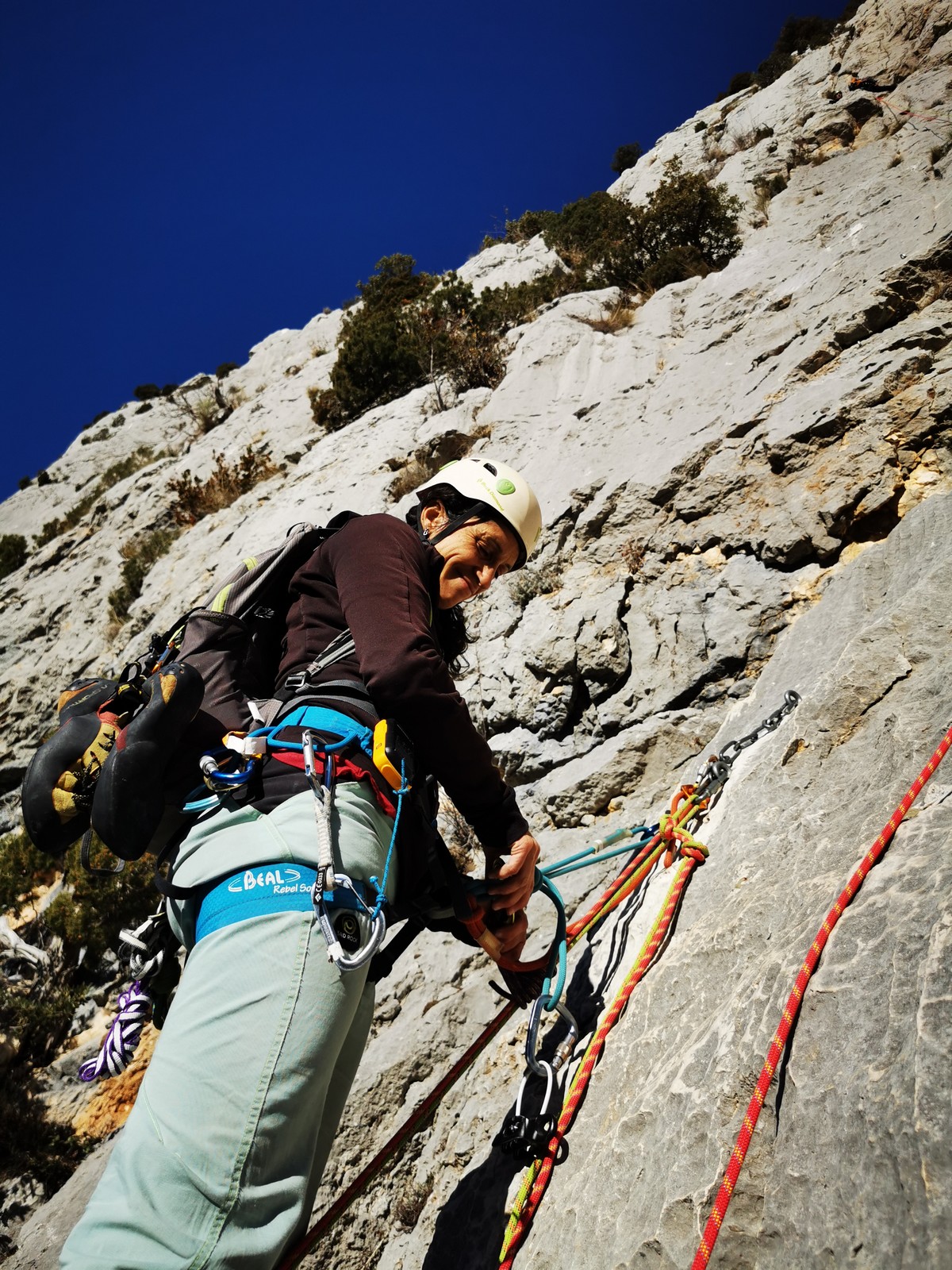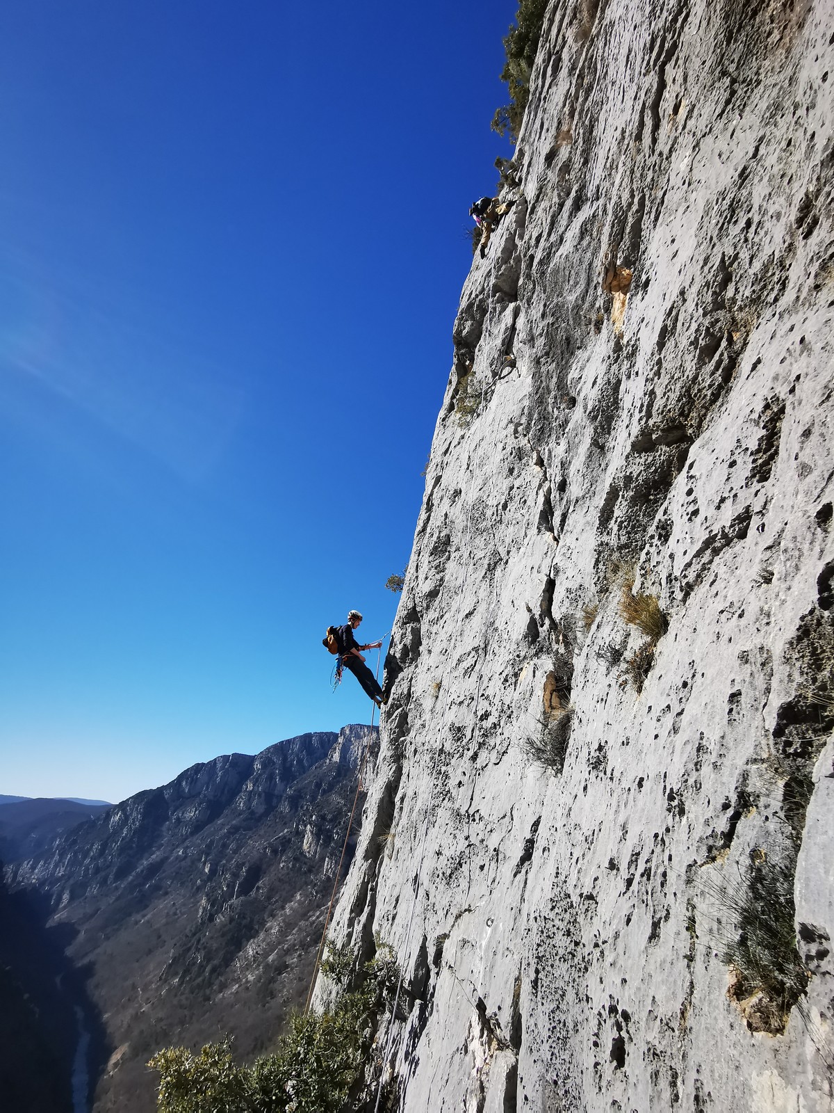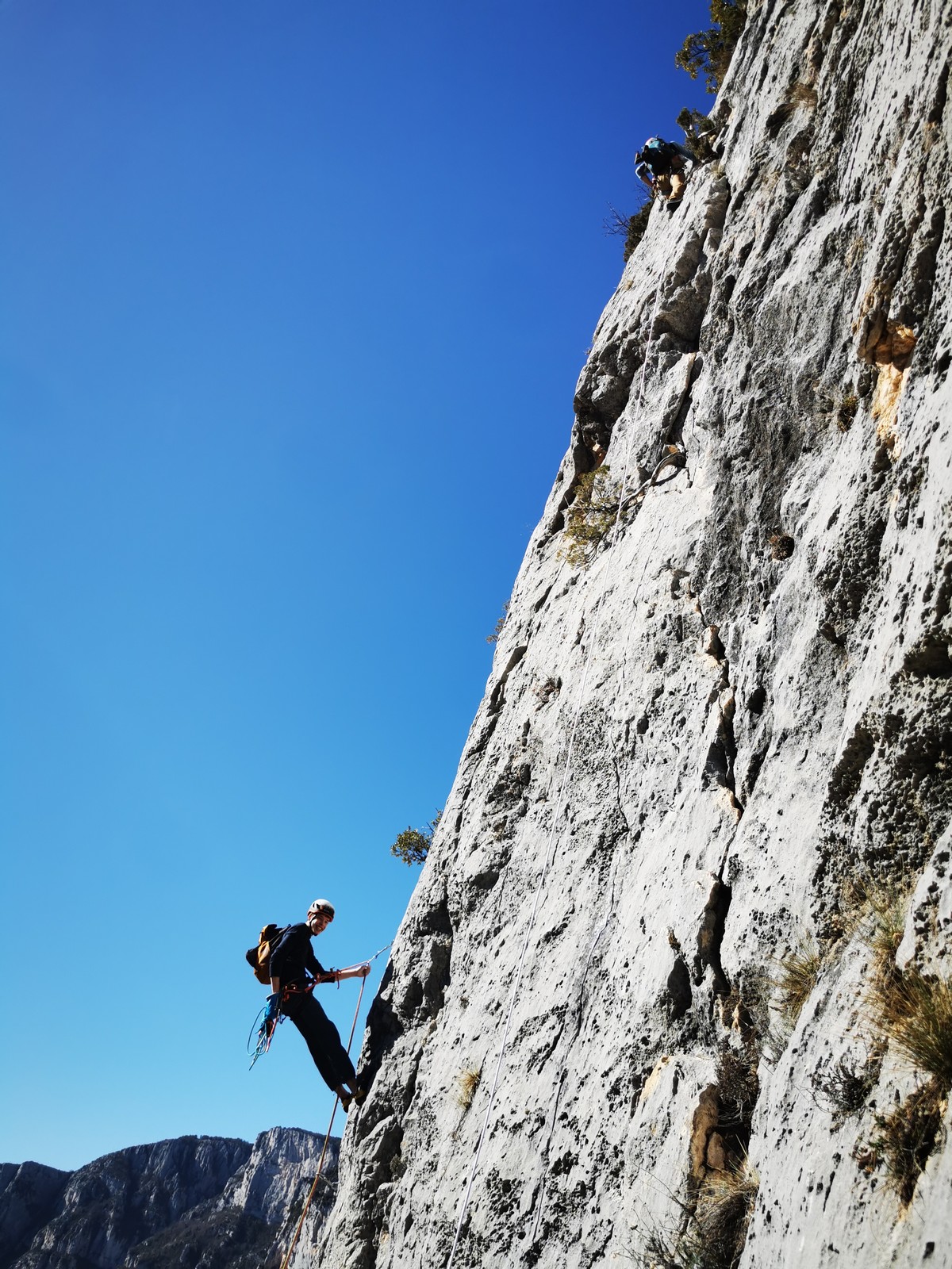 Il y a un peu de monde sur la paroi, mais ça se goupille plutôt bien. Malheureusement, ça commence à bouchonner un peu dans les longueurs communes en traversée. Avec Théo, nous sommes au sommet, on mange et on écoute au talkie ce qu’il se passe. Les cordées dessous ne sont pas prêtes de sortir alors on décide de redescendre pour se faire une deuxième voie : Princesse Kabyke en 6a, 6a, 5c, 6a.