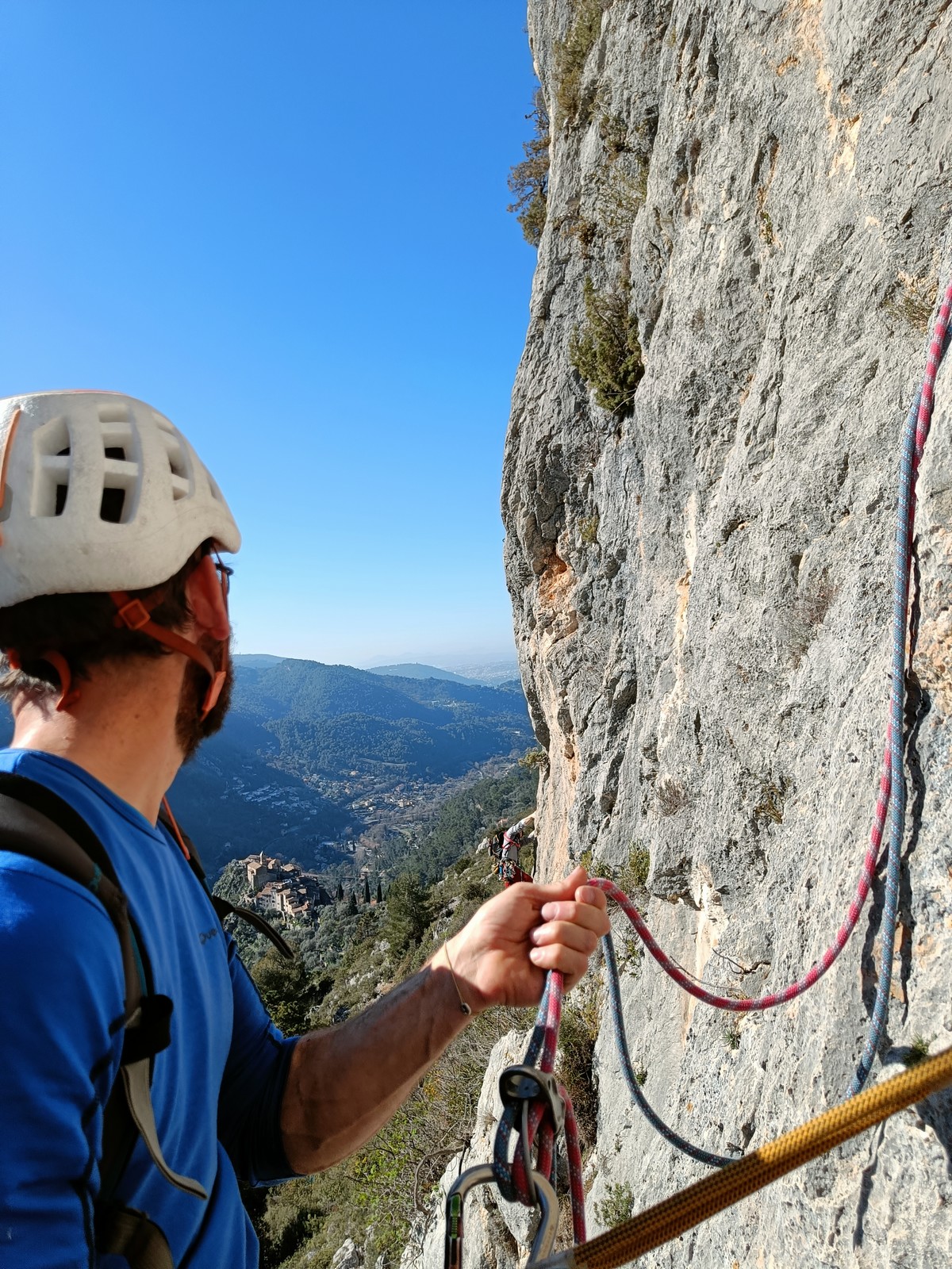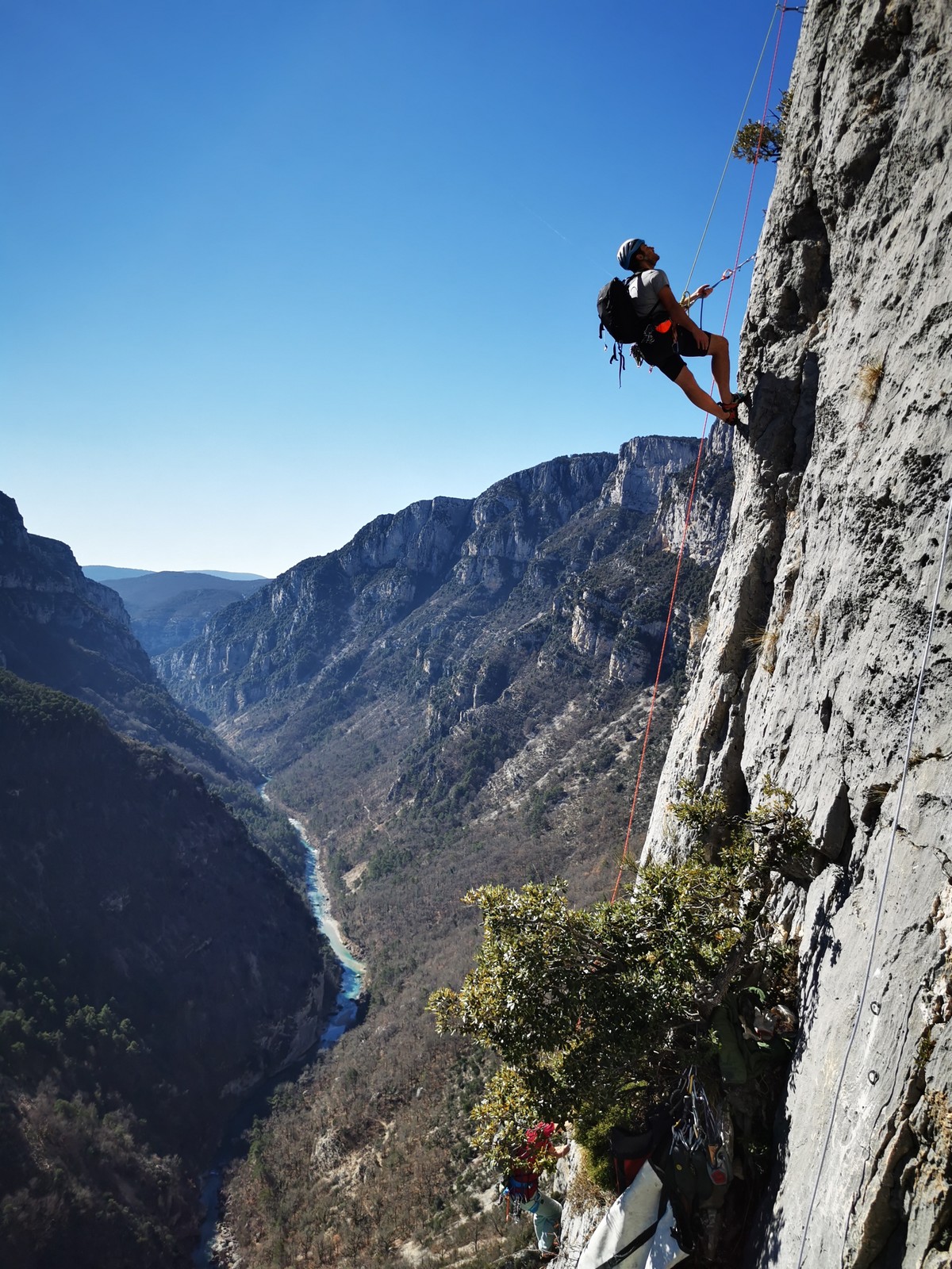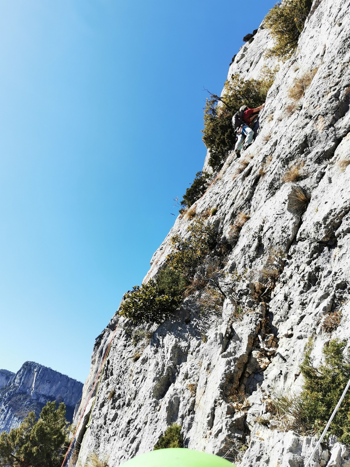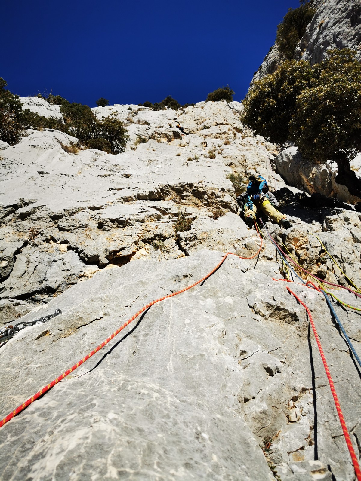 Il y a un peu de monde sur la paroi, mais ça se goupille plutôt bien. Malheureusement, ça commence à bouchonner un peu dans les longueurs communes en traversée. Avec Théo, nous sommes au sommet, on mange et on écoute au talkie ce qu’il se passe. Les cordées dessous ne sont pas prêtes de sortir alors on décide de redescendre pour se faire une deuxième voie : Princesse Kabyke en 6a, 6a, 5c, 6a.