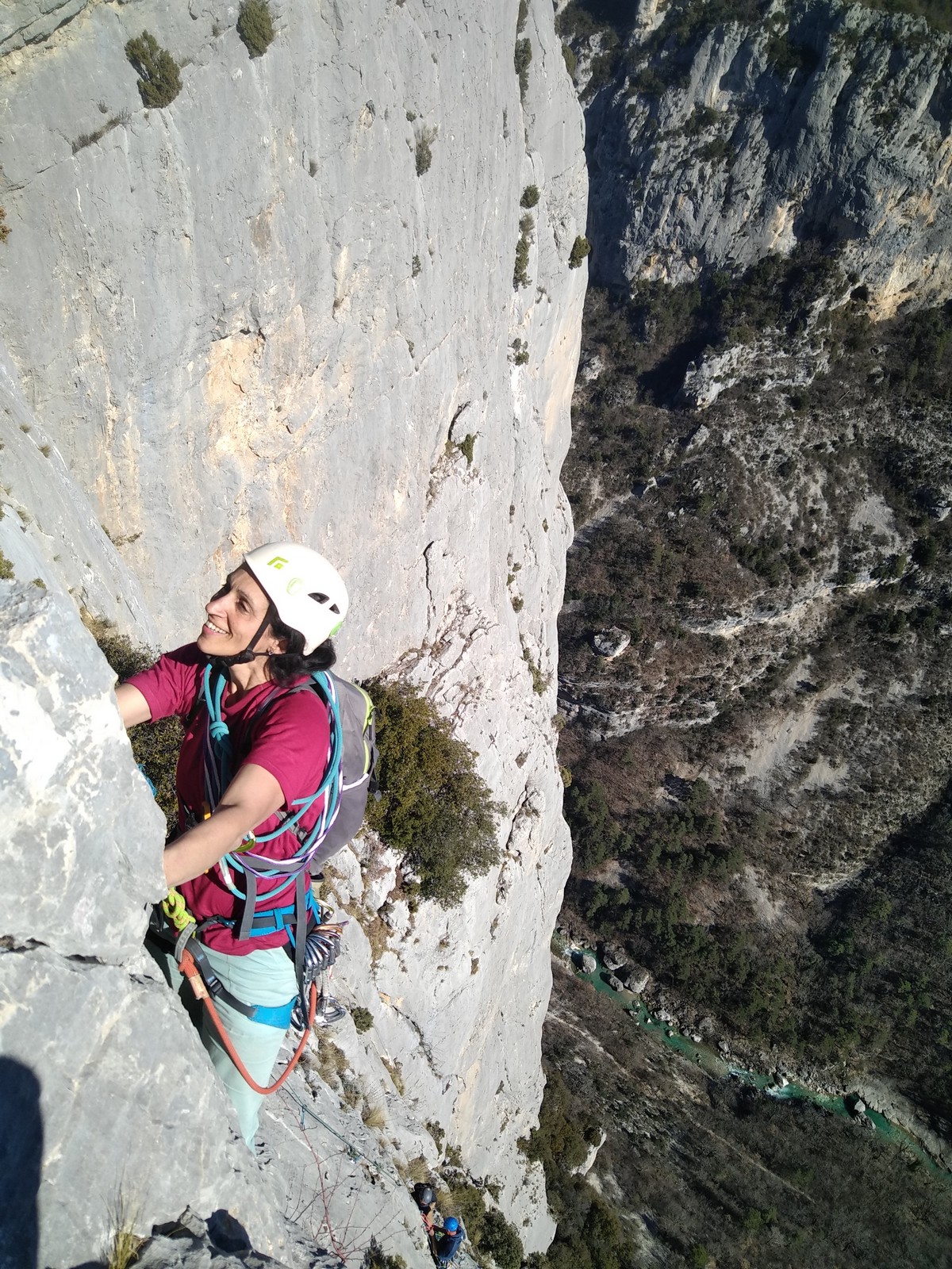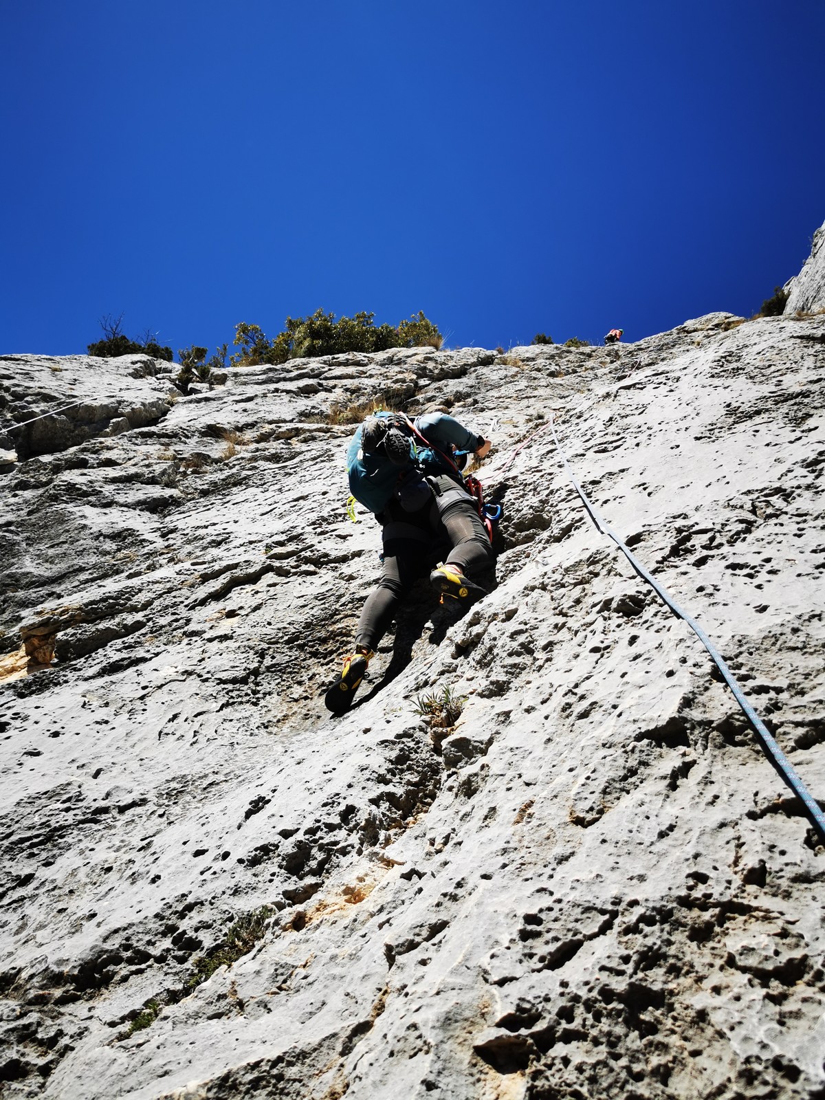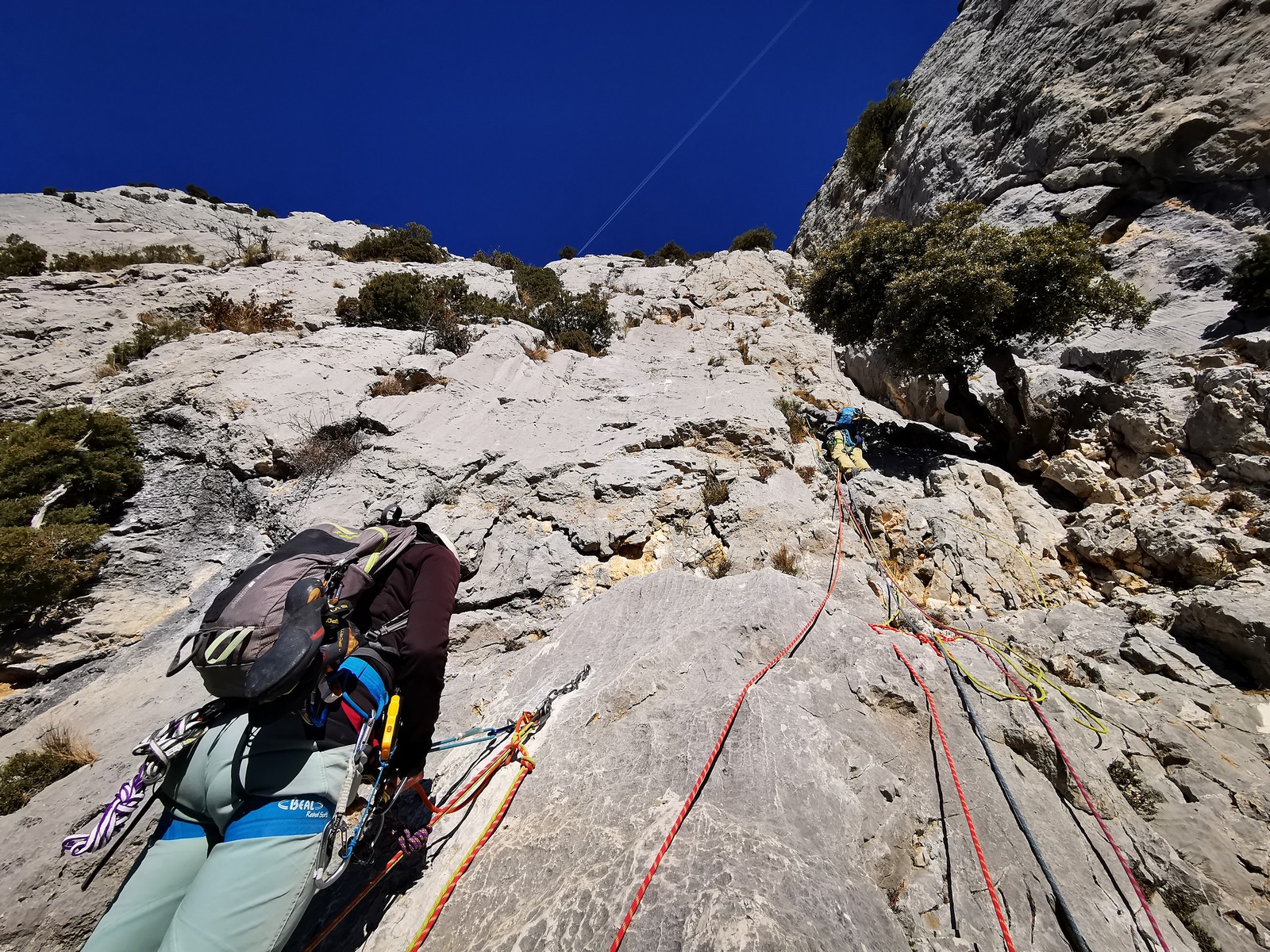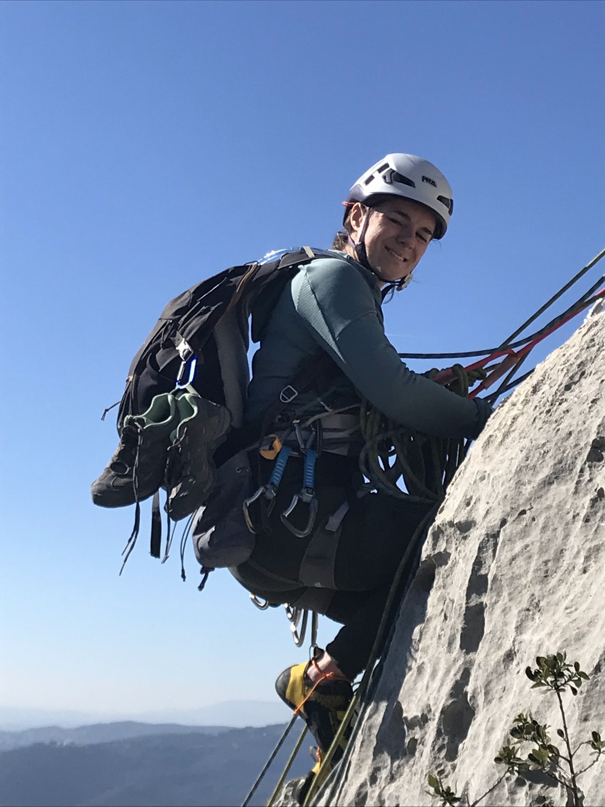 Il y a un peu de monde sur la paroi, mais ça se goupille plutôt bien. Malheureusement, ça commence à bouchonner un peu dans les longueurs communes en traversée. Avec Théo, nous sommes au sommet, on mange et on écoute au talkie ce qu’il se passe. Les cordées dessous ne sont pas prêtes de sortir alors on décide de redescendre pour se faire une deuxième voie : Princesse Kabyke en 6a, 6a, 5c, 6a.