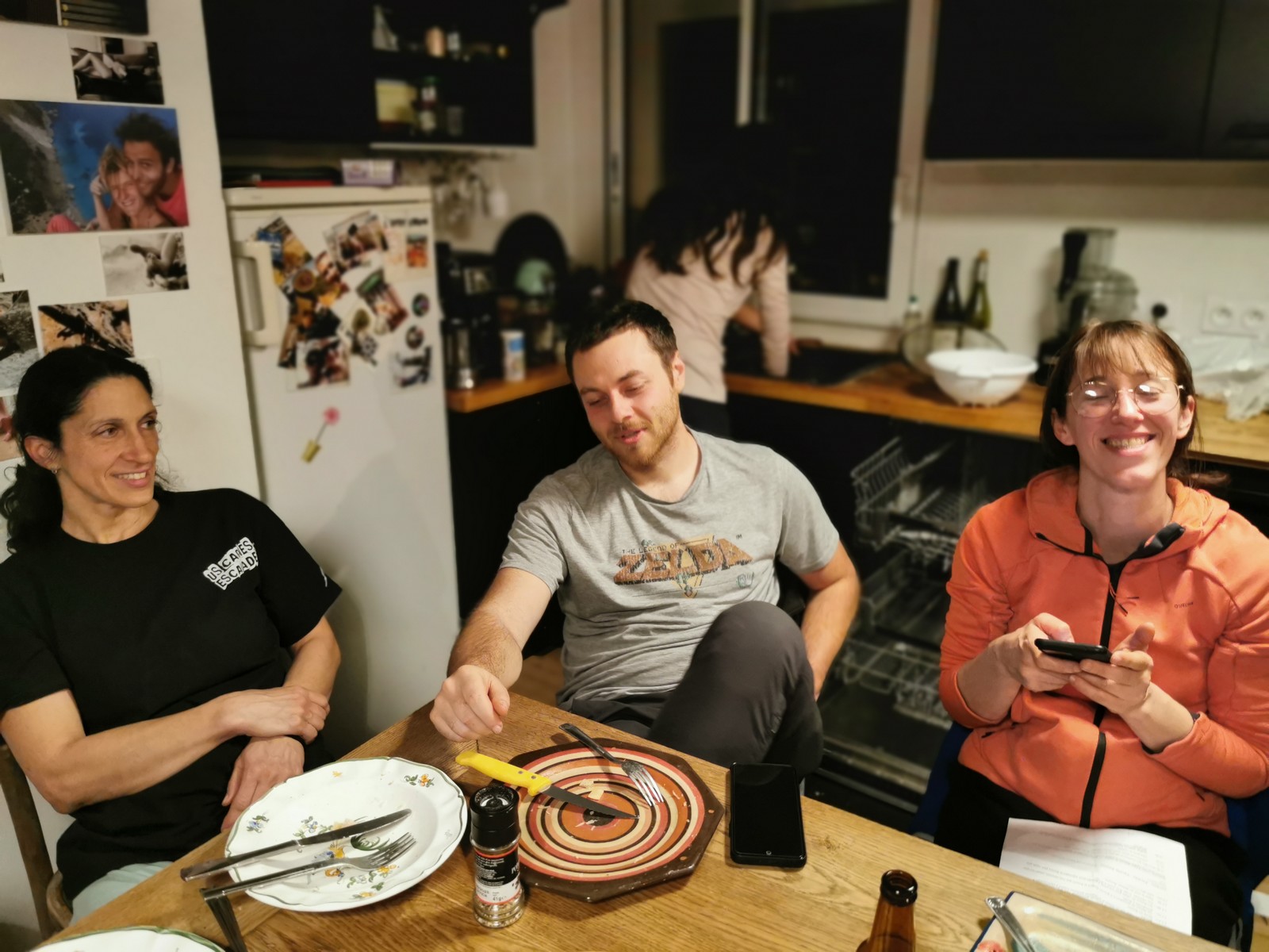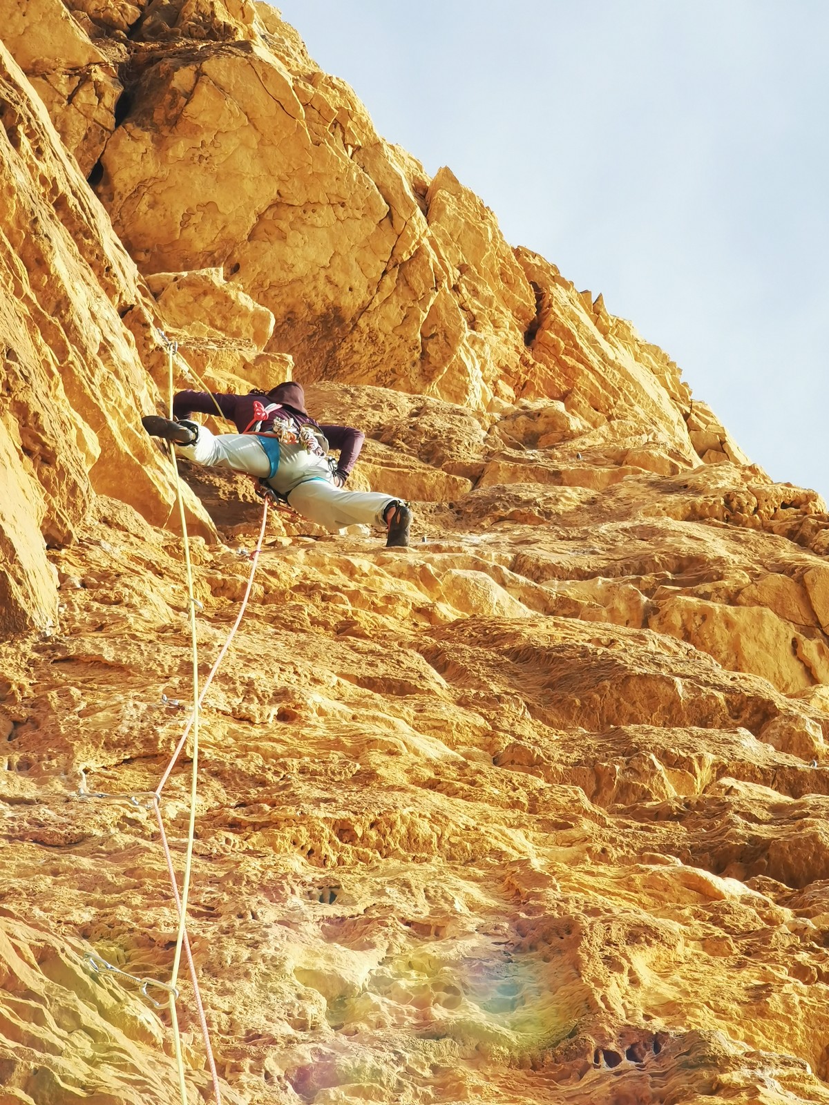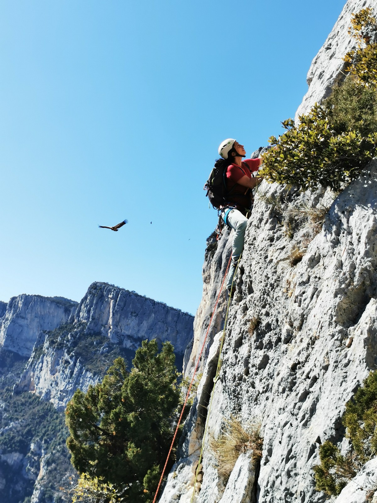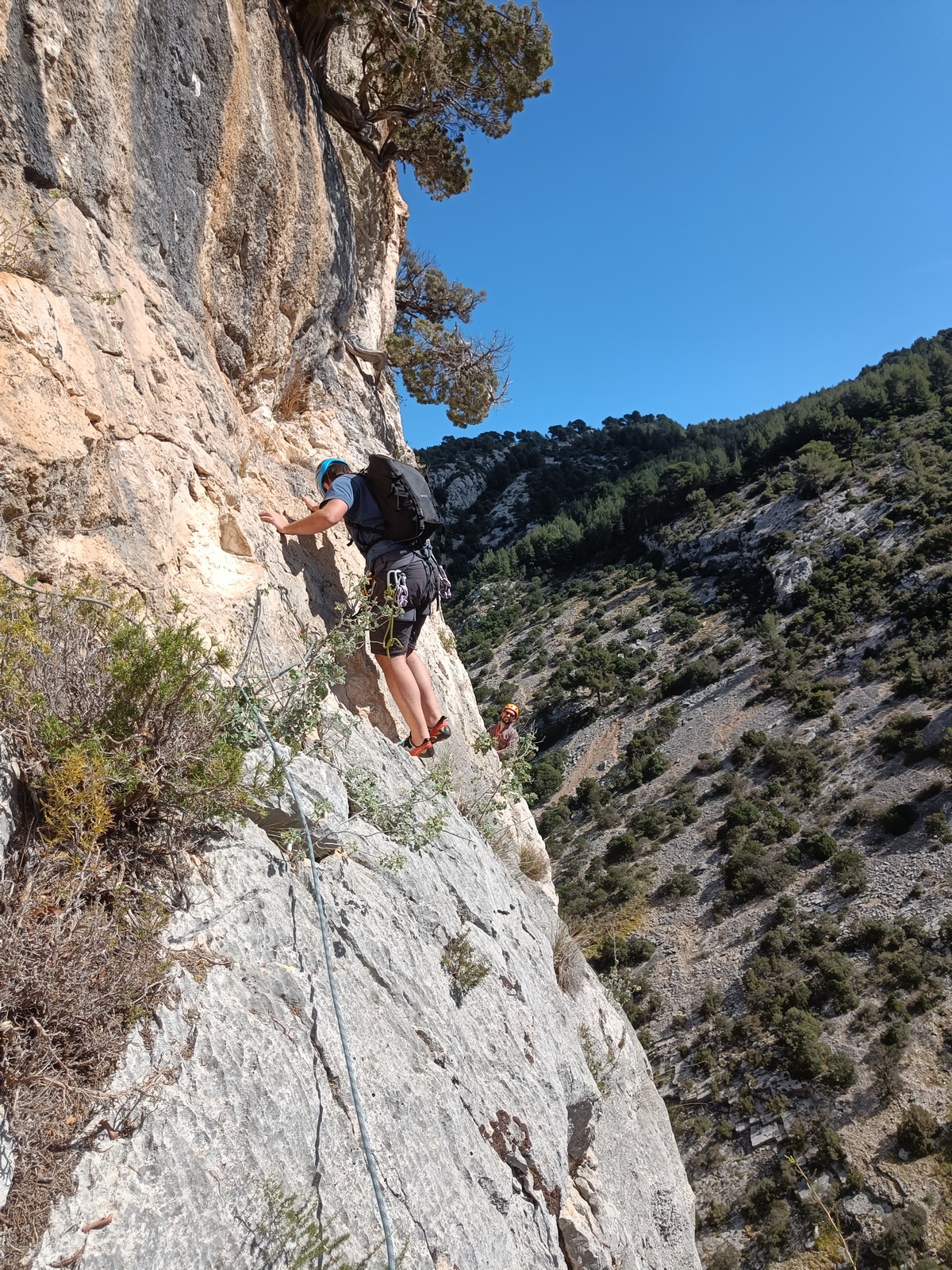 Il y a un peu de monde sur la paroi, mais ça se goupille plutôt bien. Malheureusement, ça commence à bouchonner un peu dans les longueurs communes en traversée. Avec Théo, nous sommes au sommet, on mange et on écoute au talkie ce qu’il se passe. Les cordées dessous ne sont pas prêtes de sortir alors on décide de redescendre pour se faire une deuxième voie : Princesse Kabyke en 6a, 6a, 5c, 6a.