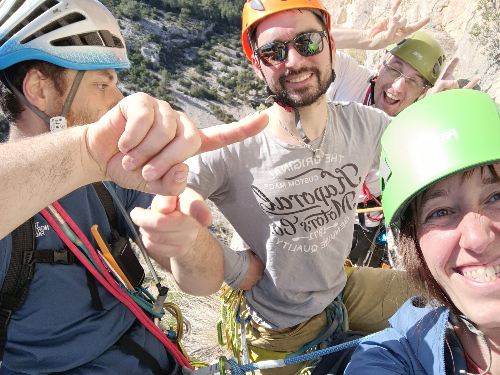 A peine arrivés en bas, on entend que Brice bute dans la dernière longueur en 5c. Il a trop donné émotionnellement avant et ne parvient pas à passer un crux obligatoire. Ca discute au talkie sur les solutions à envisager et c’est Alexis, dans la cordée derrière qui part à la rescousse du malheureux. Mais c’est long, et lorsque tout le monde est en haut, nous sommes déjà dans la dernière longueur avec Théo !