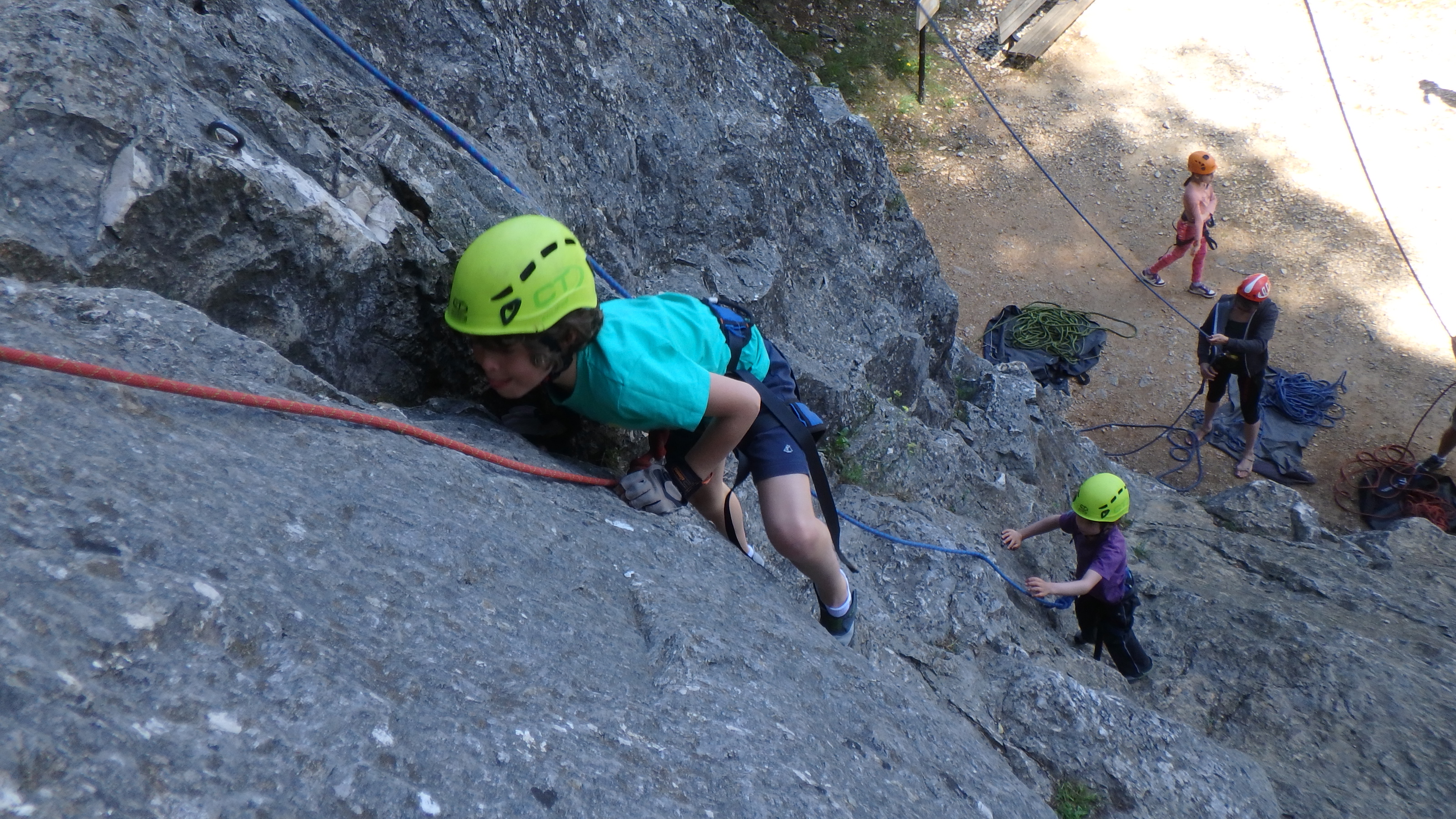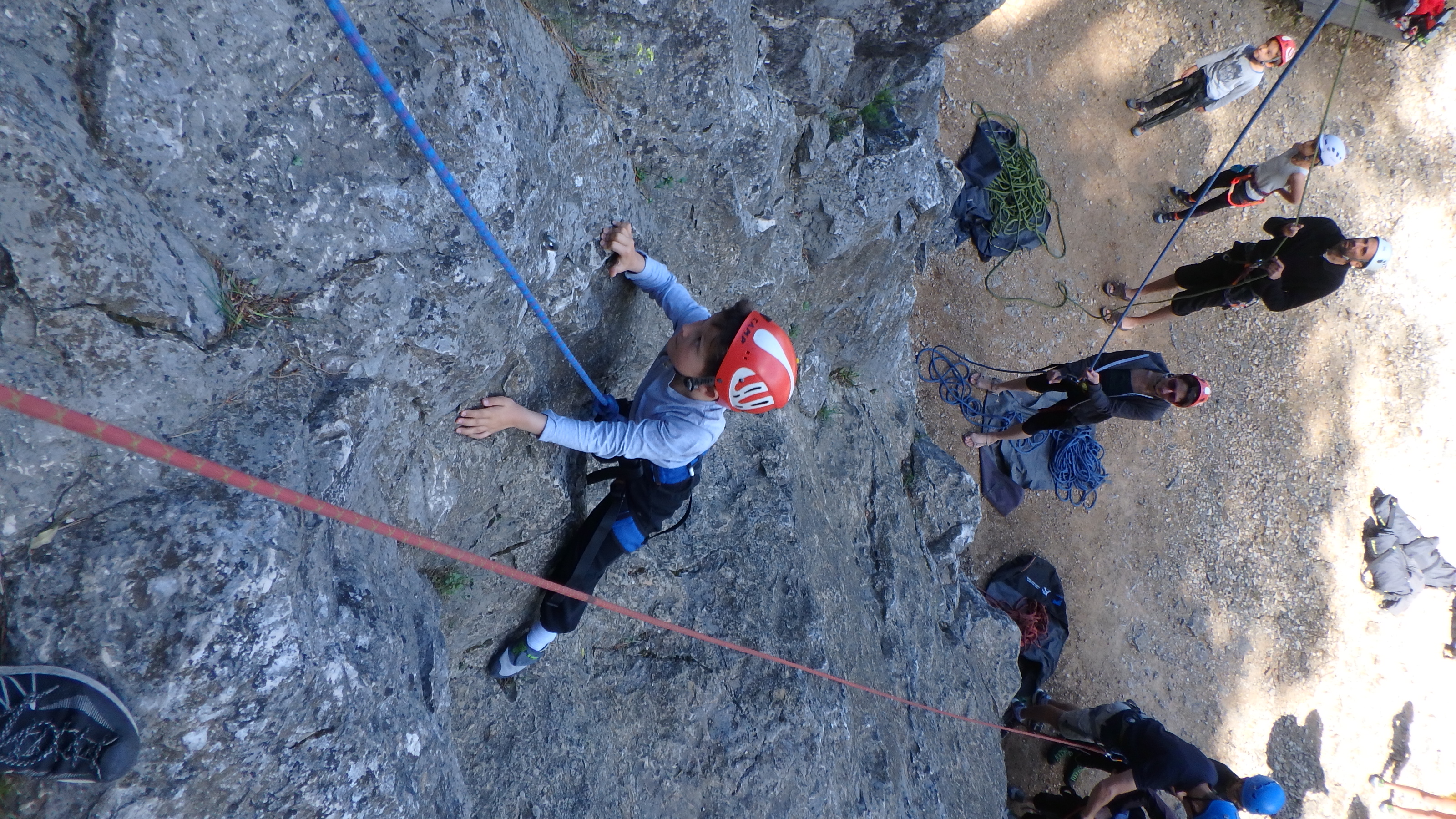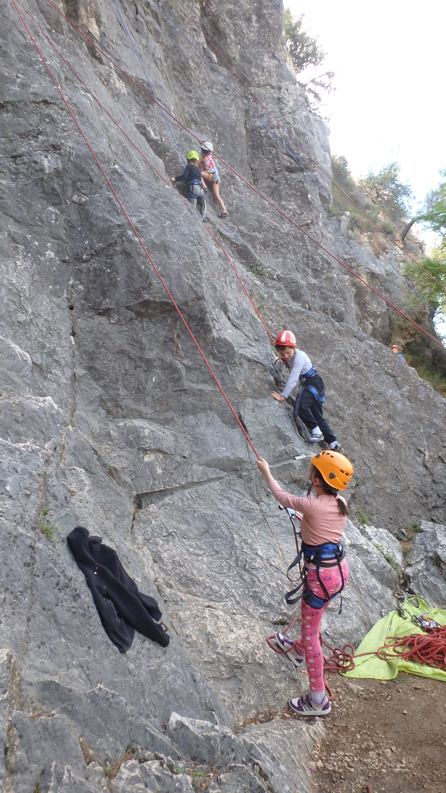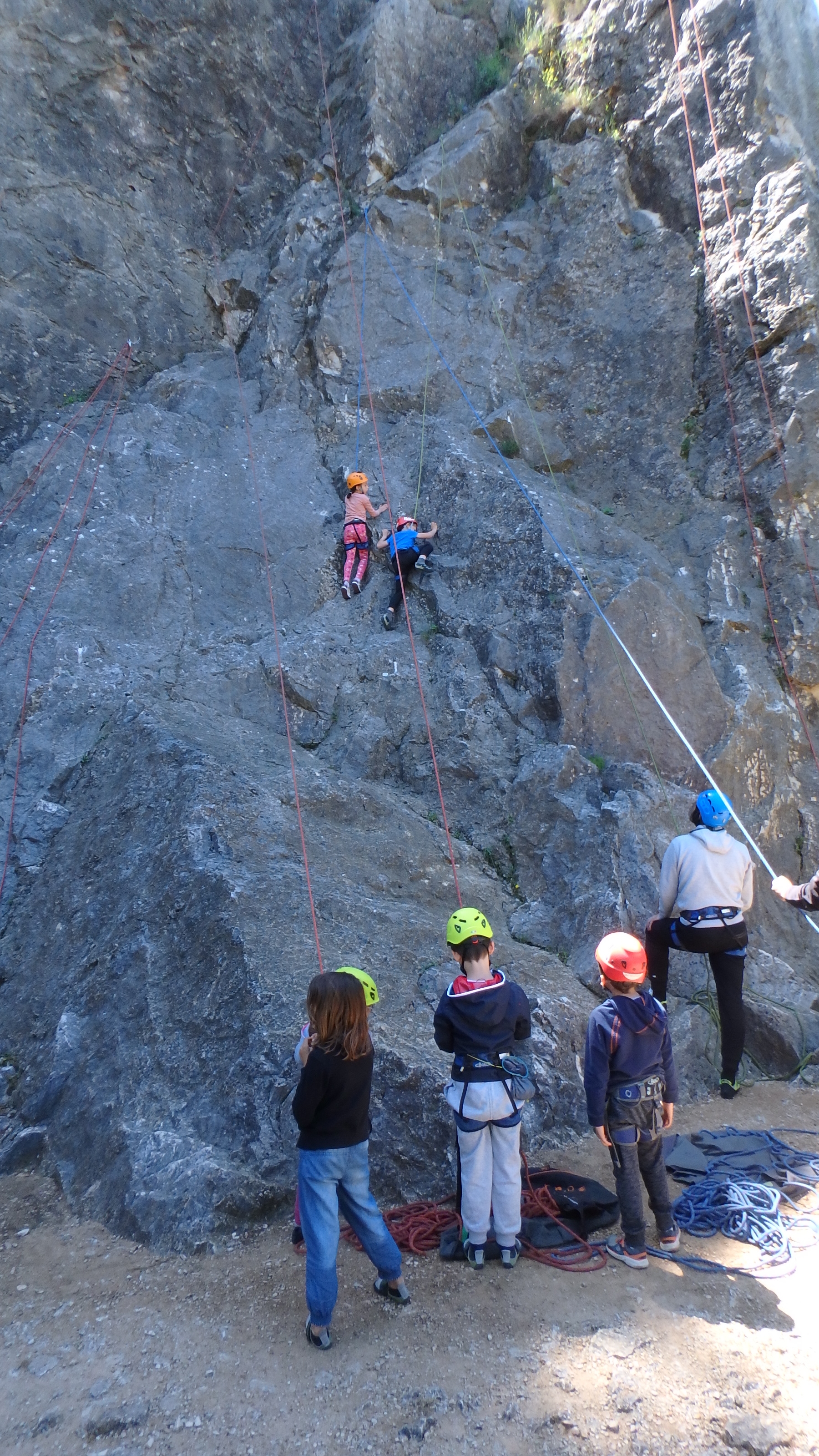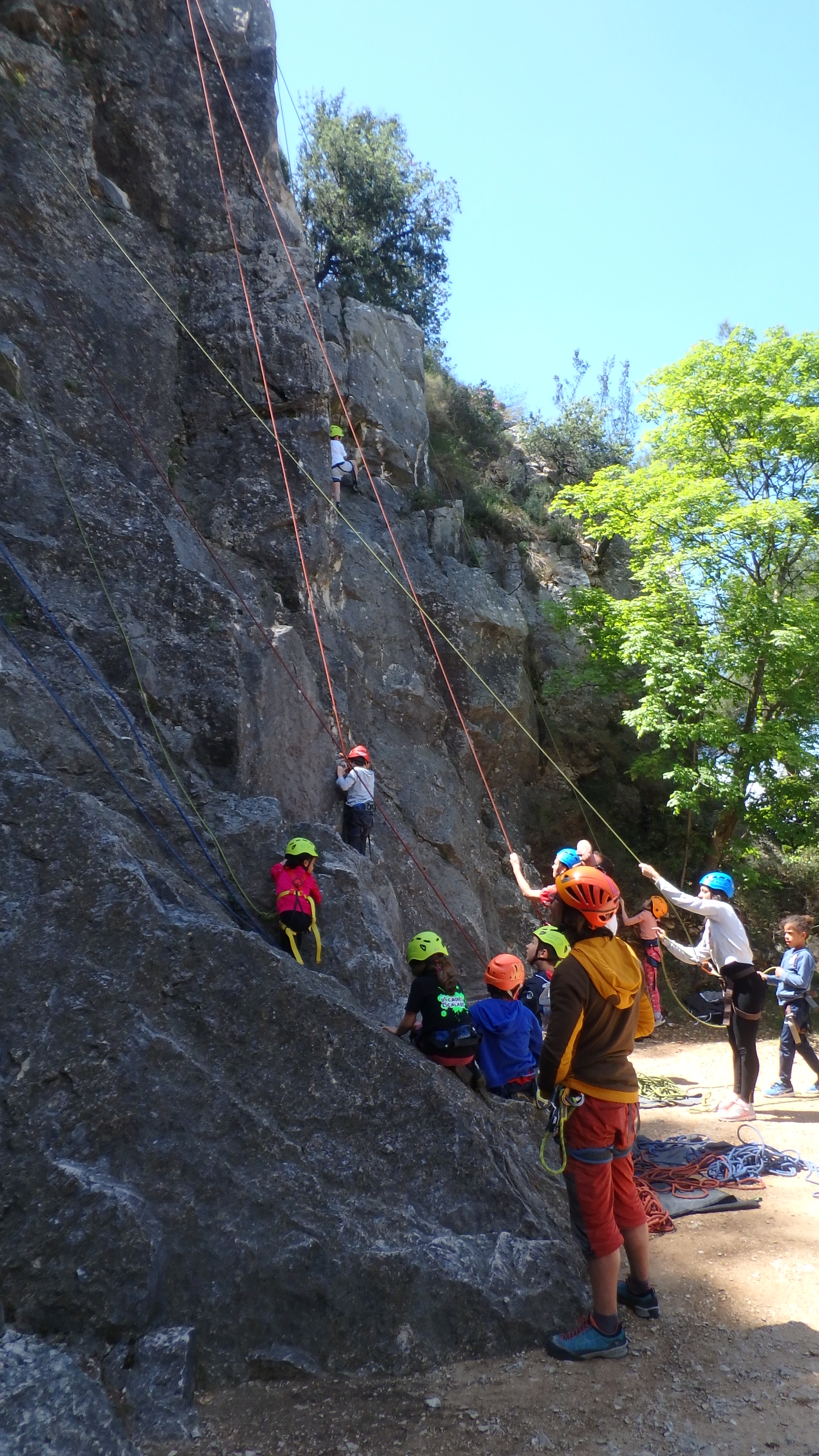 Le matin, je retrouve donc Pierre Antoine, Antoine, Sidonie, Lou, Axel, Chloé, Matéo et Louis prêts à en découdre! Les parents se préparent pour l’assurage et c’est parti pour 2h de grimpe non stop. Les petits sont inépuisables ! Pour gagner du temps sur les voies les plus courtes, je leur propose même de les enchaîner deux fois d’affilée pour essayer de les fatiguer mais rien à faire, même le soleil et la chaleur ne les feront pas se décoller du rocher…