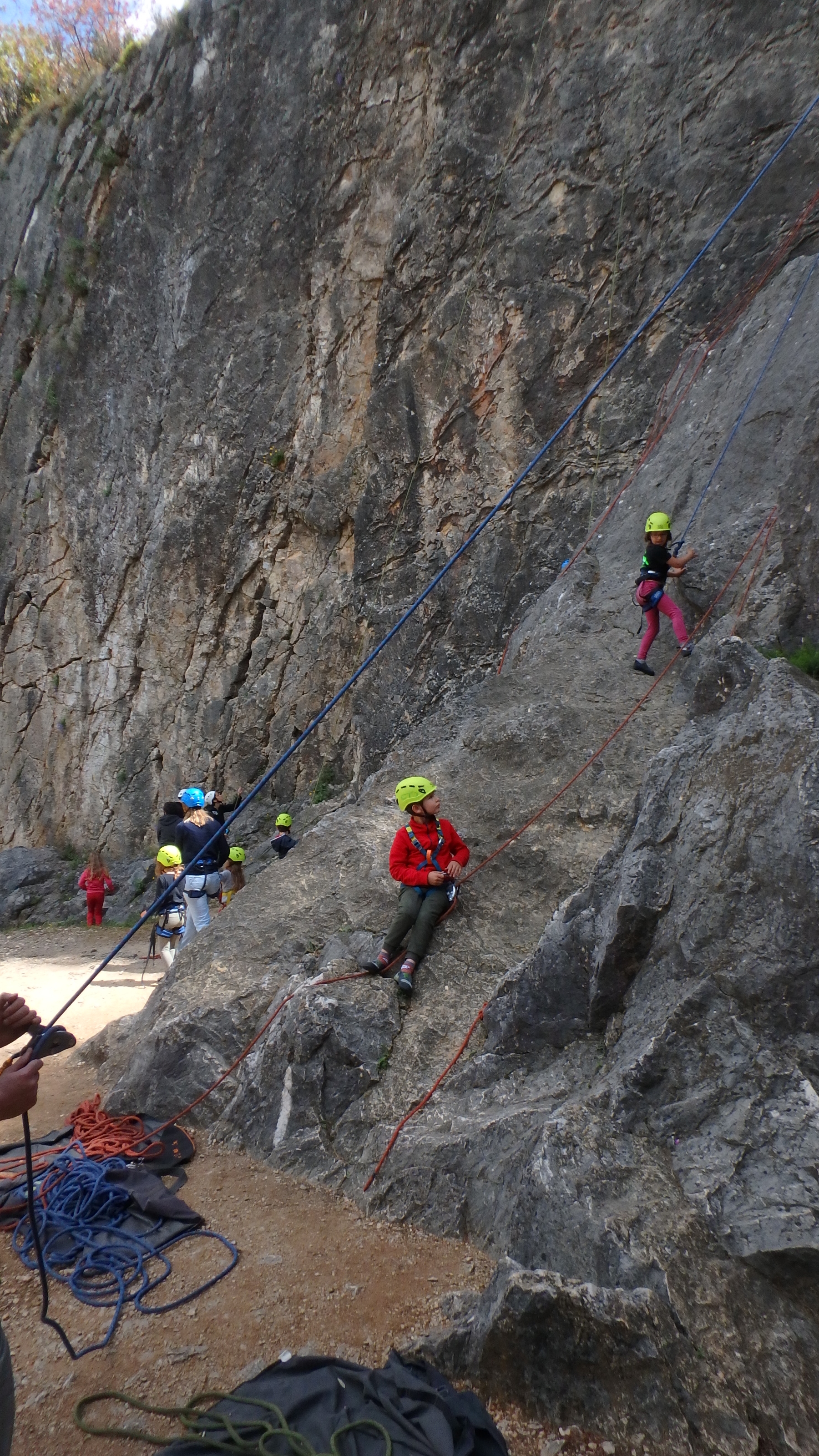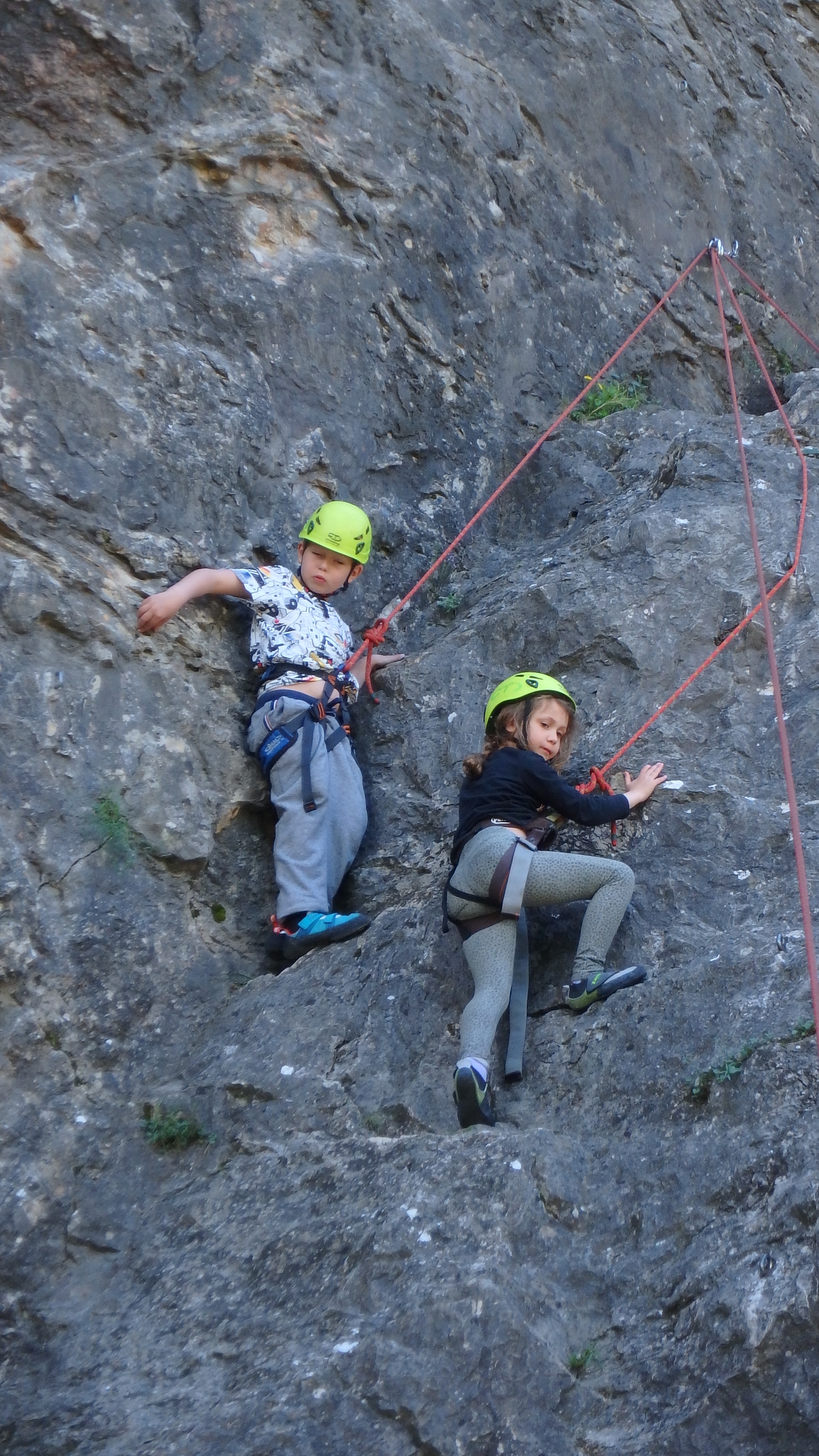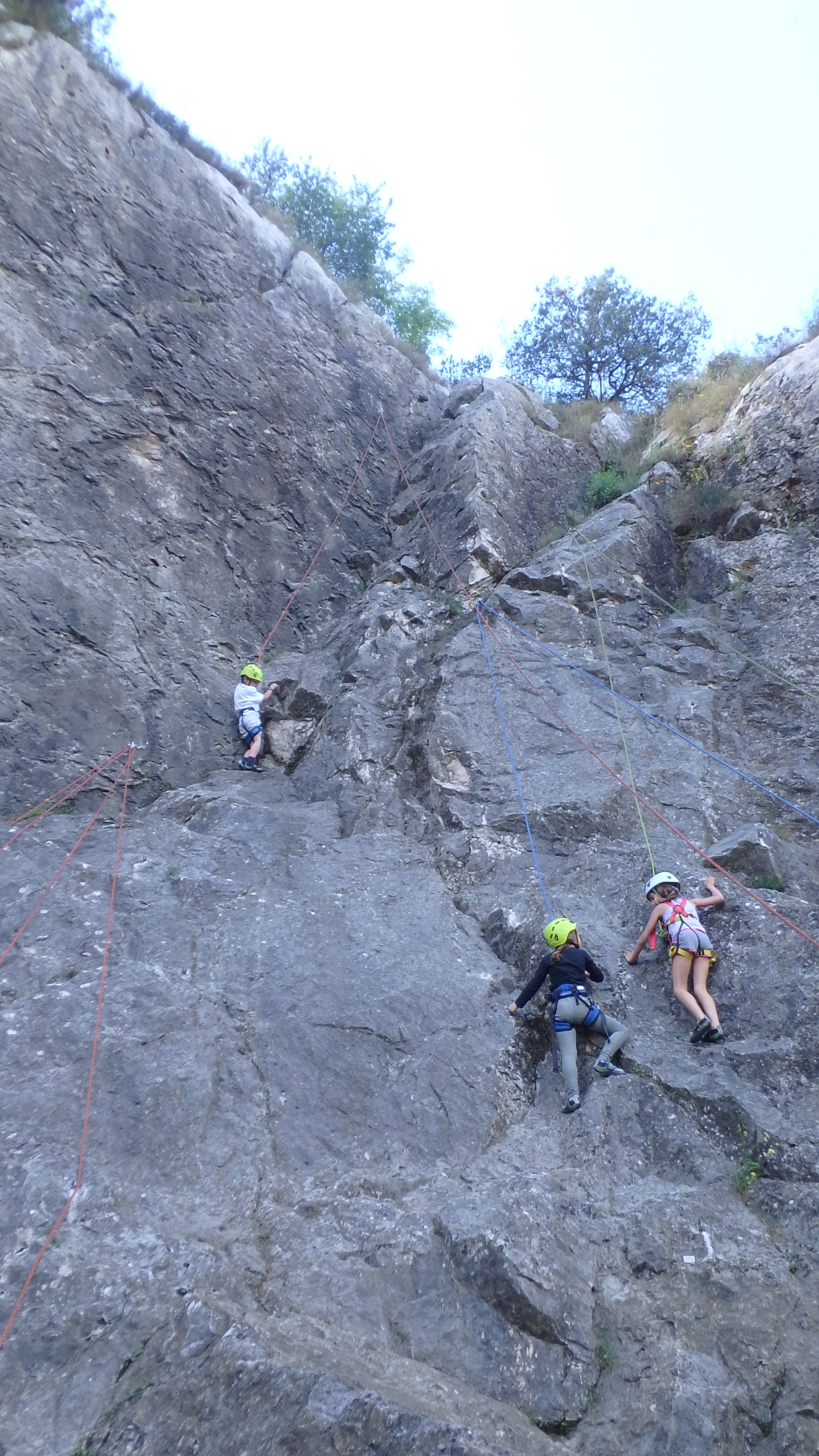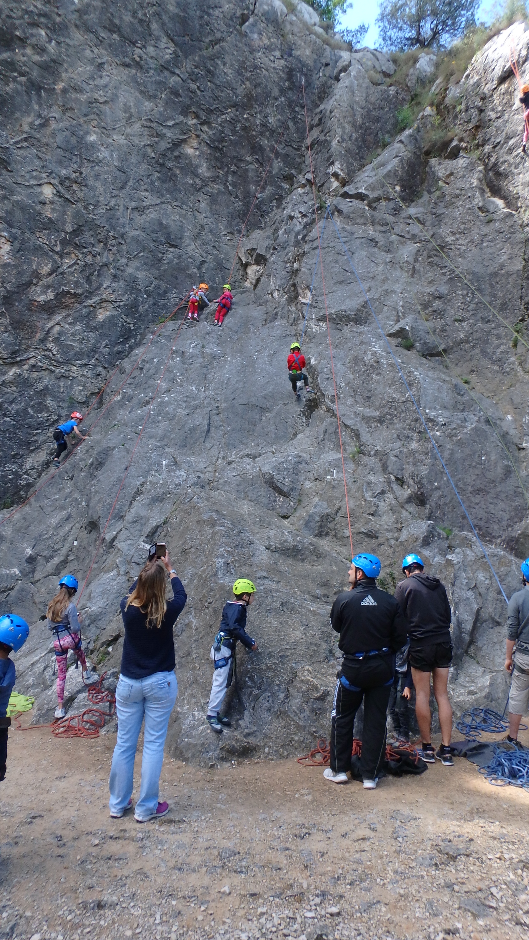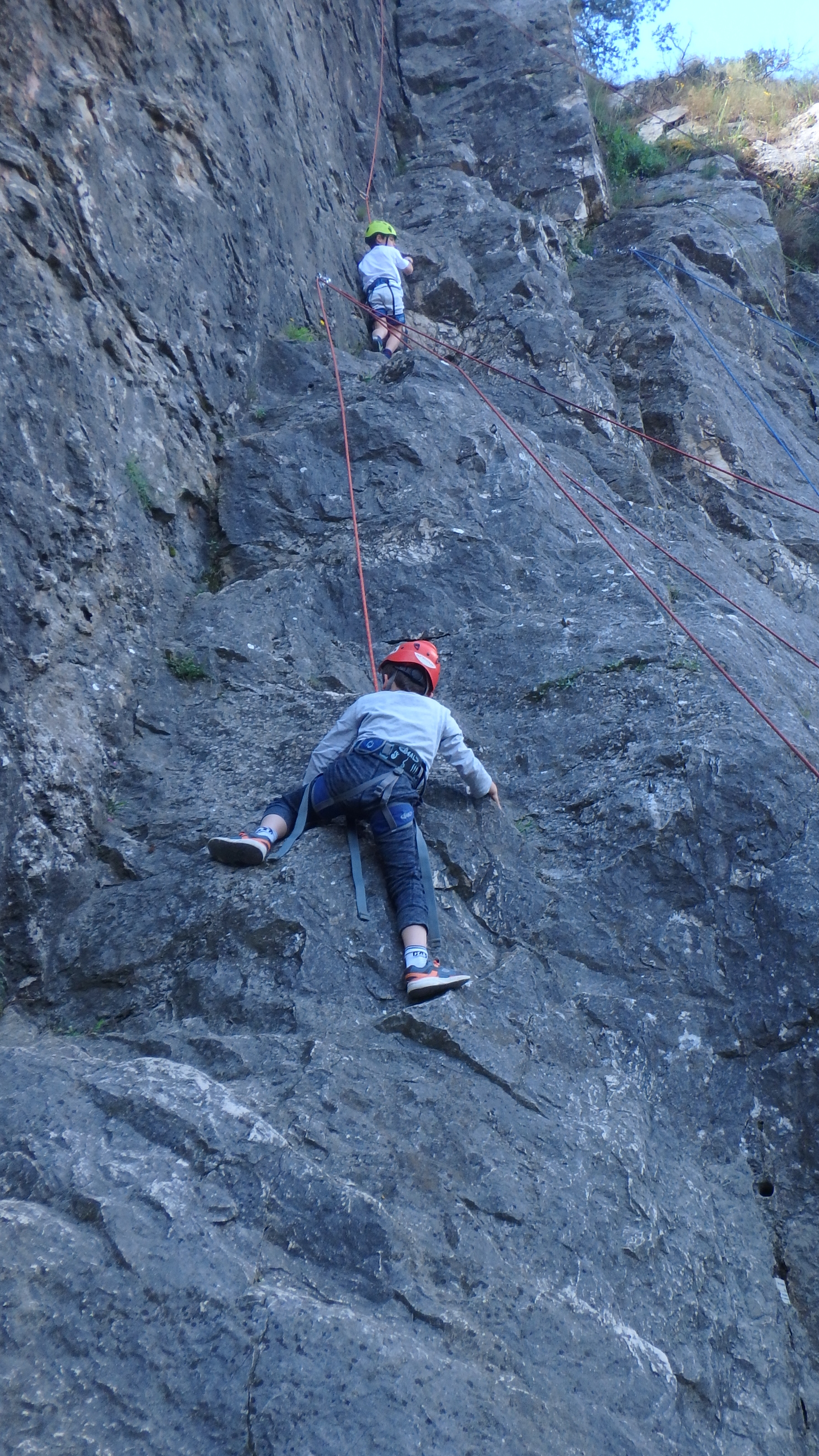 Le matin, je retrouve donc Pierre Antoine, Antoine, Sidonie, Lou, Axel, Chloé, Matéo et Louis prêts à en découdre! Les parents se préparent pour l’assurage et c’est parti pour 2h de grimpe non stop. Les petits sont inépuisables ! Pour gagner du temps sur les voies les plus courtes, je leur propose même de les enchaîner deux fois d’affilée pour essayer de les fatiguer mais rien à faire, même le soleil et la chaleur ne les feront pas se décoller du rocher…