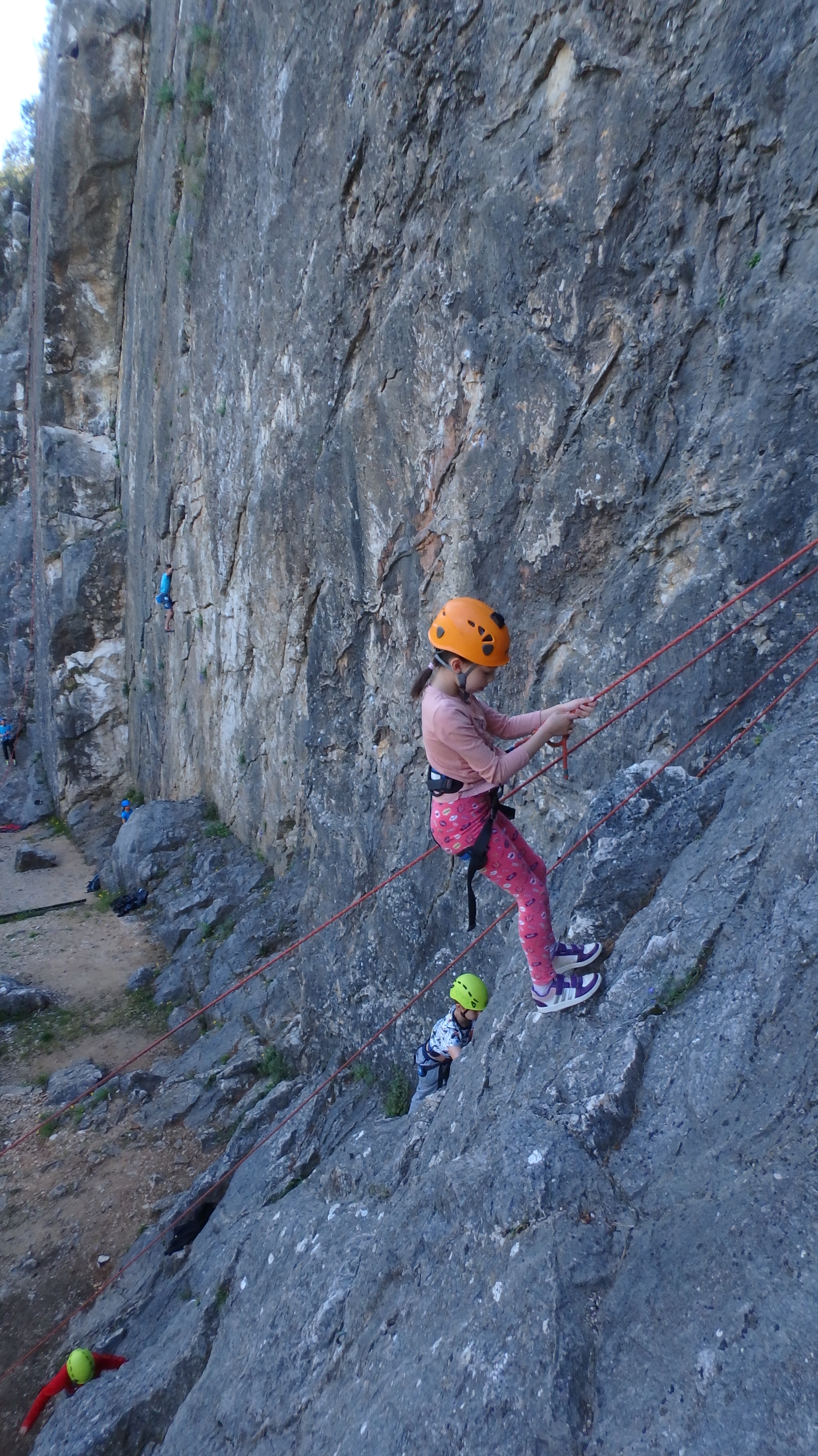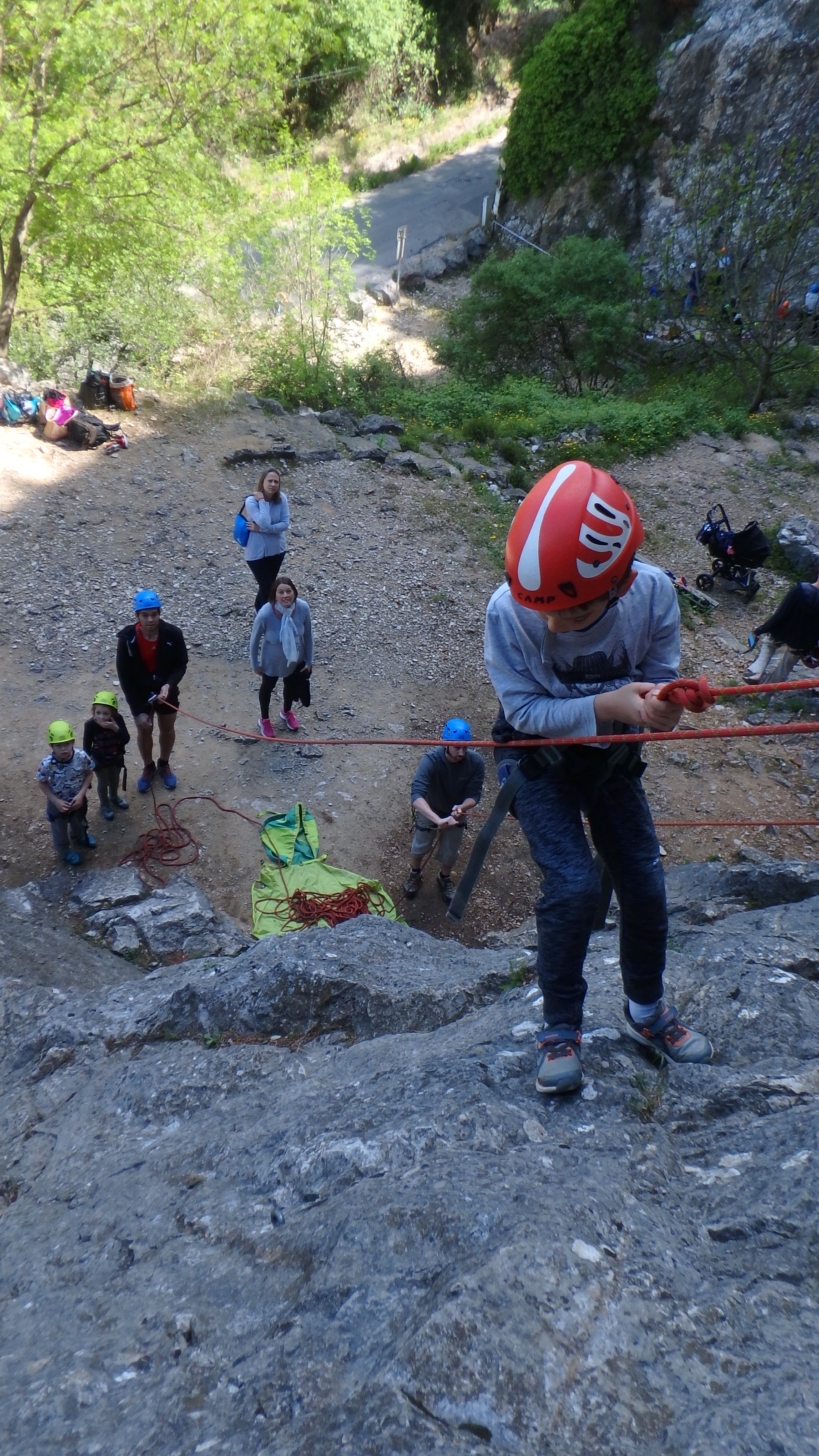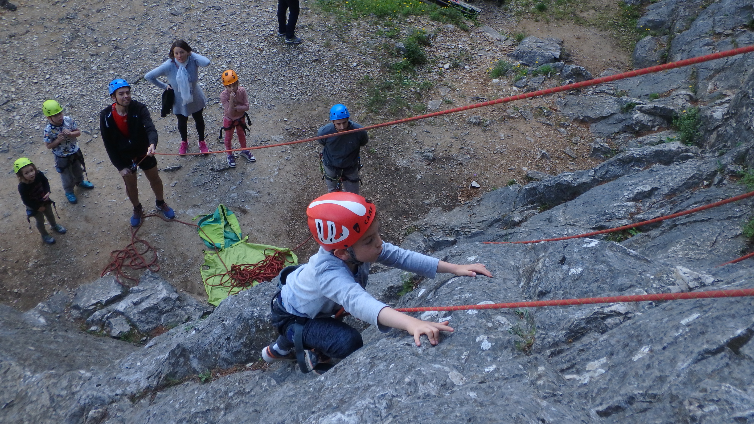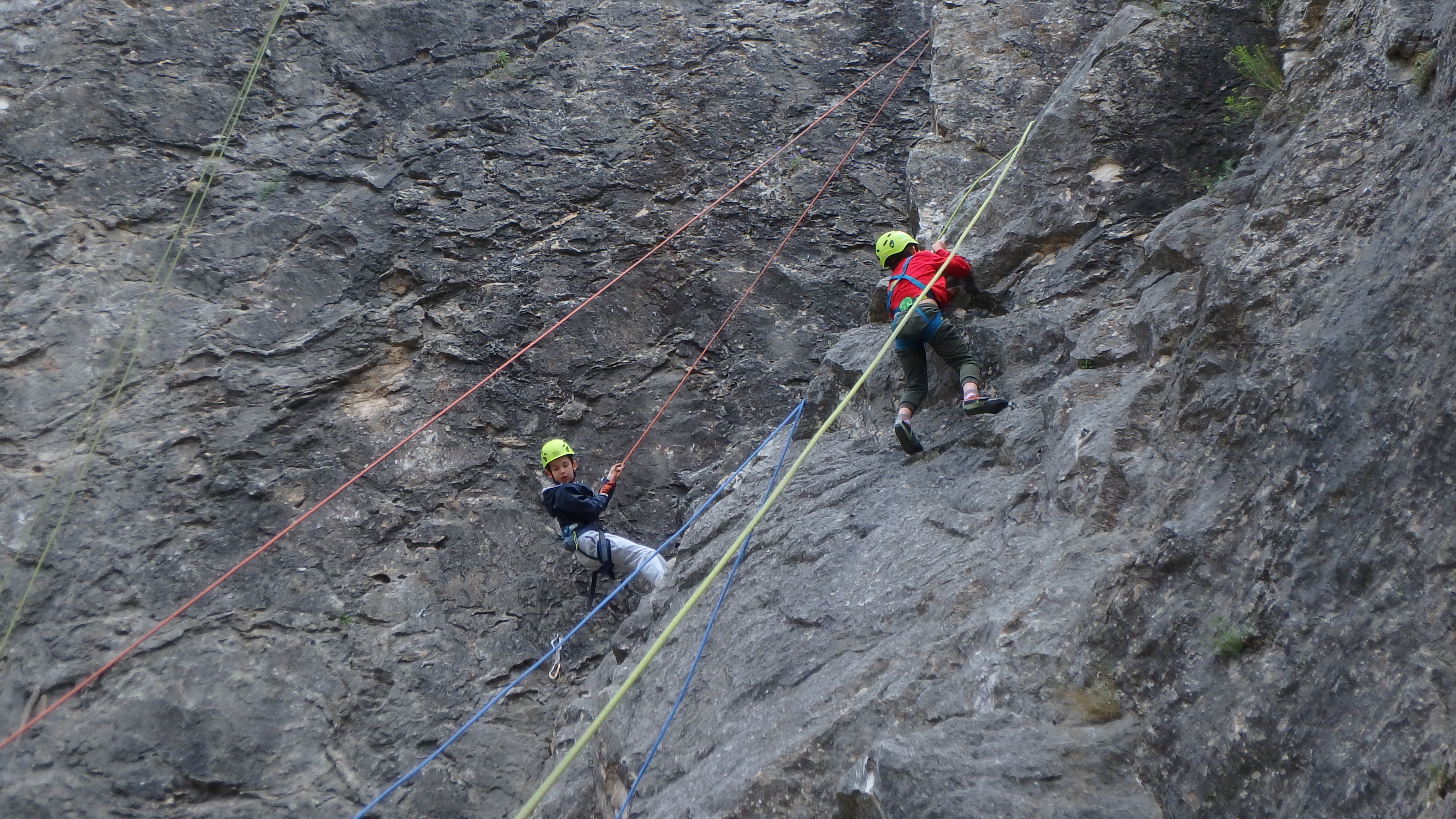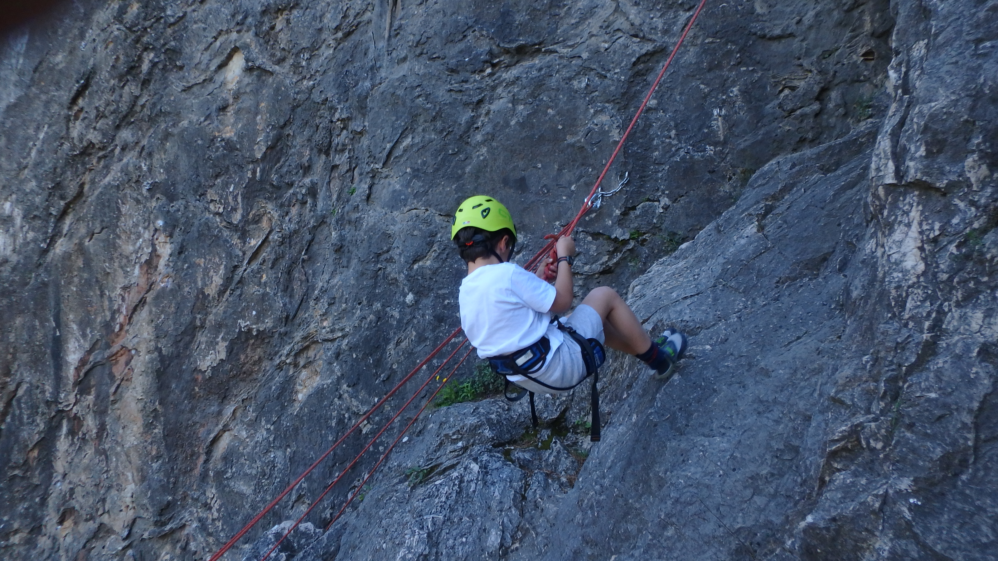 Le matin, je retrouve donc Pierre Antoine, Antoine, Sidonie, Lou, Axel, Chloé, Matéo et Louis prêts à en découdre! Les parents se préparent pour l’assurage et c’est parti pour 2h de grimpe non stop. Les petits sont inépuisables ! Pour gagner du temps sur les voies les plus courtes, je leur propose même de les enchaîner deux fois d’affilée pour essayer de les fatiguer mais rien à faire, même le soleil et la chaleur ne les feront pas se décoller du rocher…