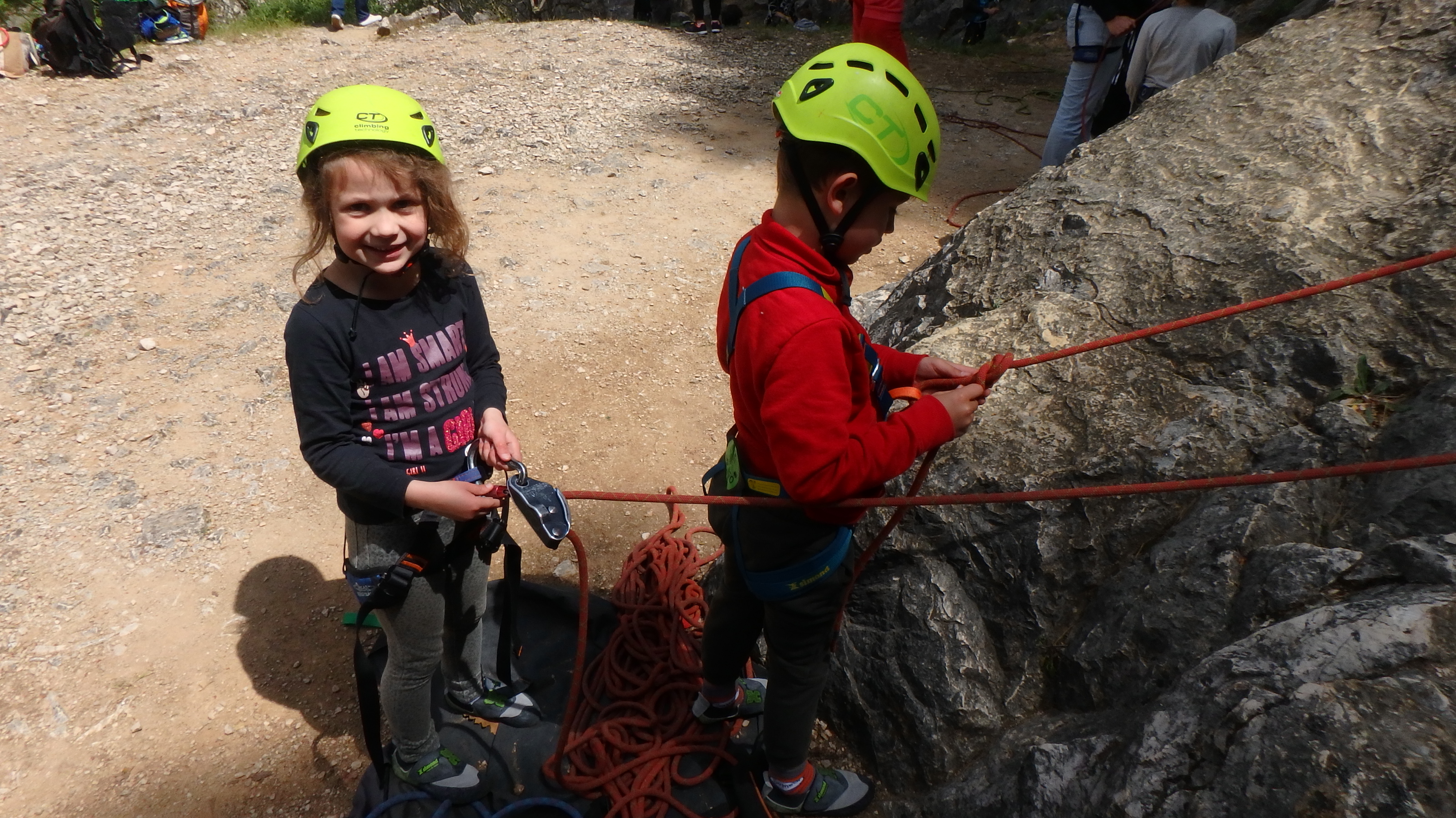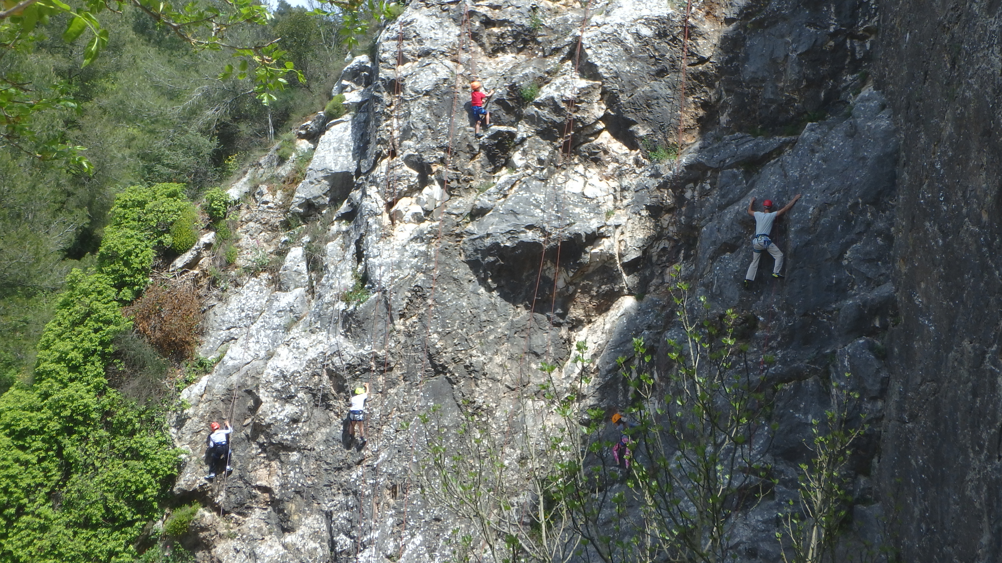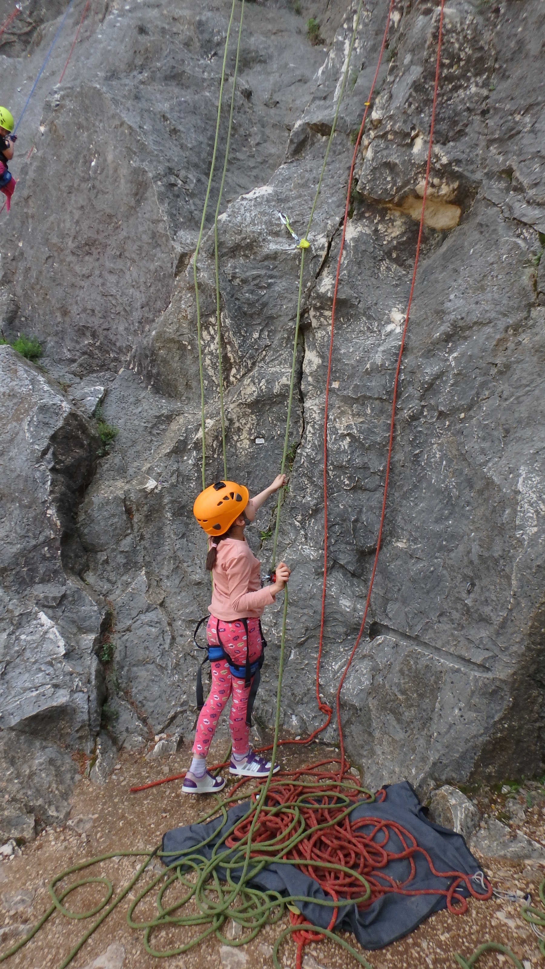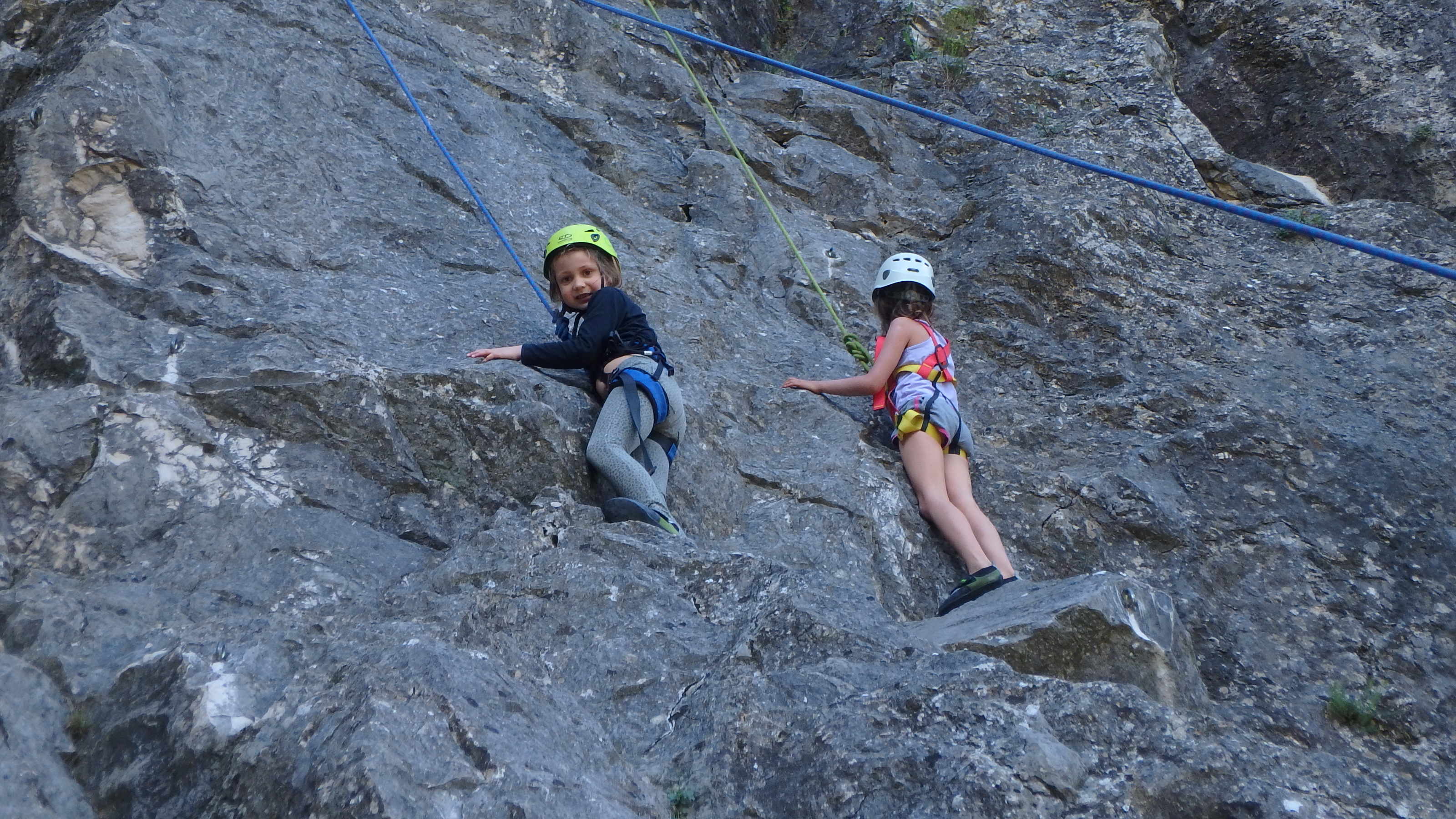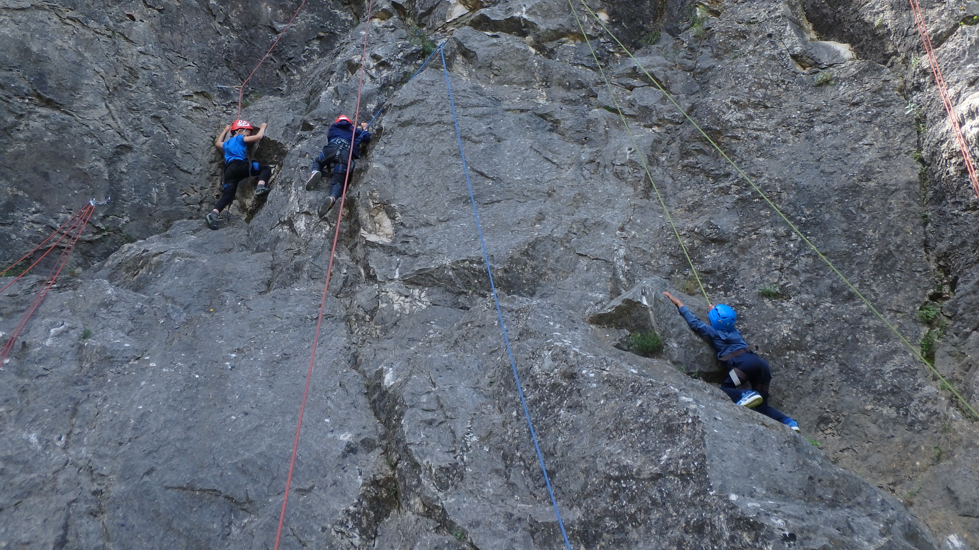 Le matin, je retrouve donc Pierre Antoine, Antoine, Sidonie, Lou, Axel, Chloé, Matéo et Louis prêts à en découdre! Les parents se préparent pour l’assurage et c’est parti pour 2h de grimpe non stop. Les petits sont inépuisables ! Pour gagner du temps sur les voies les plus courtes, je leur propose même de les enchaîner deux fois d’affilée pour essayer de les fatiguer mais rien à faire, même le soleil et la chaleur ne les feront pas se décoller du rocher…