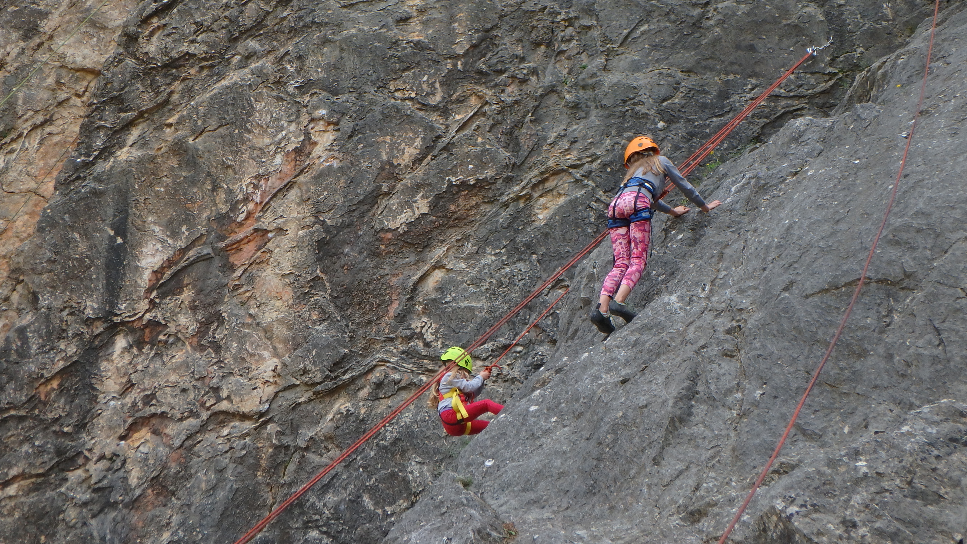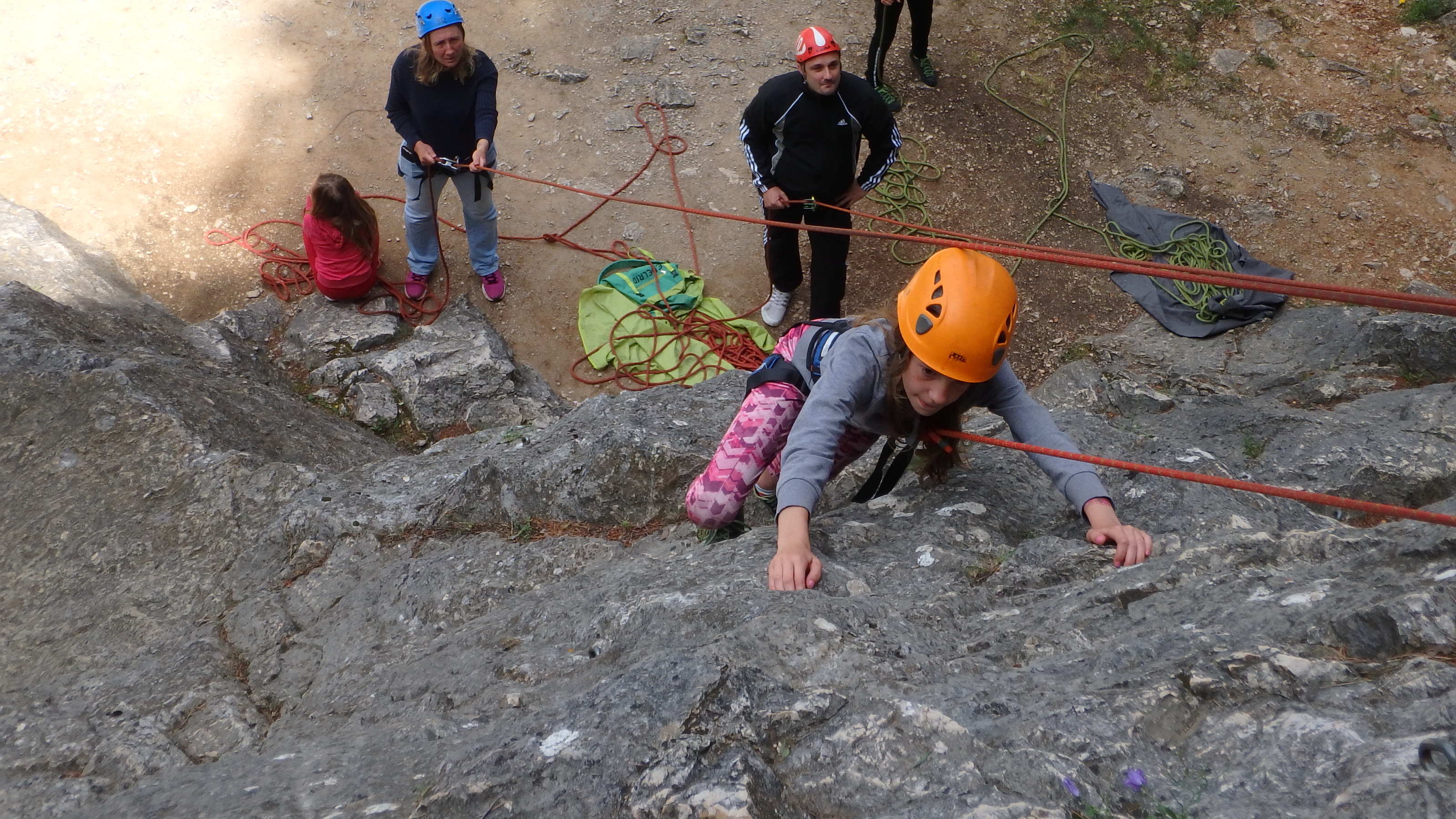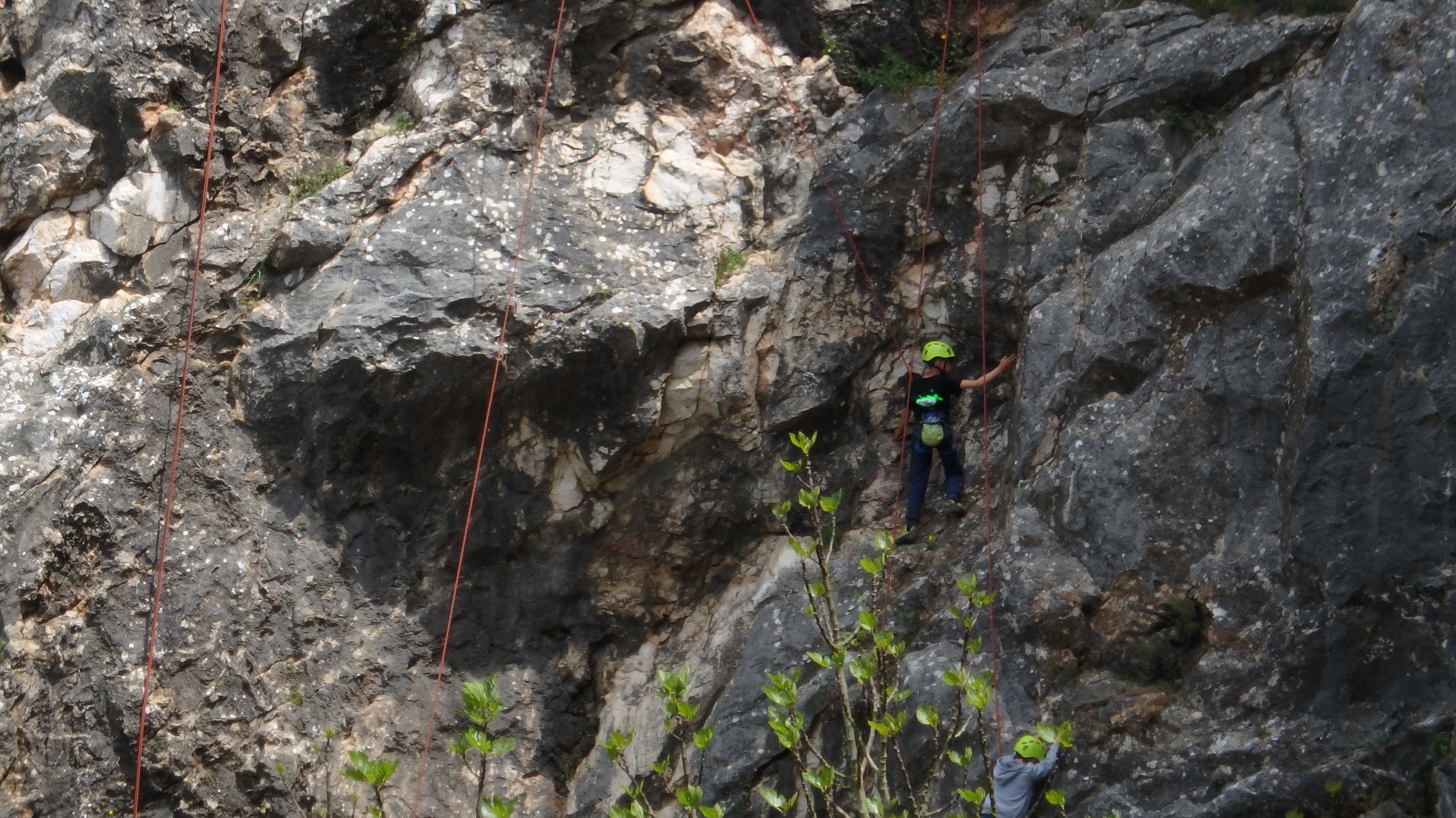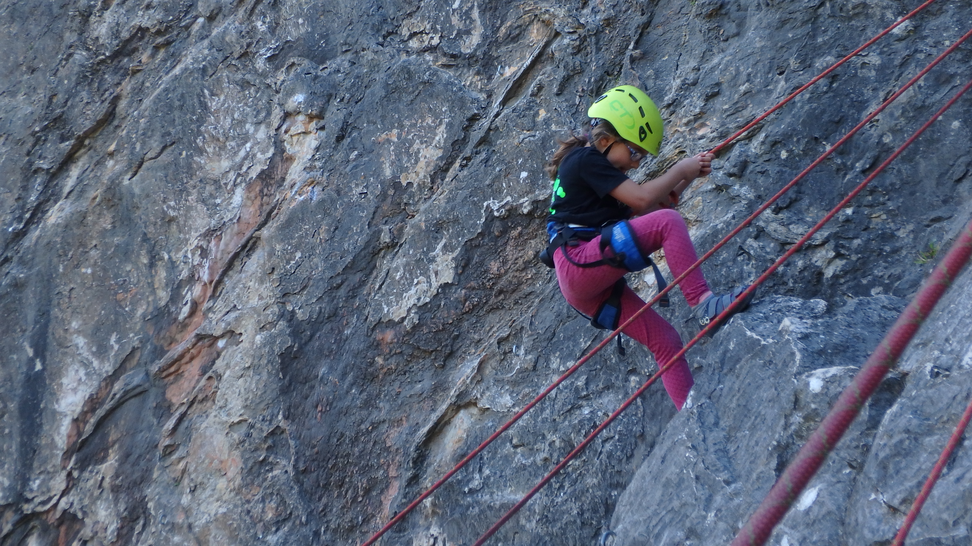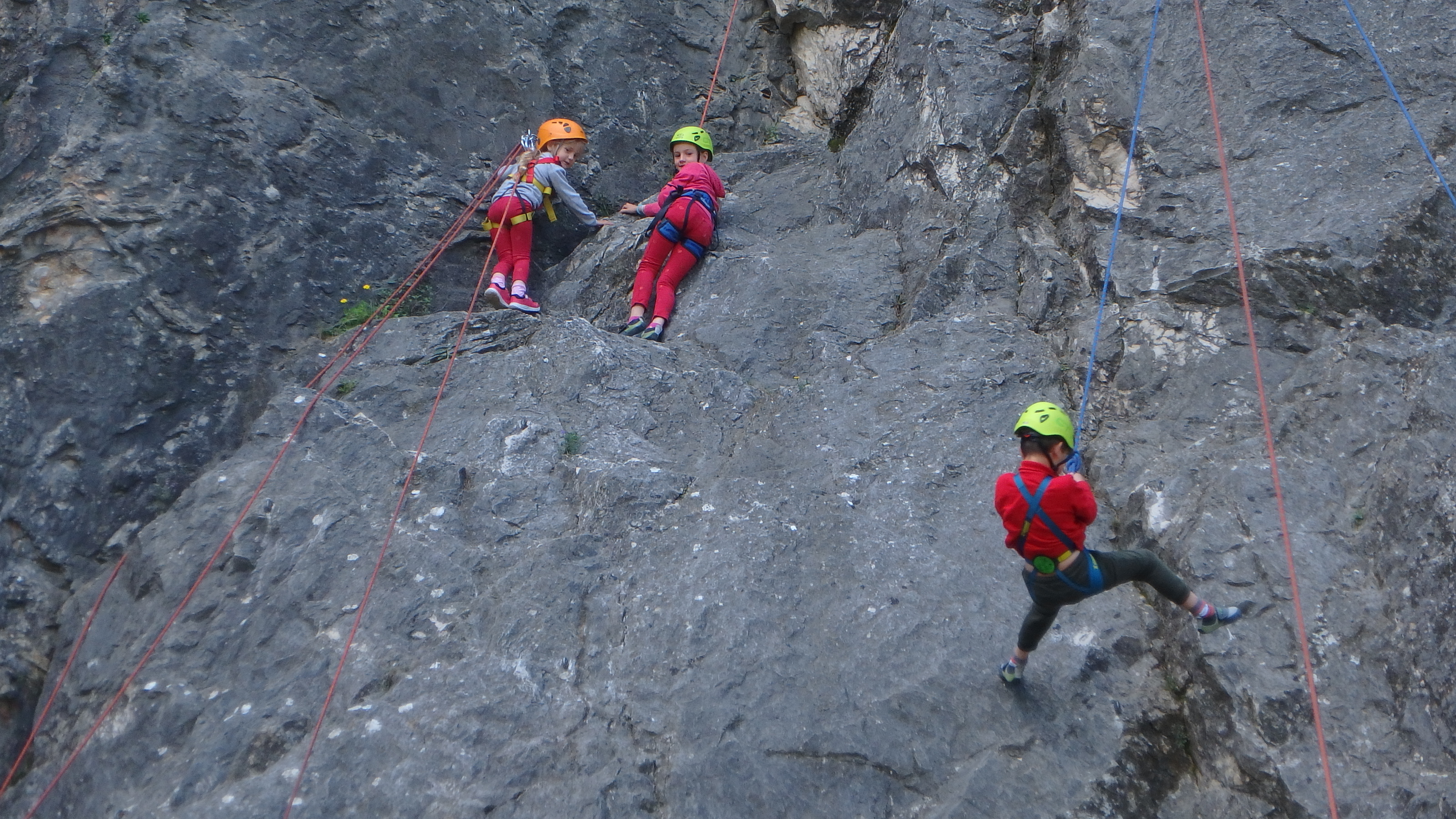 Le matin, je retrouve donc Pierre Antoine, Antoine, Sidonie, Lou, Axel, Chloé, Matéo et Louis prêts à en découdre! Les parents se préparent pour l’assurage et c’est parti pour 2h de grimpe non stop. Les petits sont inépuisables ! Pour gagner du temps sur les voies les plus courtes, je leur propose même de les enchaîner deux fois d’affilée pour essayer de les fatiguer mais rien à faire, même le soleil et la chaleur ne les feront pas se décoller du rocher…