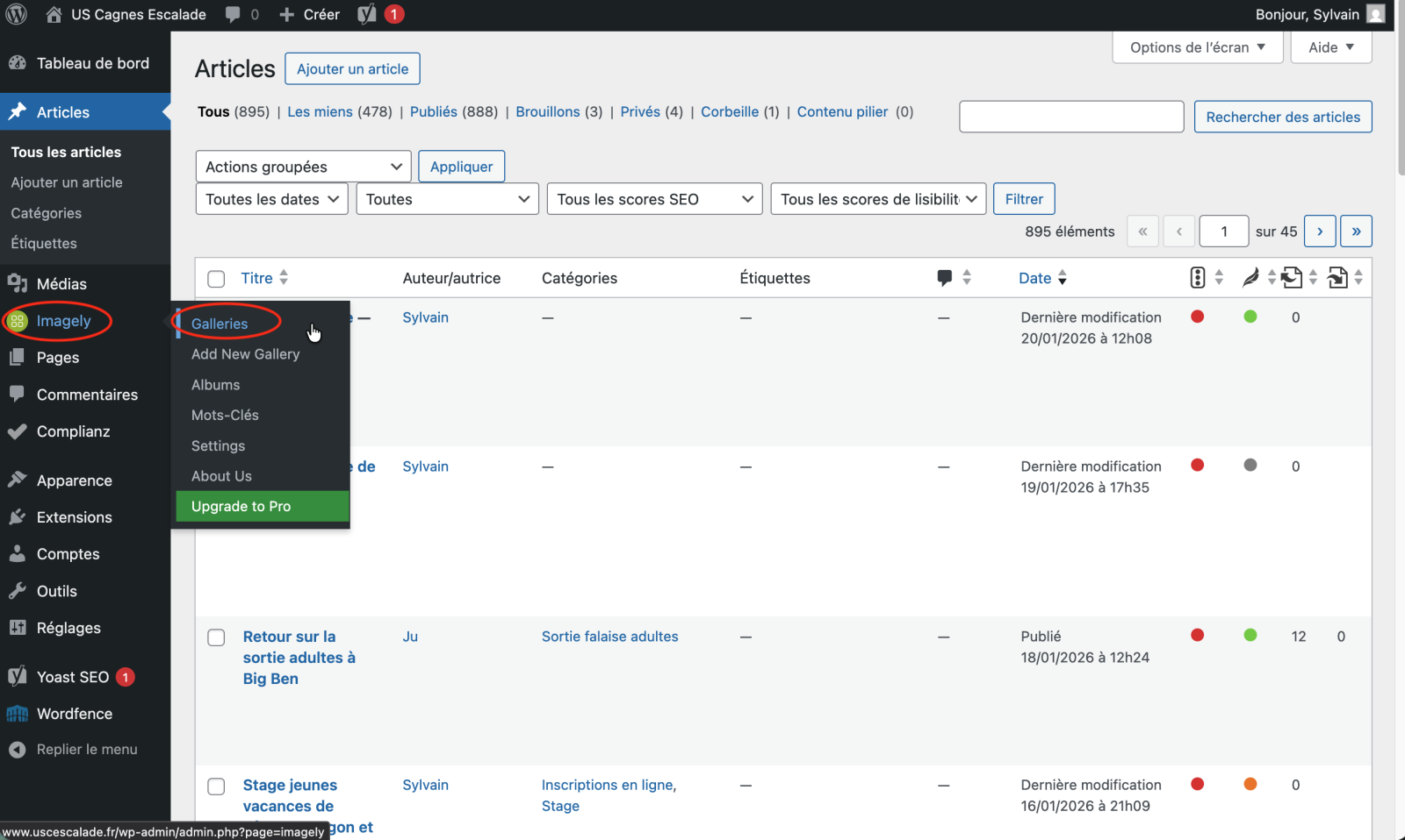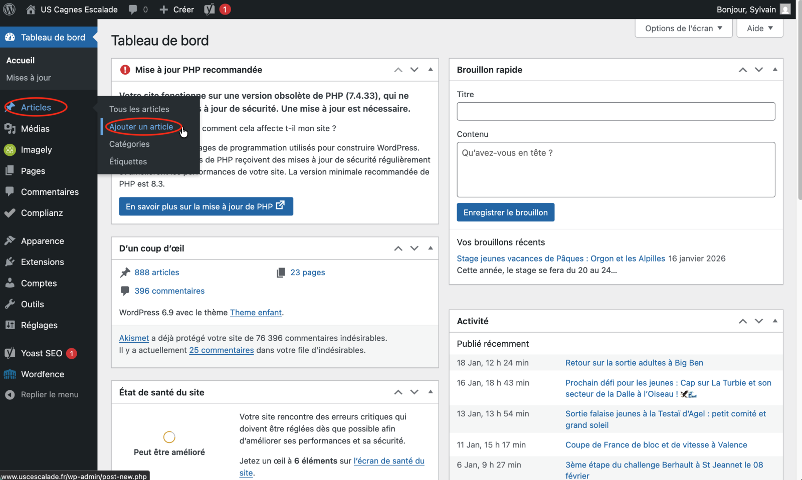 La première chose est d’aller sur la page d’admin du site : https://www.uscescalade.fr/wp-admin/