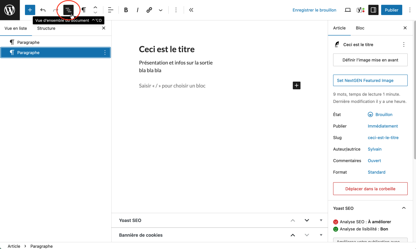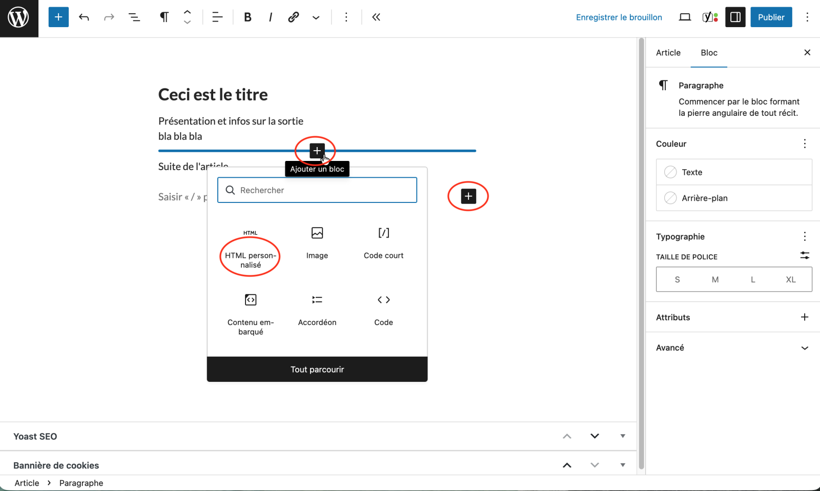 Par défaut, les nouveaux blocs créées sont du type Paragraphe.