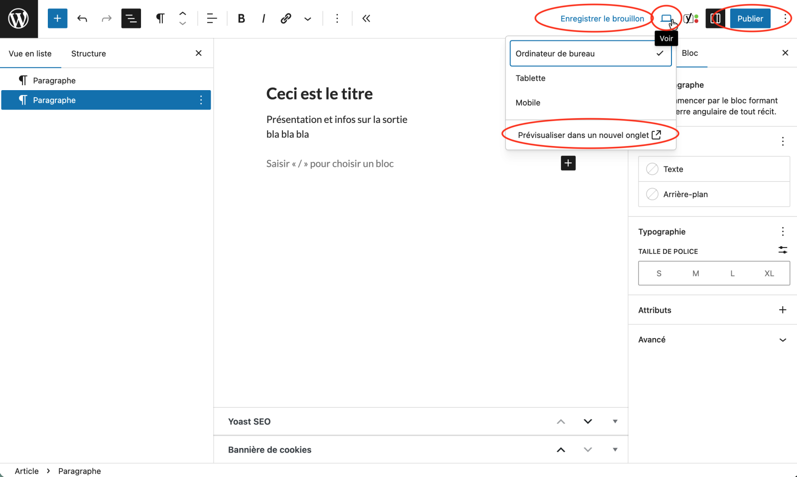 Dans le menu du haut à droite, vous pouvez Enregistrer le brouillon à tout moment, prévisualiser votre article en cliquant sur l’icône à droite ou Publier pour mettre en ligne votre article.