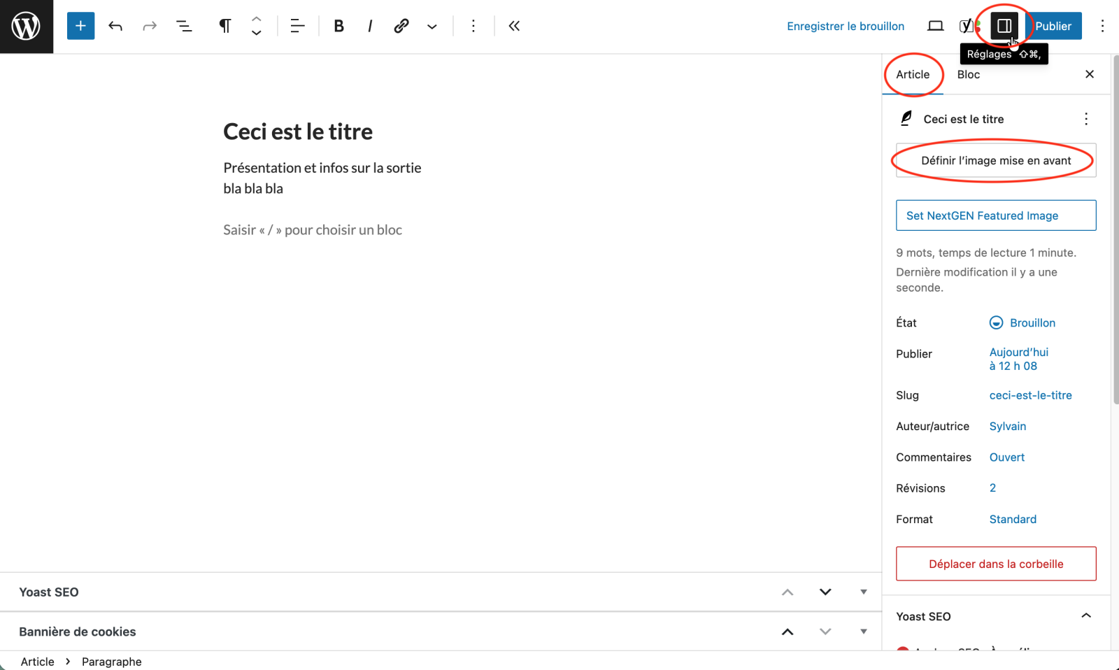 Revenez à l’onglet de votre article et Cliquez sur l’icône Réglages et l’onglet « Article » puis sur Définir l’image mise en avant.