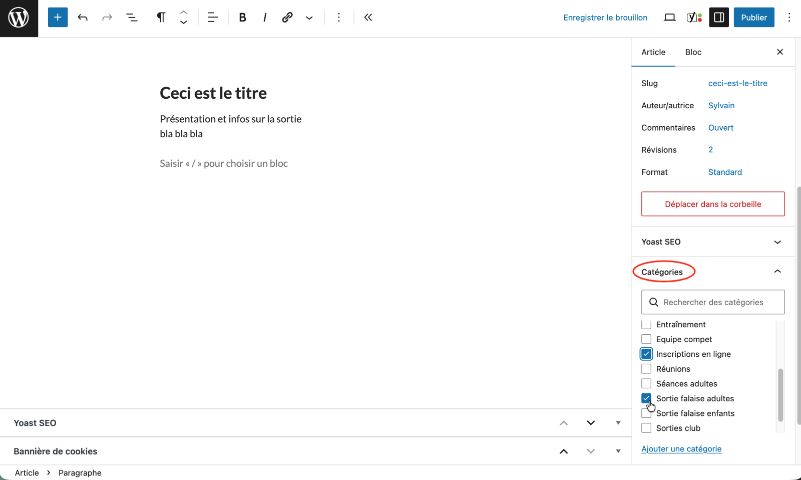 Un peu plus bas dans l’onglet « Article », pensez à cocher la ou les catégories de l’article (Sortie falaise enfants ou adultes, compétition… et Inscriptions en ligne s’il s’agit d’un événement où il faut s’inscrire).