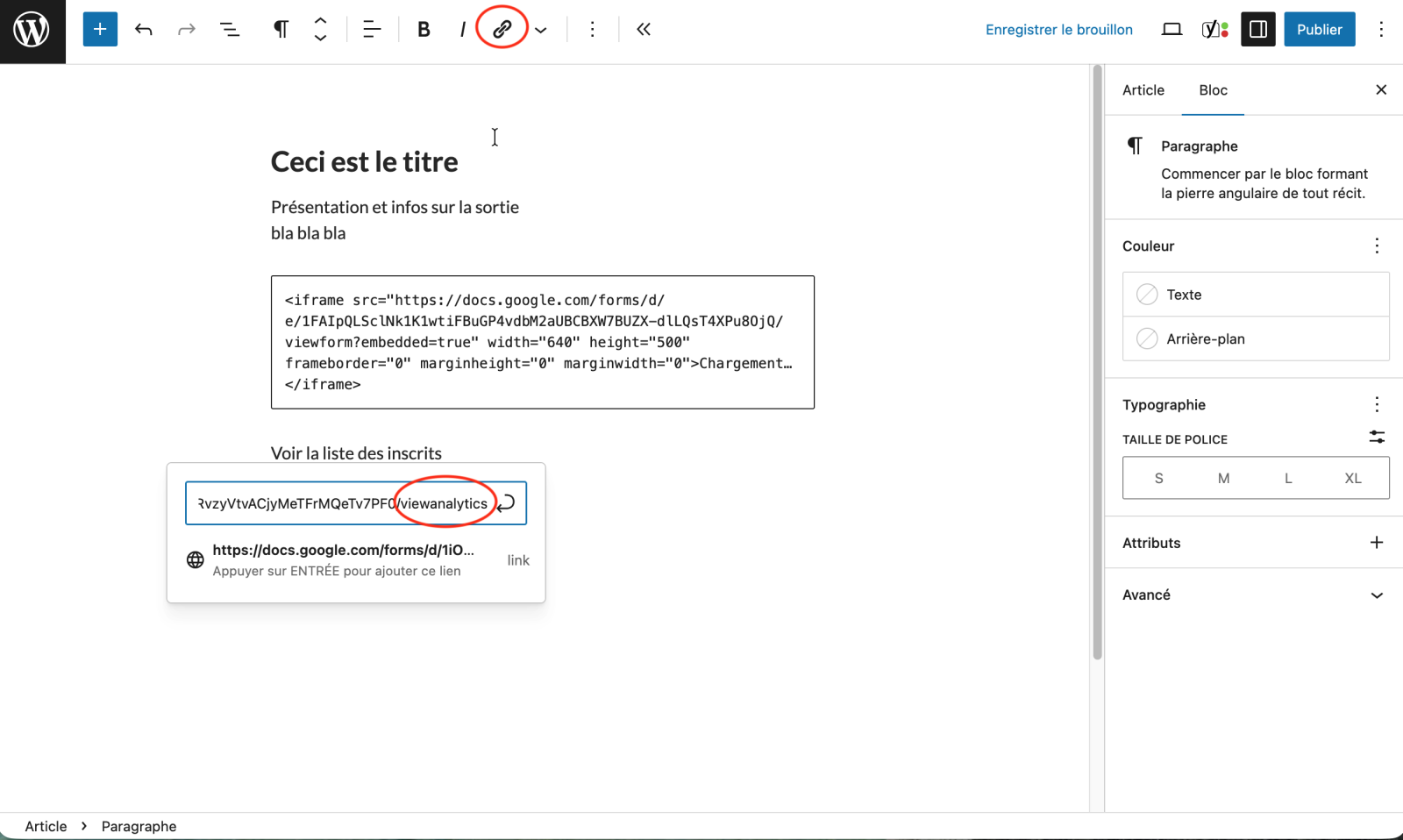 Revenez à l’onglet de votre article et en dessous du formulaire, tapez « Voir la liste des inscrits ». Sélectionnez le texte et cliquez sur le bouton « maillon » dans le menu supérieur.