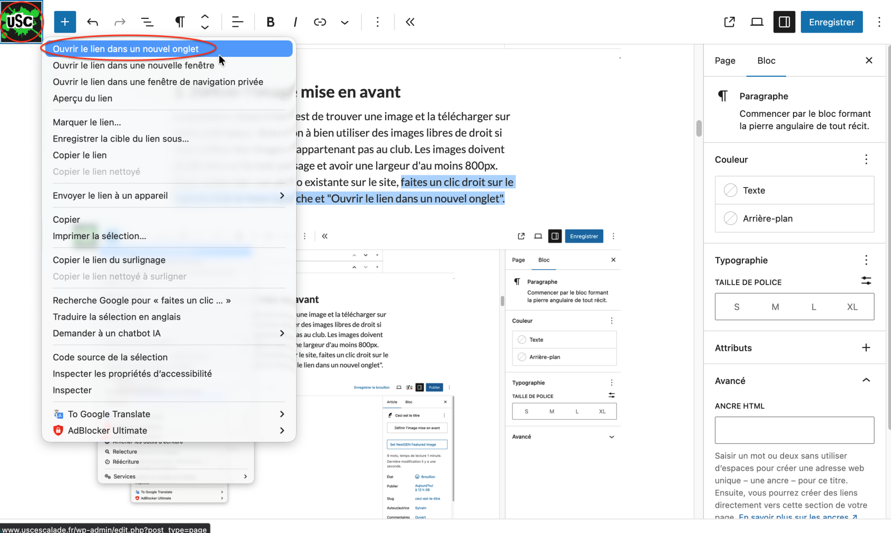 La première chose à faire est de trouver une image et la télécharger sur votre ordinateur. Attention à bien utiliser des images libres de droit si vous utiliser des images n’appartenant pas au club. Les images doivent plutôt être en format paysage et avoir une largeur d’au moins 800px. Pour rechercher une photo existante sur le site, faites un clic droit sur le logo du club en haut à gauche et « Ouvrir le lien dans un nouvel onglet ».