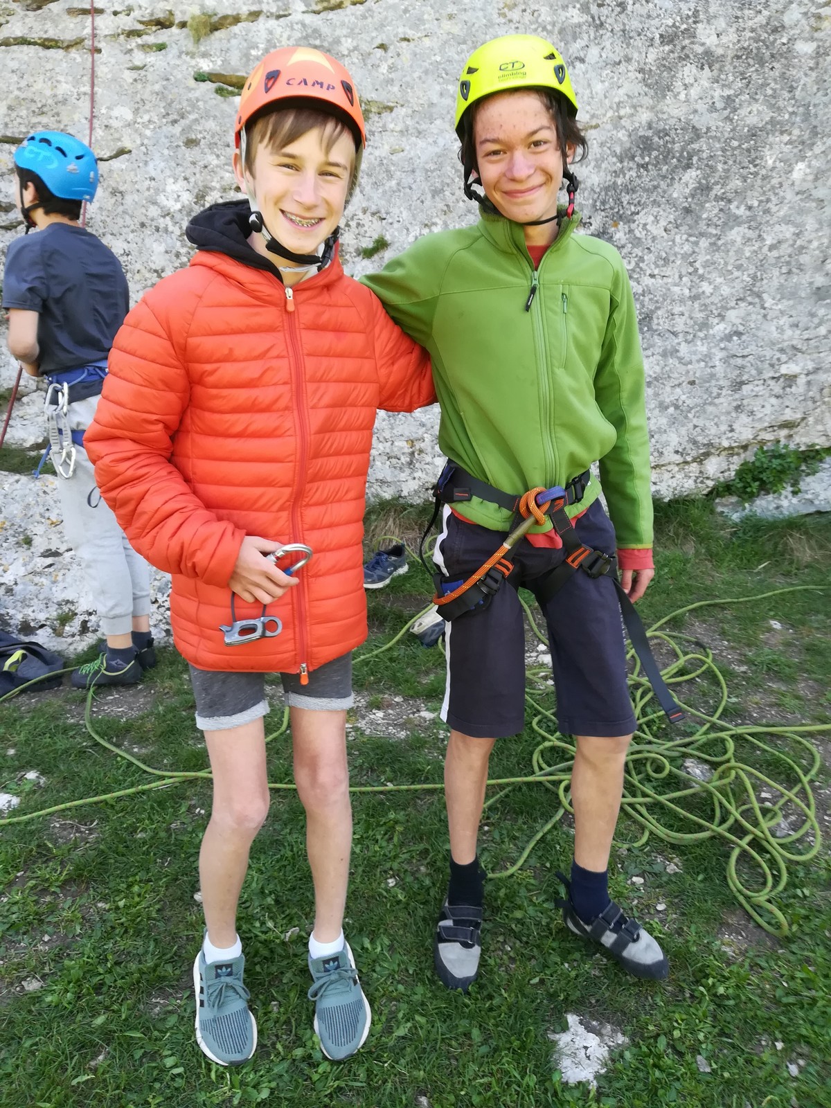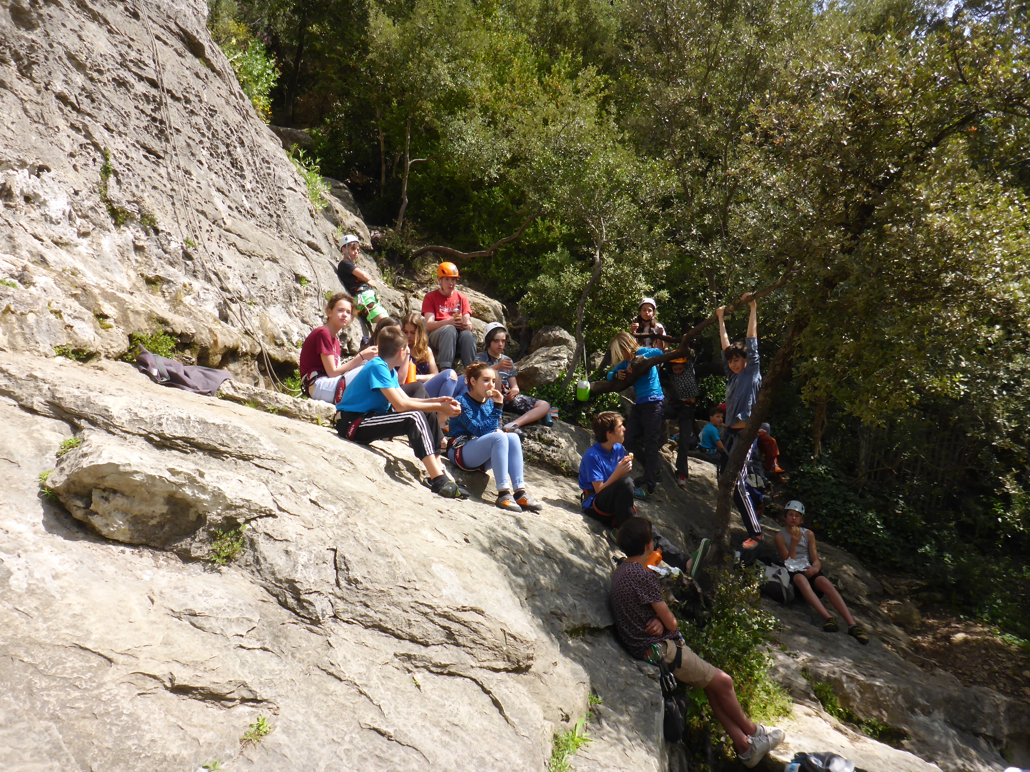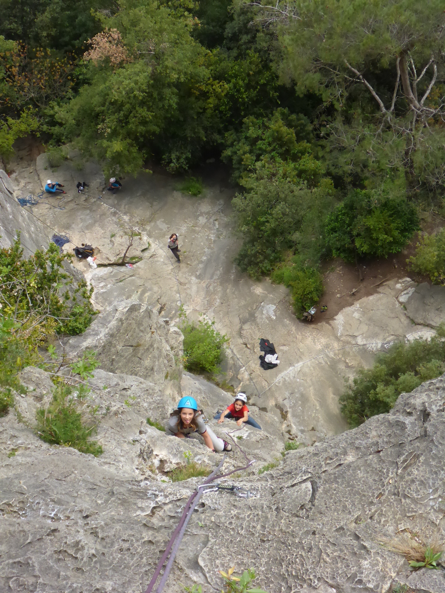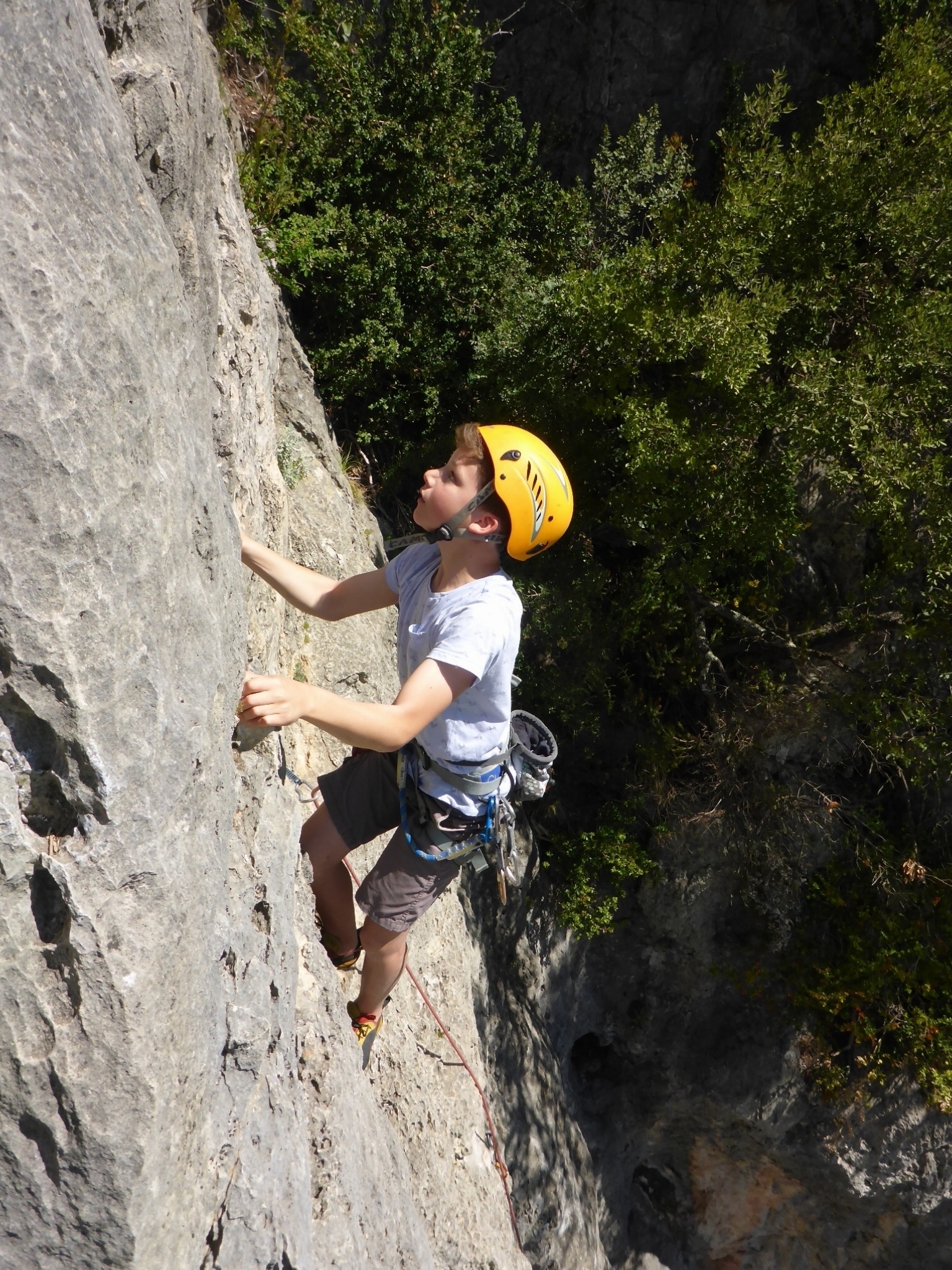 Le groupe va écumer les voies dans le 5 et le 6. Certaines sont assez longues, le rocher est beau et adhérent, et les jeunes sont motivés, les voies ne restent pas libres très longtemps ! Petite initiation à la grande voie aussi avec des voies en 2 longueurs pour Constant et Vincent et Océane et Lisa (leitmotiv du jour pour elles : « j’ai peur, je vais mourir ! » tandis que Constant tente de dérouter les cordées avoisinantes en testant ses bombes chimiques…)