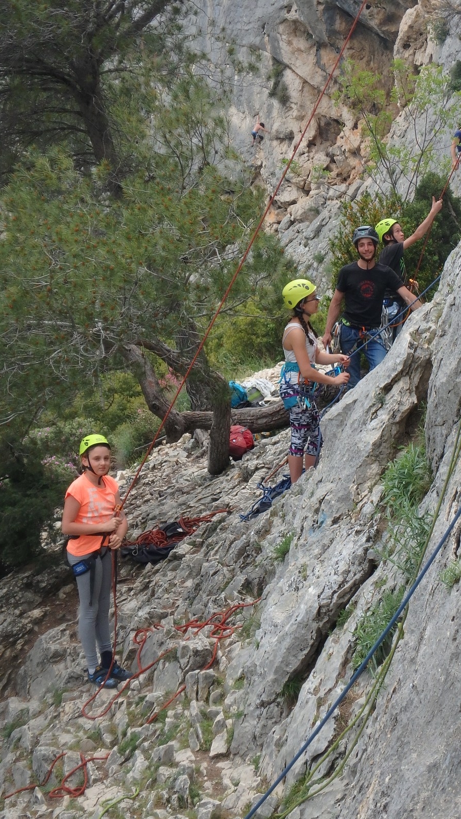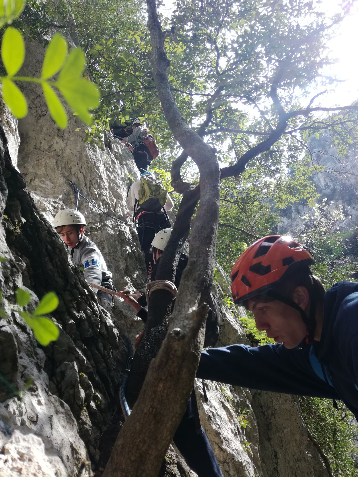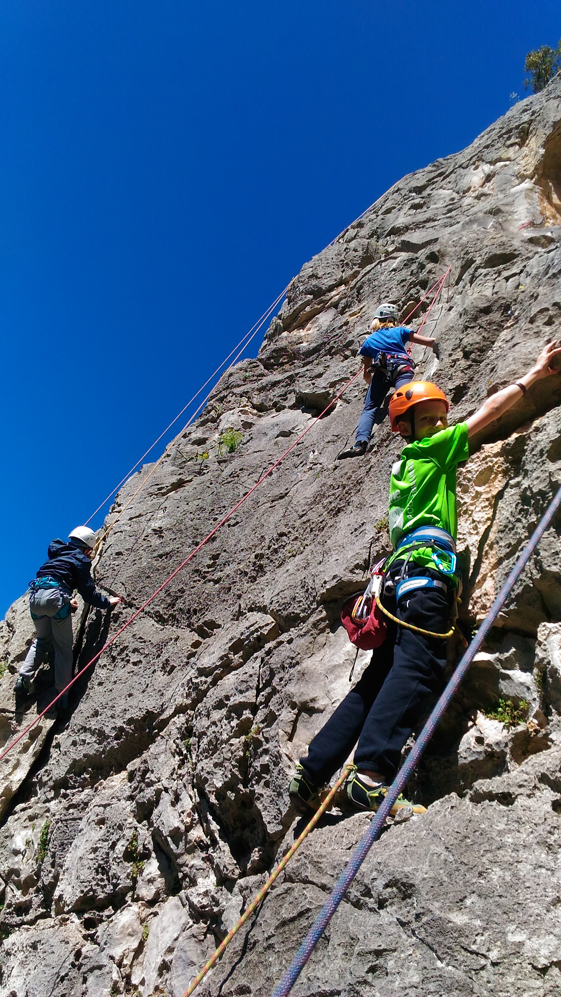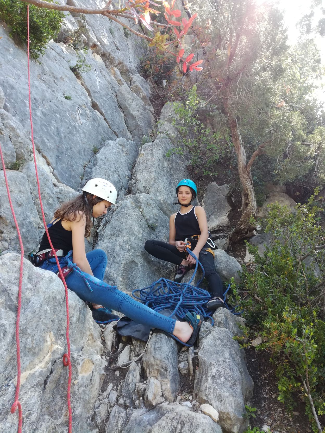 Le groupe va écumer les voies dans le 5 et le 6. Certaines sont assez longues, le rocher est beau et adhérent, et les jeunes sont motivés, les voies ne restent pas libres très longtemps ! Petite initiation à la grande voie aussi avec des voies en 2 longueurs pour Constant et Vincent et Océane et Lisa (leitmotiv du jour pour elles : « j’ai peur, je vais mourir ! » tandis que Constant tente de dérouter les cordées avoisinantes en testant ses bombes chimiques…)