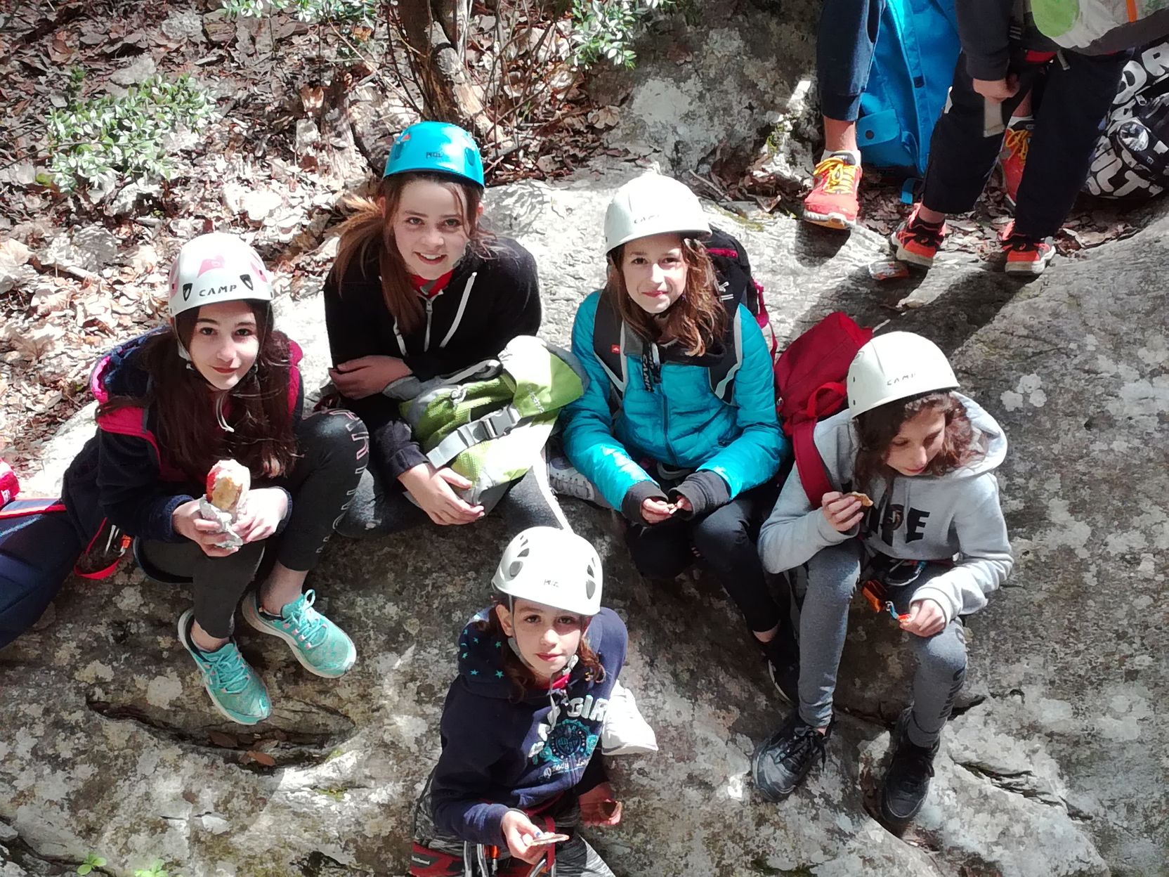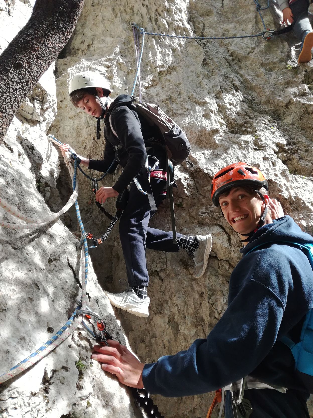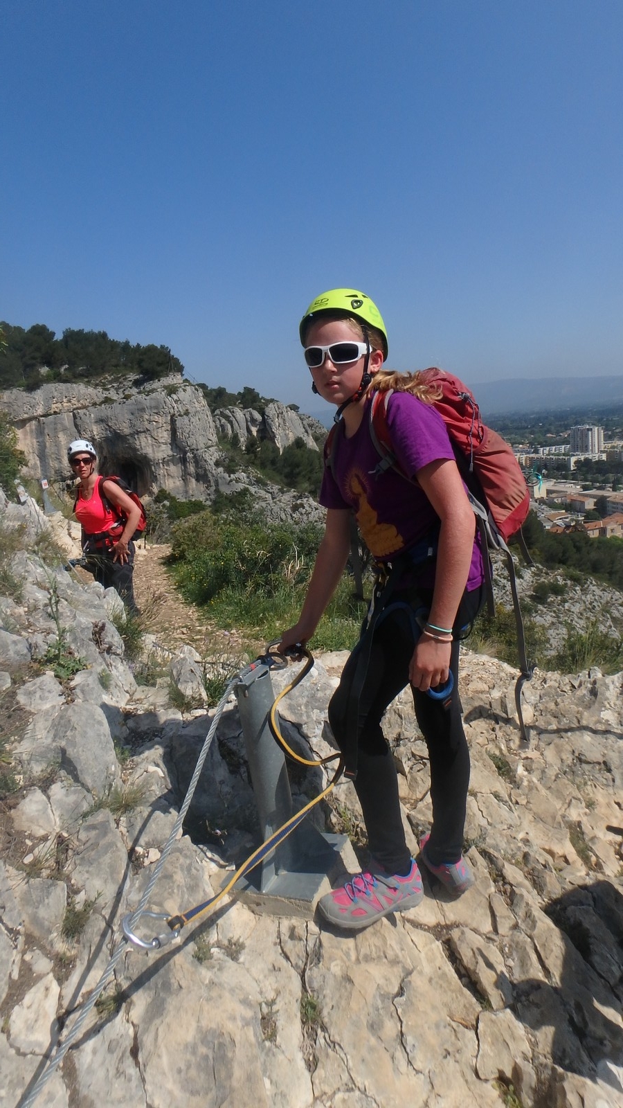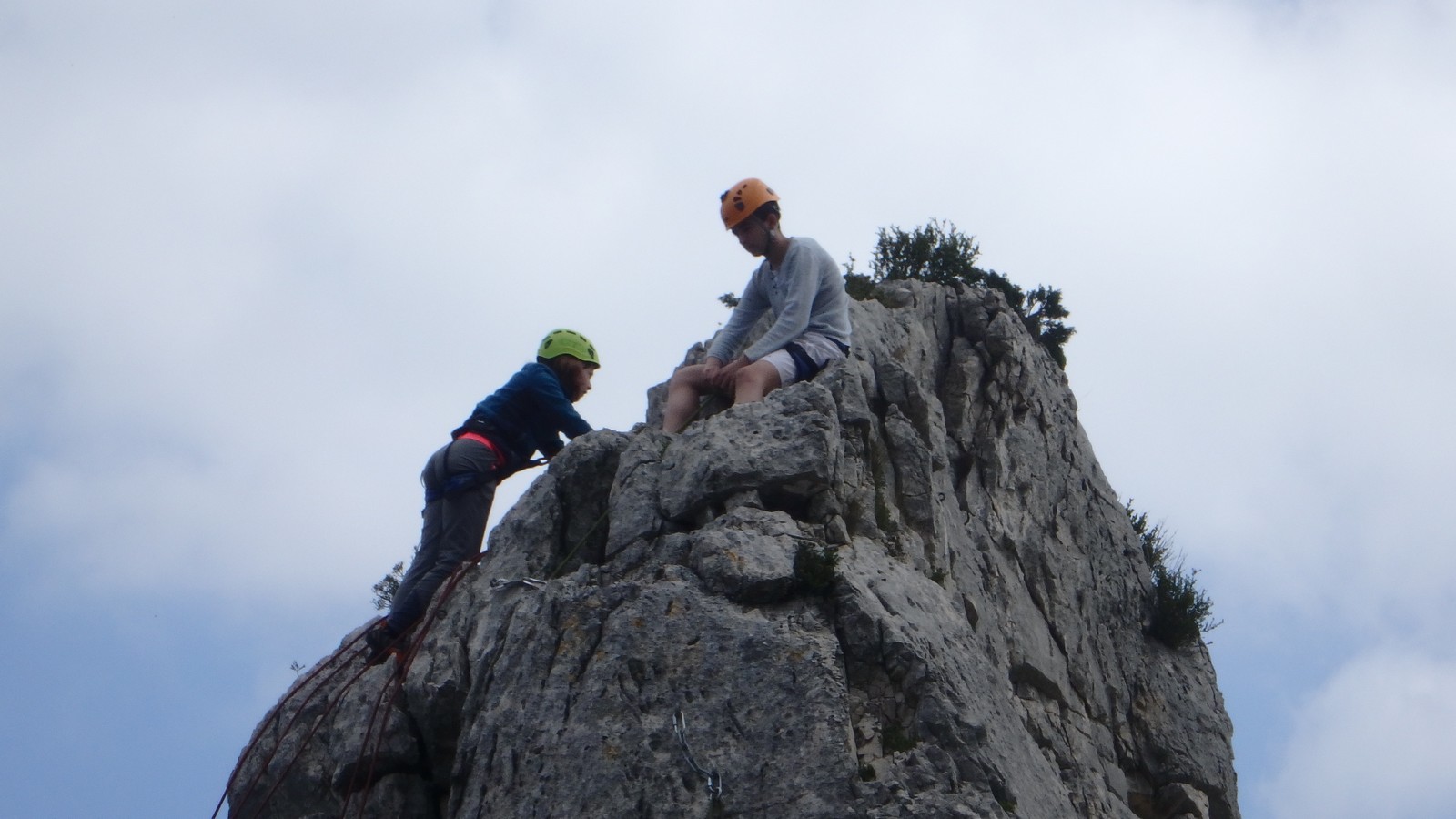 Le groupe va écumer les voies dans le 5 et le 6. Certaines sont assez longues, le rocher est beau et adhérent, et les jeunes sont motivés, les voies ne restent pas libres très longtemps ! Petite initiation à la grande voie aussi avec des voies en 2 longueurs pour Constant et Vincent et Océane et Lisa (leitmotiv du jour pour elles : « j’ai peur, je vais mourir ! » tandis que Constant tente de dérouter les cordées avoisinantes en testant ses bombes chimiques…)