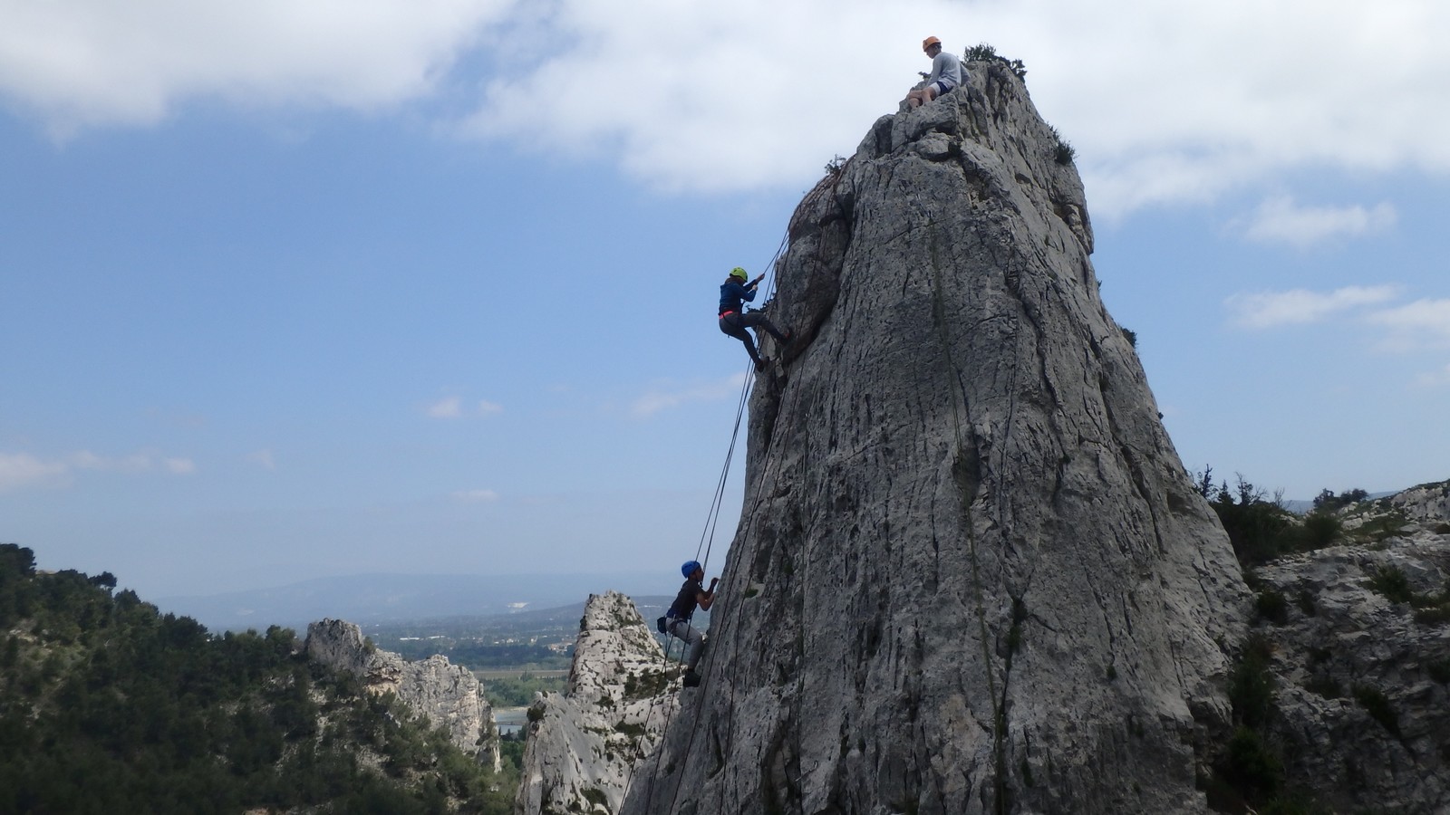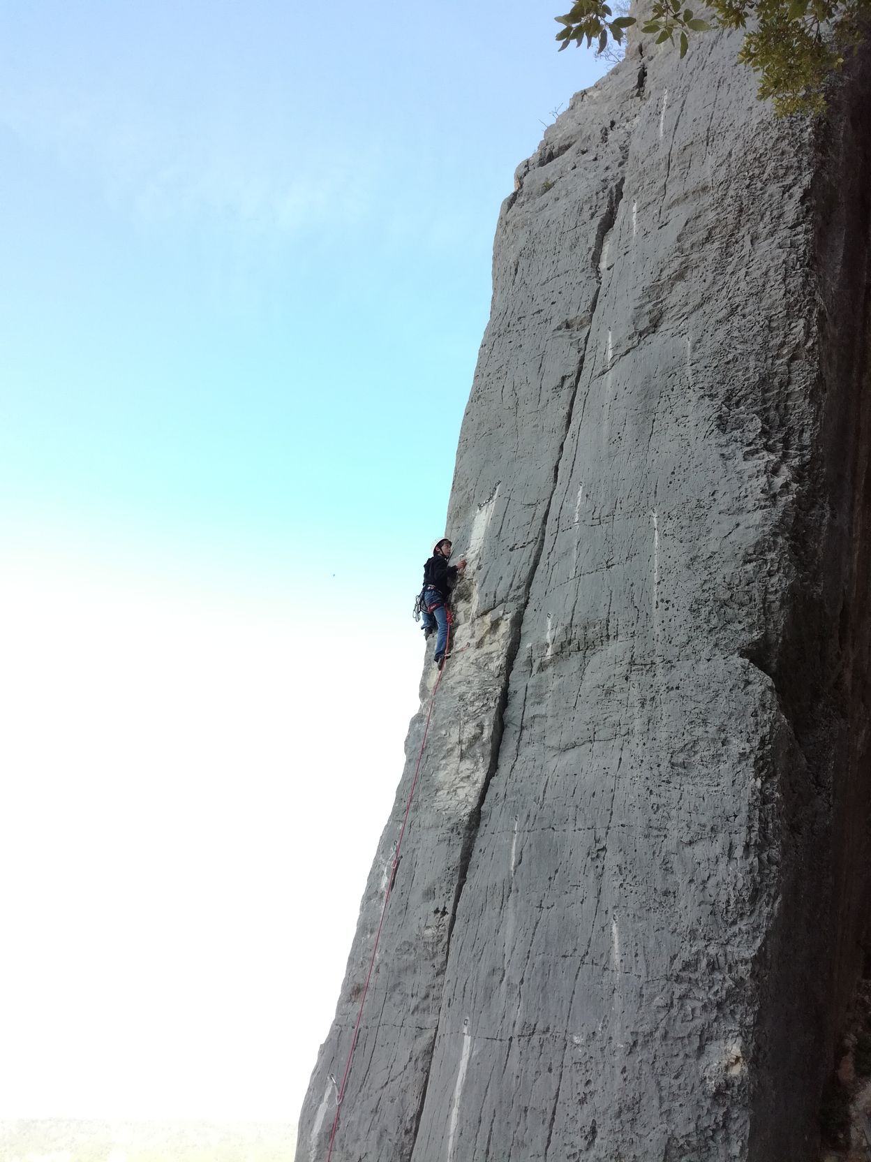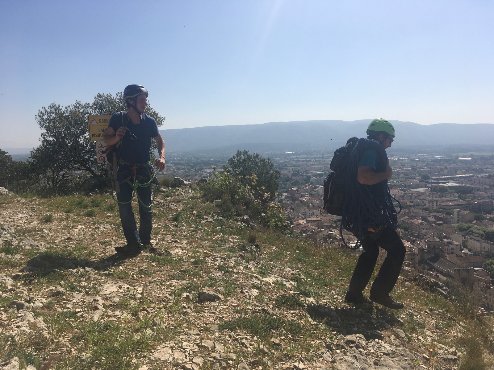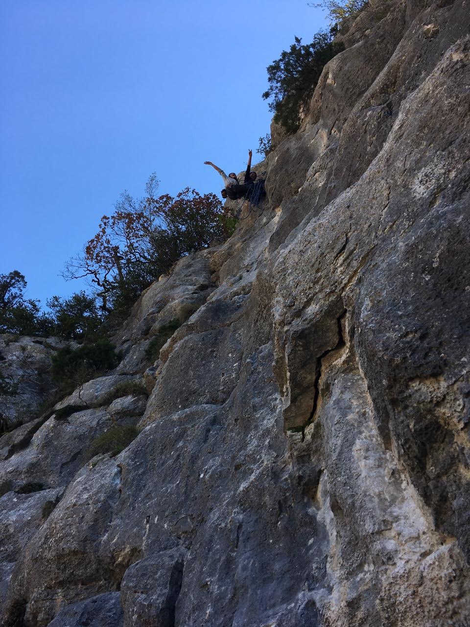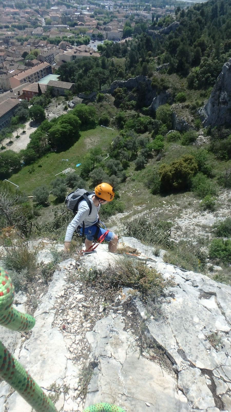 Aujourd’hui, nous grimpons aux Sallières, un site accessible depuis le haut en rappel (avec donc obligation de sortir les voies pour remonter le soir, histoire de mettre un peu la pression).