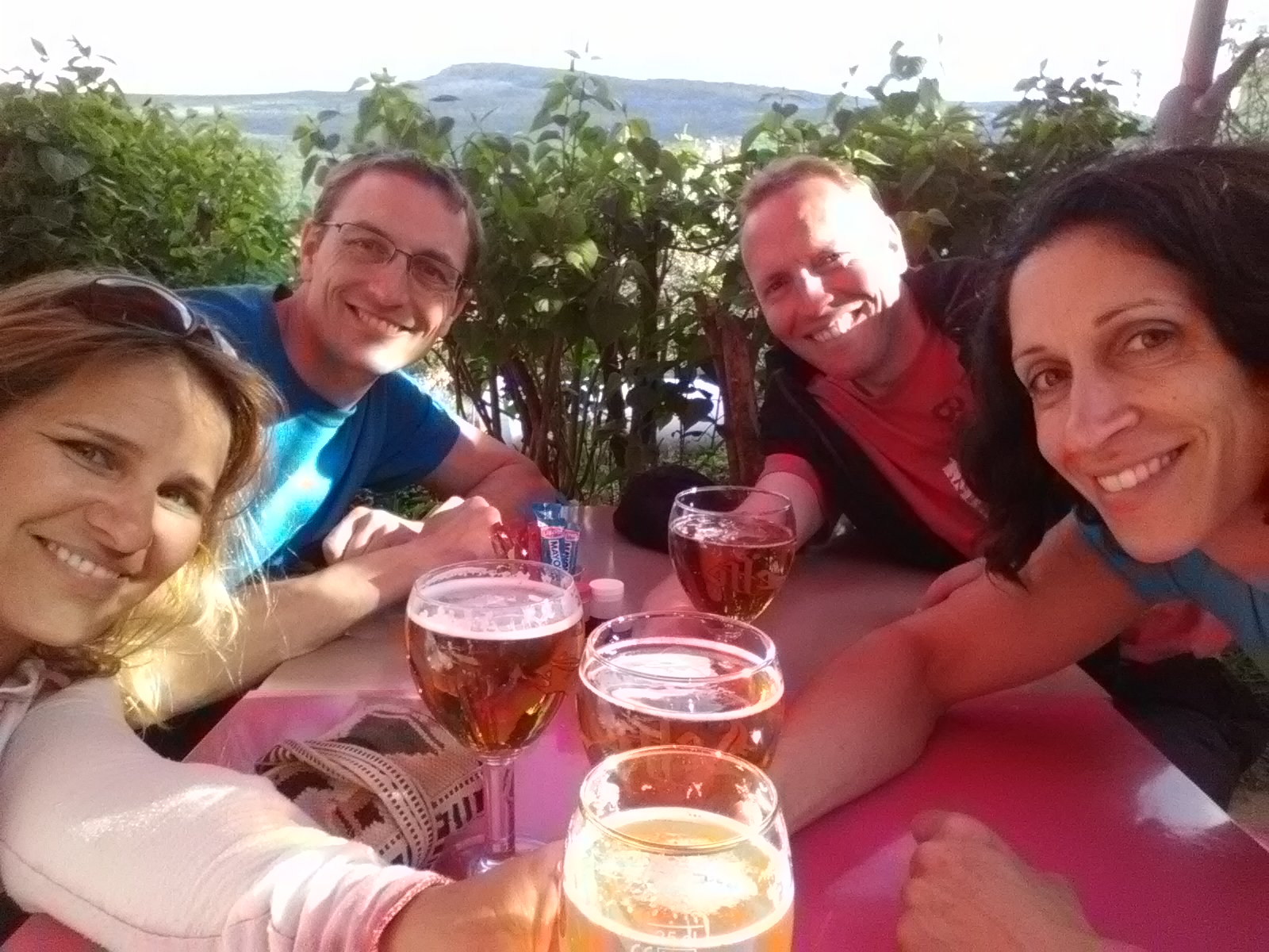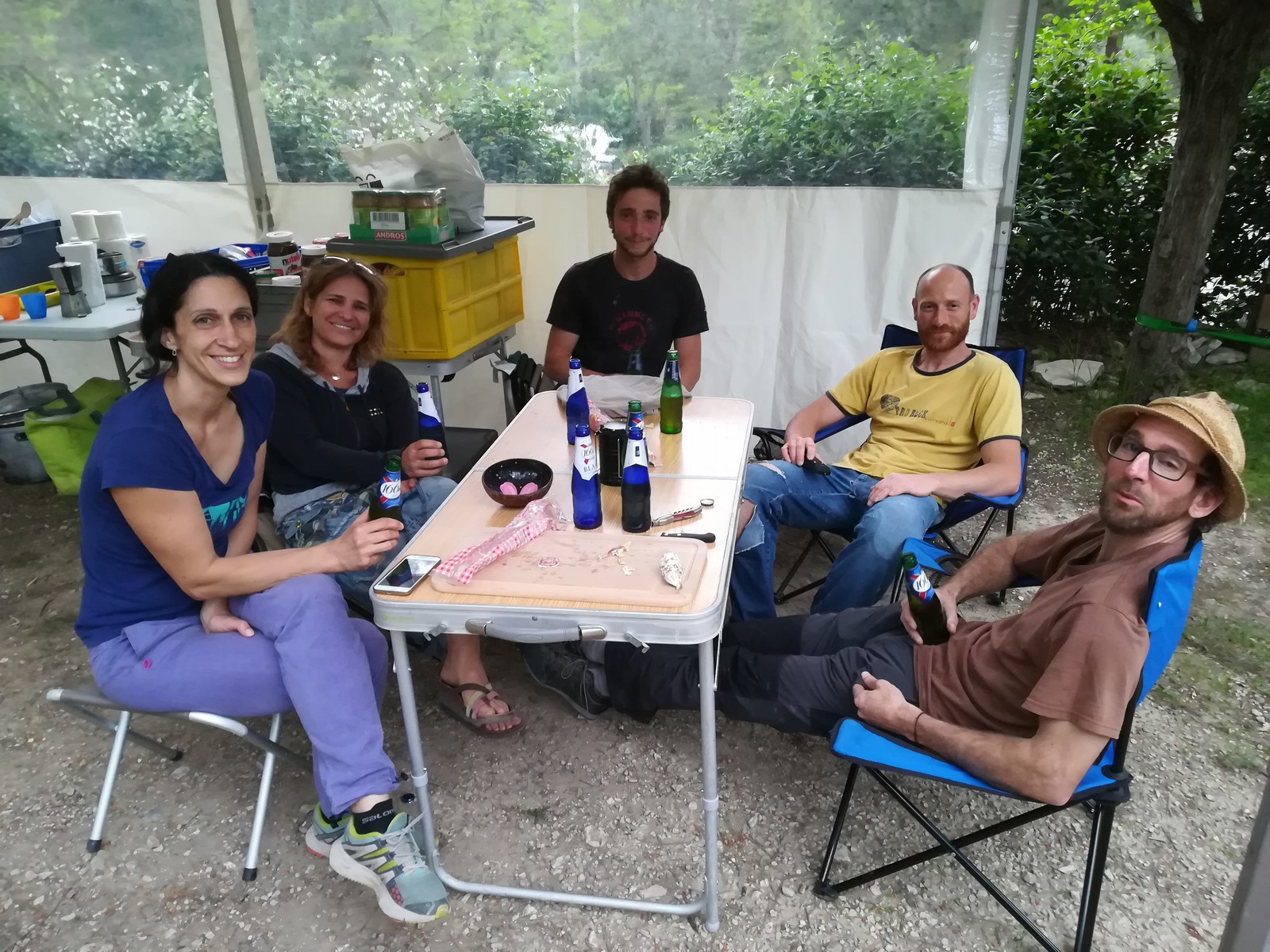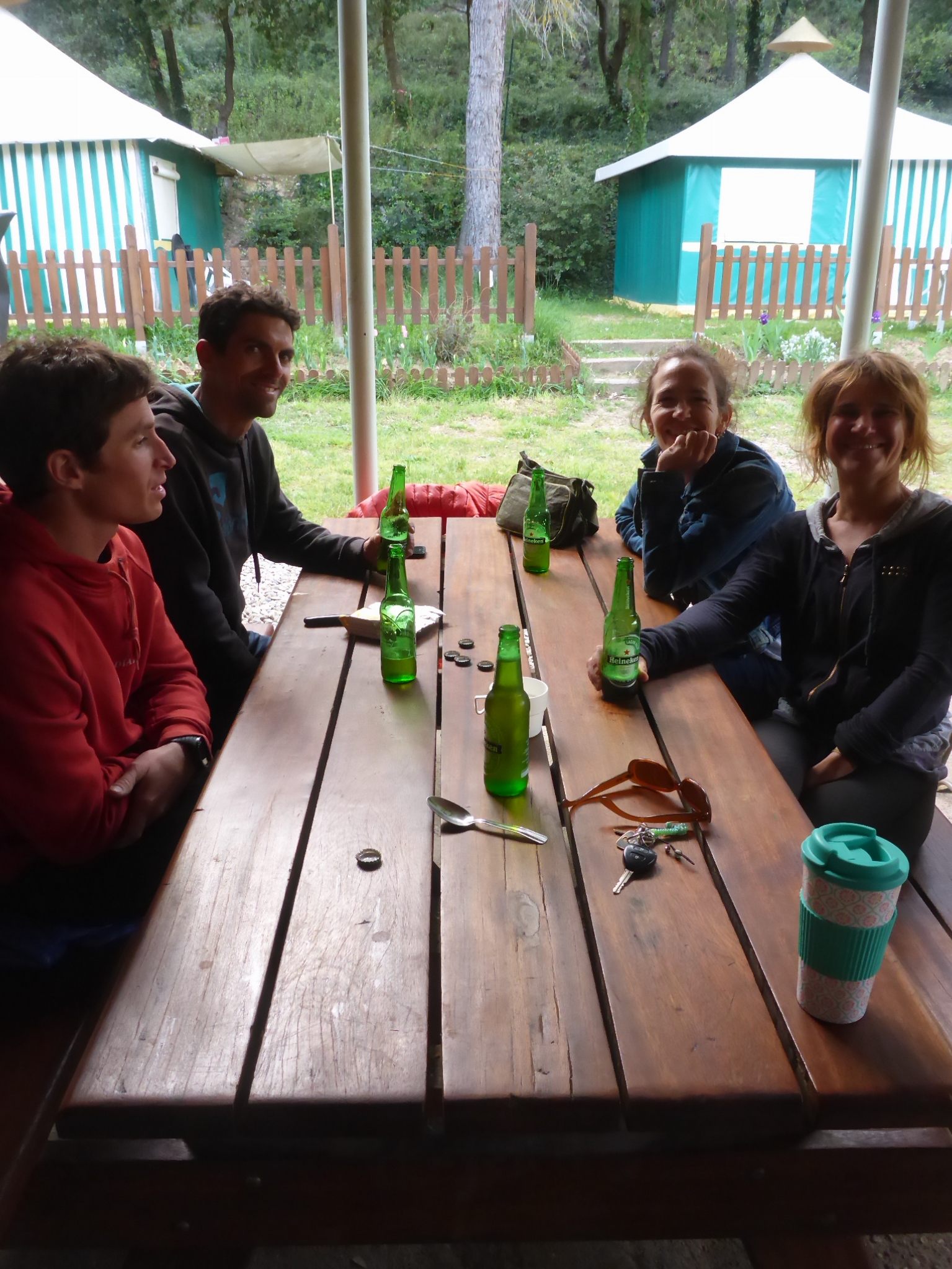 Une longue journée de repos épuisante s’achève et pendant que nos moniteurs préférés raccompagnent les jeunes au camping, les adultes au nombre désormais de quatre, prennent une pause bien méritée dans le célèbre village de grimpeurs de la Palud sur Verdon.