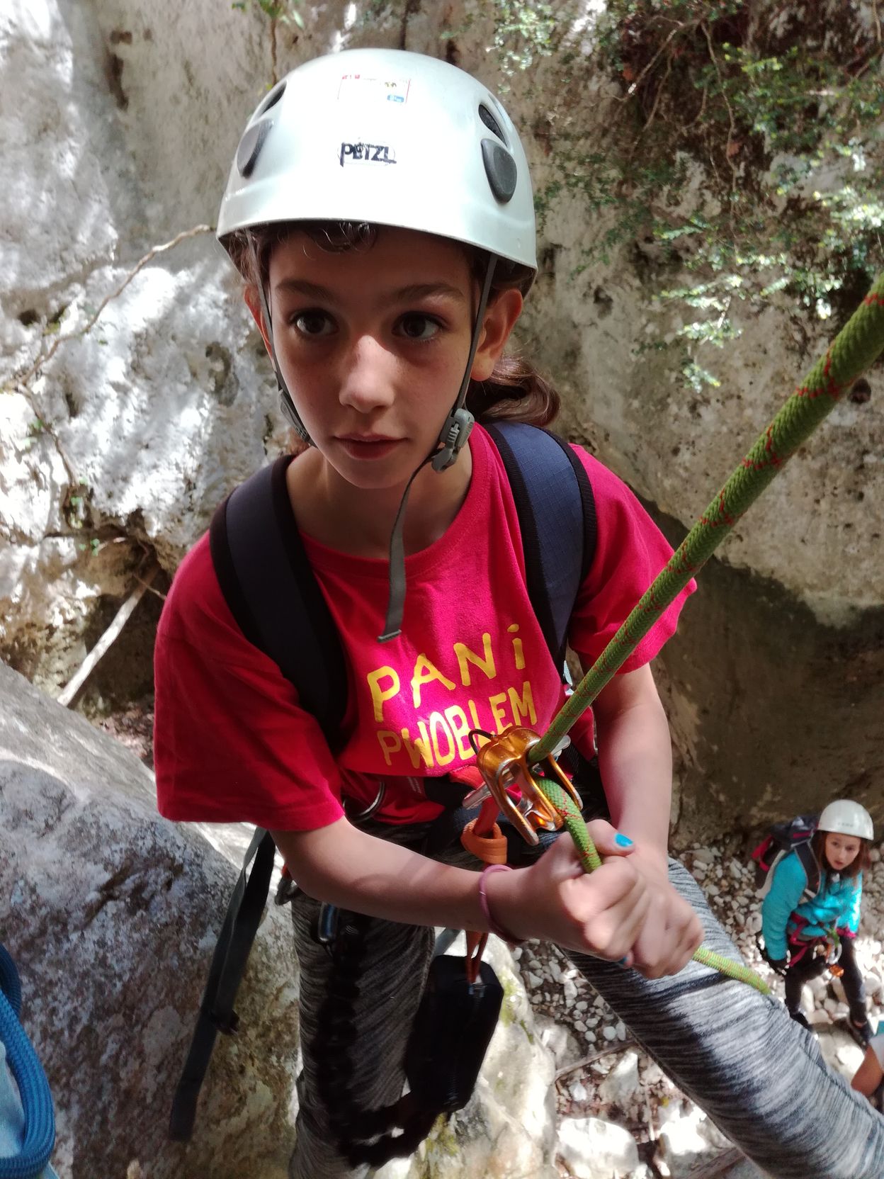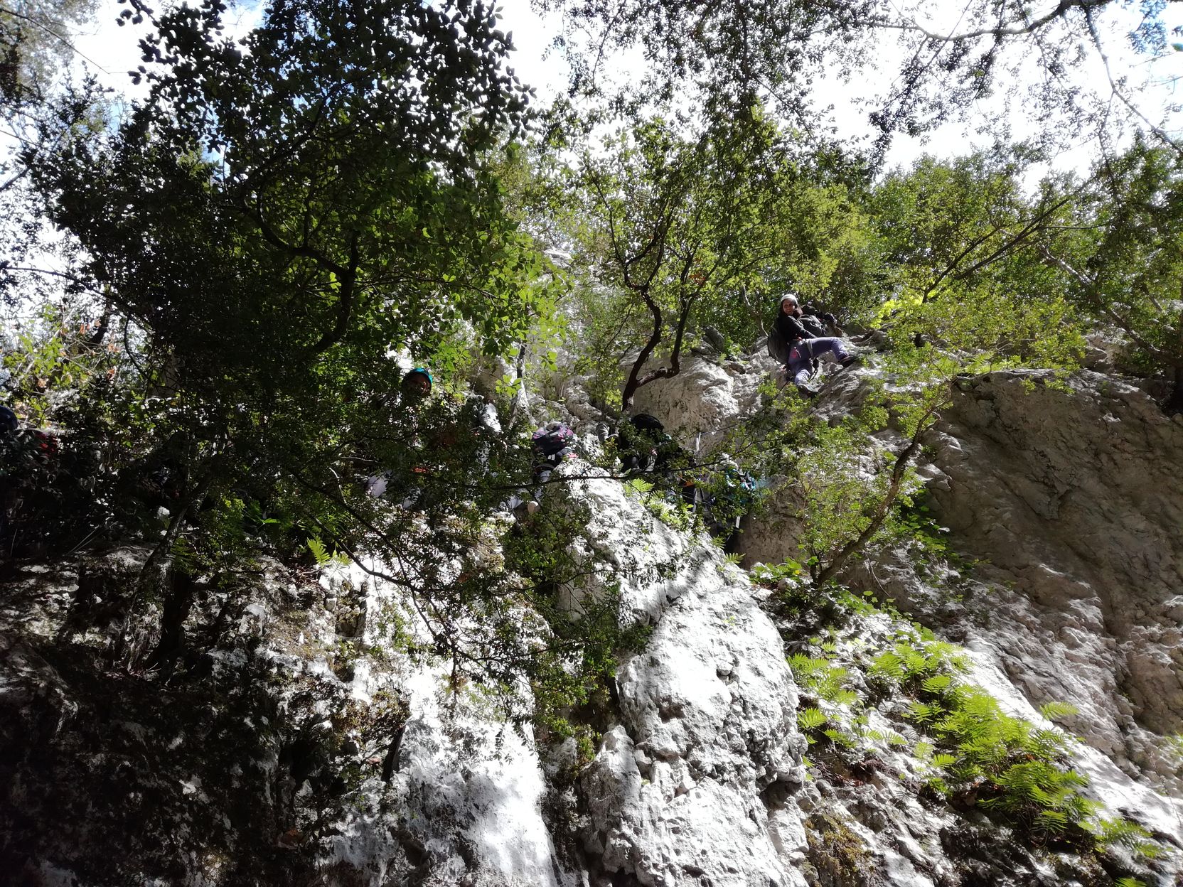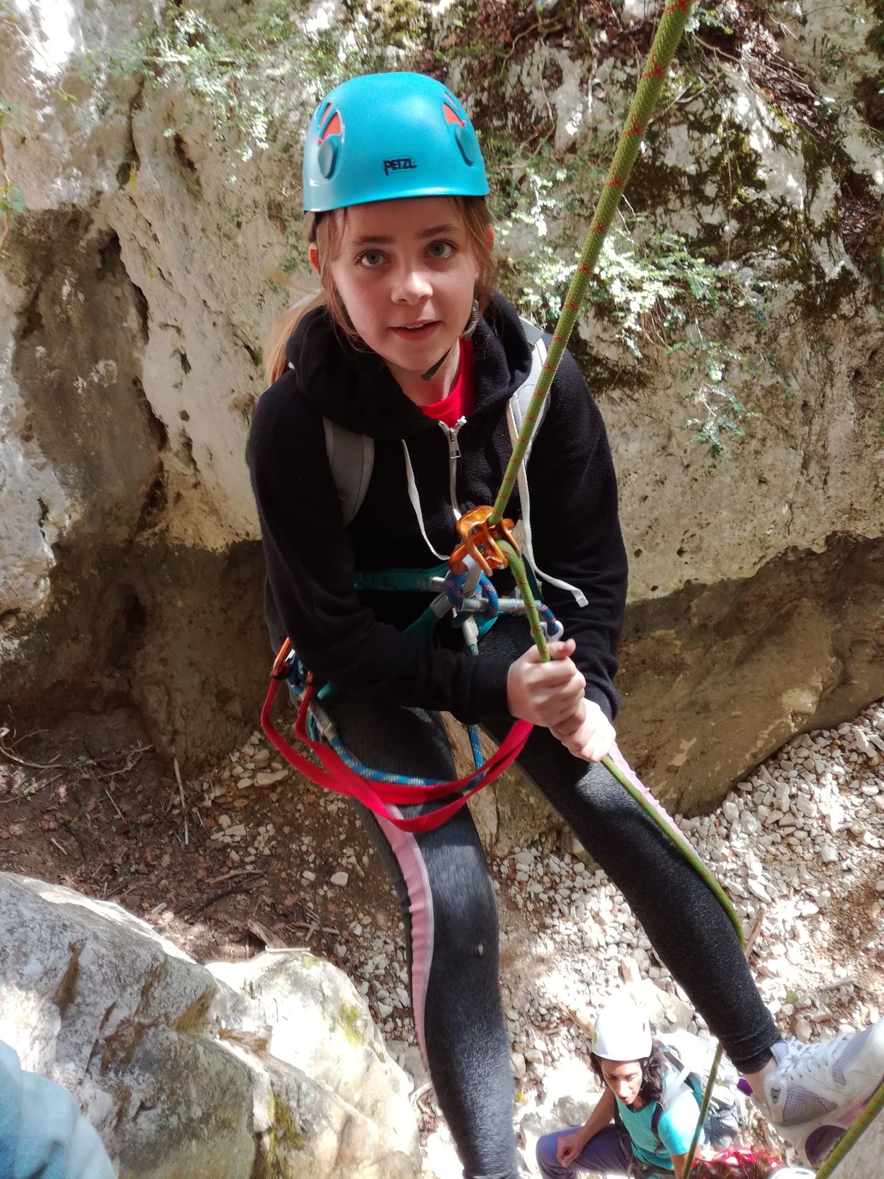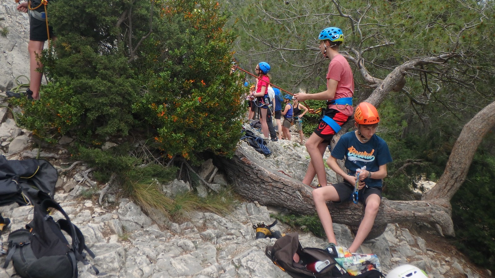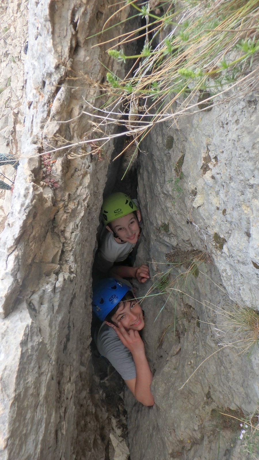 En ce milieu de semaine, les moniteurs avaient prévu une journée un peu plus tranquille pour faire un petit repos grimpe. Au programme un canyon sec : le ravin de Mainmorte. Oui, vous avez bien compris, il s’agit d’une descente de canyon mais sans eau qui coule, avec rappels, tyroliennes pour éviter les vasques stagnantes, marches et un peu de désescalade. C’est un superbe enchaînement de rappels dans d’incroyables resserrements qui nous attend. Nous nous déplaçons dans un décor magique, frais et humide à la recherche du soleil pour déjeuner.