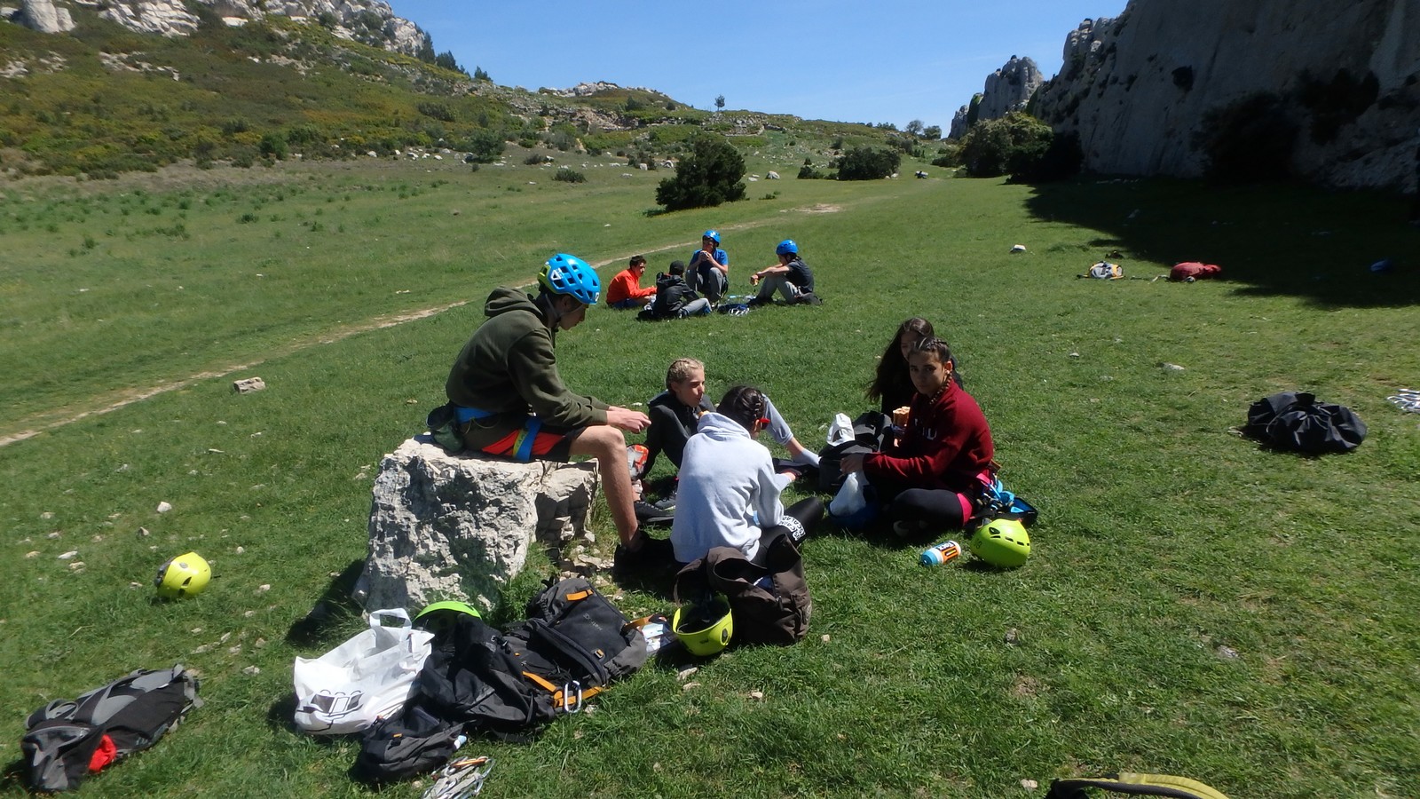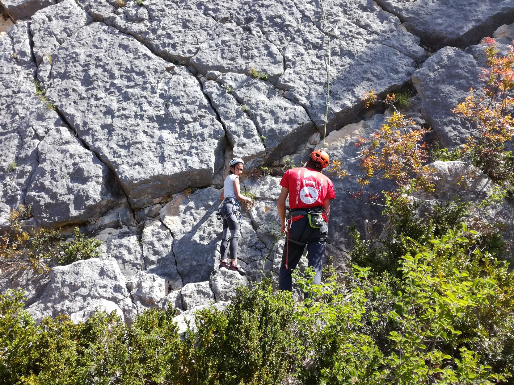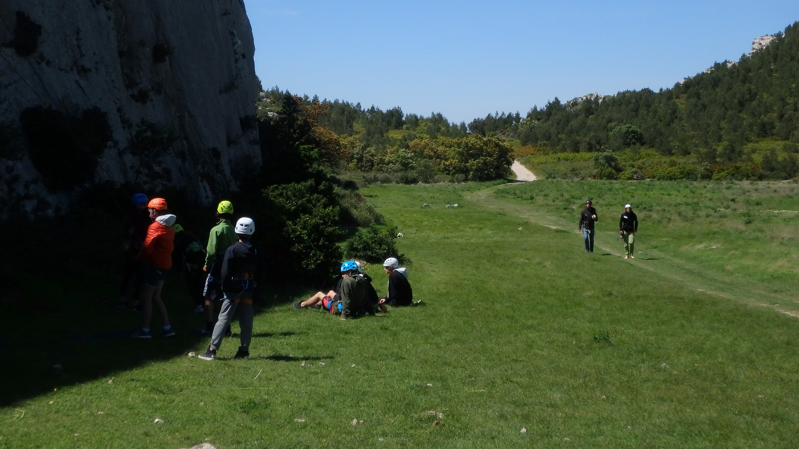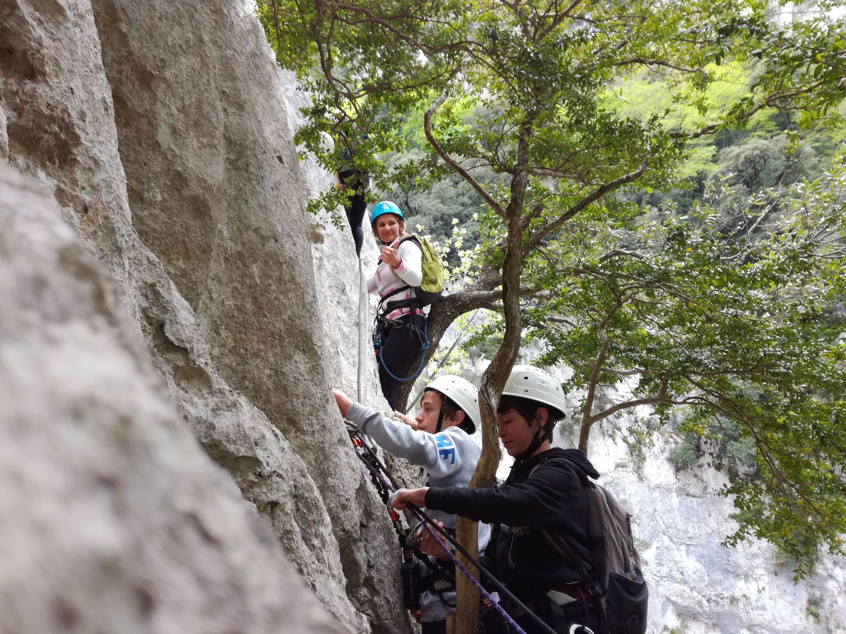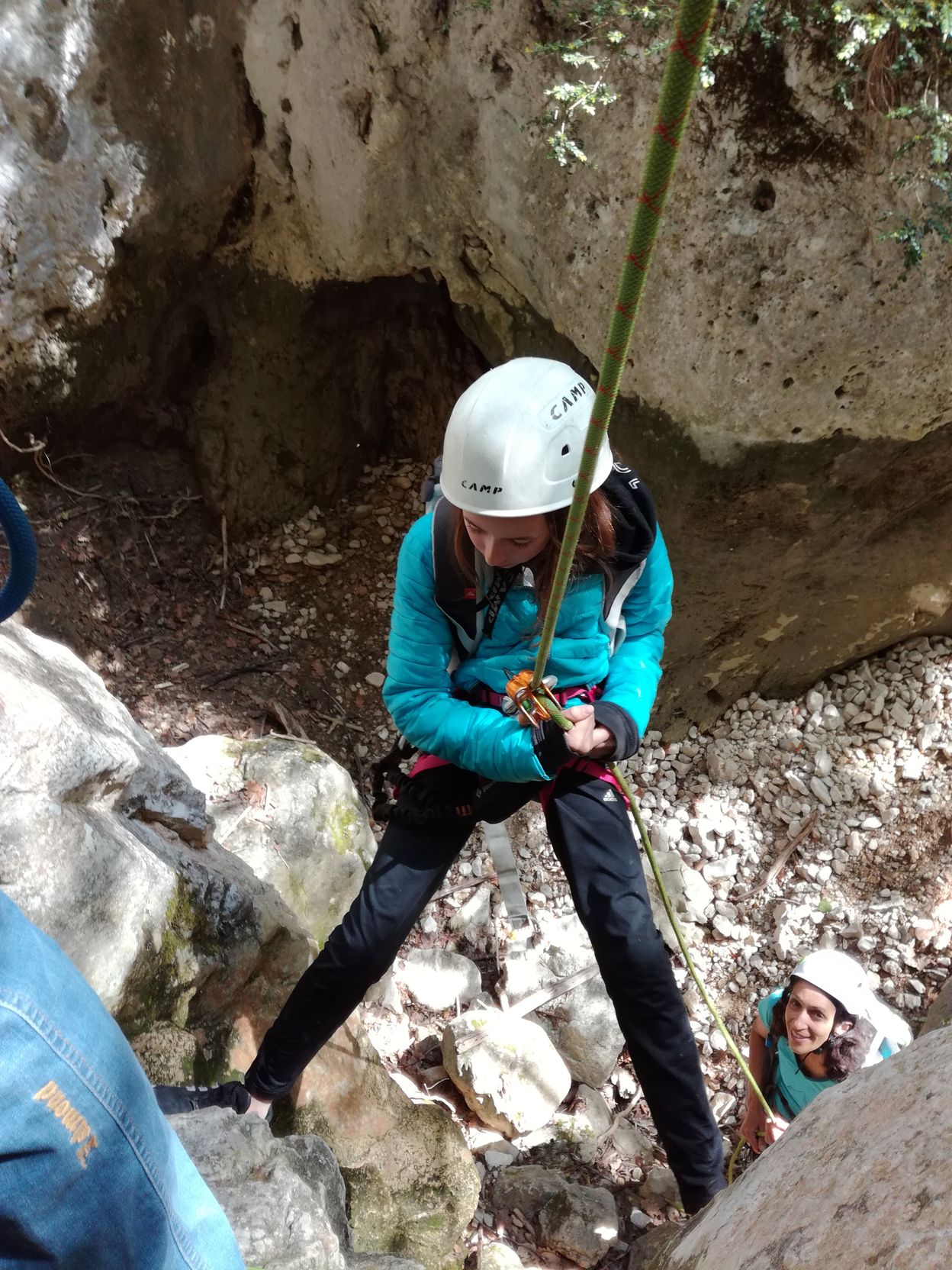 En ce milieu de semaine, les moniteurs avaient prévu une journée un peu plus tranquille pour faire un petit repos grimpe. Au programme un canyon sec : le ravin de Mainmorte. Oui, vous avez bien compris, il s’agit d’une descente de canyon mais sans eau qui coule, avec rappels, tyroliennes pour éviter les vasques stagnantes, marches et un peu de désescalade. C’est un superbe enchaînement de rappels dans d’incroyables resserrements qui nous attend. Nous nous déplaçons dans un décor magique, frais et humide à la recherche du soleil pour déjeuner.