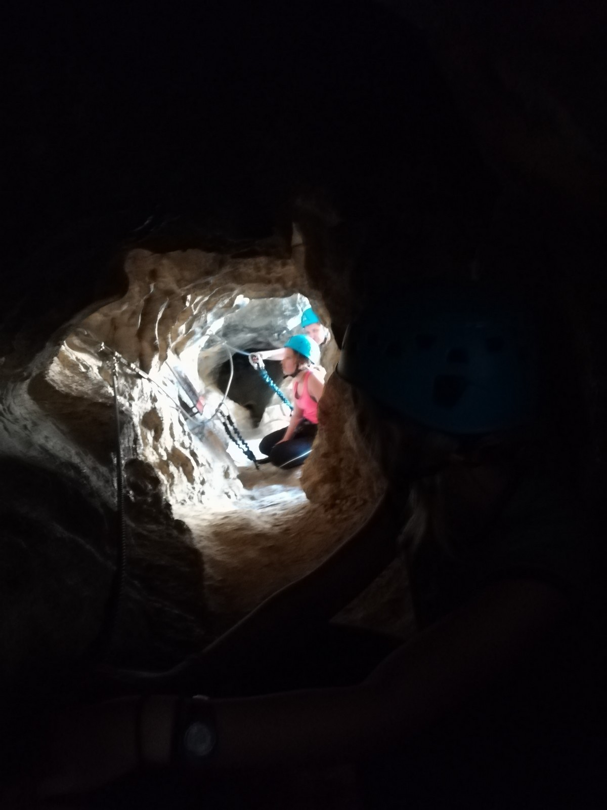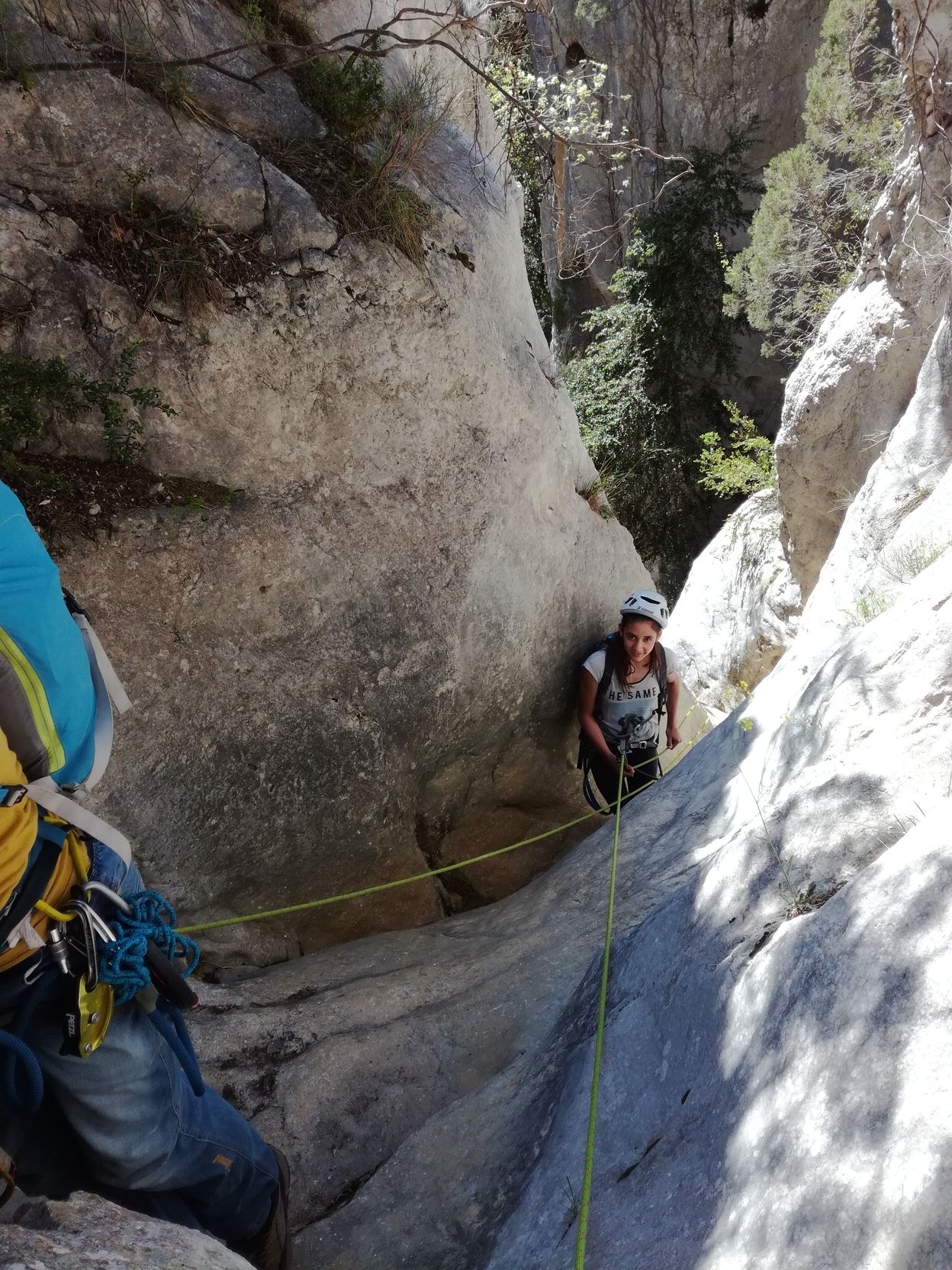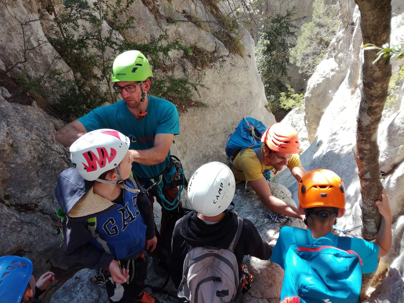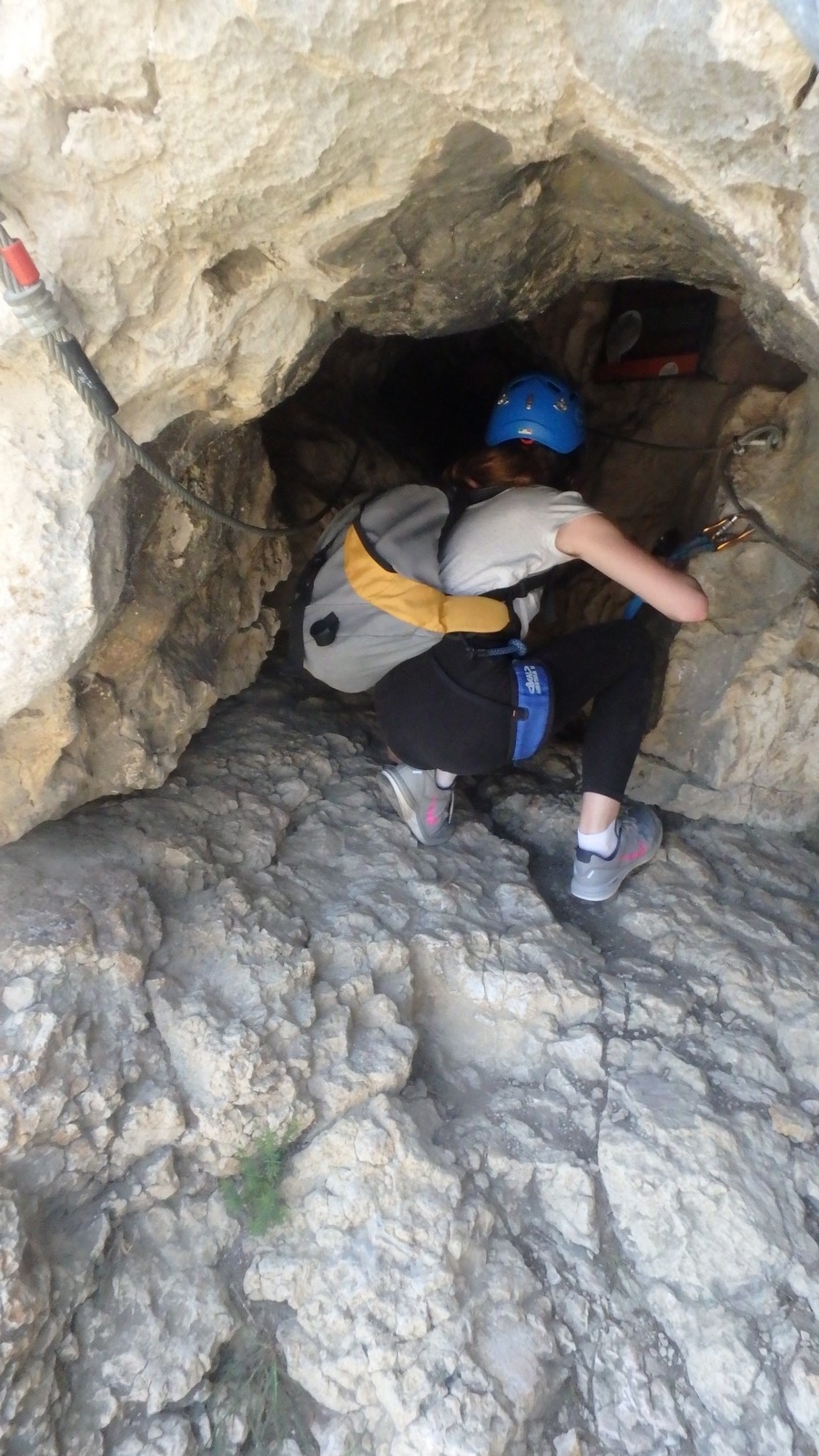 En ce milieu de semaine, les moniteurs avaient prévu une journée un peu plus tranquille pour faire un petit repos grimpe. Au programme un canyon sec : le ravin de Mainmorte. Oui, vous avez bien compris, il s’agit d’une descente de canyon mais sans eau qui coule, avec rappels, tyroliennes pour éviter les vasques stagnantes, marches et un peu de désescalade. C’est un superbe enchaînement de rappels dans d’incroyables resserrements qui nous attend. Nous nous déplaçons dans un décor magique, frais et humide à la recherche du soleil pour déjeuner.