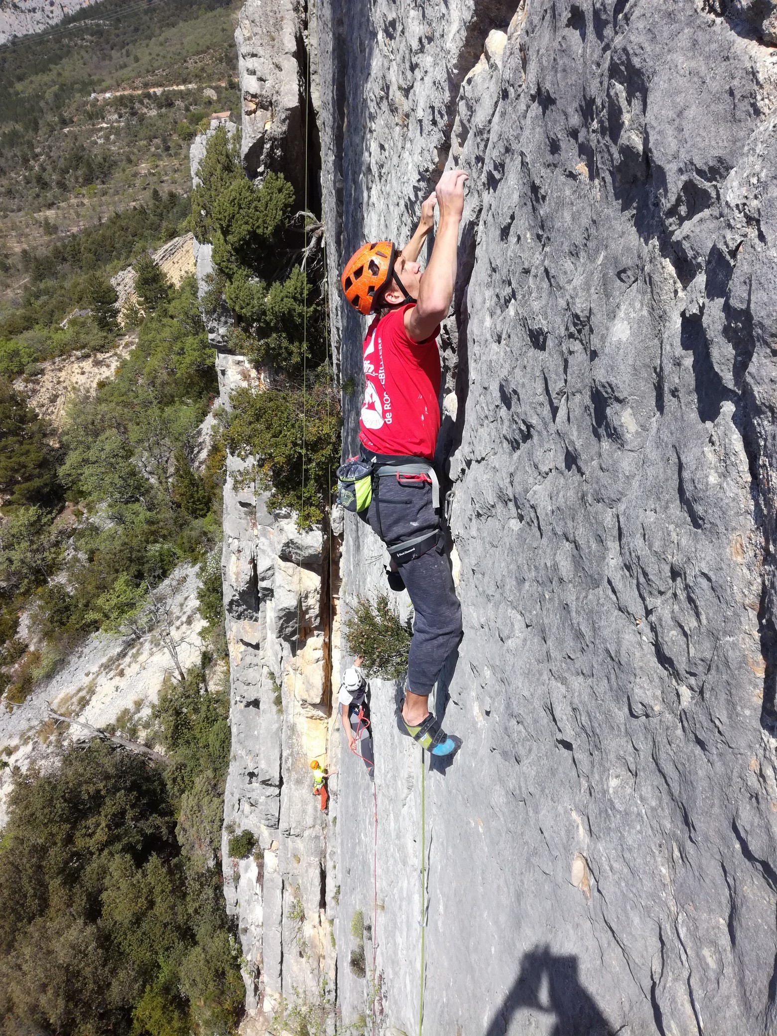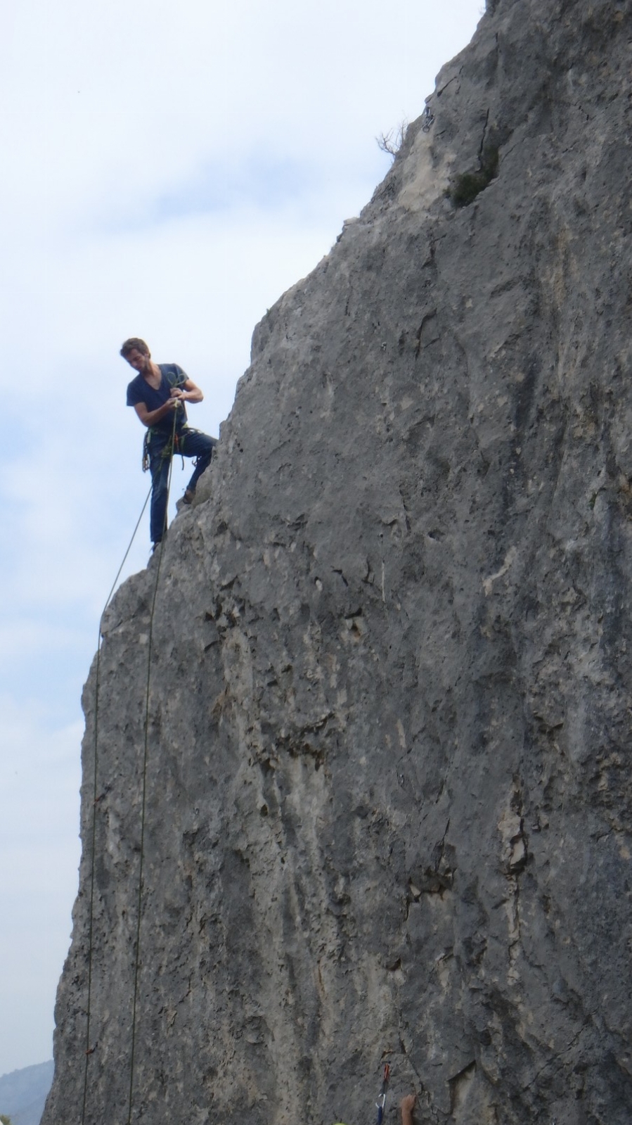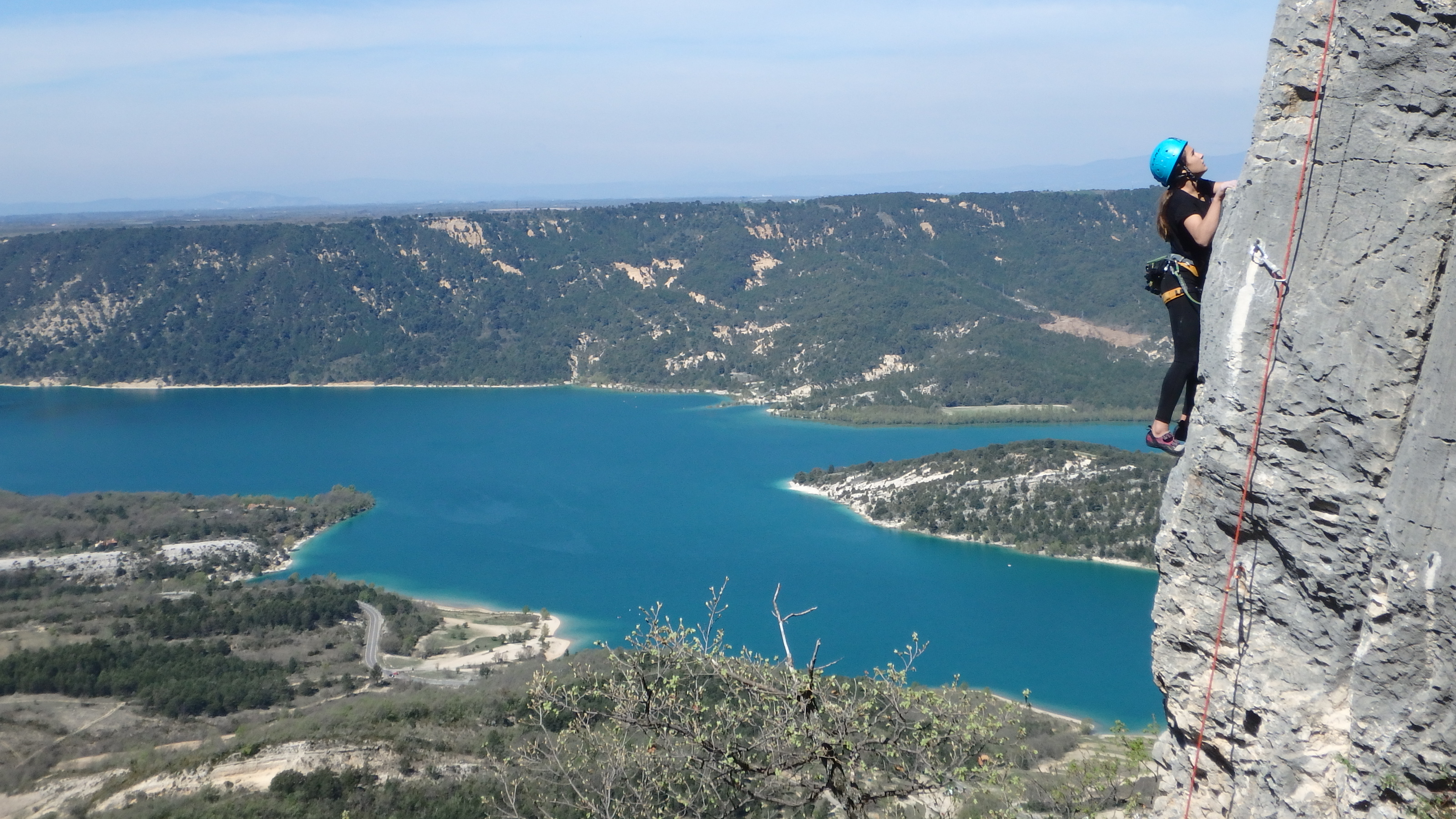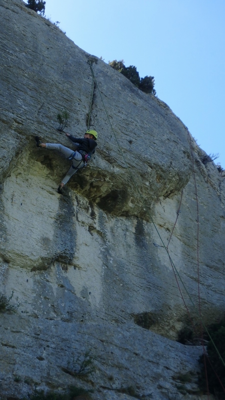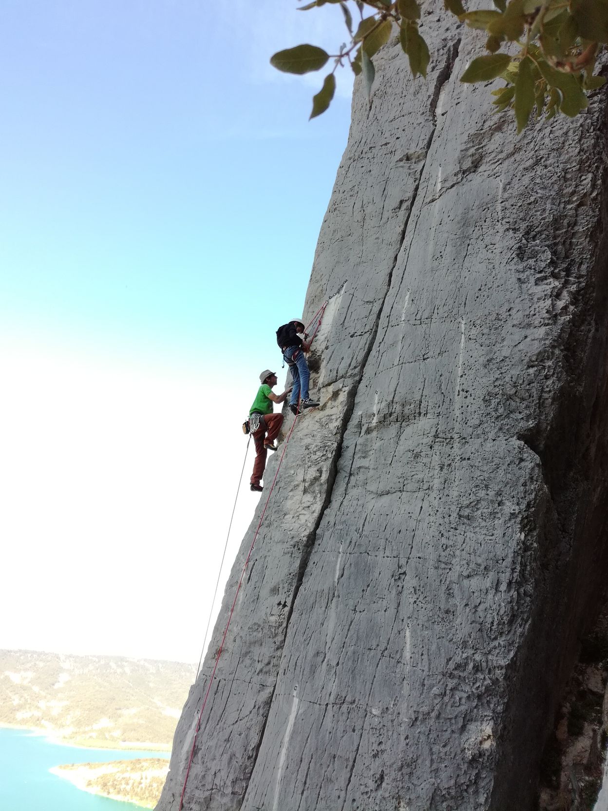 Mardi matin, nous sommes allés au site des Hauts Vernis, pratique car accessible depuis le haut du camping. Après une bonne demi-heure de marche d’approche plutôt raide dans laquelle on a failli perdre Adrien, nous arrivons au pied d’un très beau secteur de longues dalles grises côtées entre 5a et 7b+. Roche agréable, ombre pour le moment, et vue imprenable sur le lac de Sainte Croix !