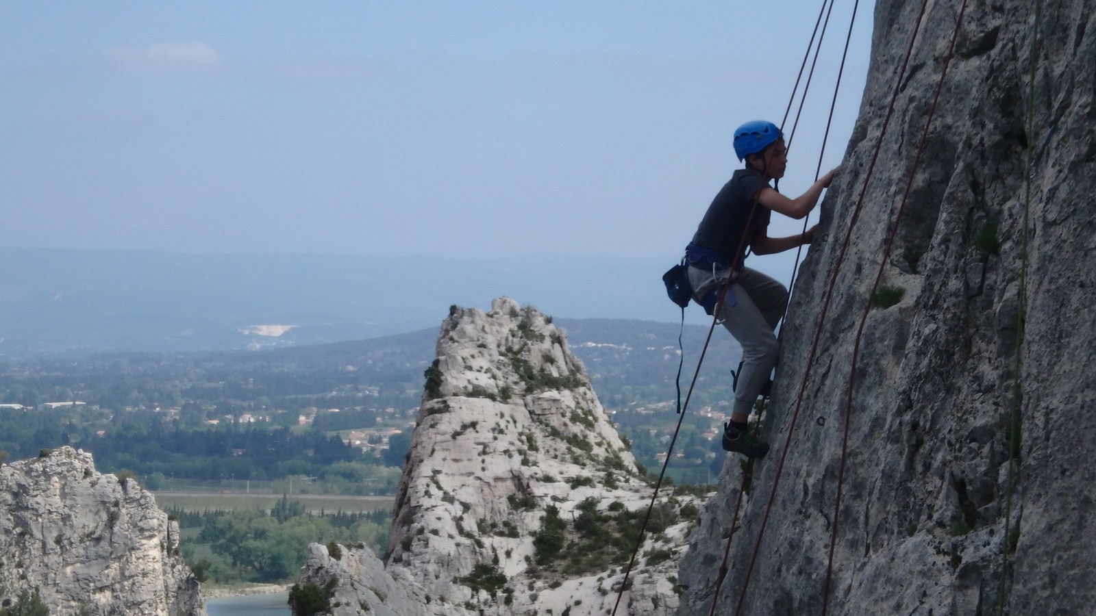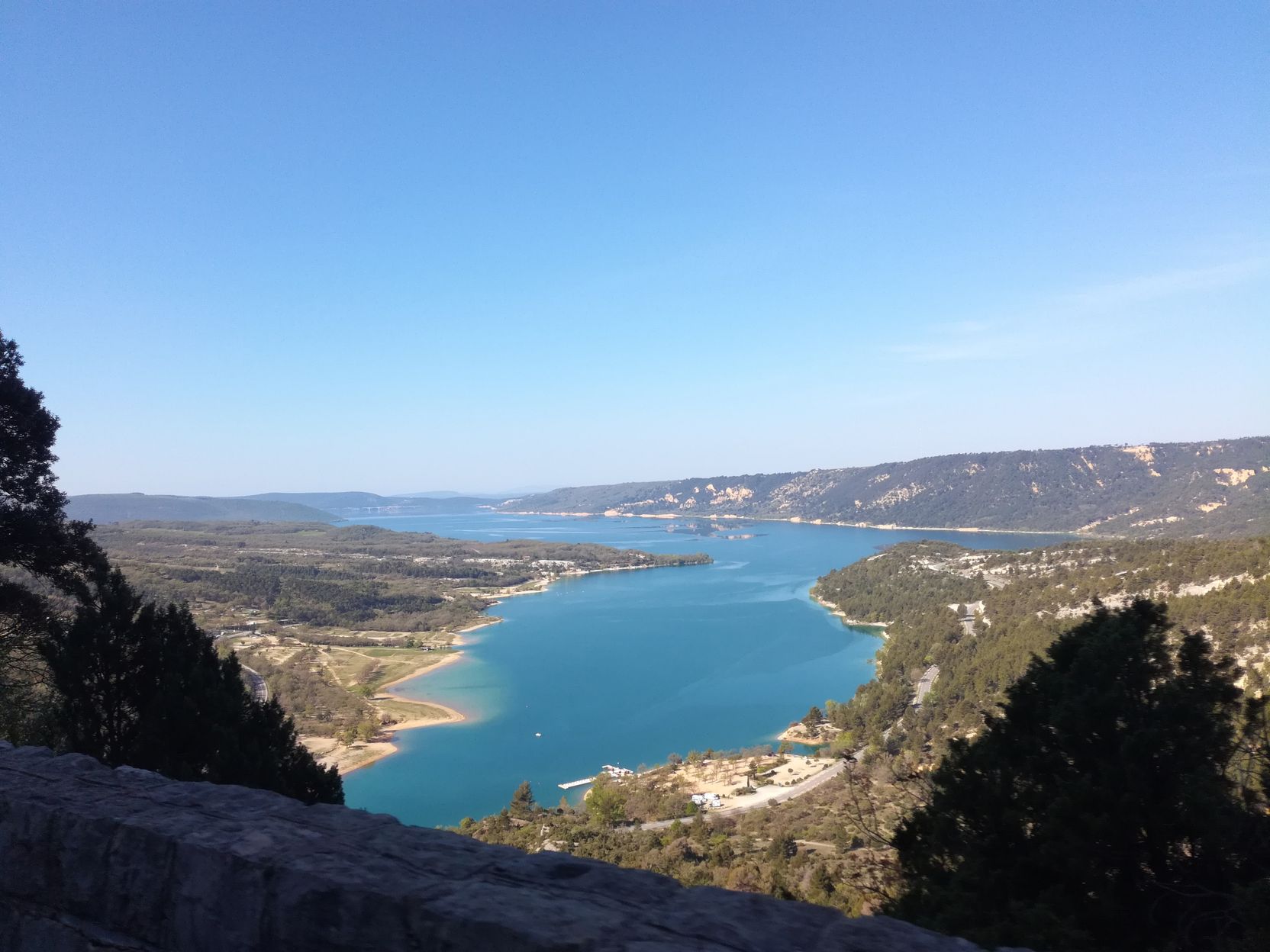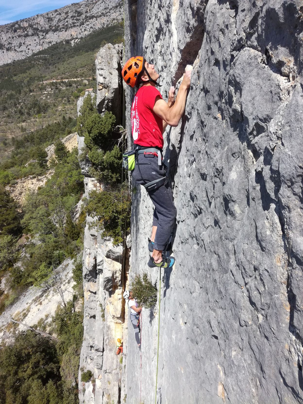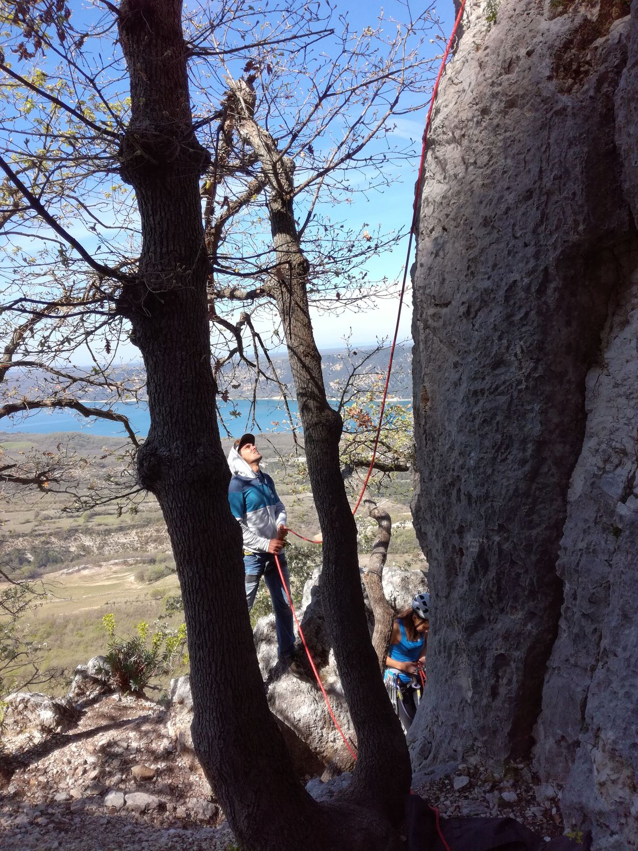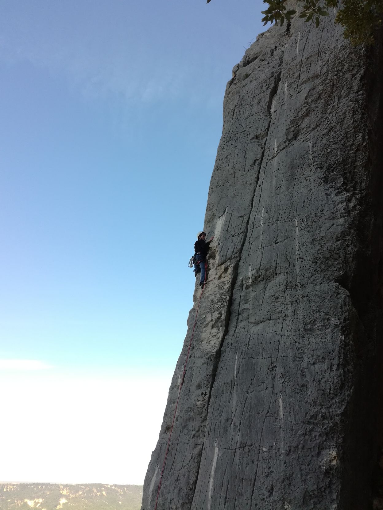 Mardi matin, nous sommes allés au site des Hauts Vernis, pratique car accessible depuis le haut du camping. Après une bonne demi-heure de marche d’approche plutôt raide dans laquelle on a failli perdre Adrien, nous arrivons au pied d’un très beau secteur de longues dalles grises côtées entre 5a et 7b+. Roche agréable, ombre pour le moment, et vue imprenable sur le lac de Sainte Croix !