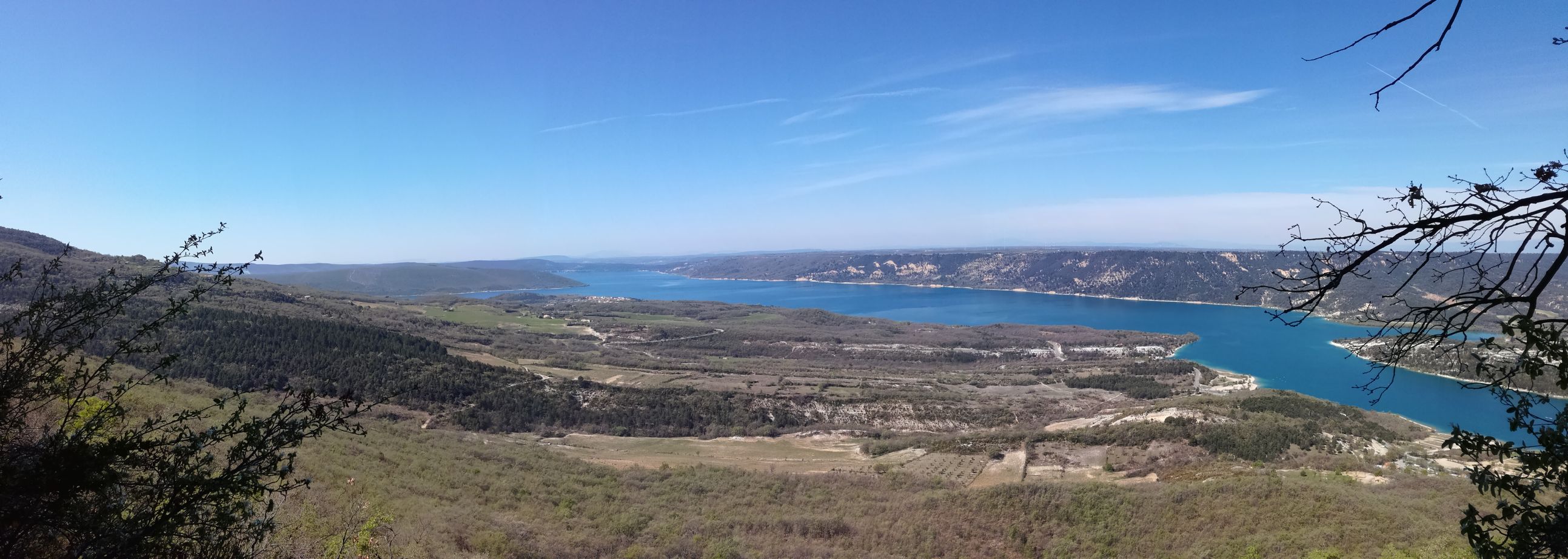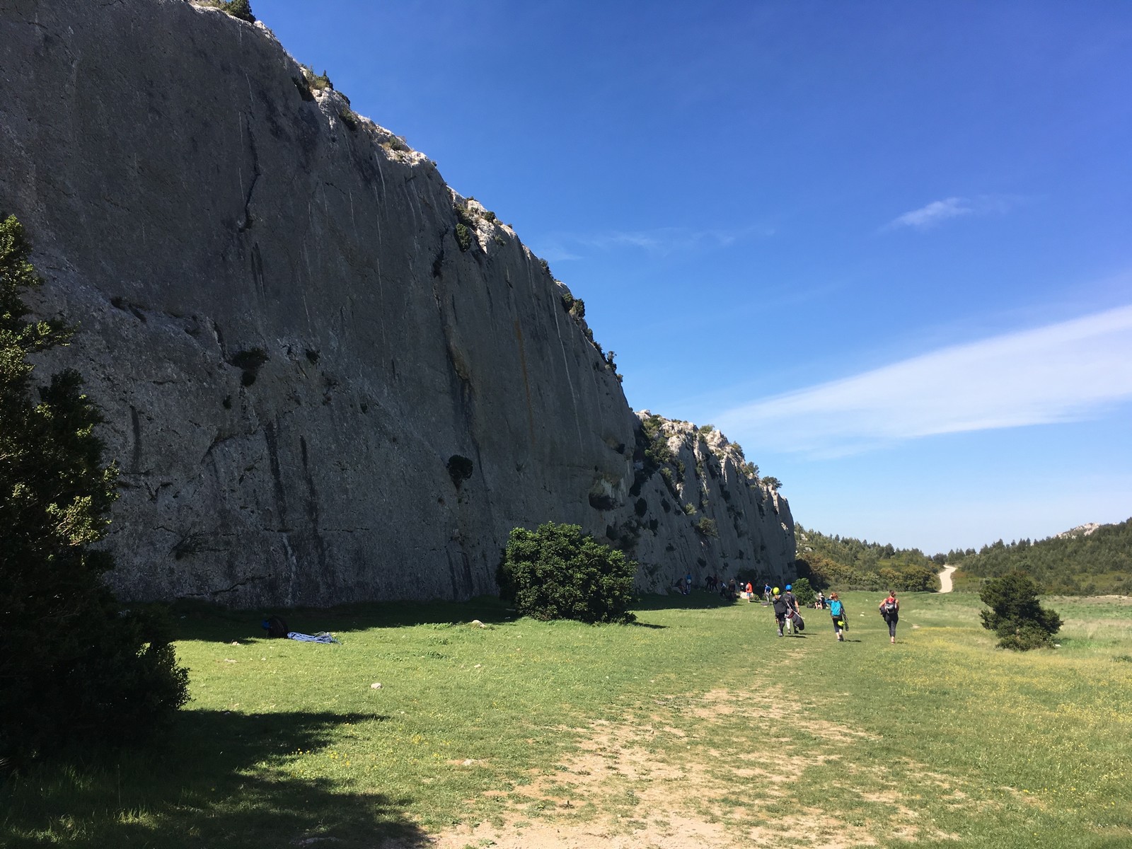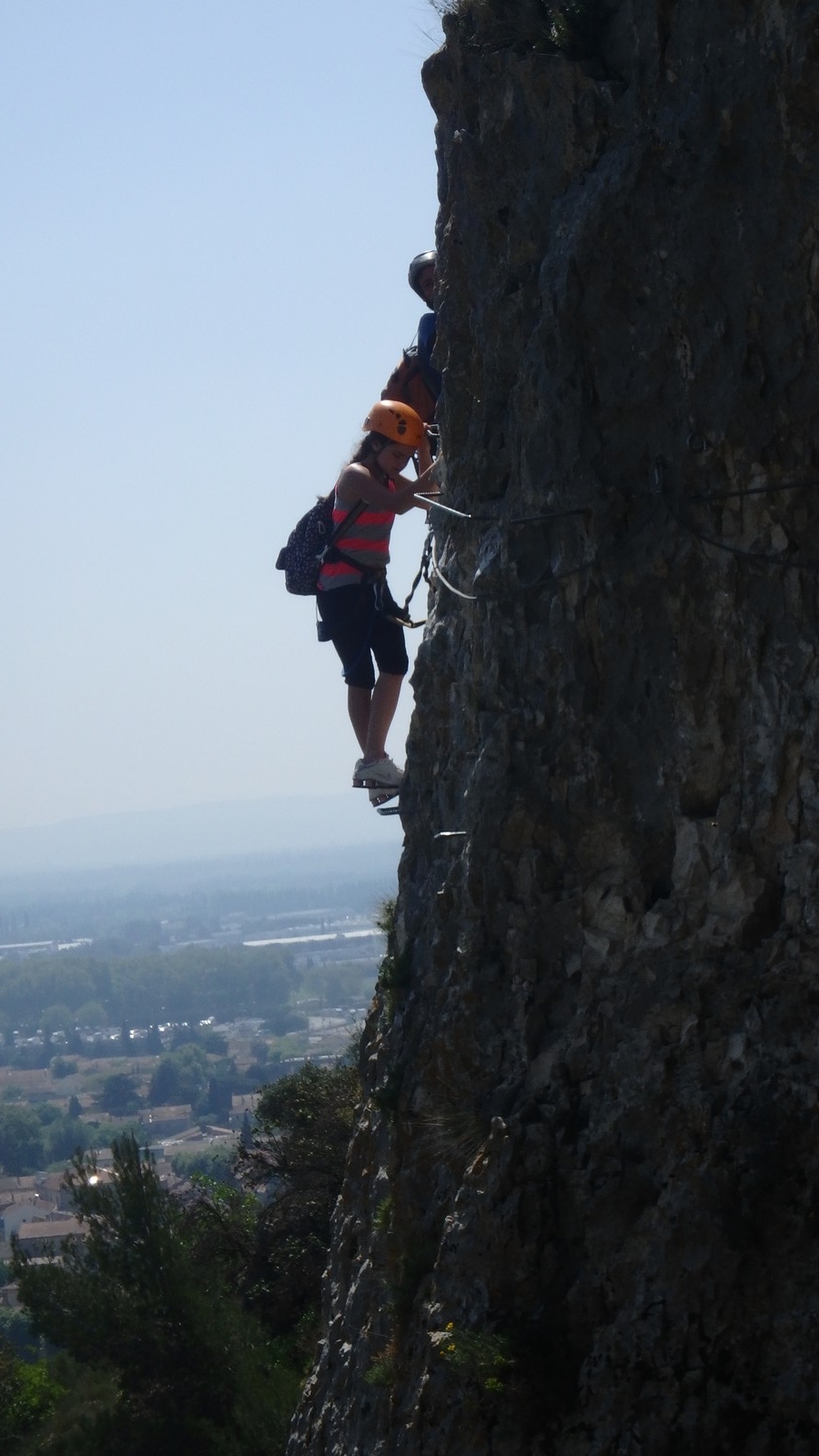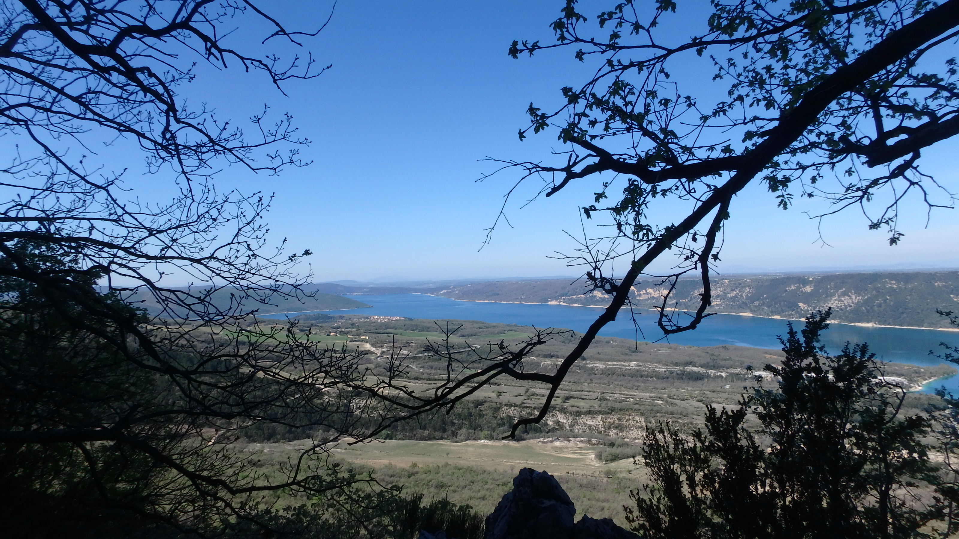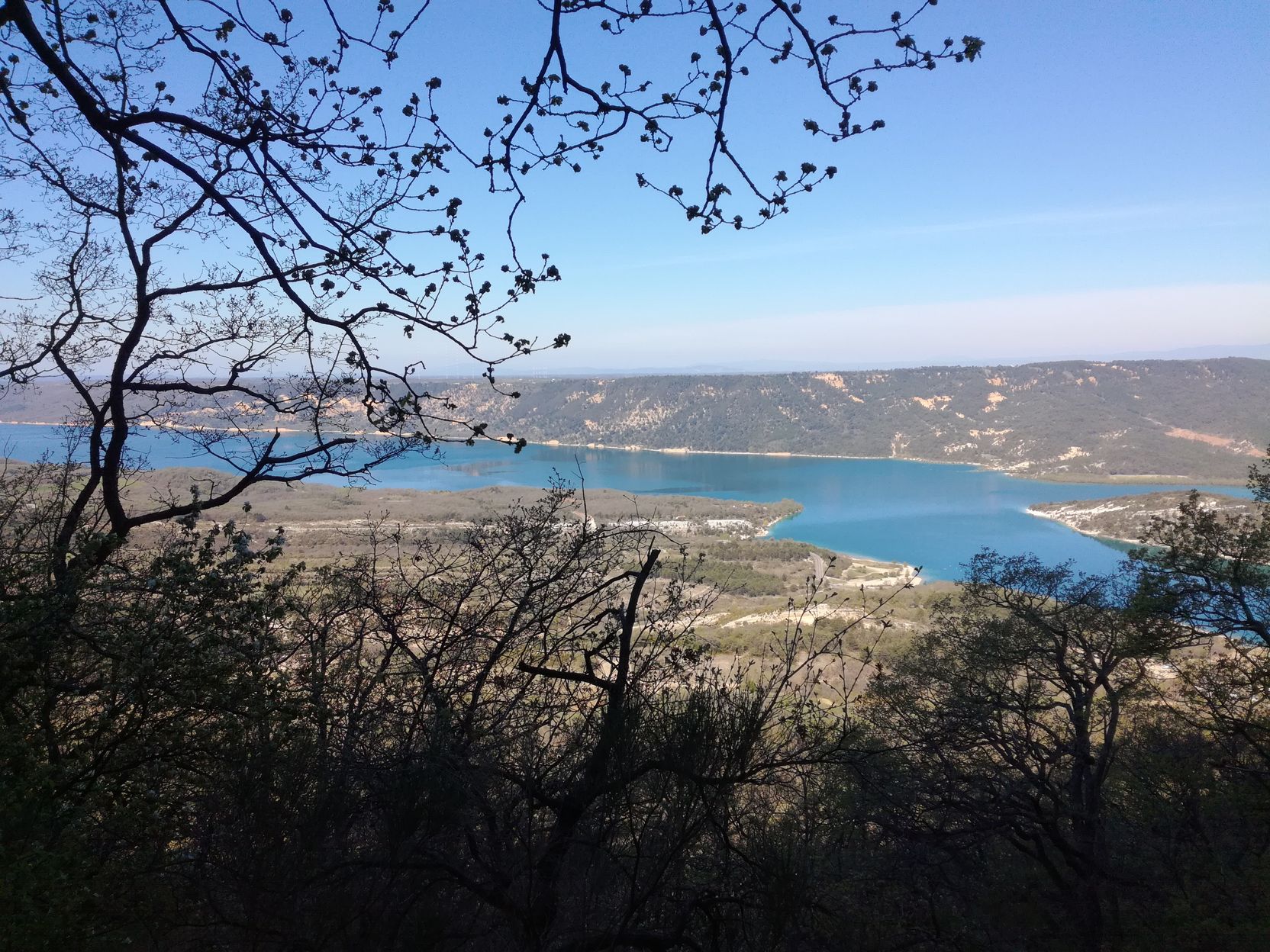 Mardi matin, nous sommes allés au site des Hauts Vernis, pratique car accessible depuis le haut du camping. Après une bonne demi-heure de marche d’approche plutôt raide dans laquelle on a failli perdre Adrien, nous arrivons au pied d’un très beau secteur de longues dalles grises côtées entre 5a et 7b+. Roche agréable, ombre pour le moment, et vue imprenable sur le lac de Sainte Croix !