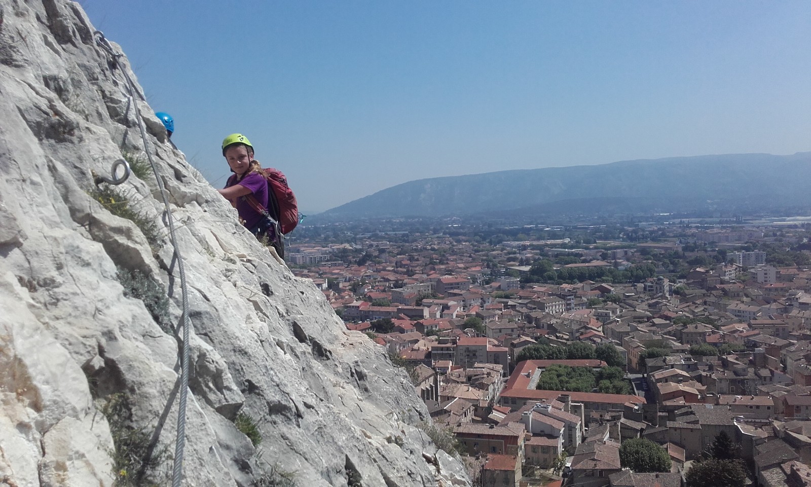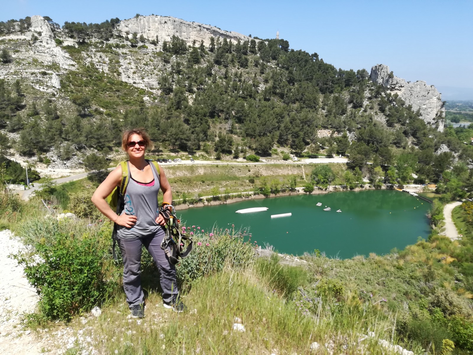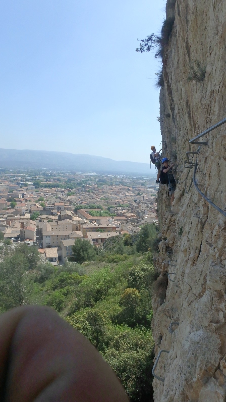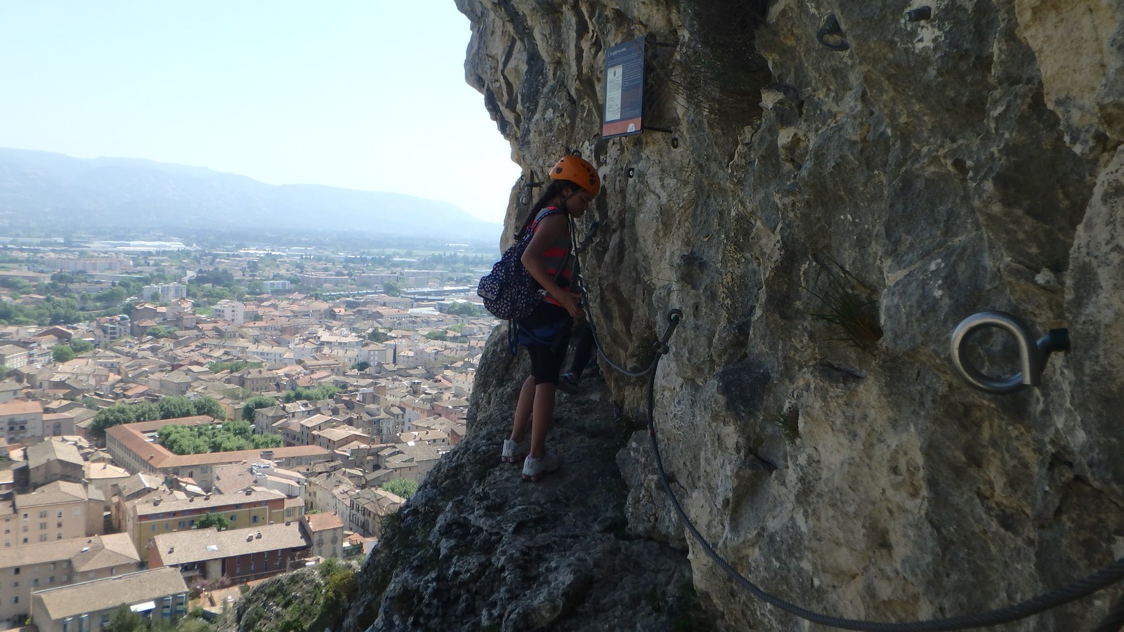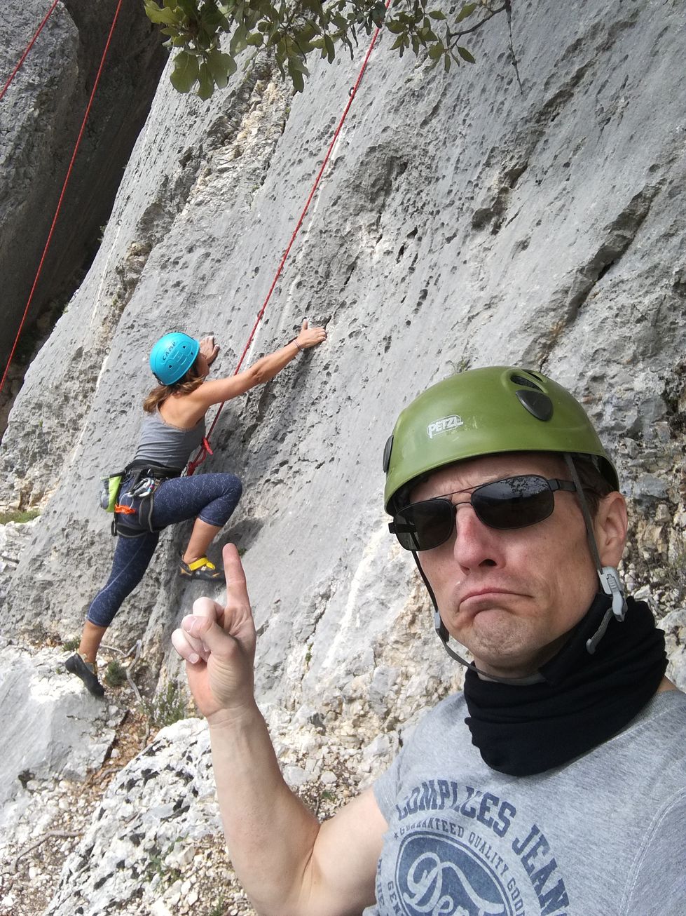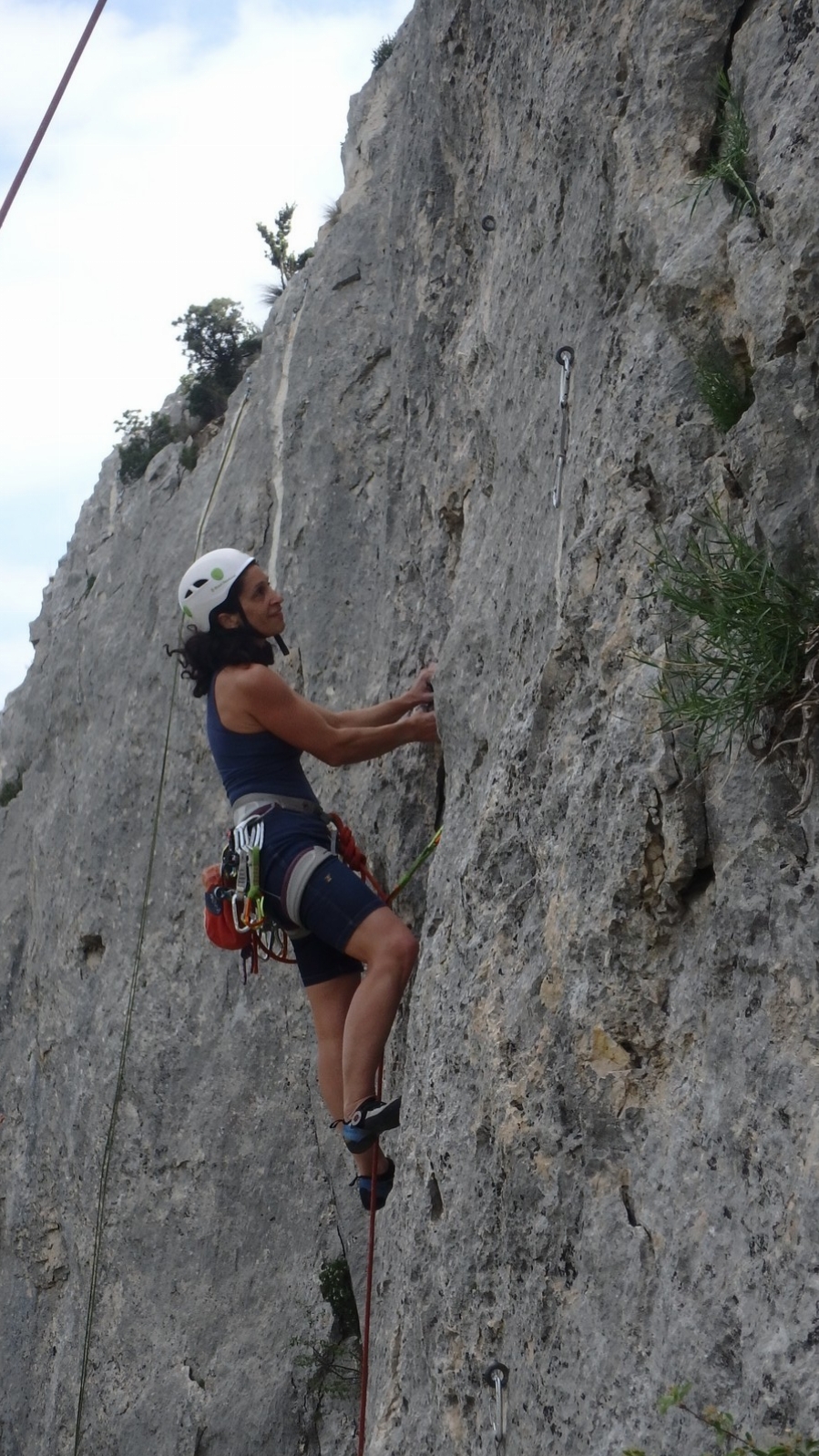 Mardi matin, nous sommes allés au site des Hauts Vernis, pratique car accessible depuis le haut du camping. Après une bonne demi-heure de marche d’approche plutôt raide dans laquelle on a failli perdre Adrien, nous arrivons au pied d’un très beau secteur de longues dalles grises côtées entre 5a et 7b+. Roche agréable, ombre pour le moment, et vue imprenable sur le lac de Sainte Croix !
