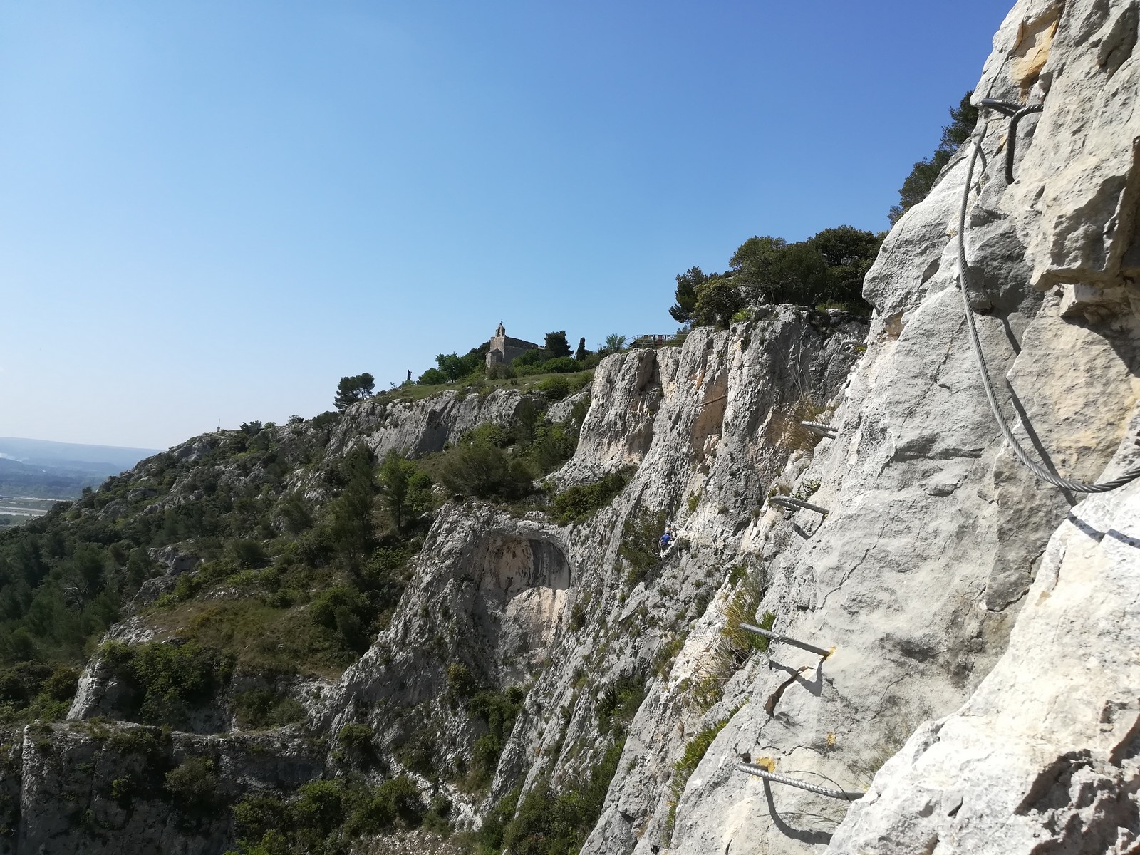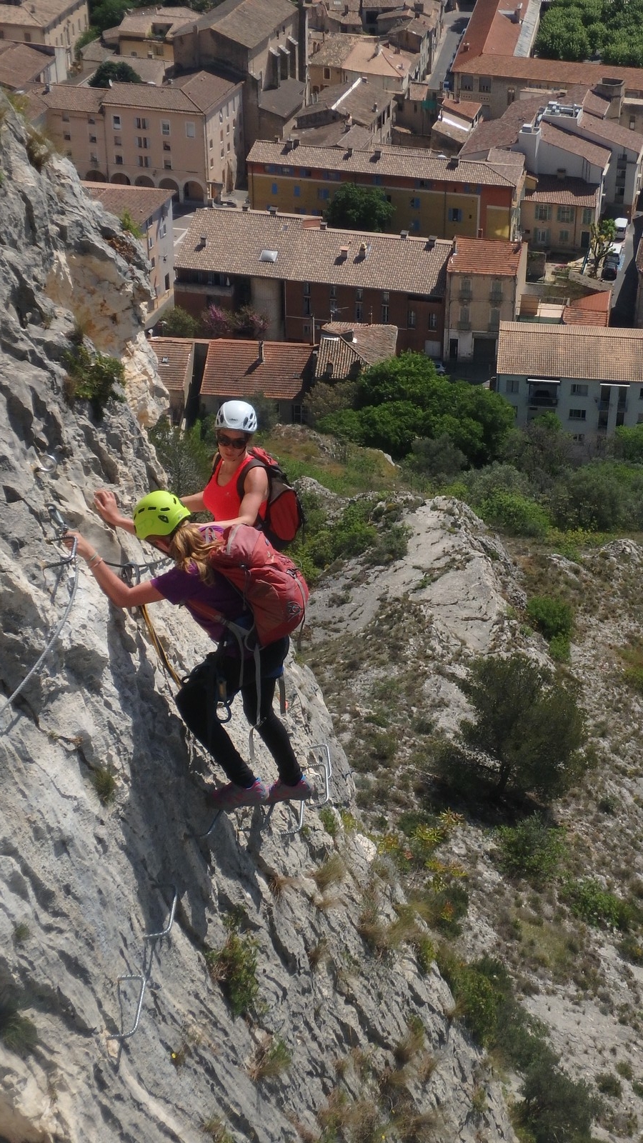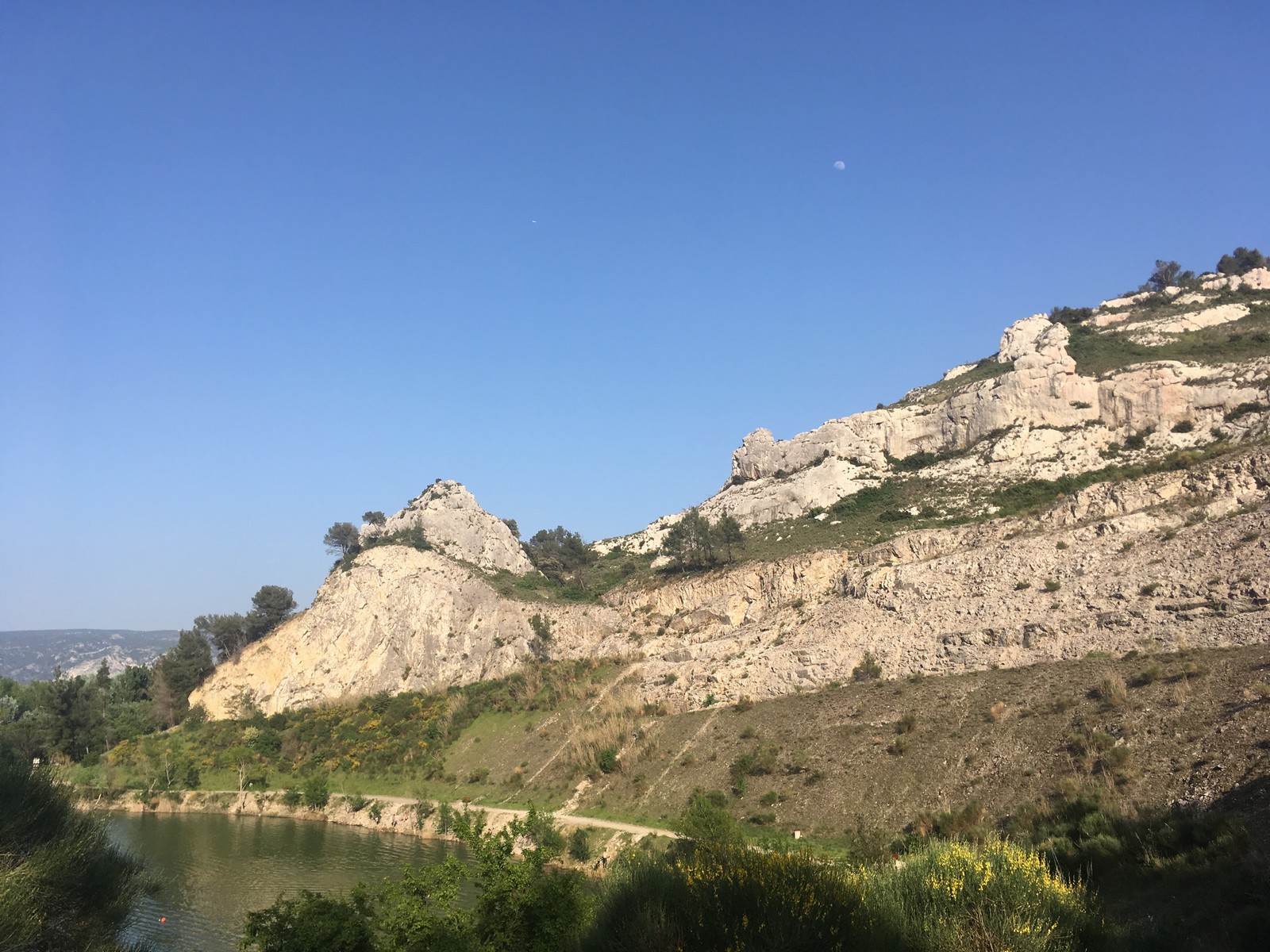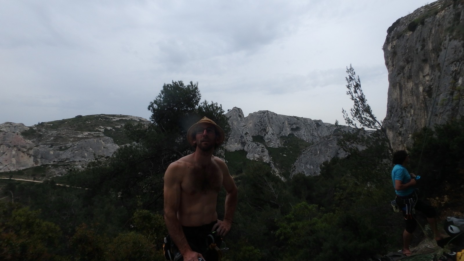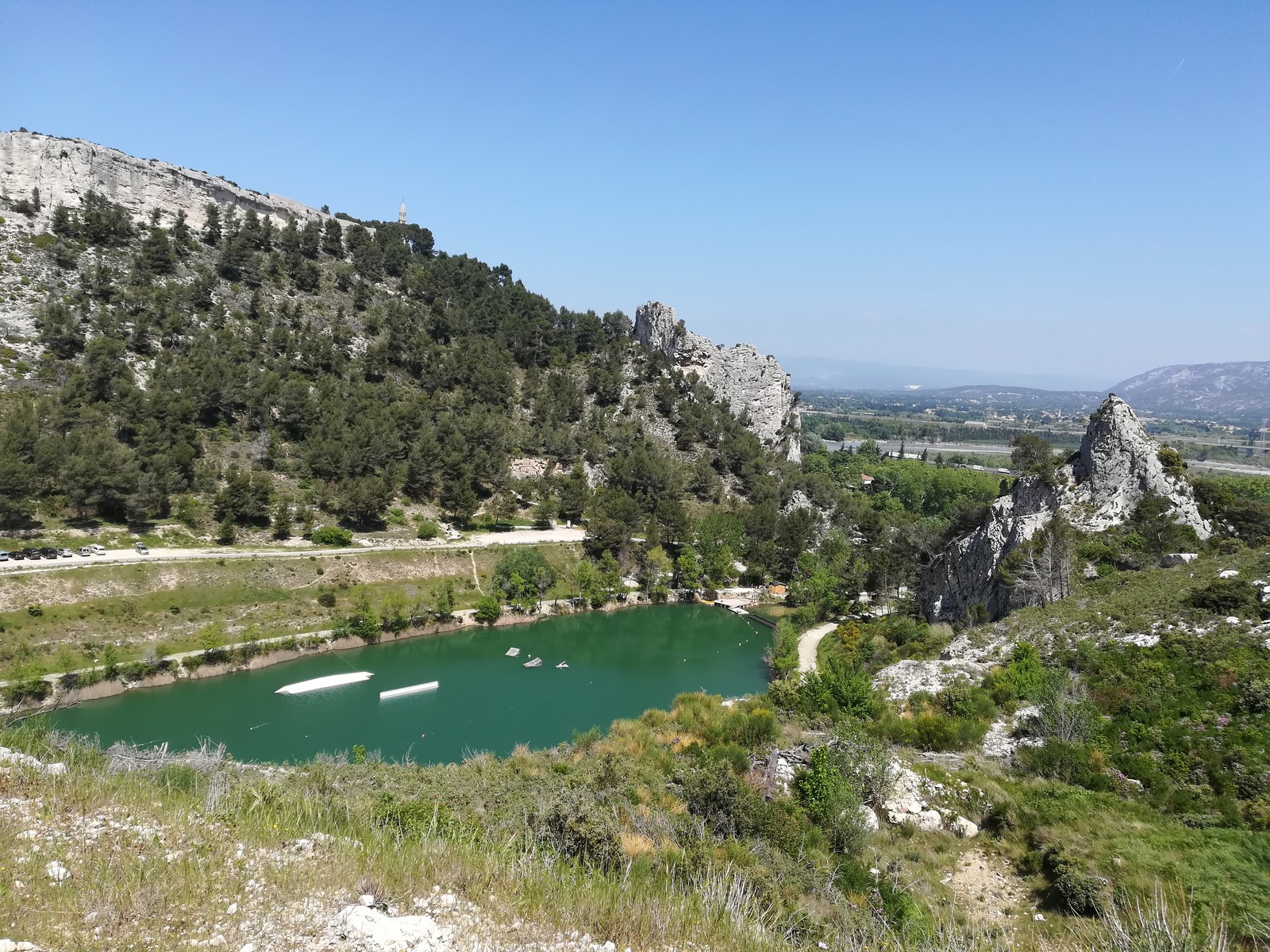 Mardi matin, nous sommes allés au site des Hauts Vernis, pratique car accessible depuis le haut du camping. Après une bonne demi-heure de marche d’approche plutôt raide dans laquelle on a failli perdre Adrien, nous arrivons au pied d’un très beau secteur de longues dalles grises côtées entre 5a et 7b+. Roche agréable, ombre pour le moment, et vue imprenable sur le lac de Sainte Croix !