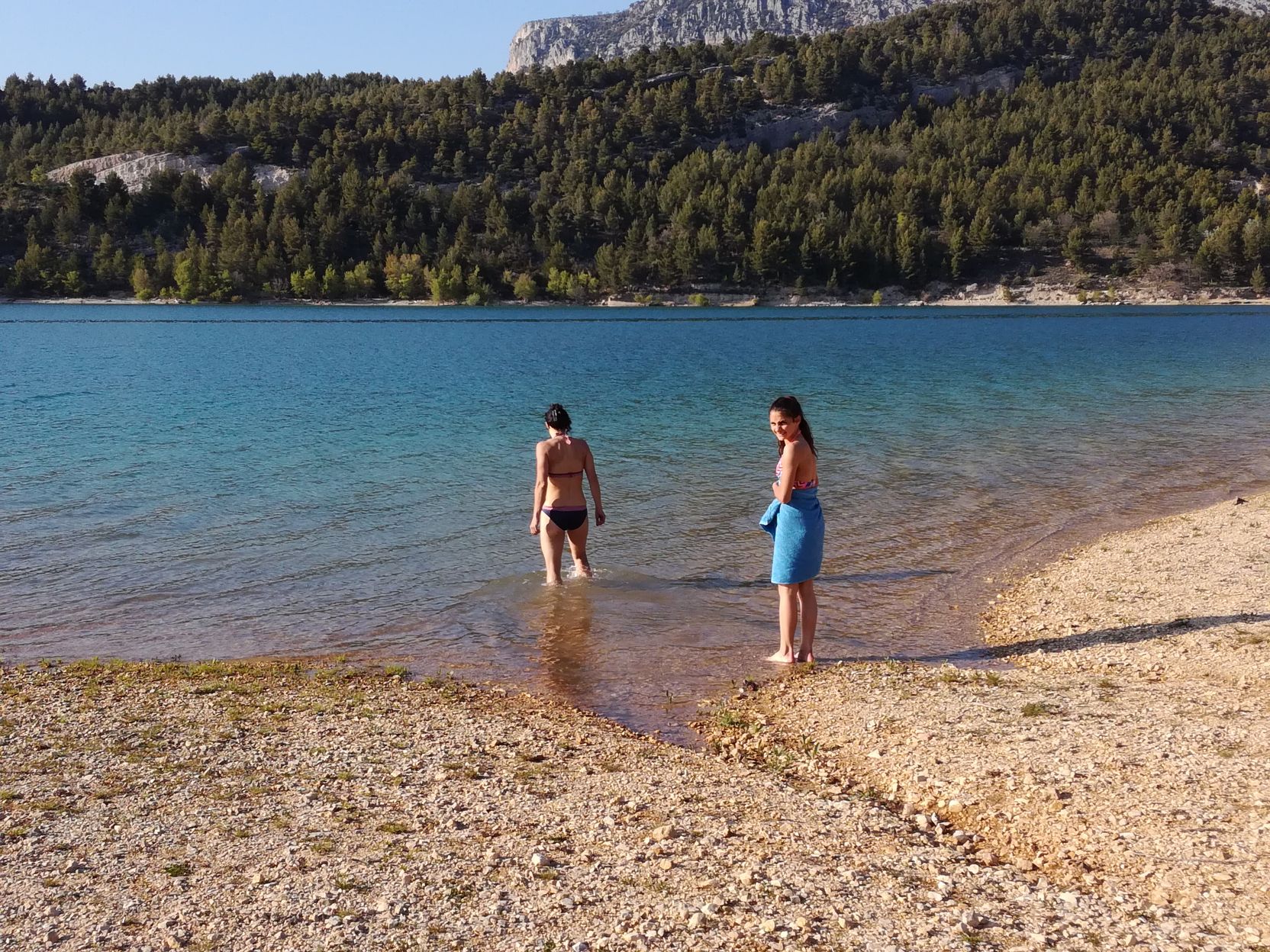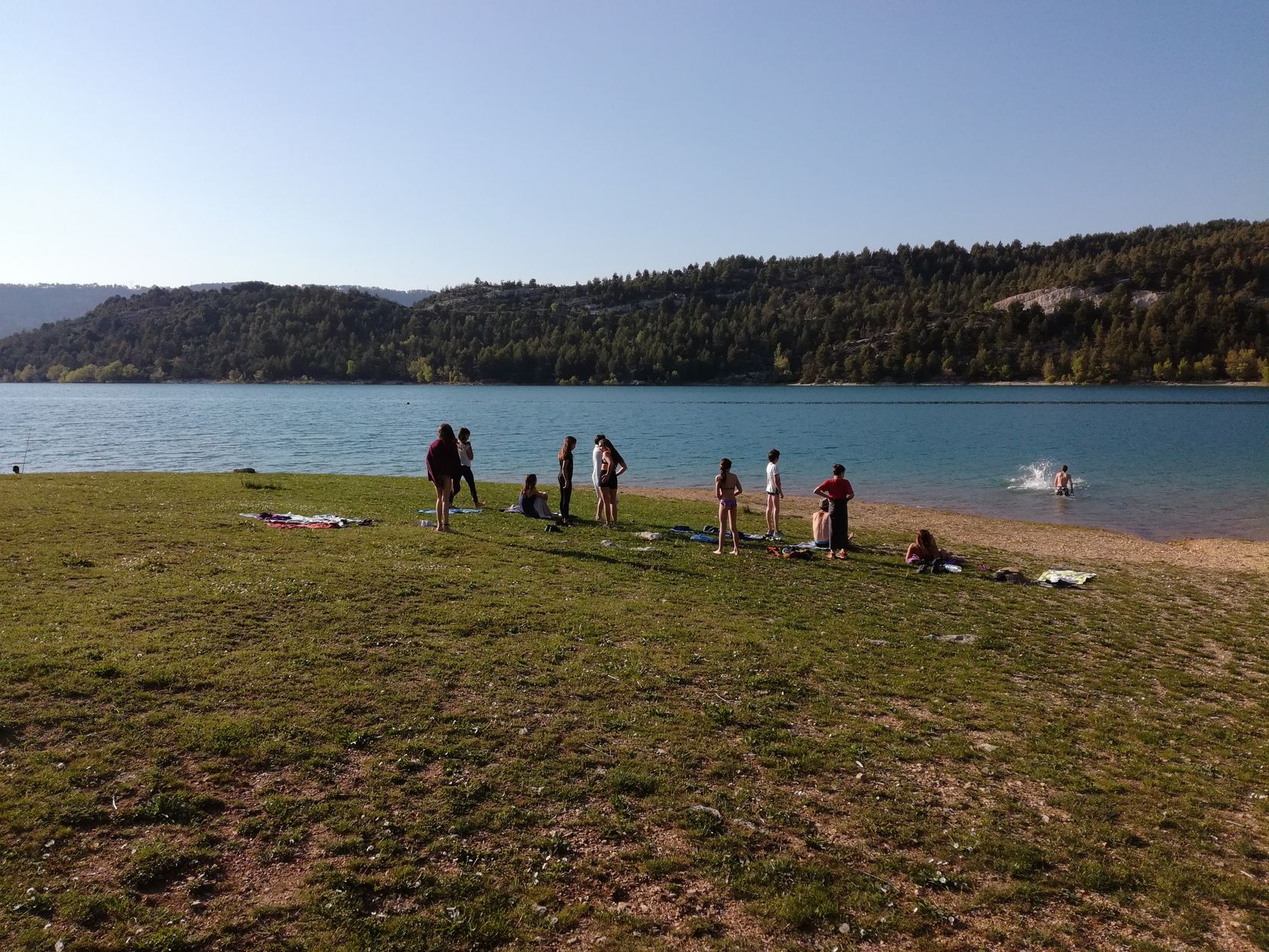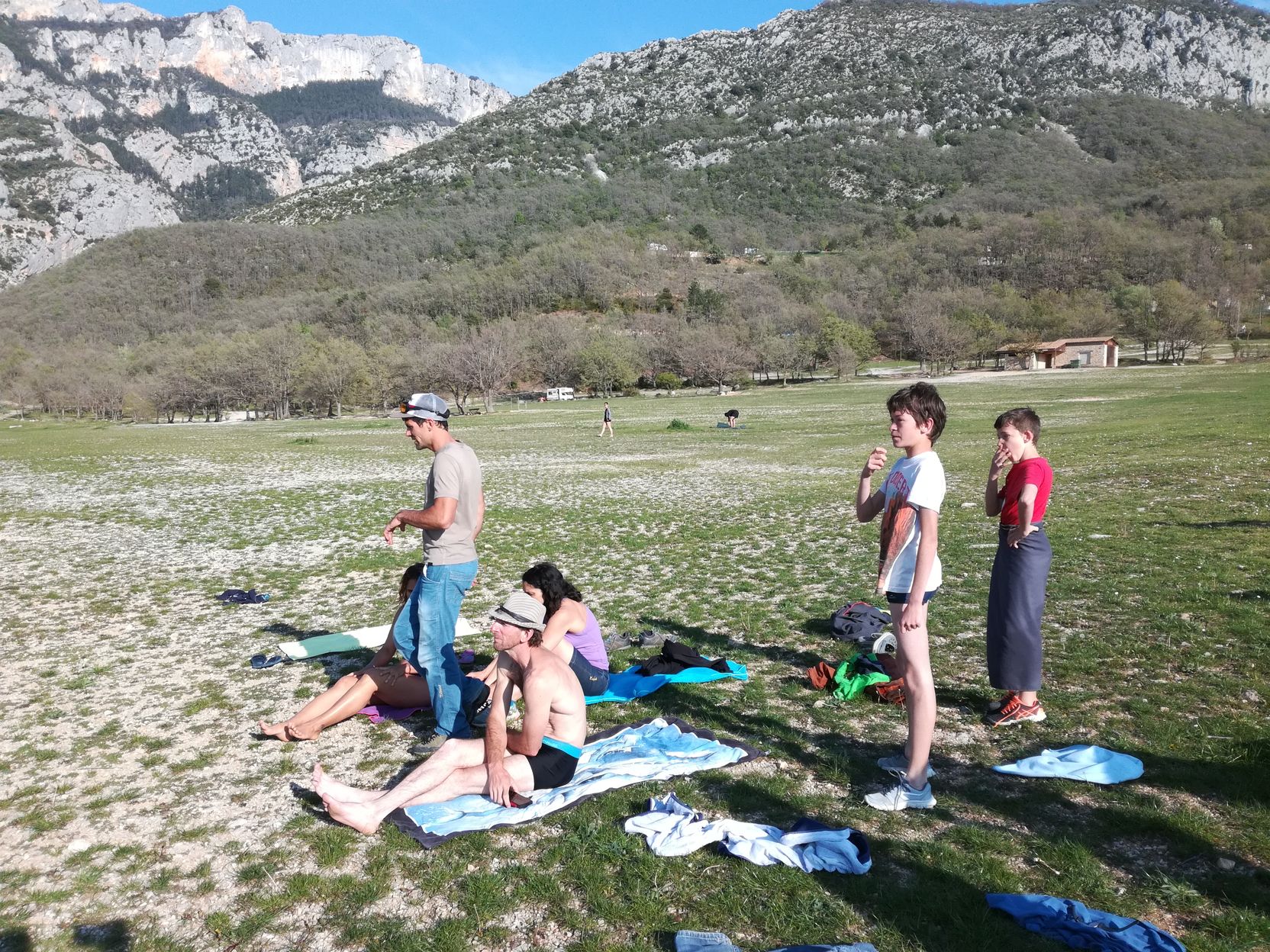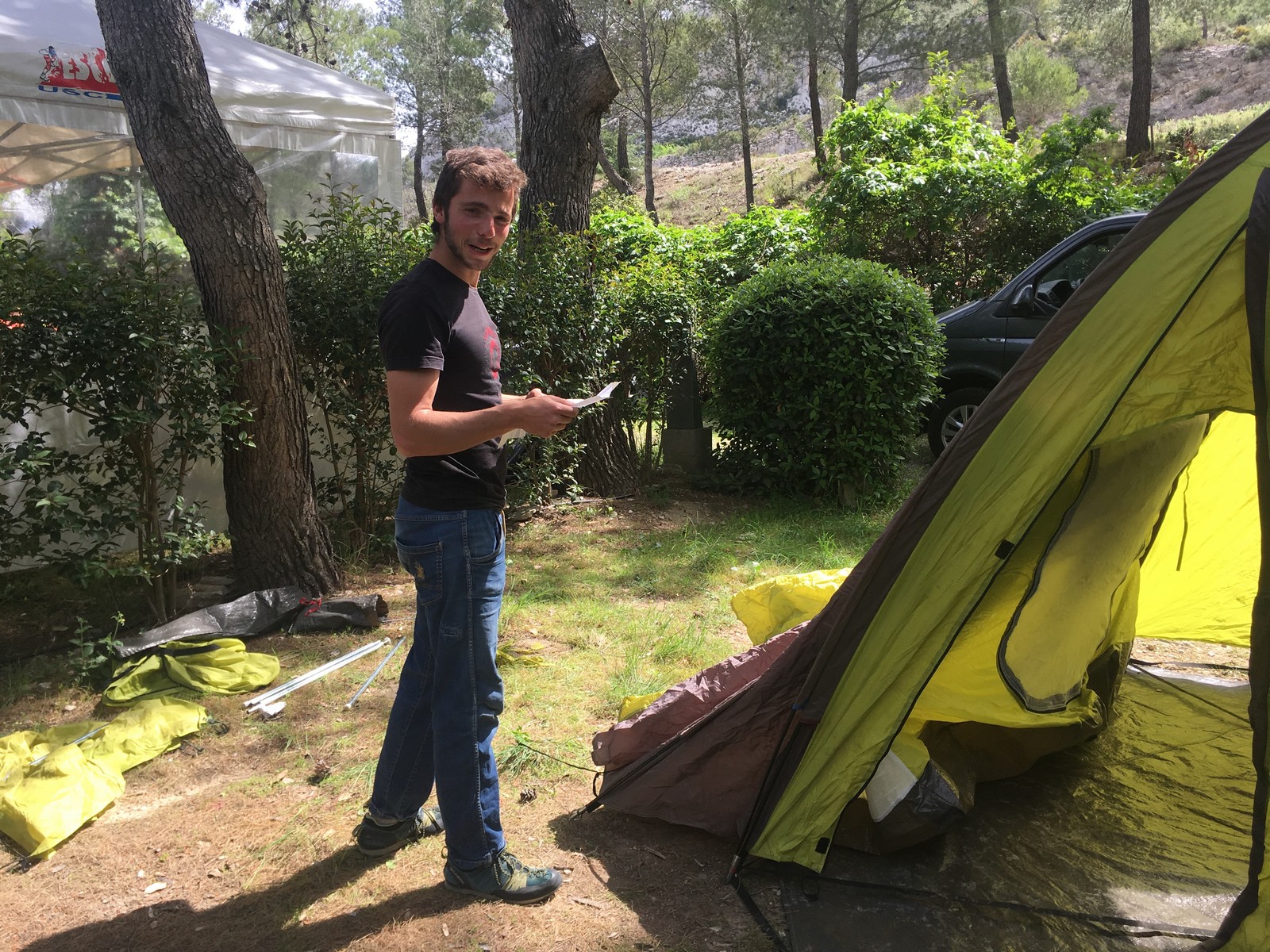 Un peu moins de 2 heures plus tard (enfin, sauf pour Guillaume qu’on attendra un peu plus longtemps), nous voilà arrivés sous le soleil au camping d’Aiguines, au bord du lac de Ste Croix. Nous commençons à nous installer dans un coin tranquille avant de lancer pour la première fois la phrase culte du stage « c’est pas là, on remonte dans le camion ! ». Les filles pourront ainsi tester le fly-surf version tente-minibus.