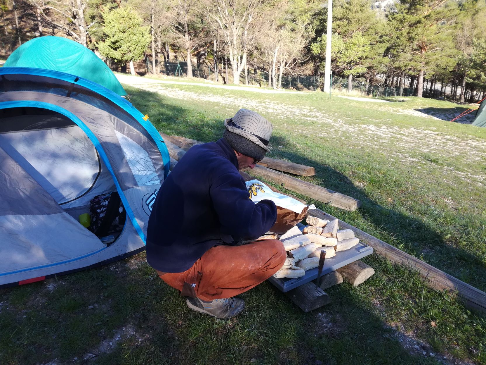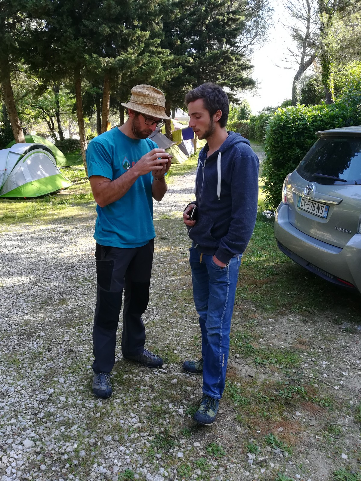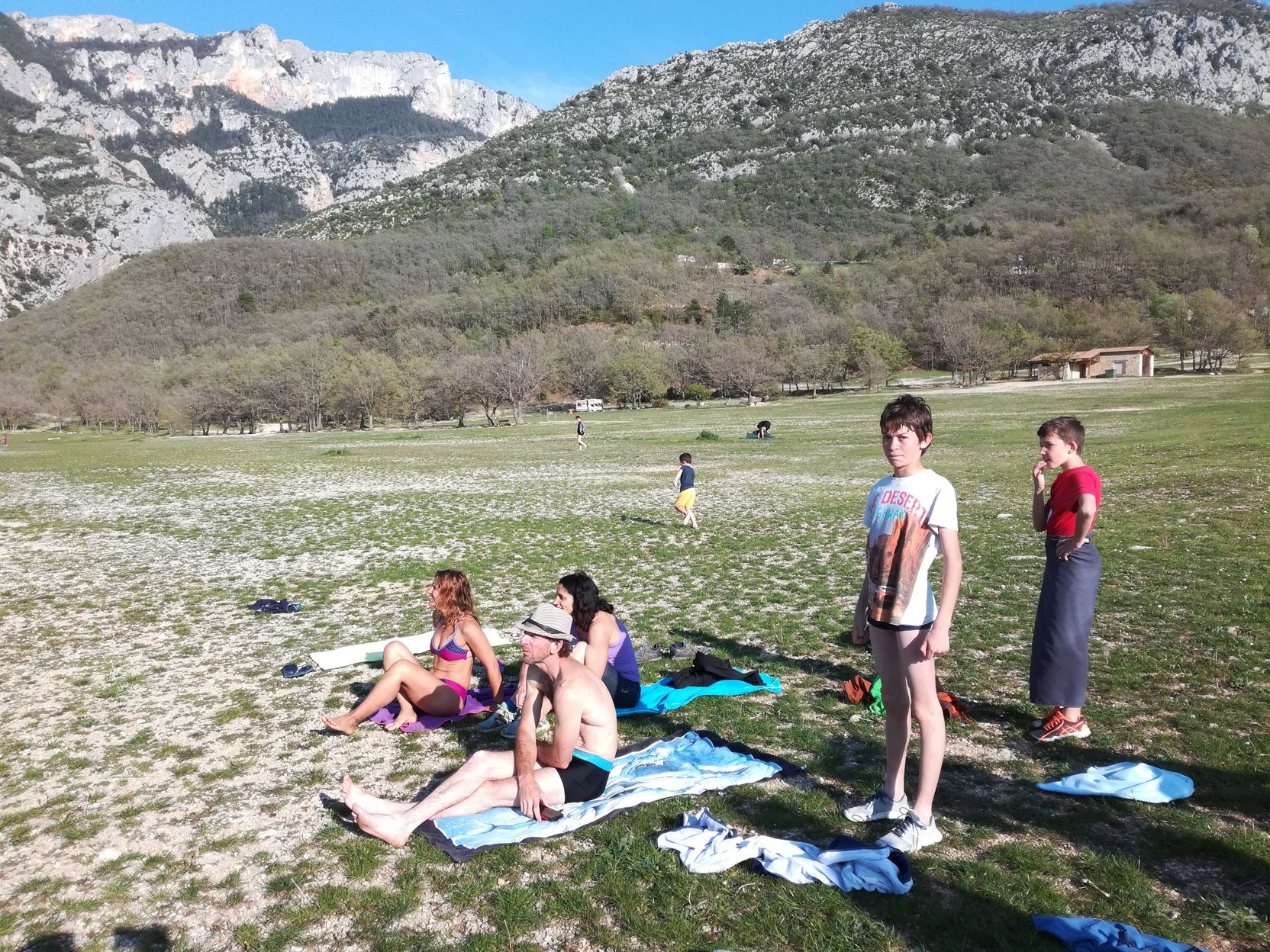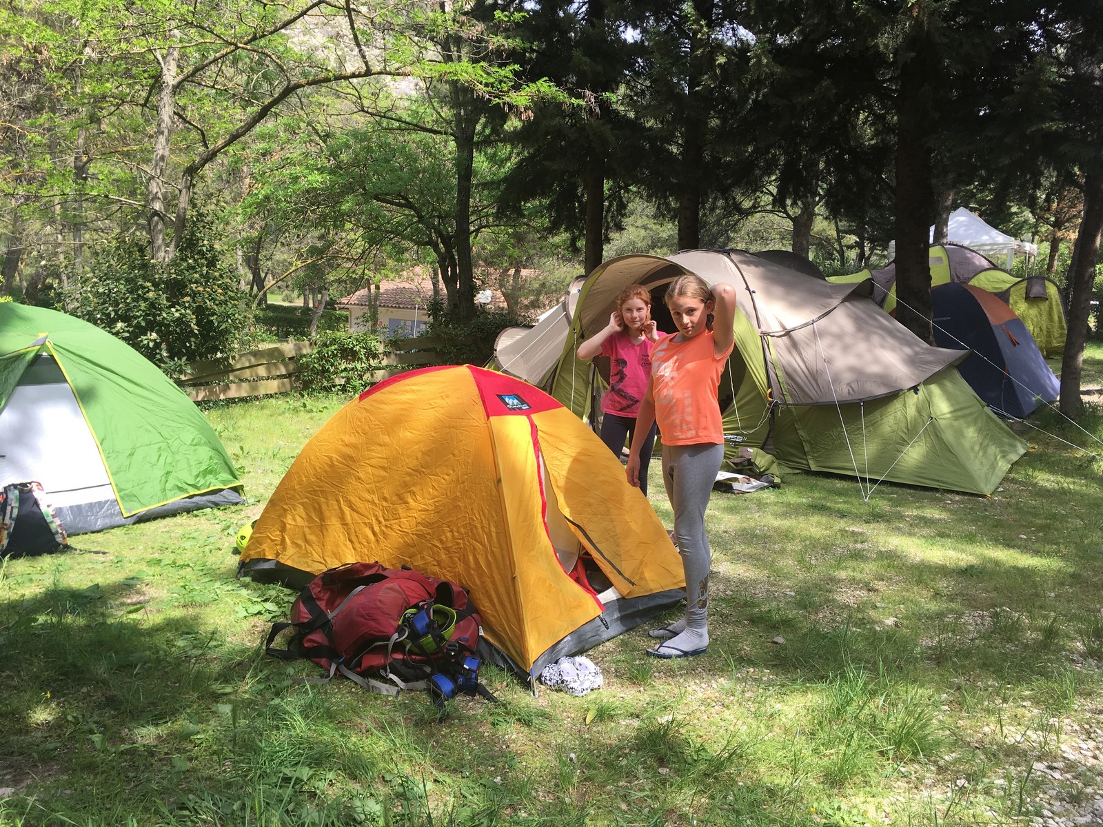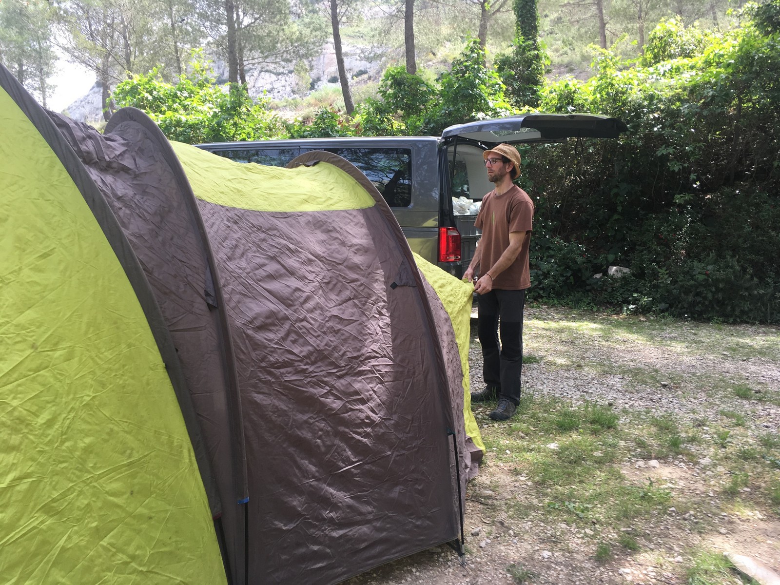 Un peu moins de 2 heures plus tard (enfin, sauf pour Guillaume qu’on attendra un peu plus longtemps), nous voilà arrivés sous le soleil au camping d’Aiguines, au bord du lac de Ste Croix. Nous commençons à nous installer dans un coin tranquille avant de lancer pour la première fois la phrase culte du stage « c’est pas là, on remonte dans le camion ! ». Les filles pourront ainsi tester le fly-surf version tente-minibus.